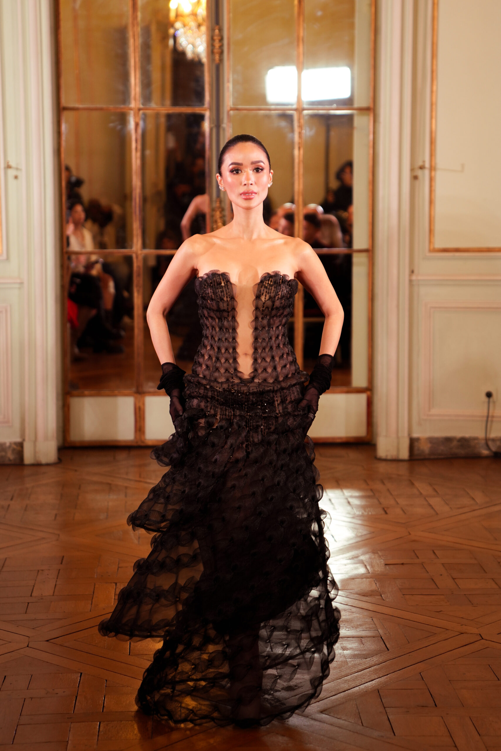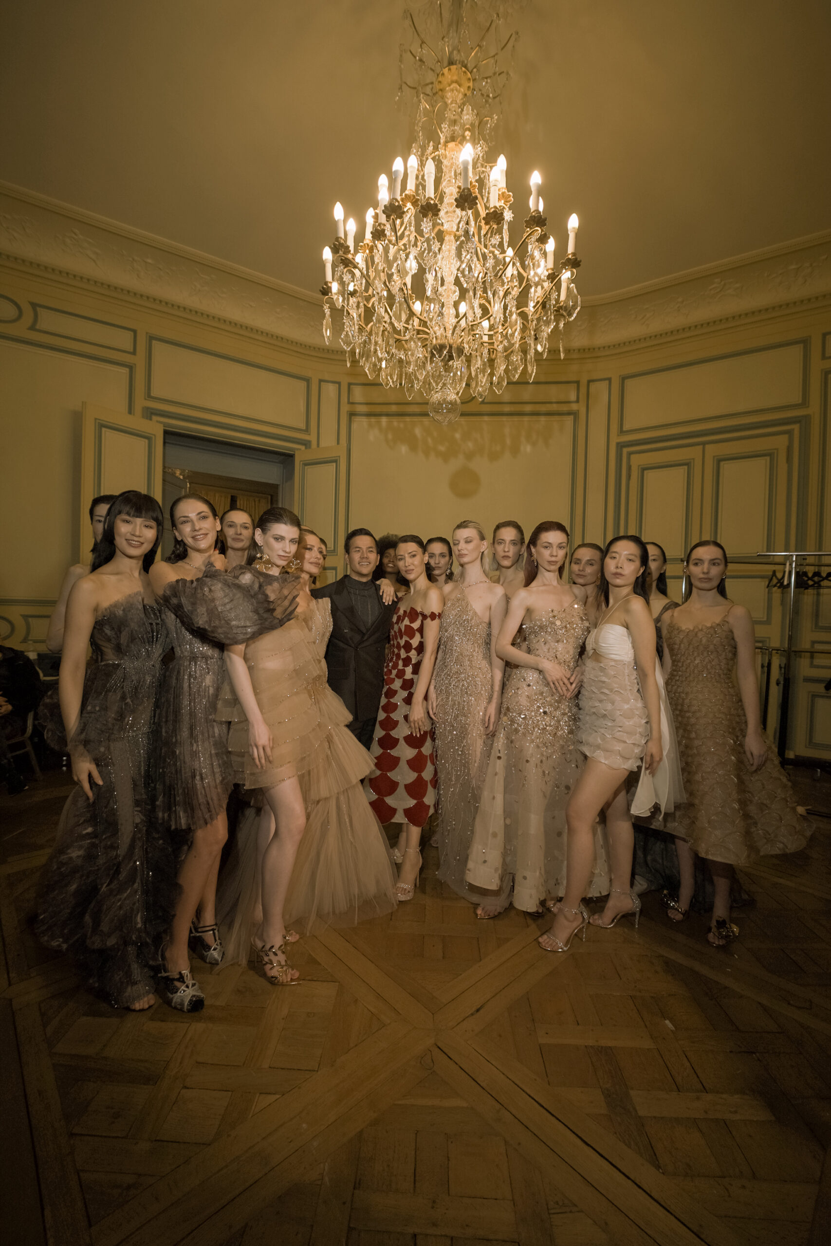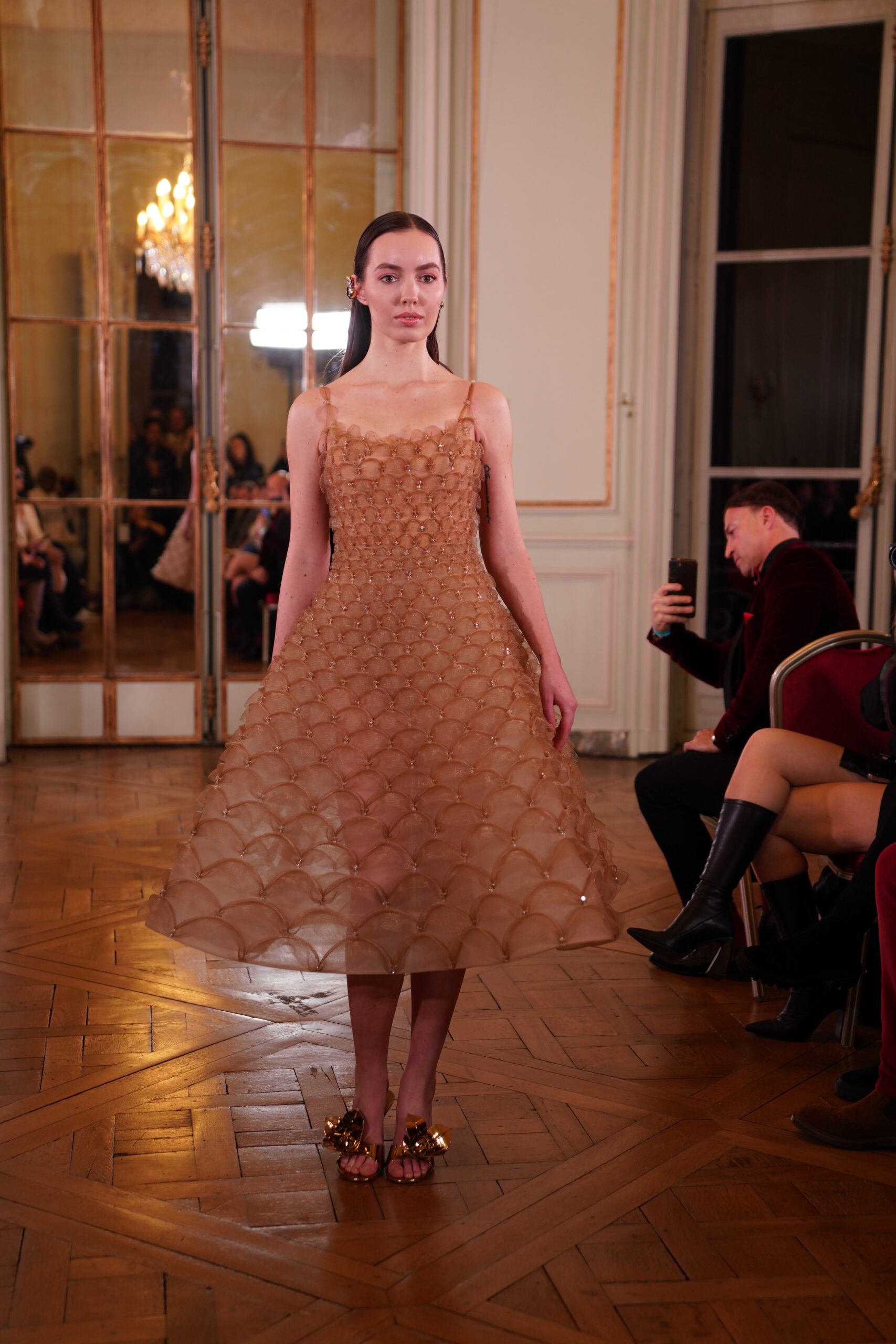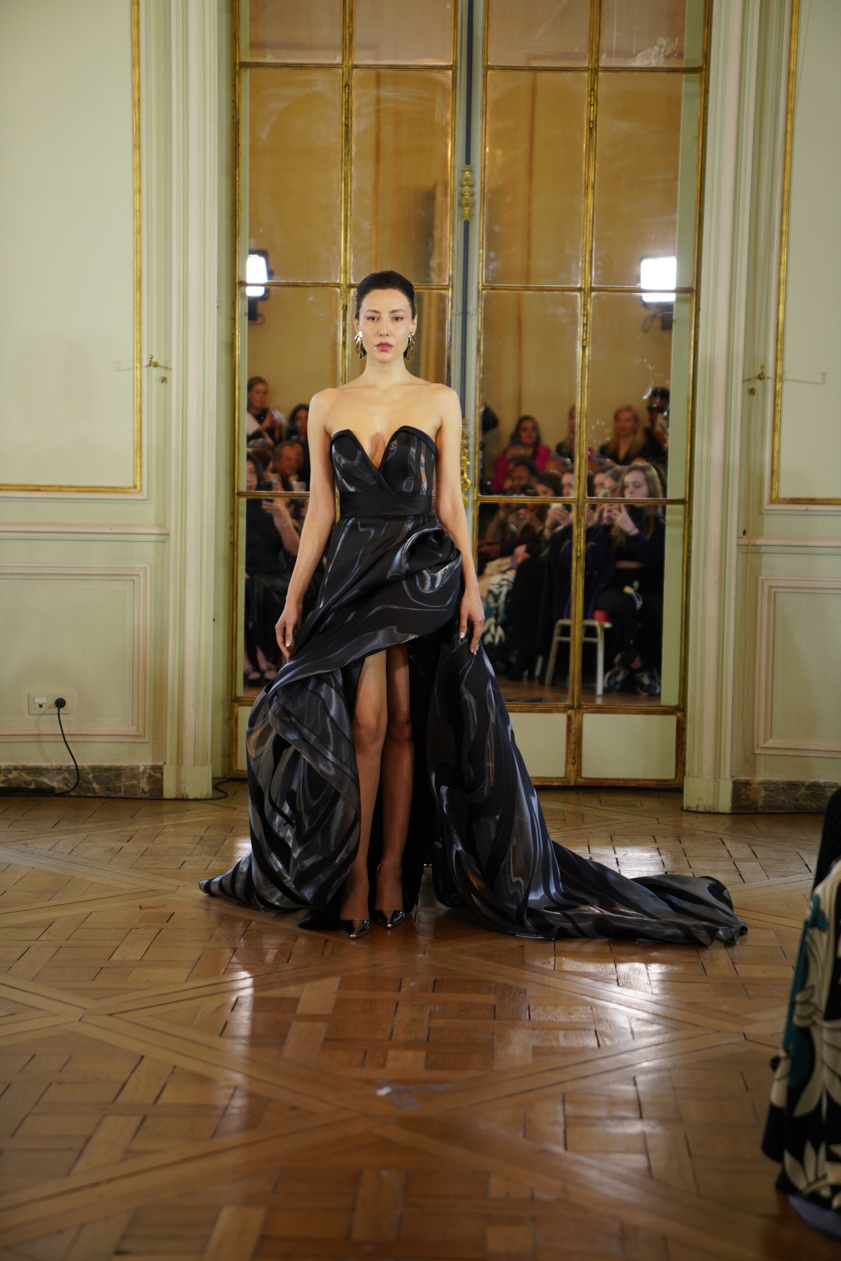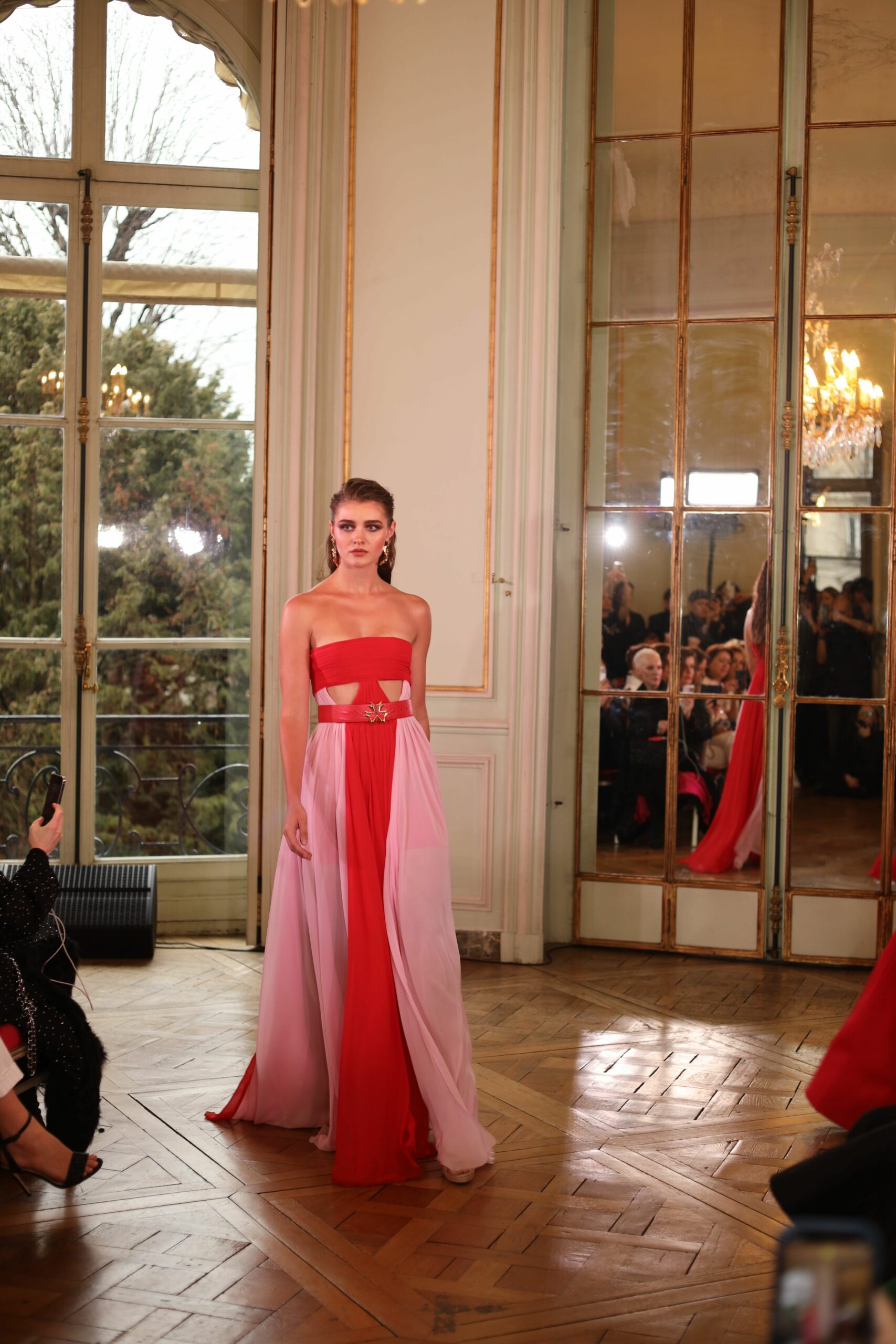Laith Maalouf a enchanté l’audience avec sa collection inspirée des déesses, Amora: Une Symphonie de Structure et de Fluidité. Fusionnant design structuré et fluidité, chaque création rend hommage aux courbes gracieuses des statues de la Renaissance, incarnant l’essence divine de la déesse Amora à travers draperies aériennes et ornements dorés luxuriants.