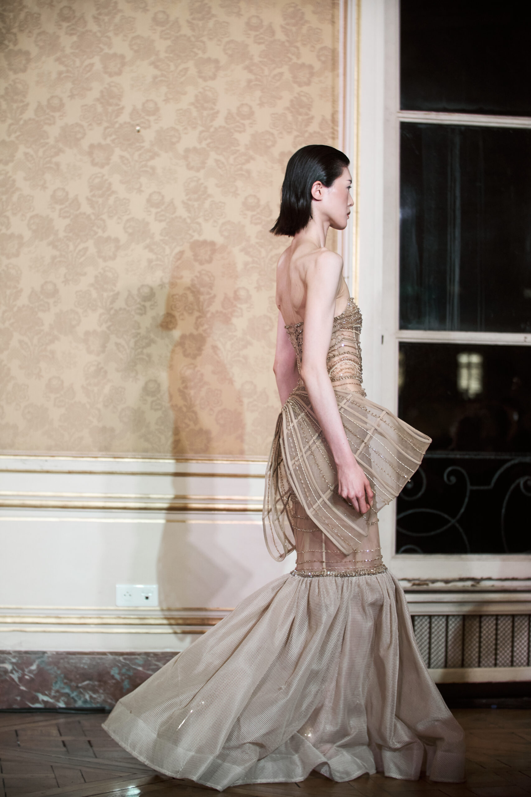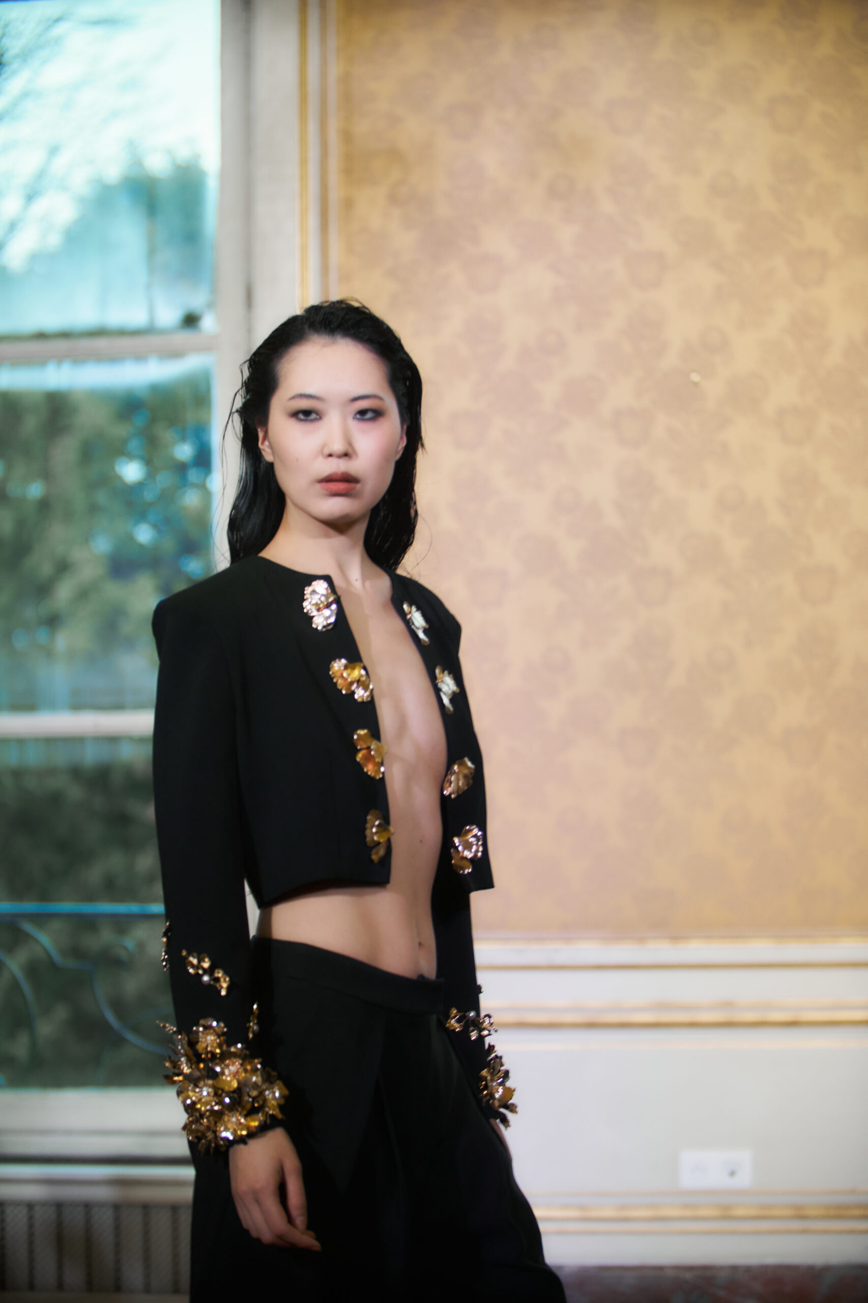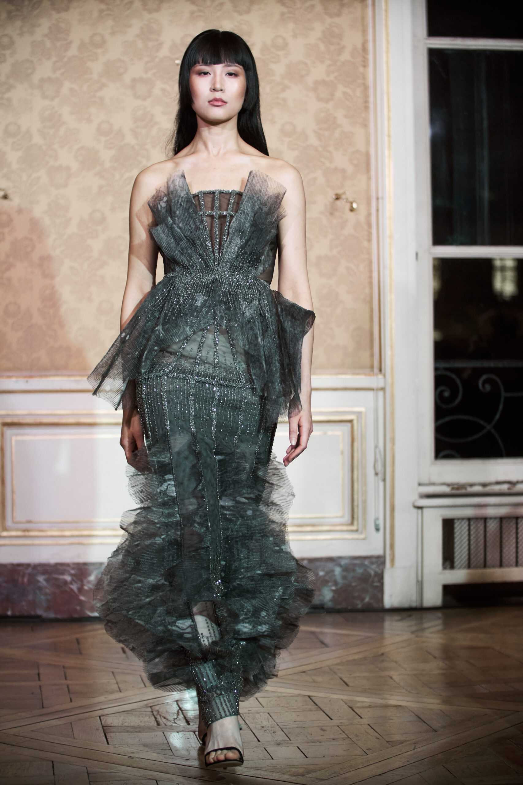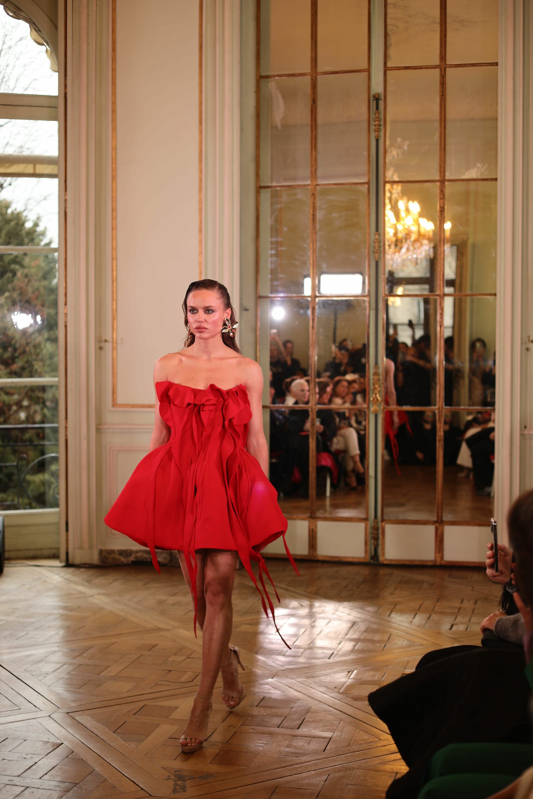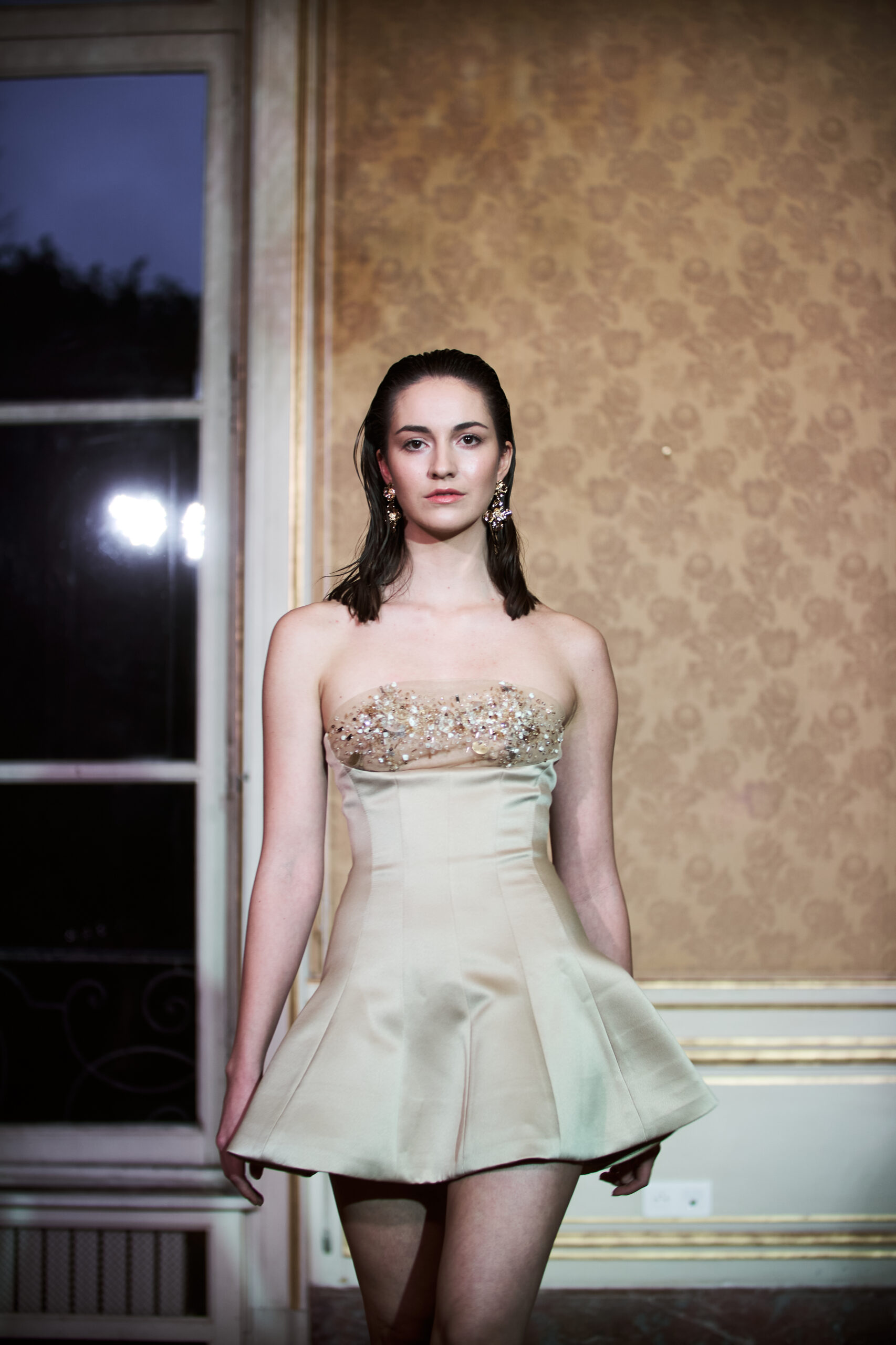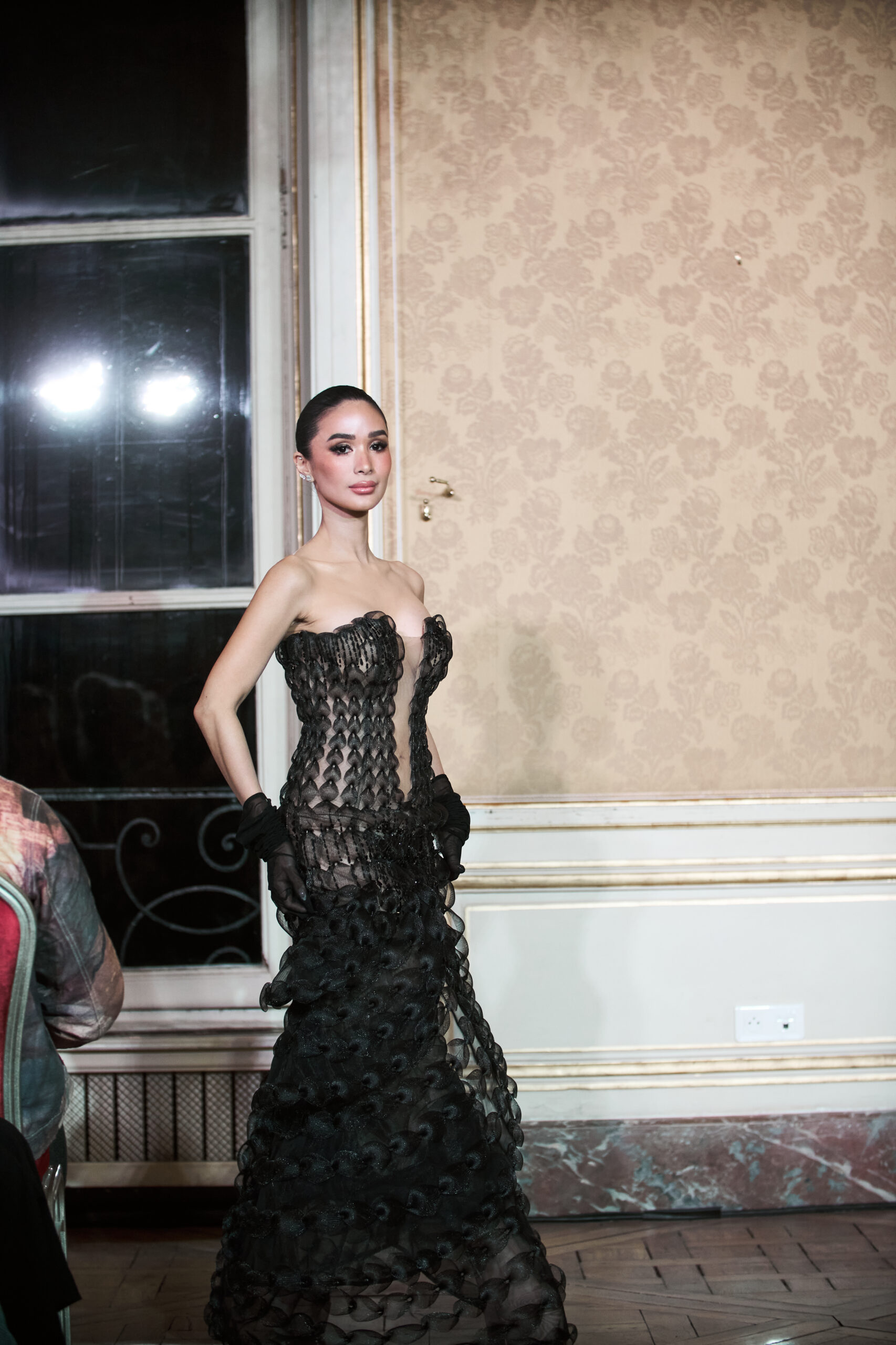 Laith Maalouf a enchanté l’audience avec sa collection inspirée des déesses, Amora: Une Symphonie de Structure et de Fluidité. Fusionnant design structuré et fluidité, chaque création rend hommage aux courbes gracieuses des statues de la Renaissance, incarnant l’essence divine de la déesse Amora à travers draperies aériennes et ornements dorés luxuriants.