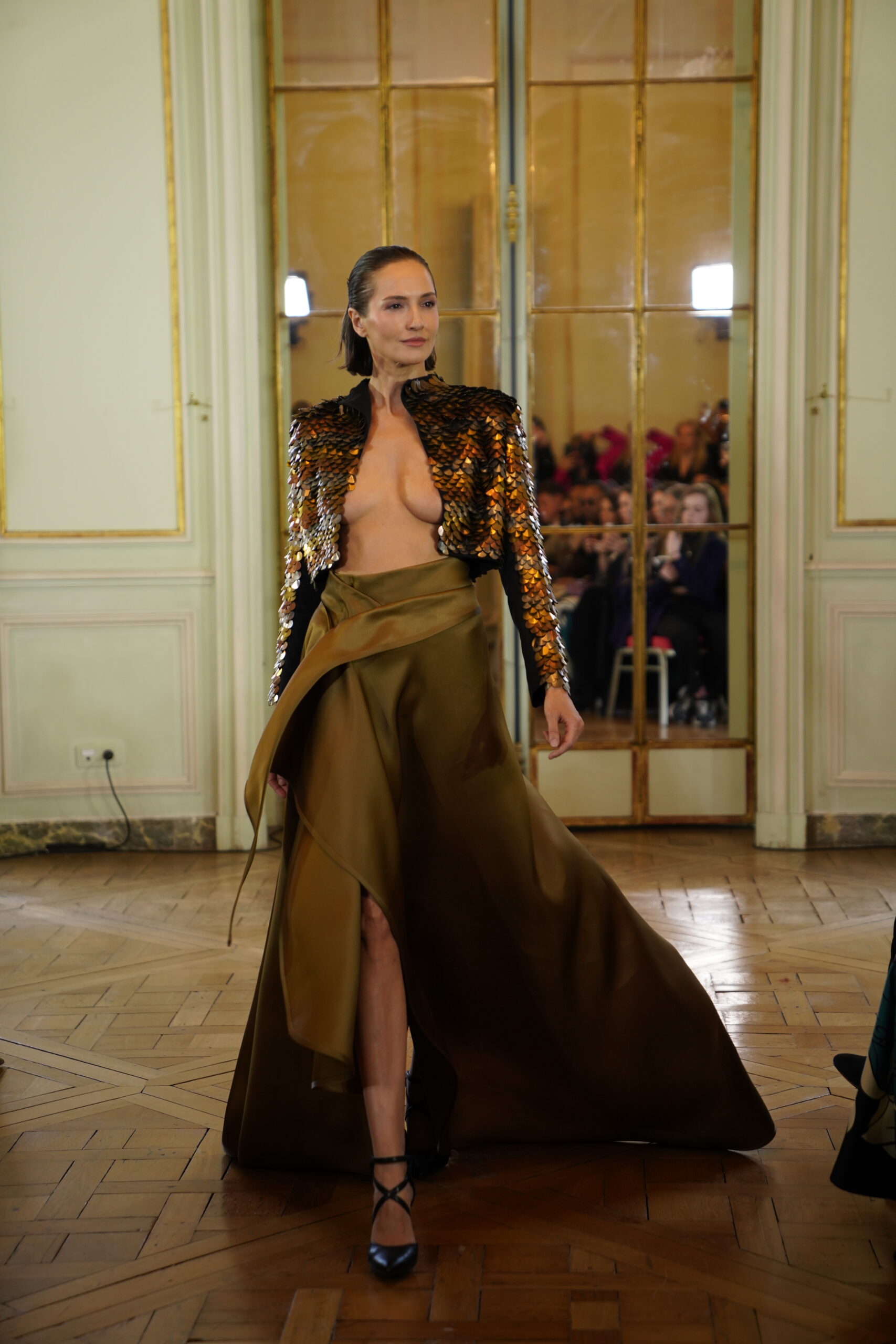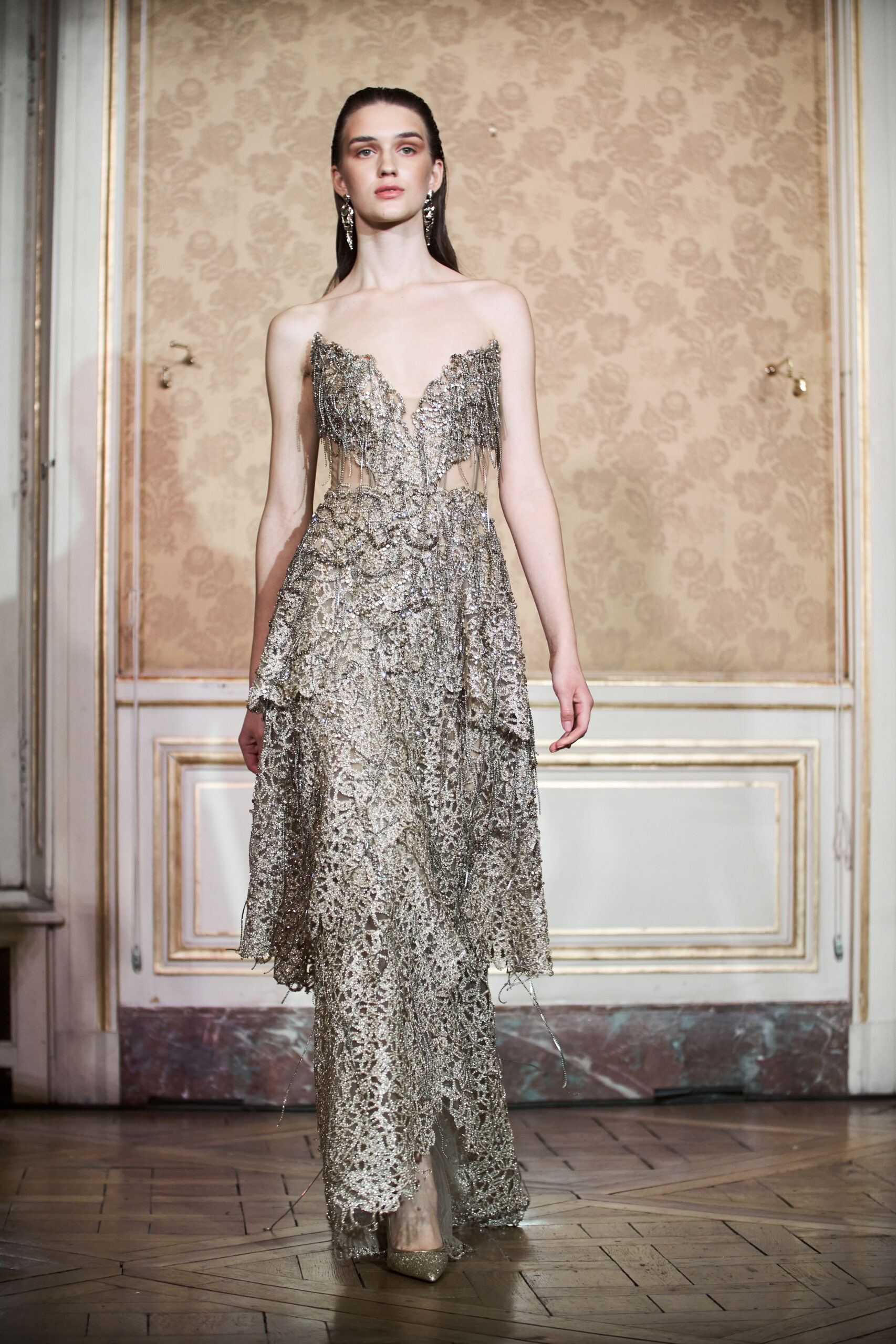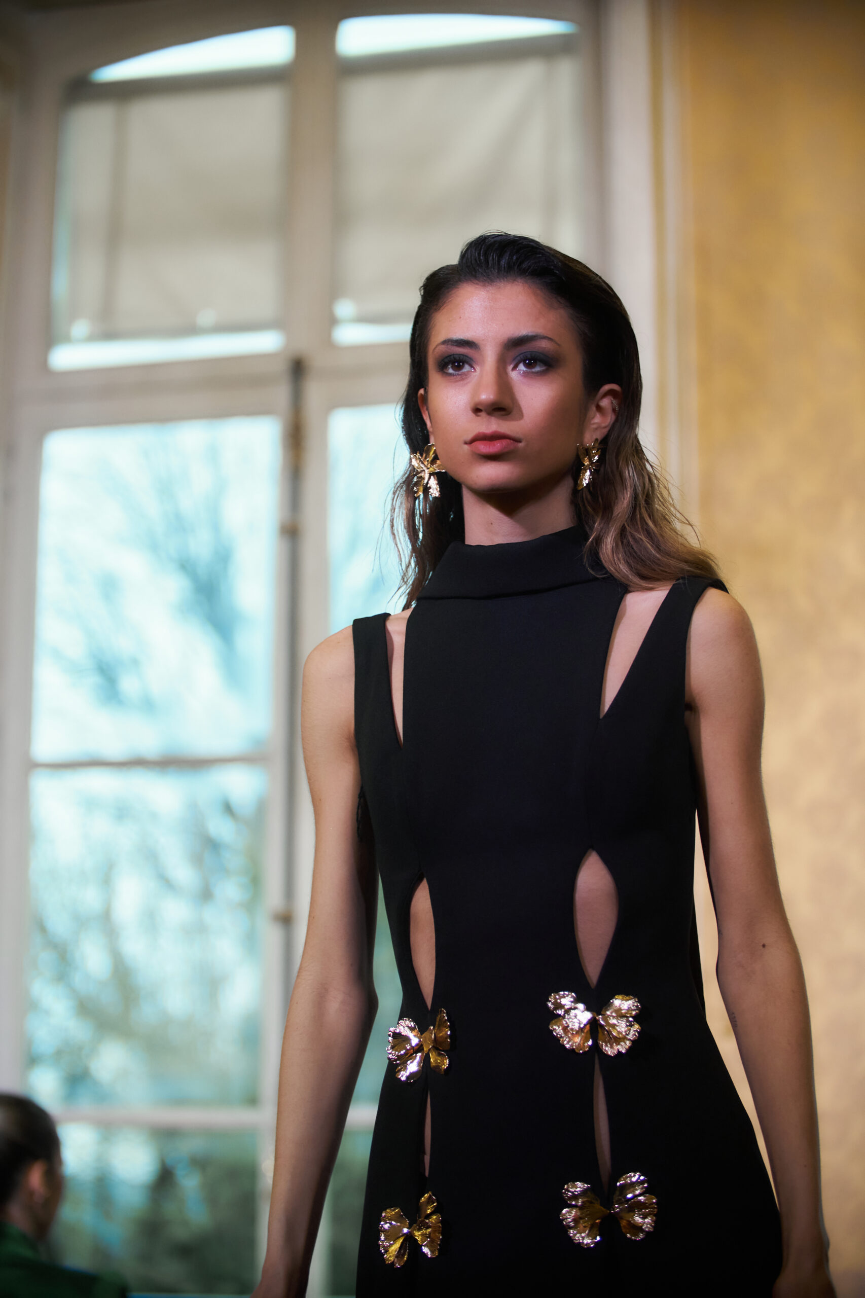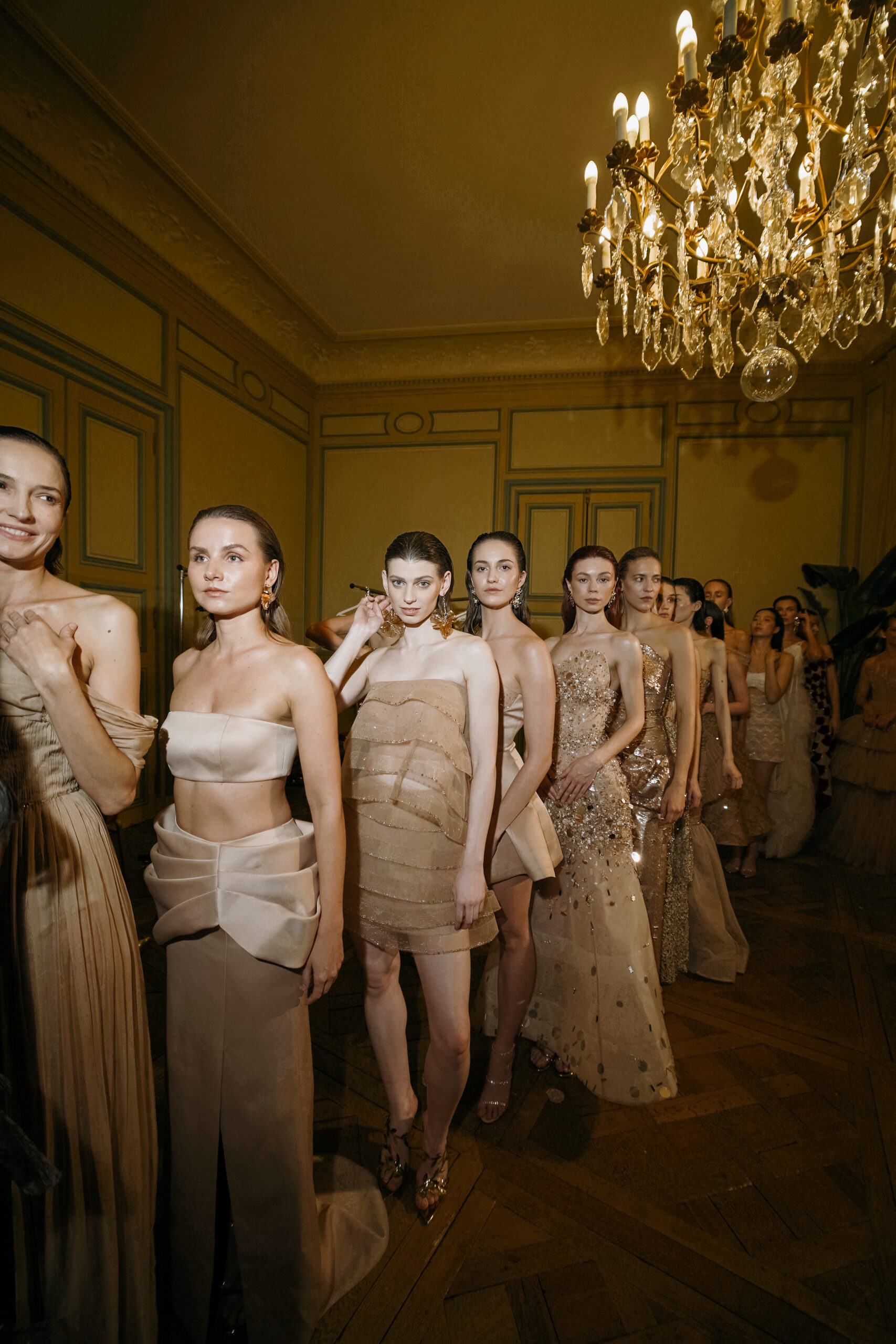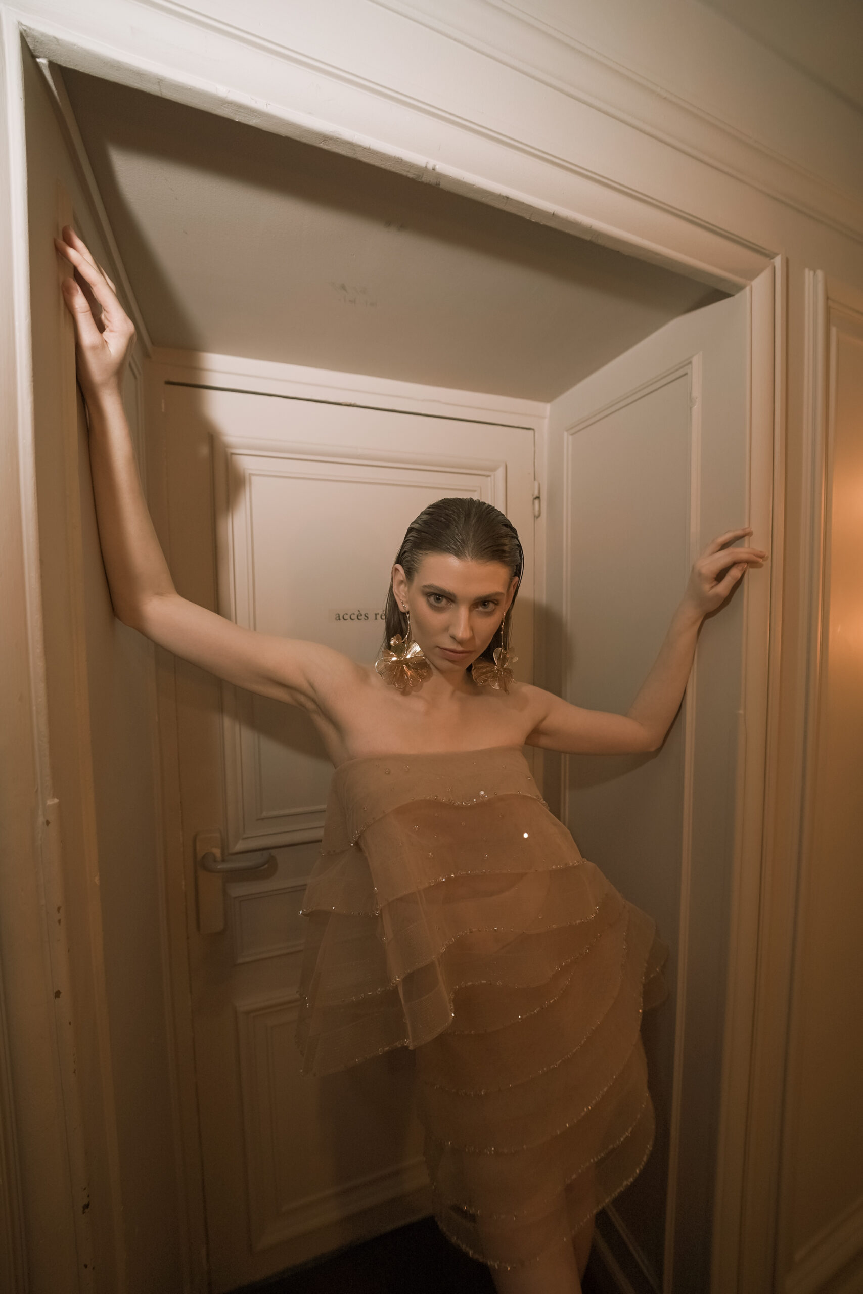 Laith Maalouf a enchanté l’audience avec sa collection inspirée des déesses, Amora: Une Symphonie de Structure et de Fluidité. Fusionnant design structuré et fluidité, chaque création rend hommage aux courbes gracieuses des statues de la Renaissance, incarnant l’essence divine de la déesse Amora à travers draperies aériennes et ornements dorés luxuriants.
