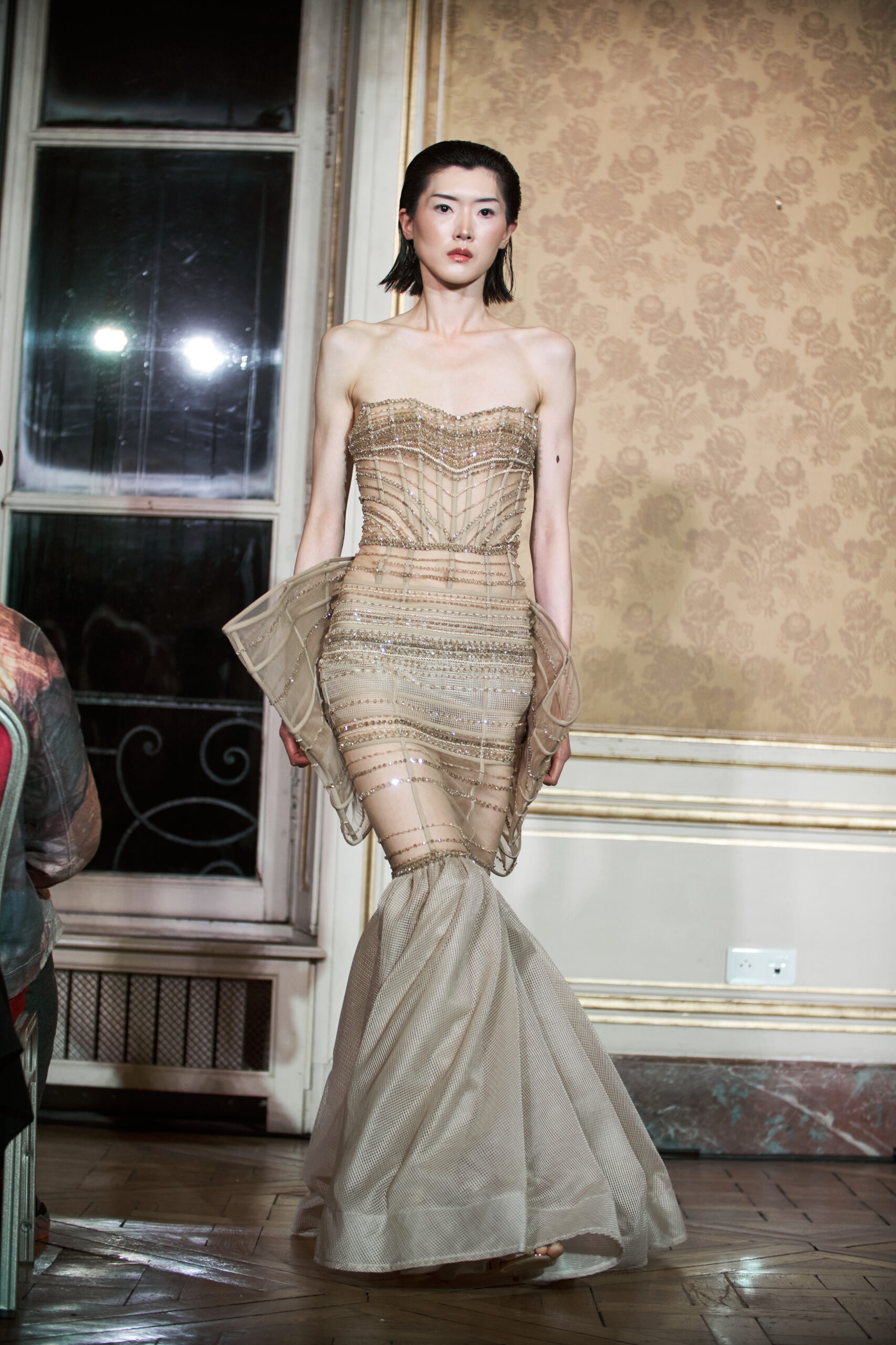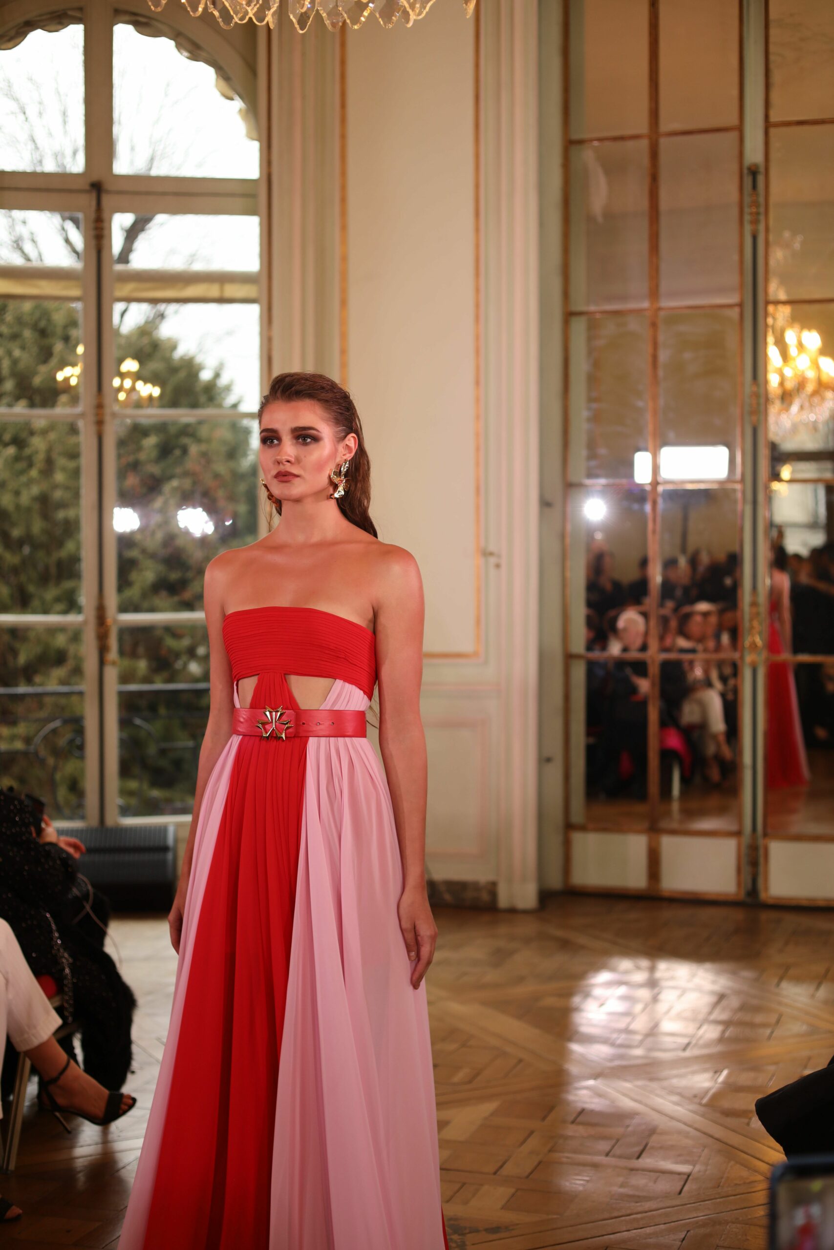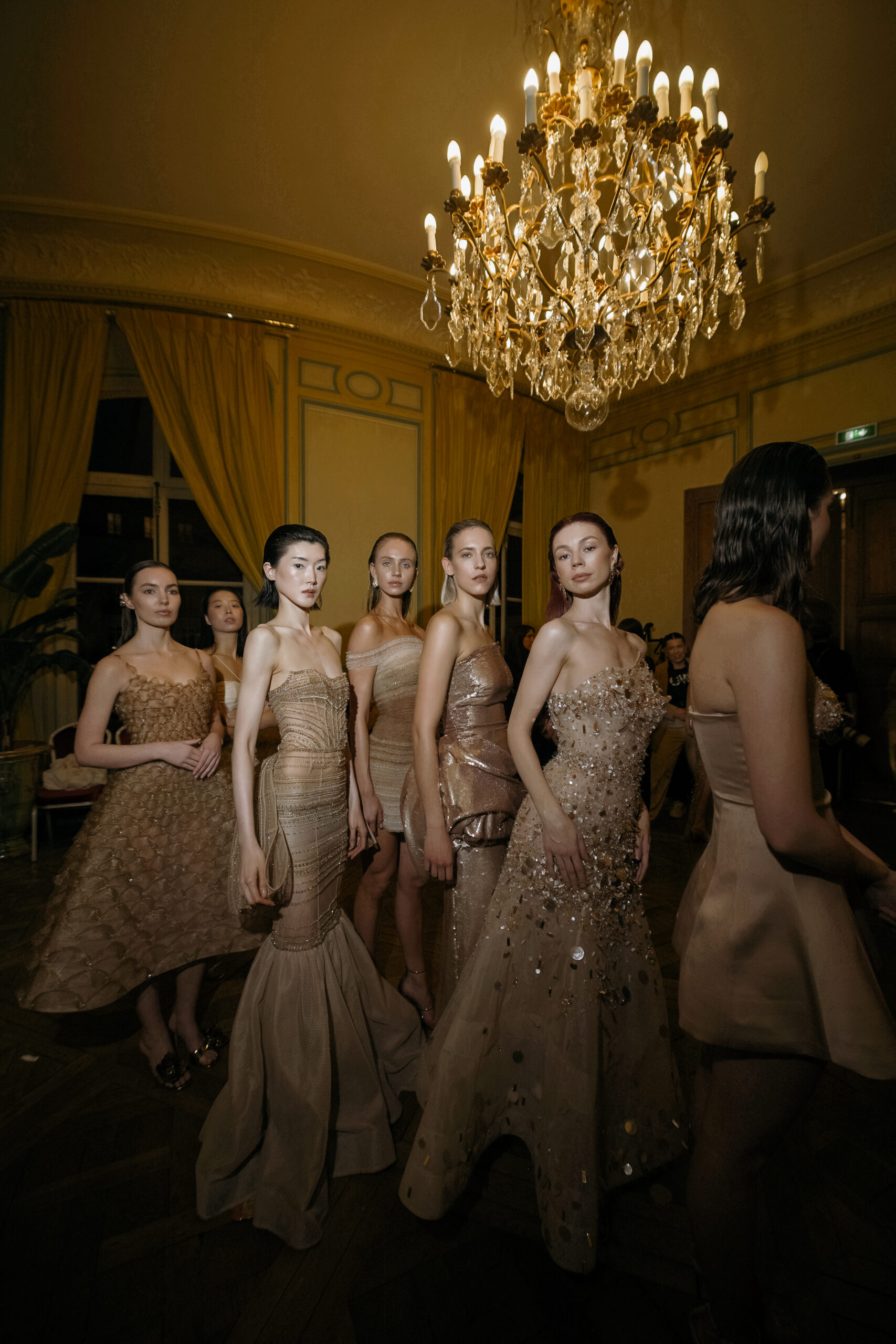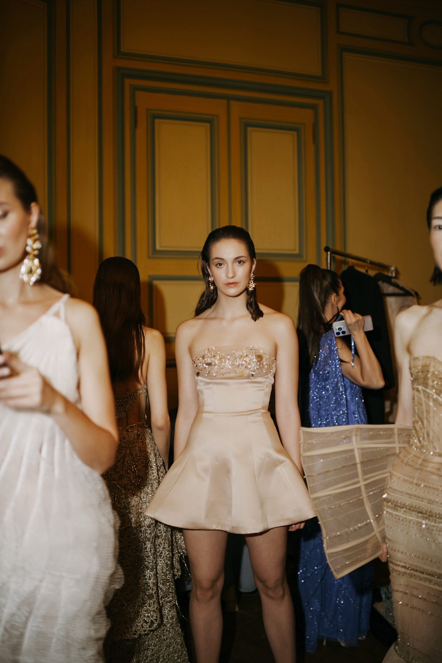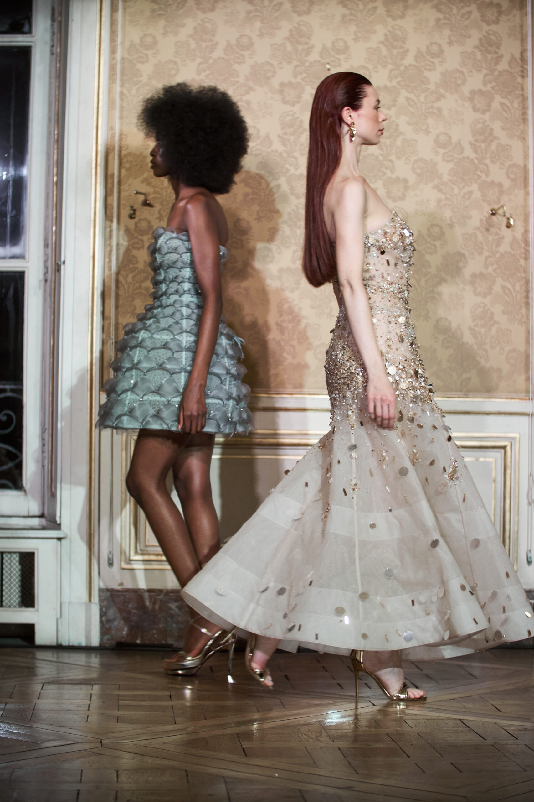 Laith Maalouf a enchanté l’audience avec sa collection inspirée des déesses, Amora: Une Symphonie de Structure et de Fluidité. Fusionnant design structuré et fluidité, chaque création rend hommage aux courbes gracieuses des statues de la Renaissance, incarnant l’essence divine de la déesse Amora à travers draperies aériennes et ornements dorés luxuriants.