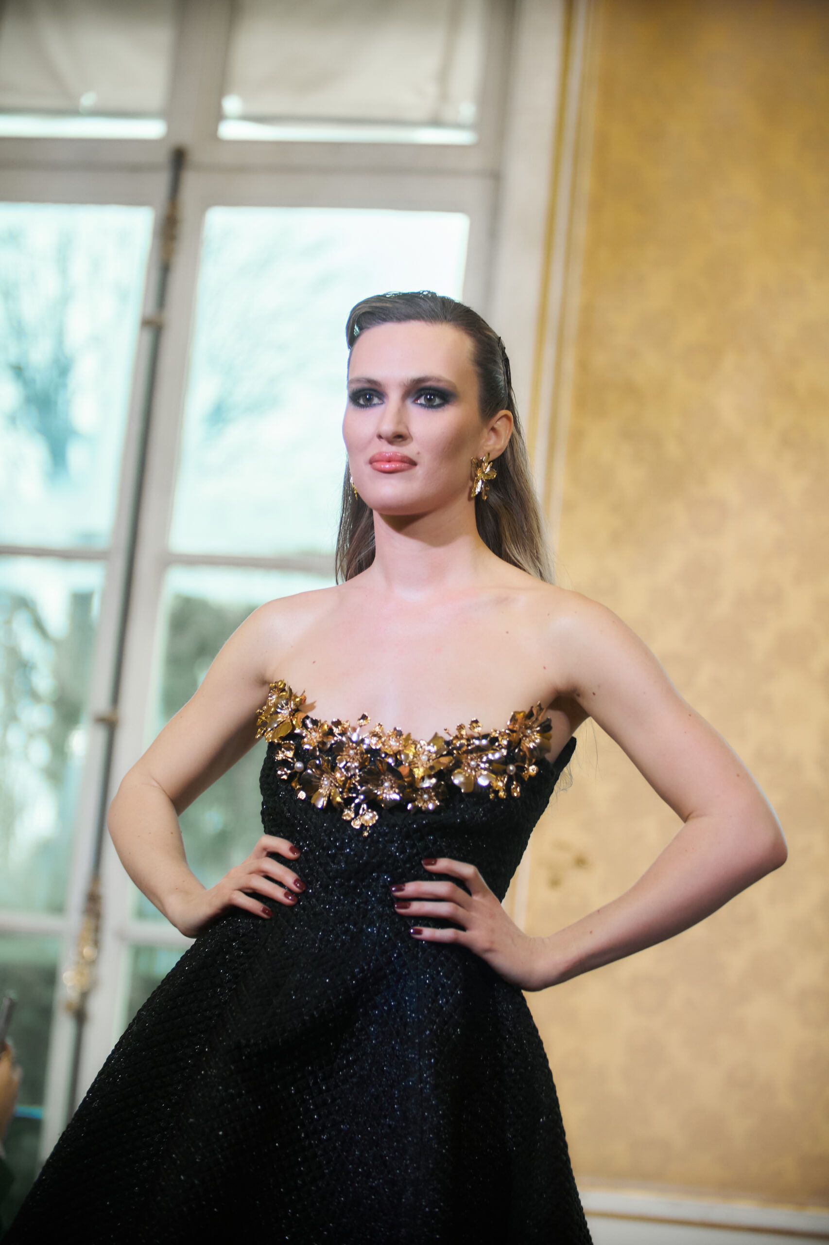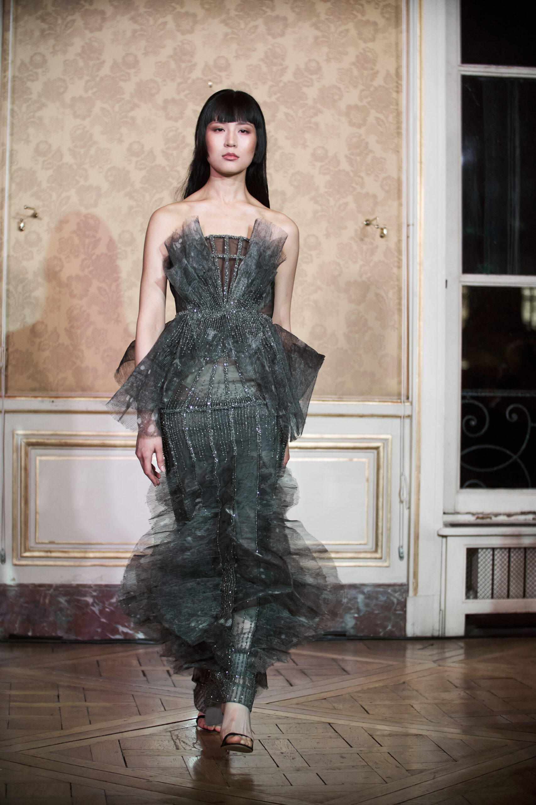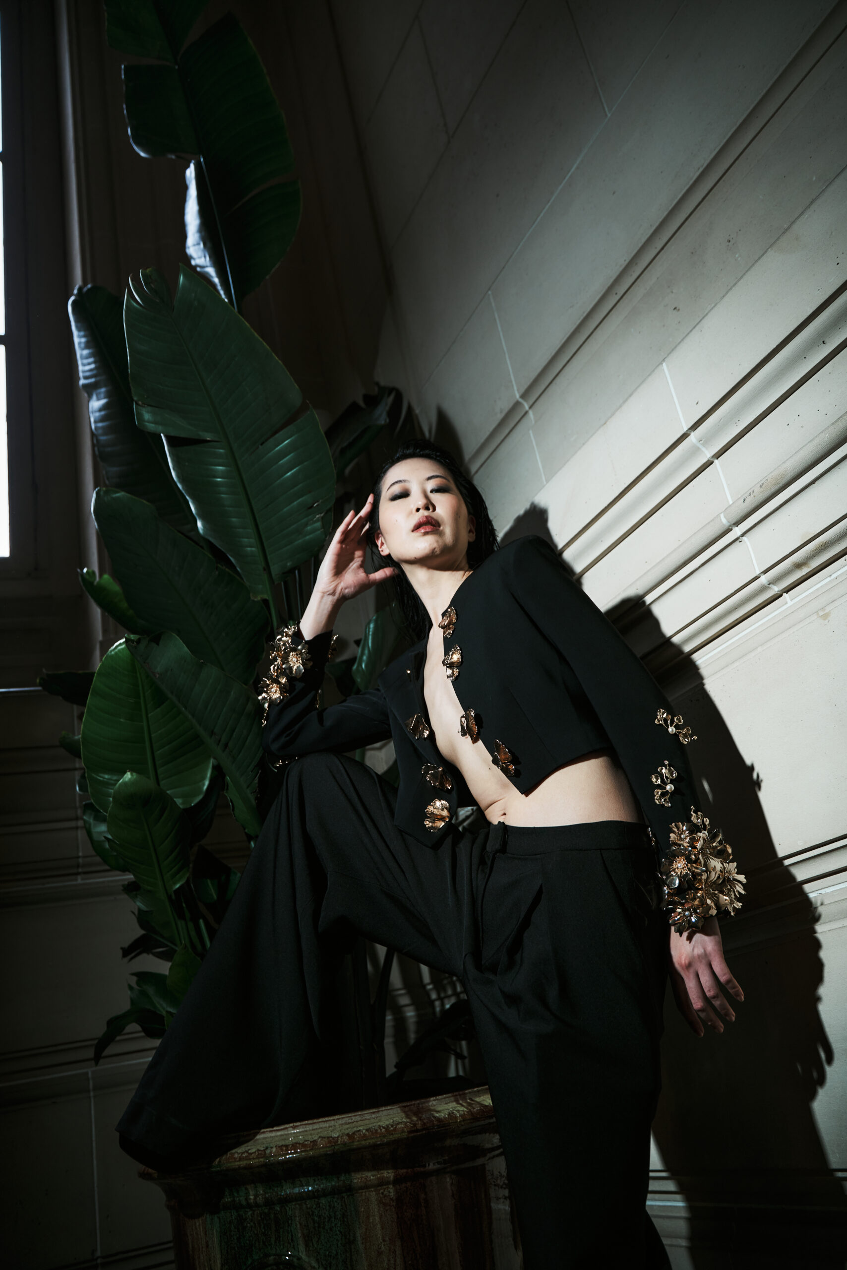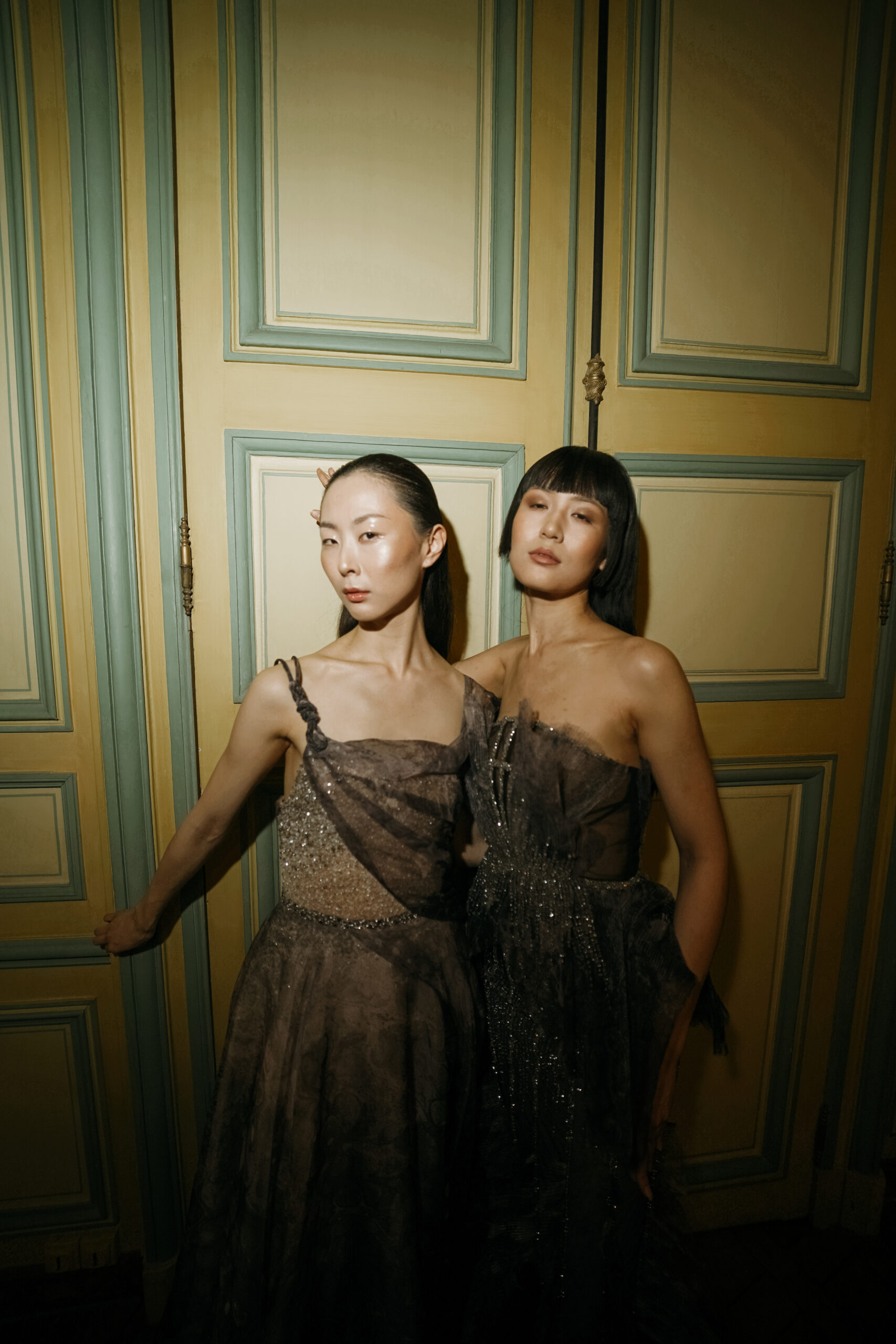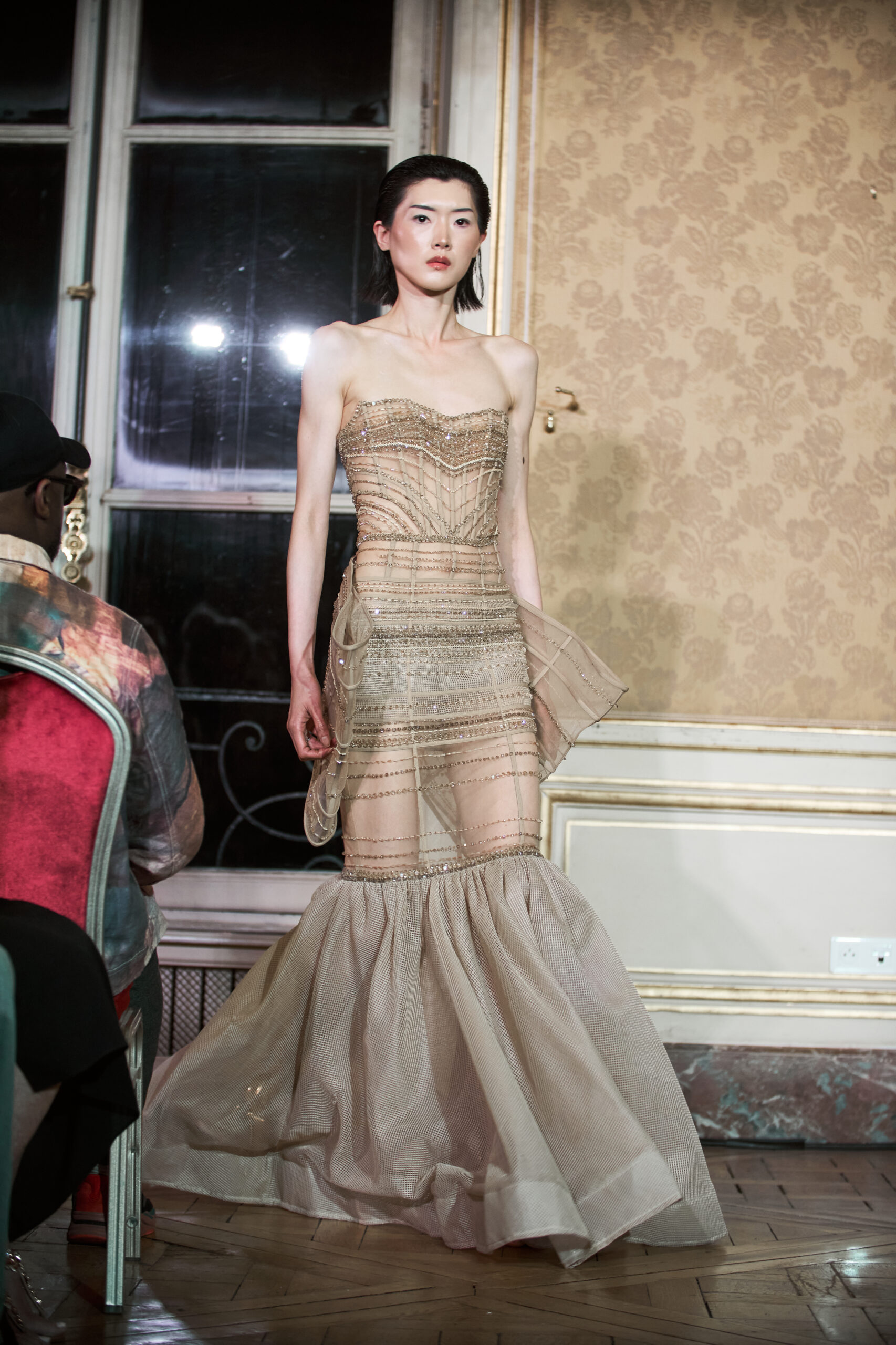 Laith Maalouf a enchanté l’audience avec sa collection inspirée des déesses, Amora: Une Symphonie de Structure et de Fluidité. Fusionnant design structuré et fluidité, chaque création rend hommage aux courbes gracieuses des statues de la Renaissance, incarnant l’essence divine de la déesse Amora à travers draperies aériennes et ornements dorés luxuriants.