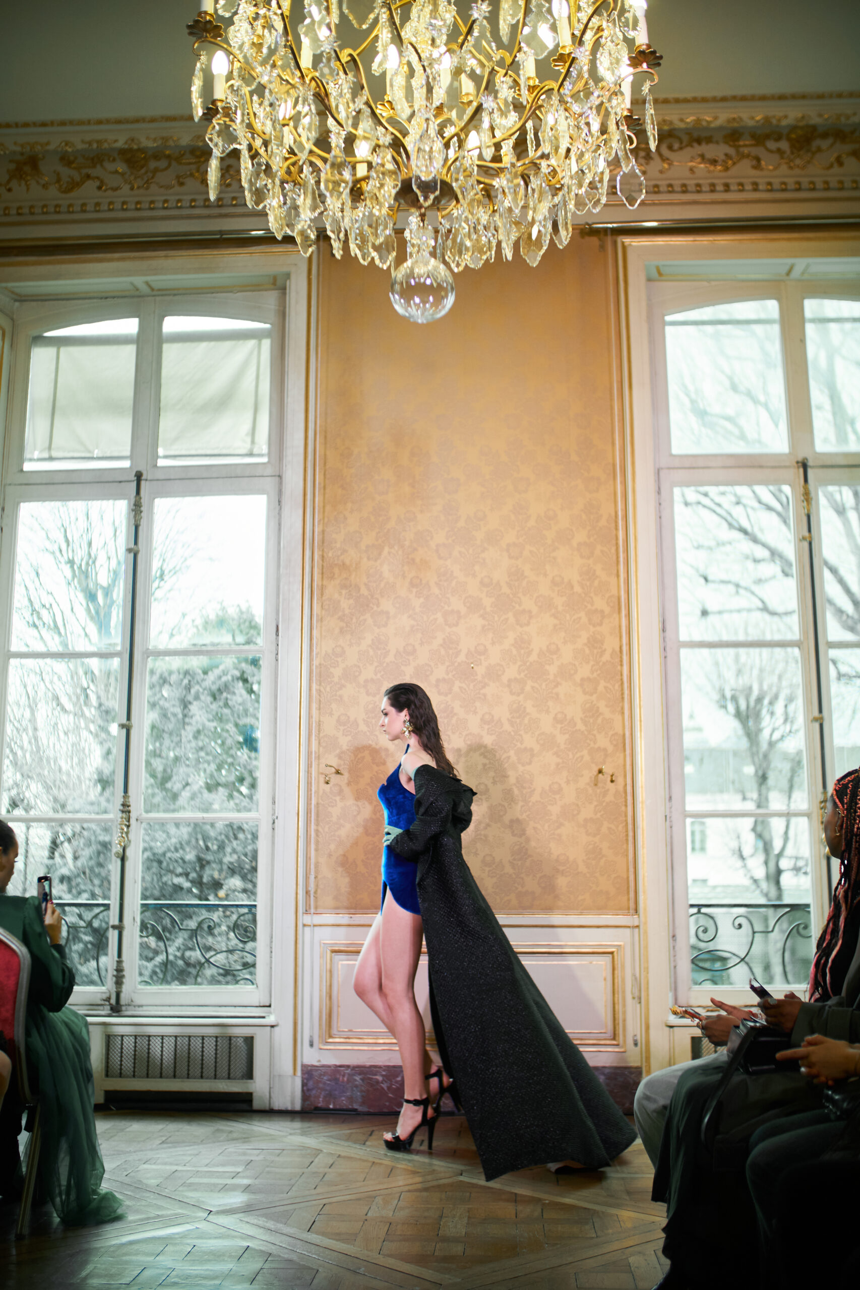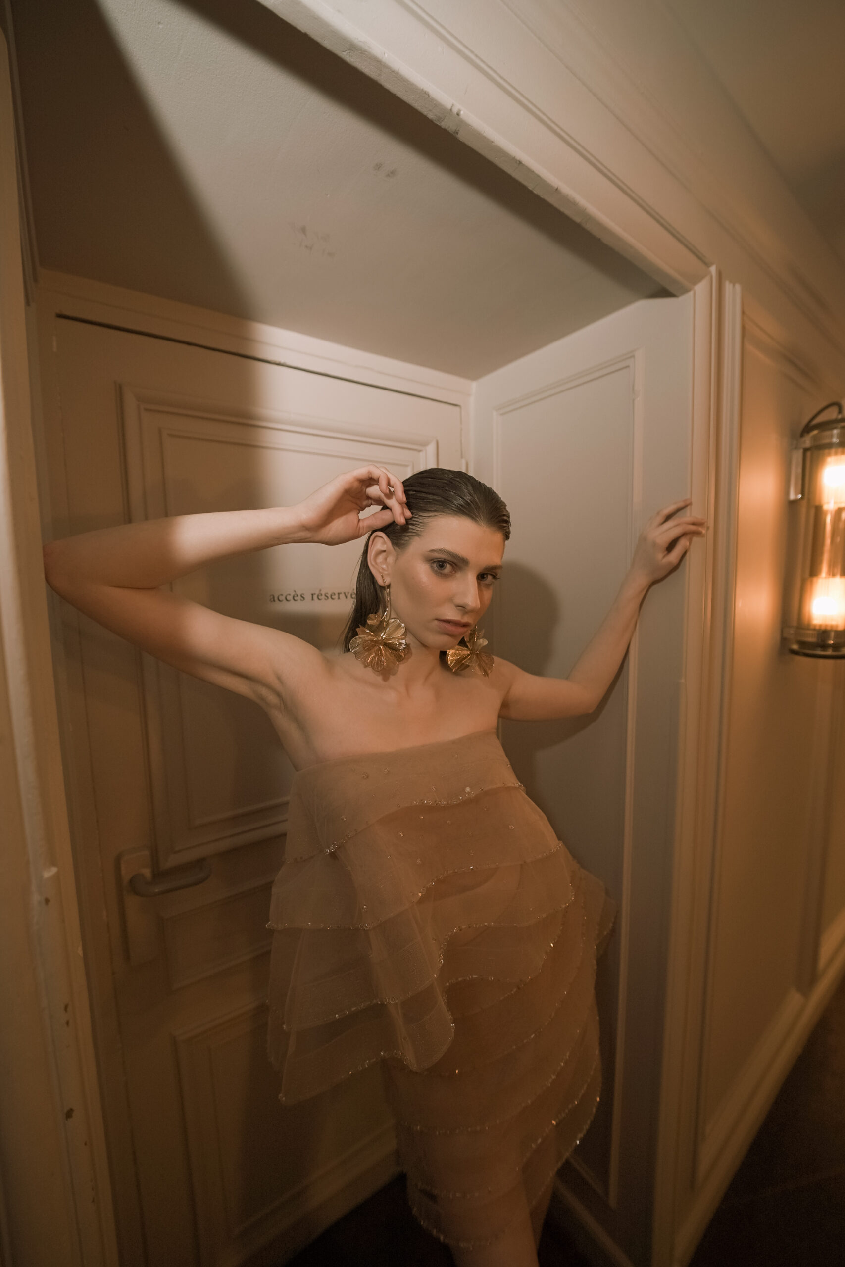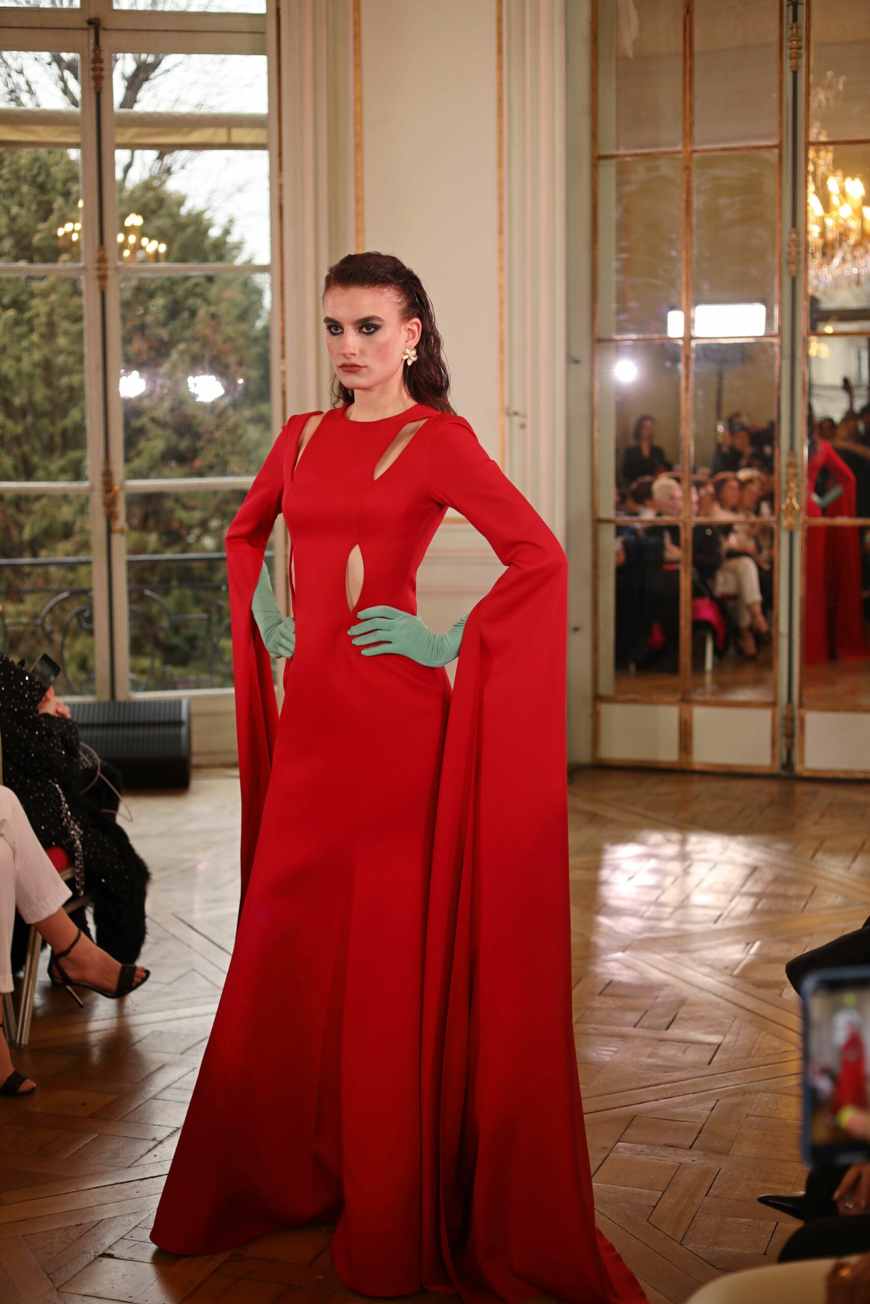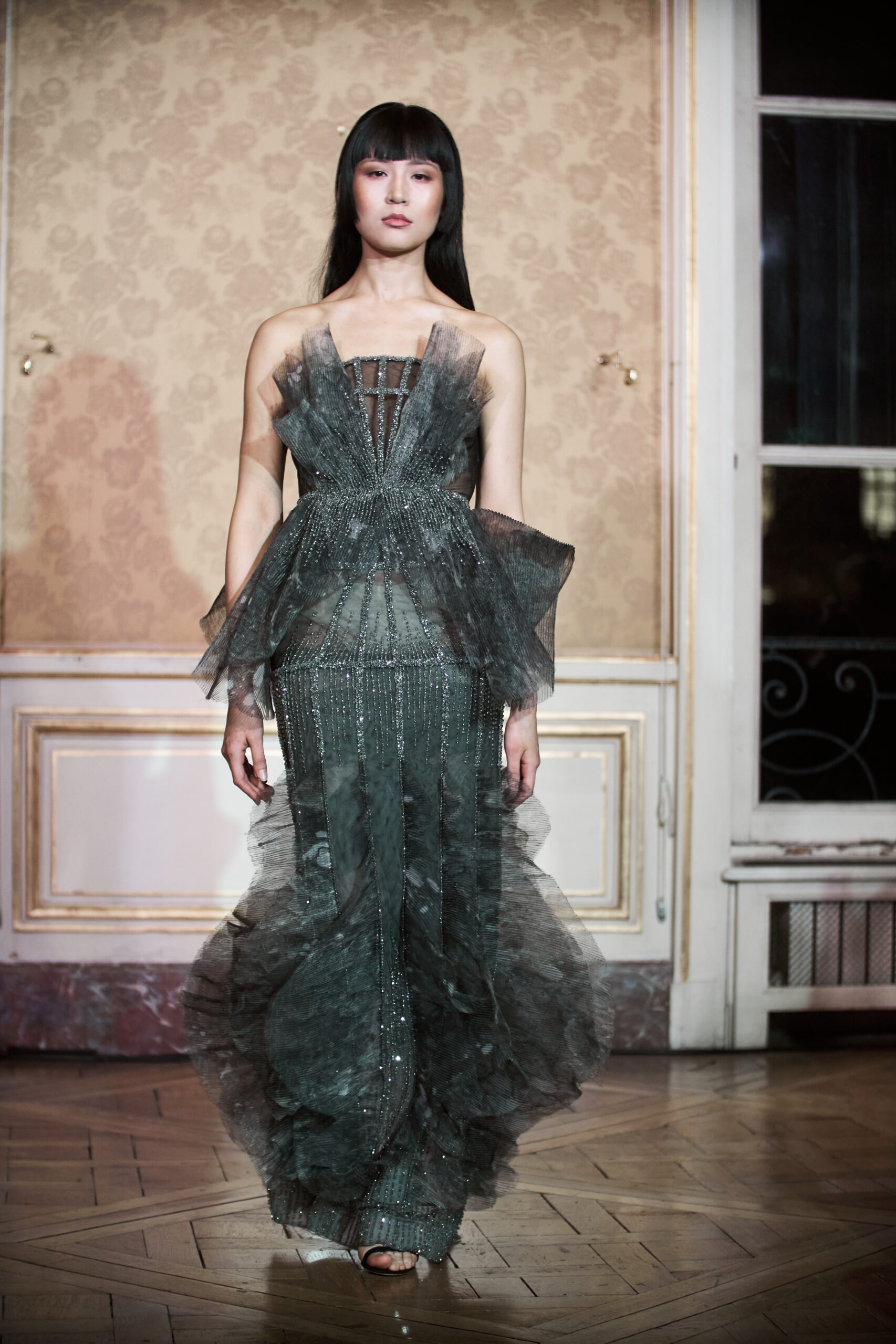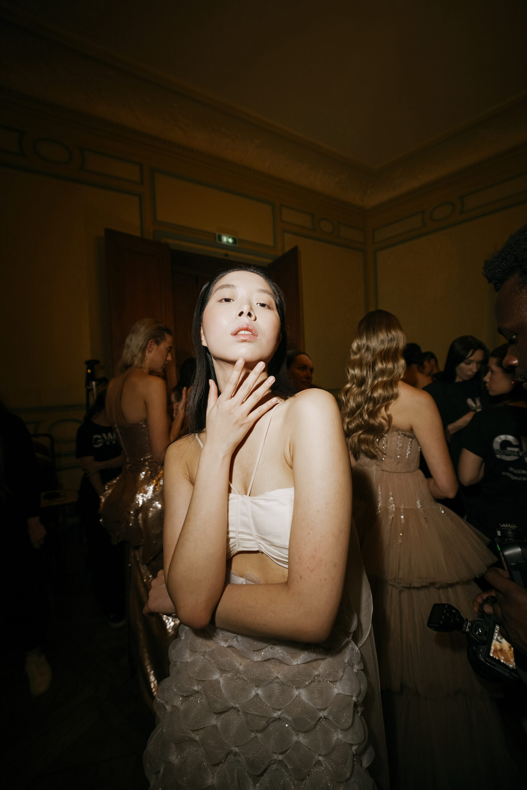 Laith Maalouf a enchanté l’audience avec sa collection inspirée des déesses, Amora: Une Symphonie de Structure et de Fluidité. Fusionnant design structuré et fluidité, chaque création rend hommage aux courbes gracieuses des statues de la Renaissance, incarnant l’essence divine de la déesse Amora à travers draperies aériennes et ornements dorés luxuriants.