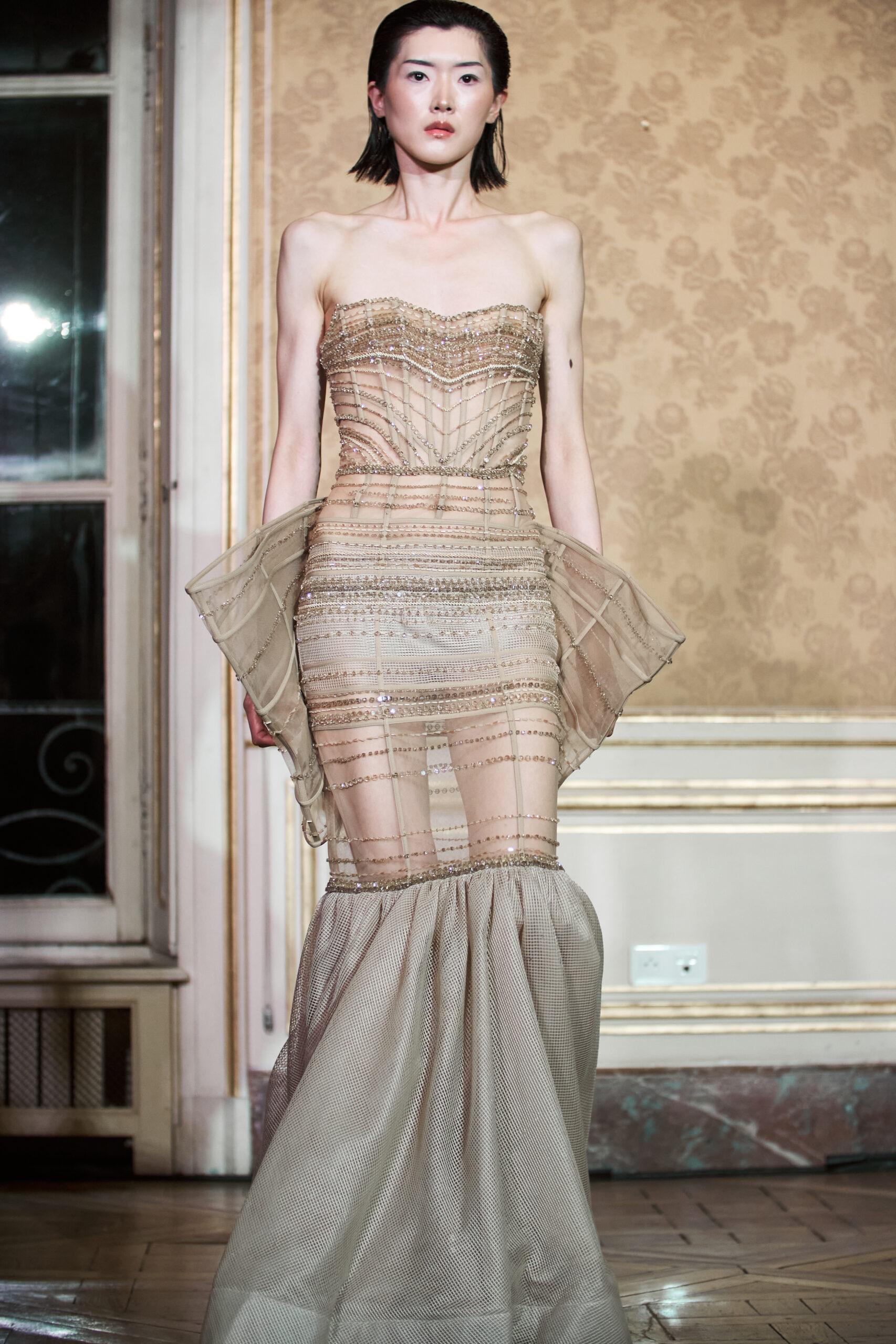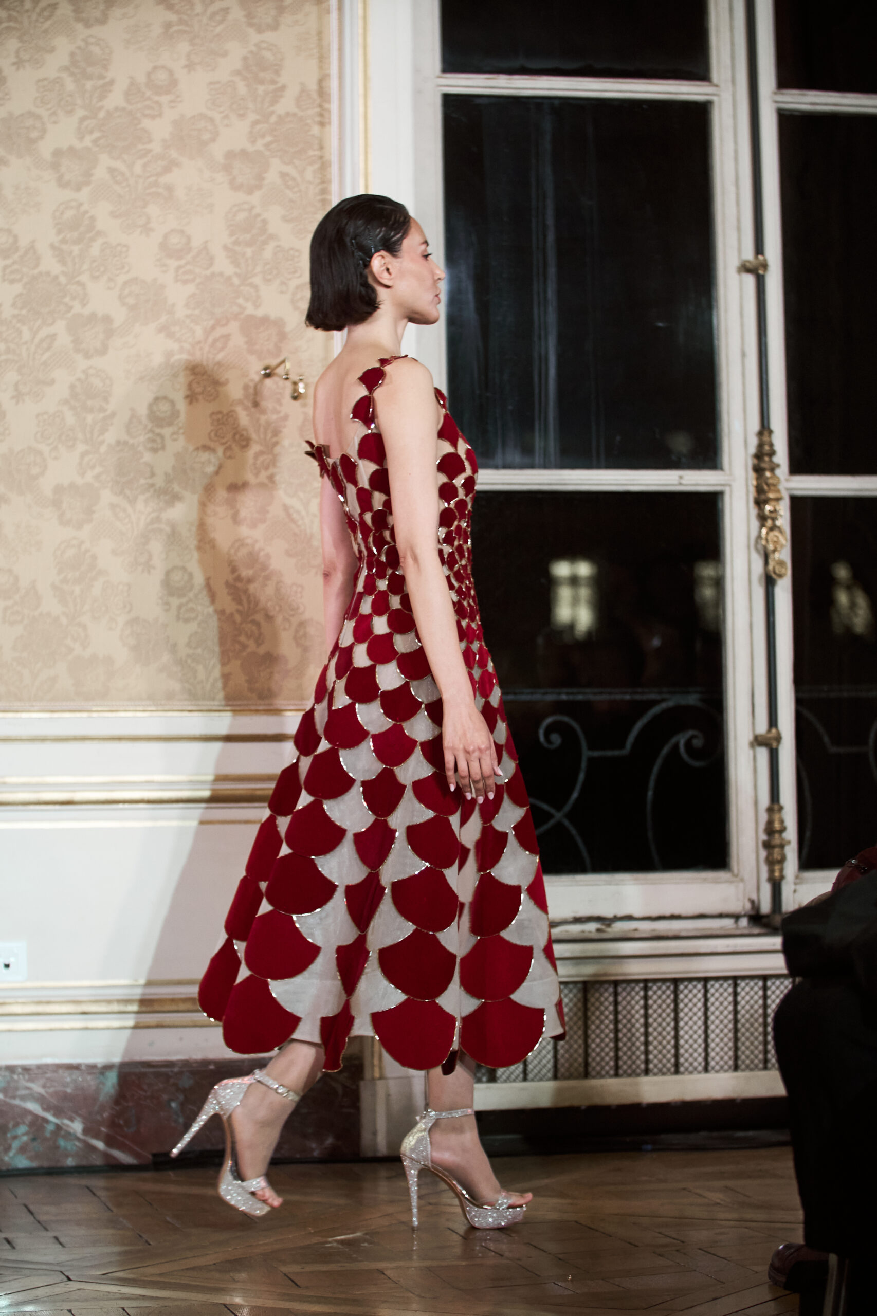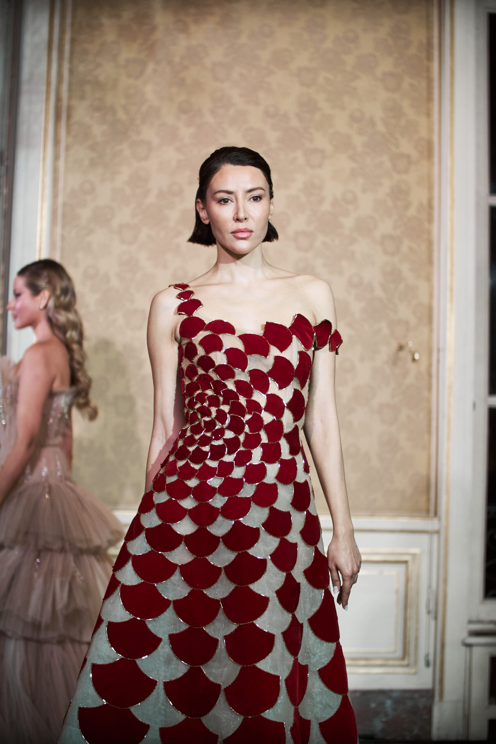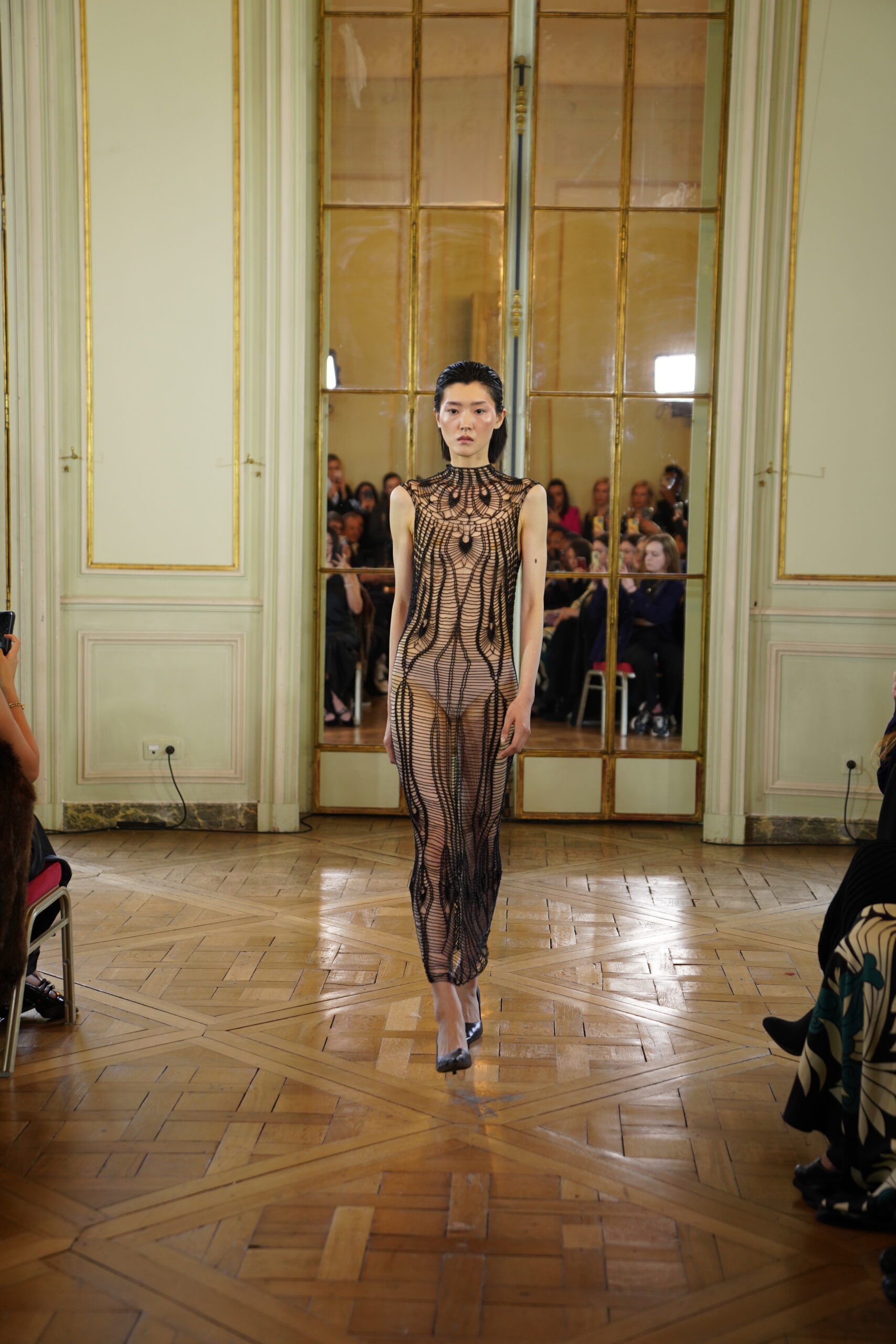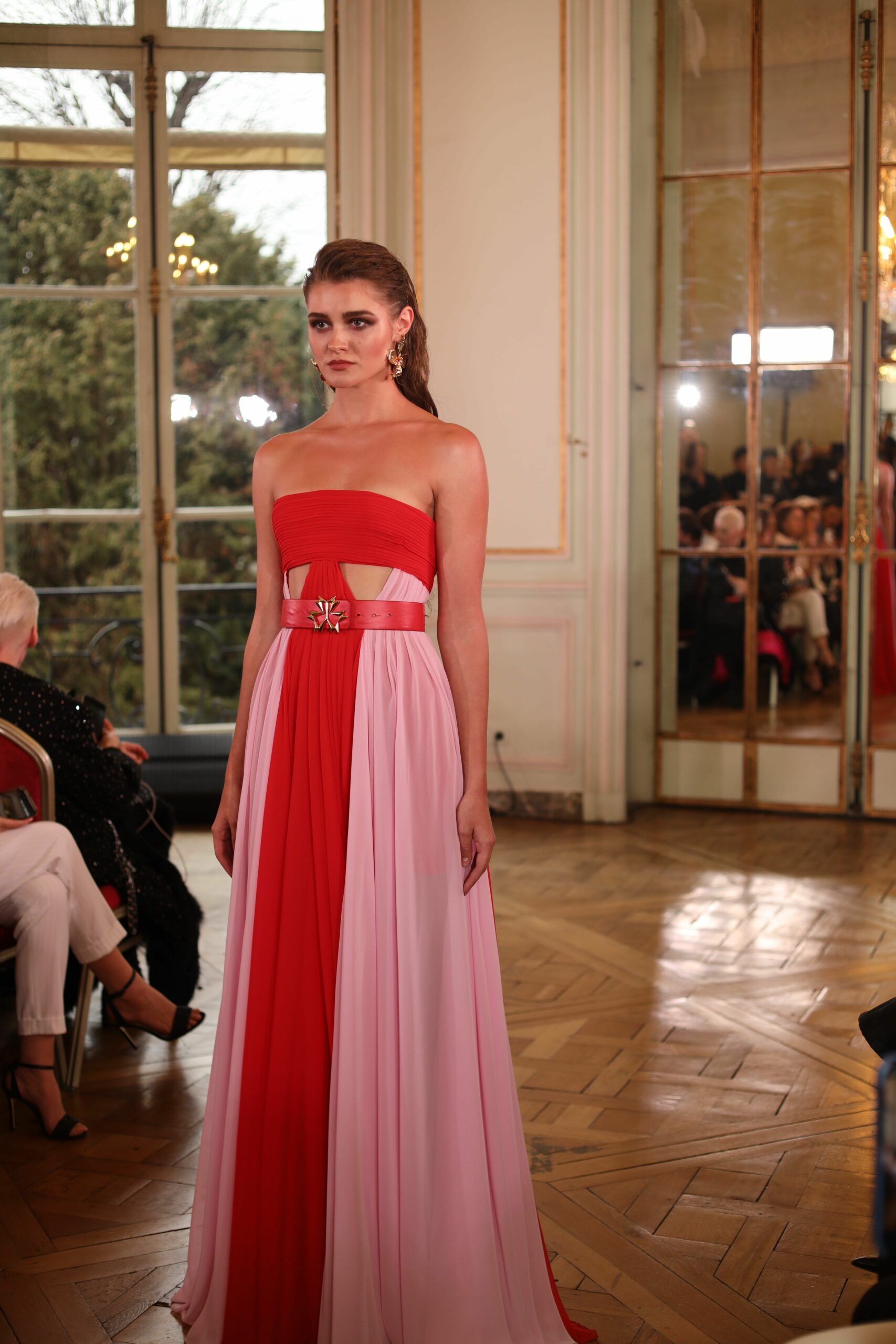 Laith Maalouf a enchanté l’audience avec sa collection inspirée des déesses, Amora: Une Symphonie de Structure et de Fluidité. Fusionnant design structuré et fluidité, chaque création rend hommage aux courbes gracieuses des statues de la Renaissance, incarnant l’essence divine de la déesse Amora à travers draperies aériennes et ornements dorés luxuriants.