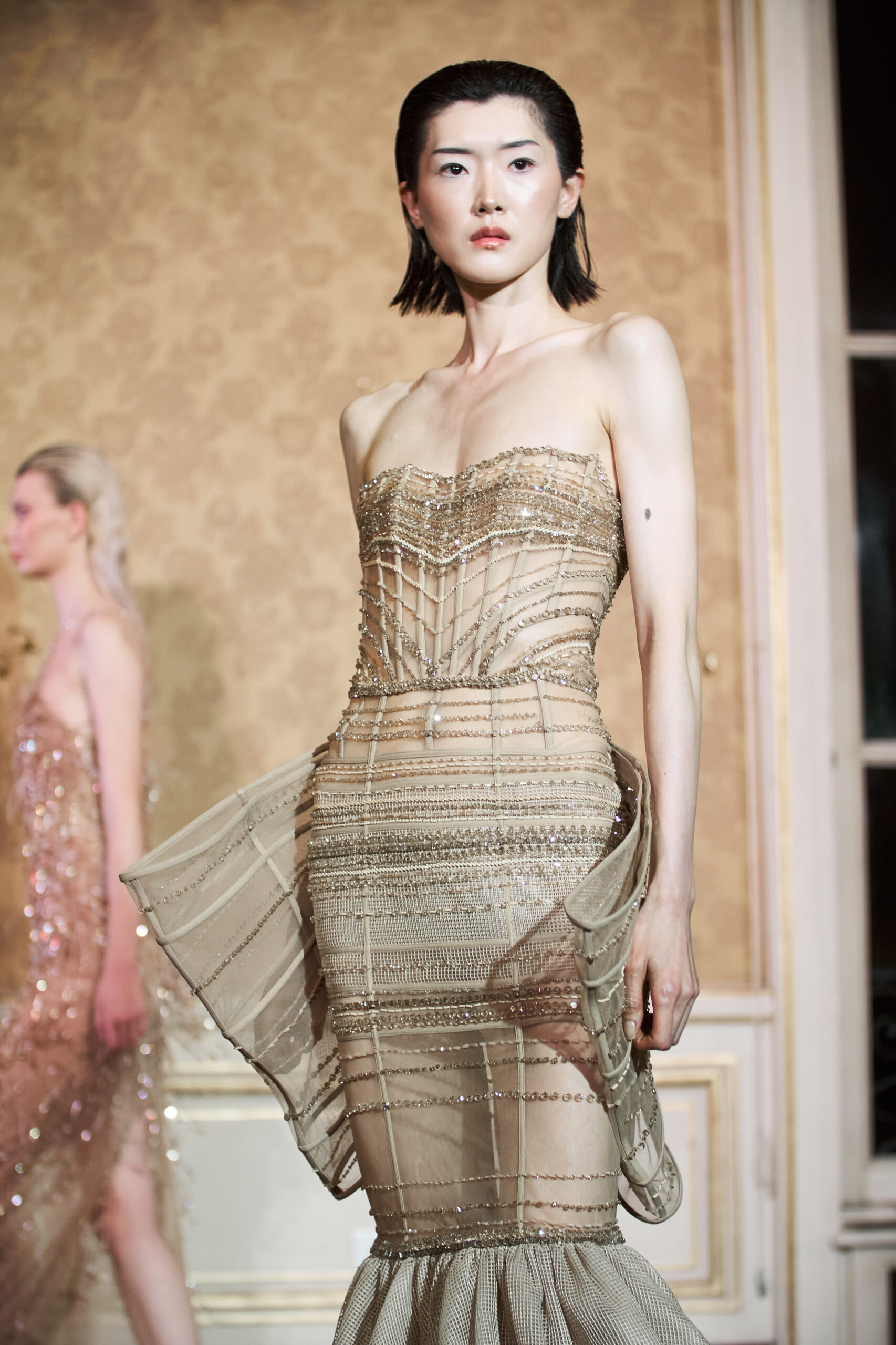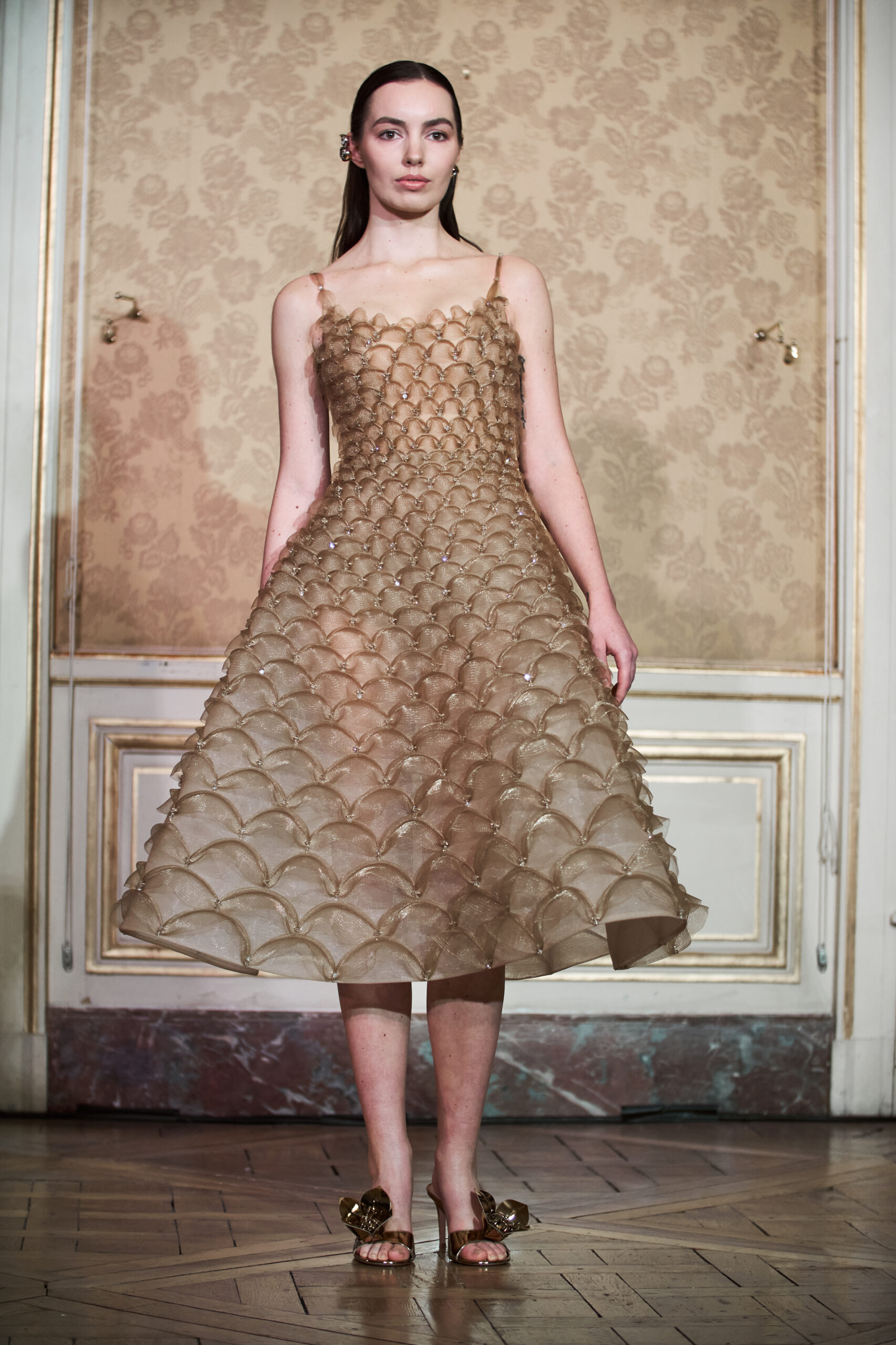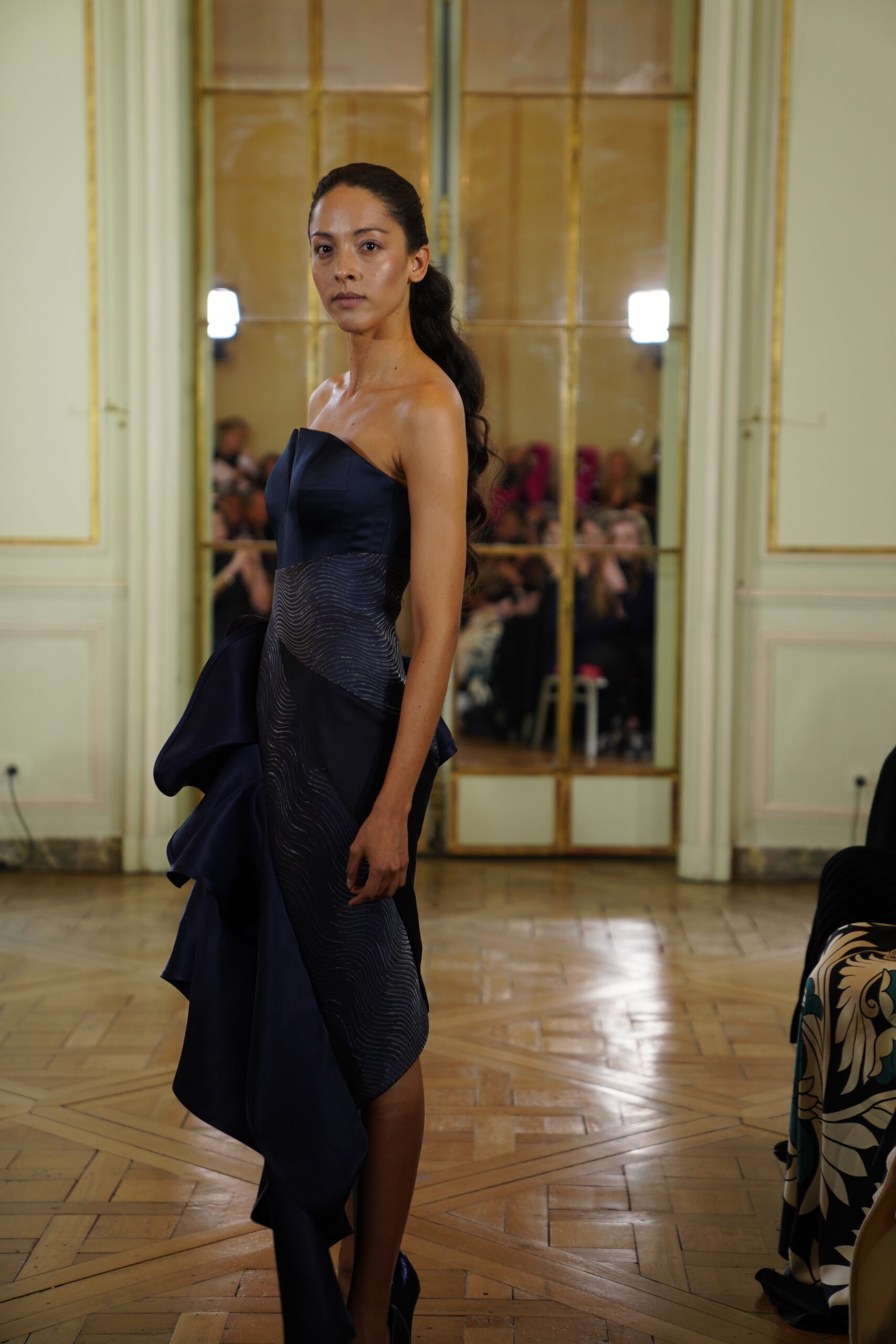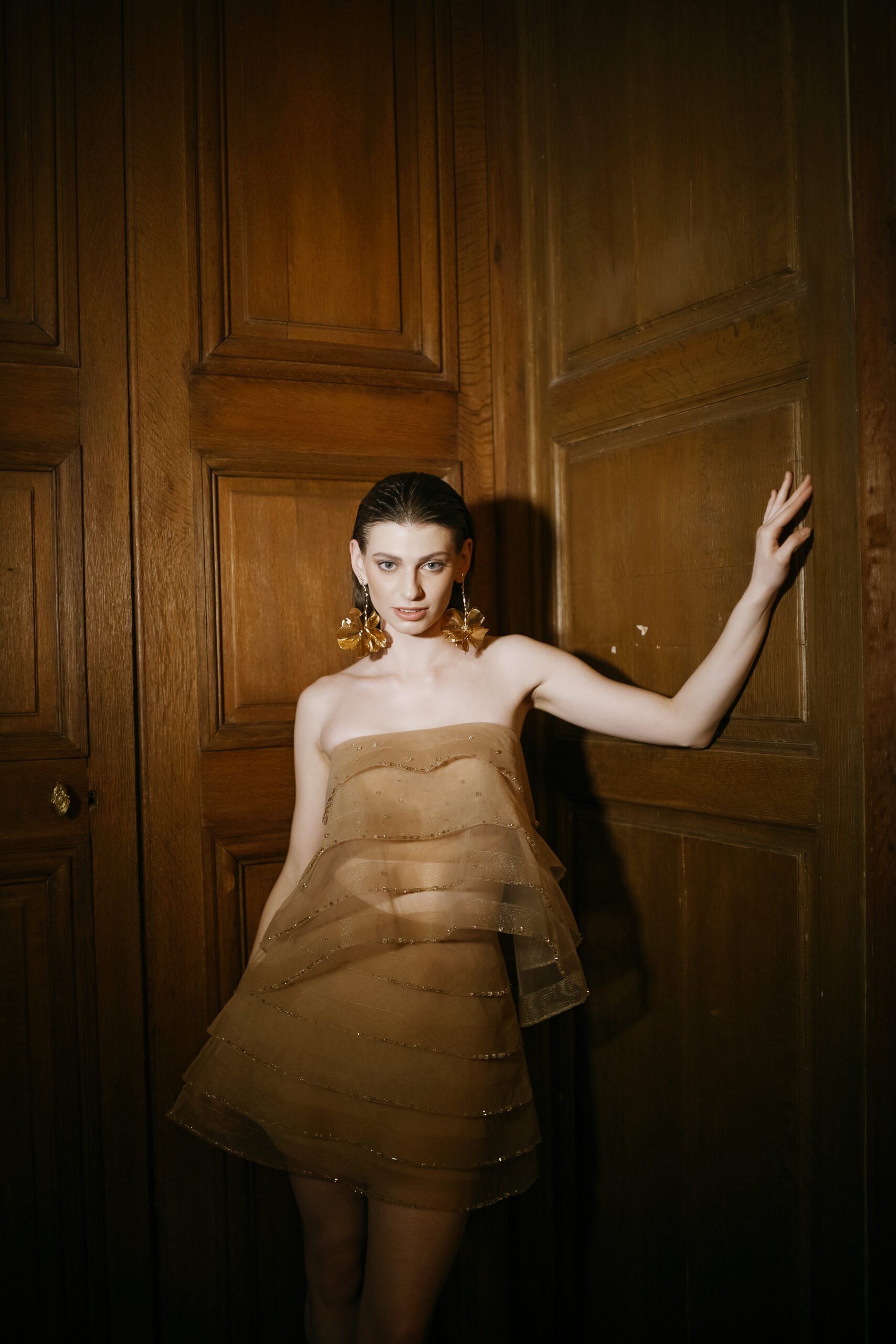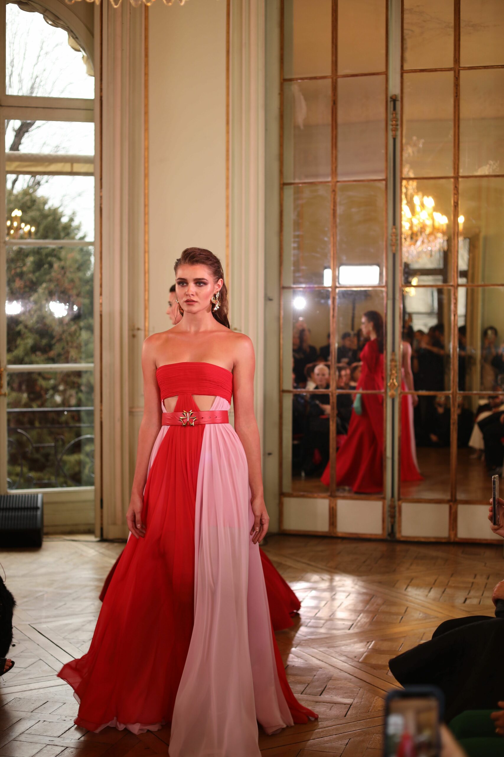 Laith Maalouf a enchanté l’audience avec sa collection inspirée des déesses, Amora: Une Symphonie de Structure et de Fluidité. Fusionnant design structuré et fluidité, chaque création rend hommage aux courbes gracieuses des statues de la Renaissance, incarnant l’essence divine de la déesse Amora à travers draperies aériennes et ornements dorés luxuriants.