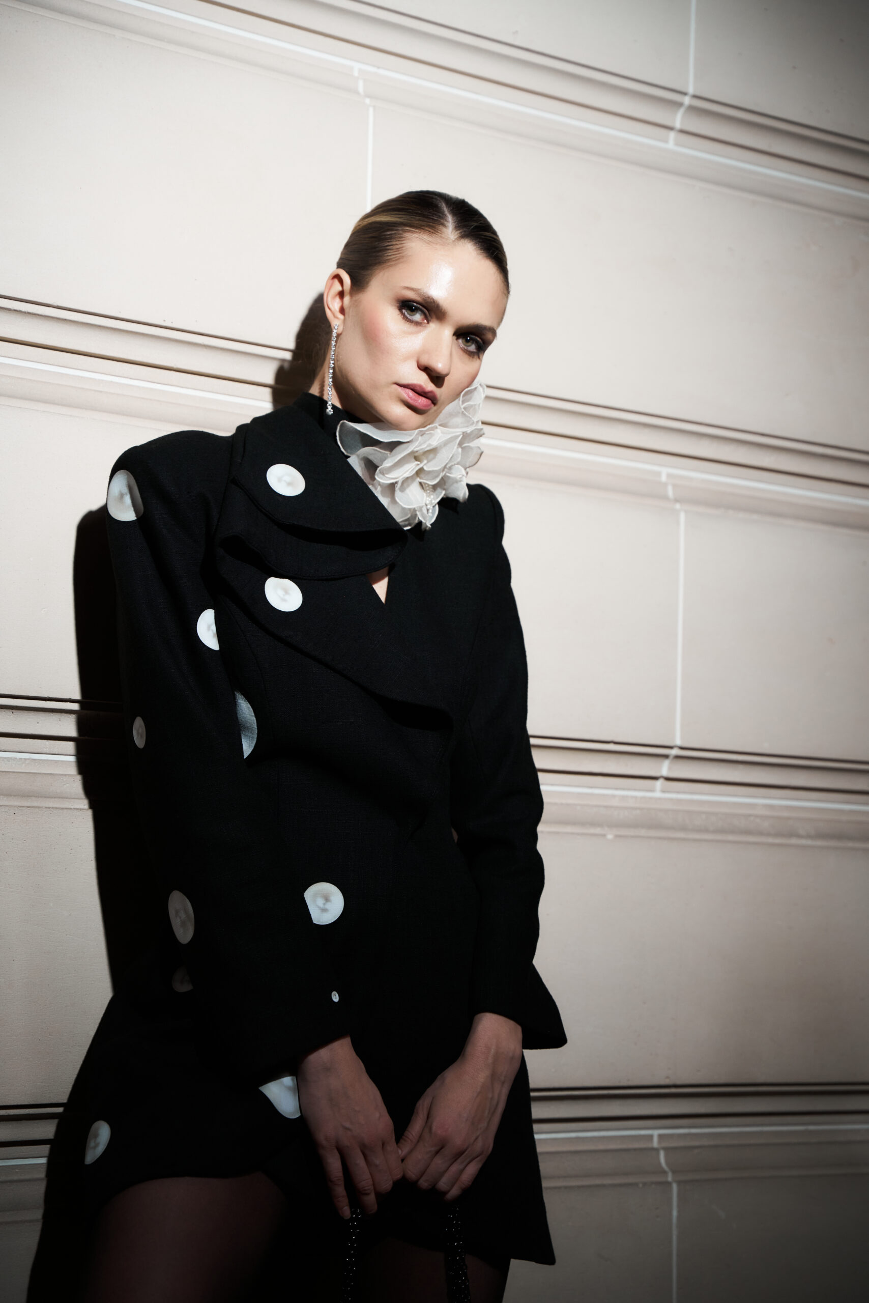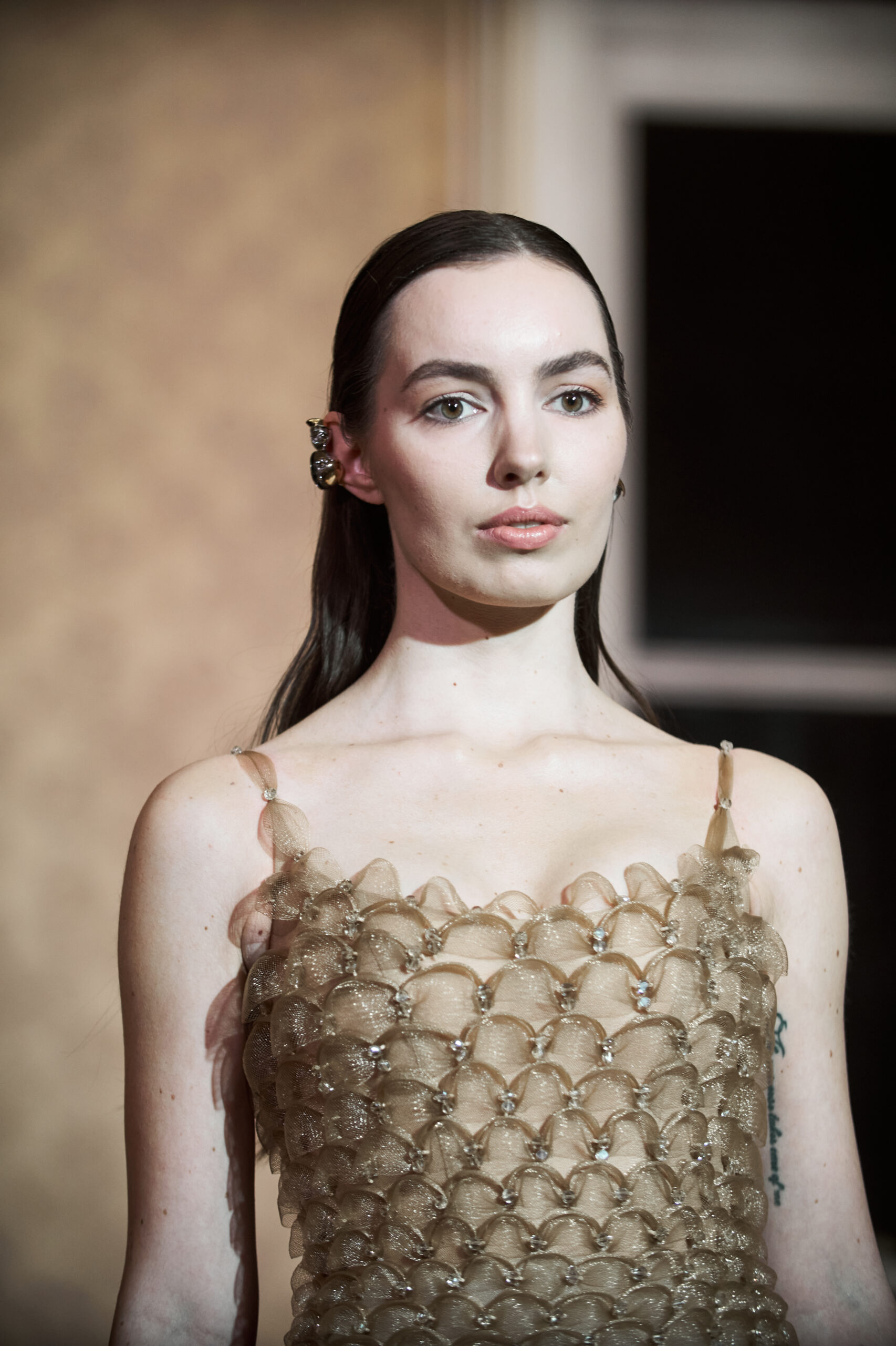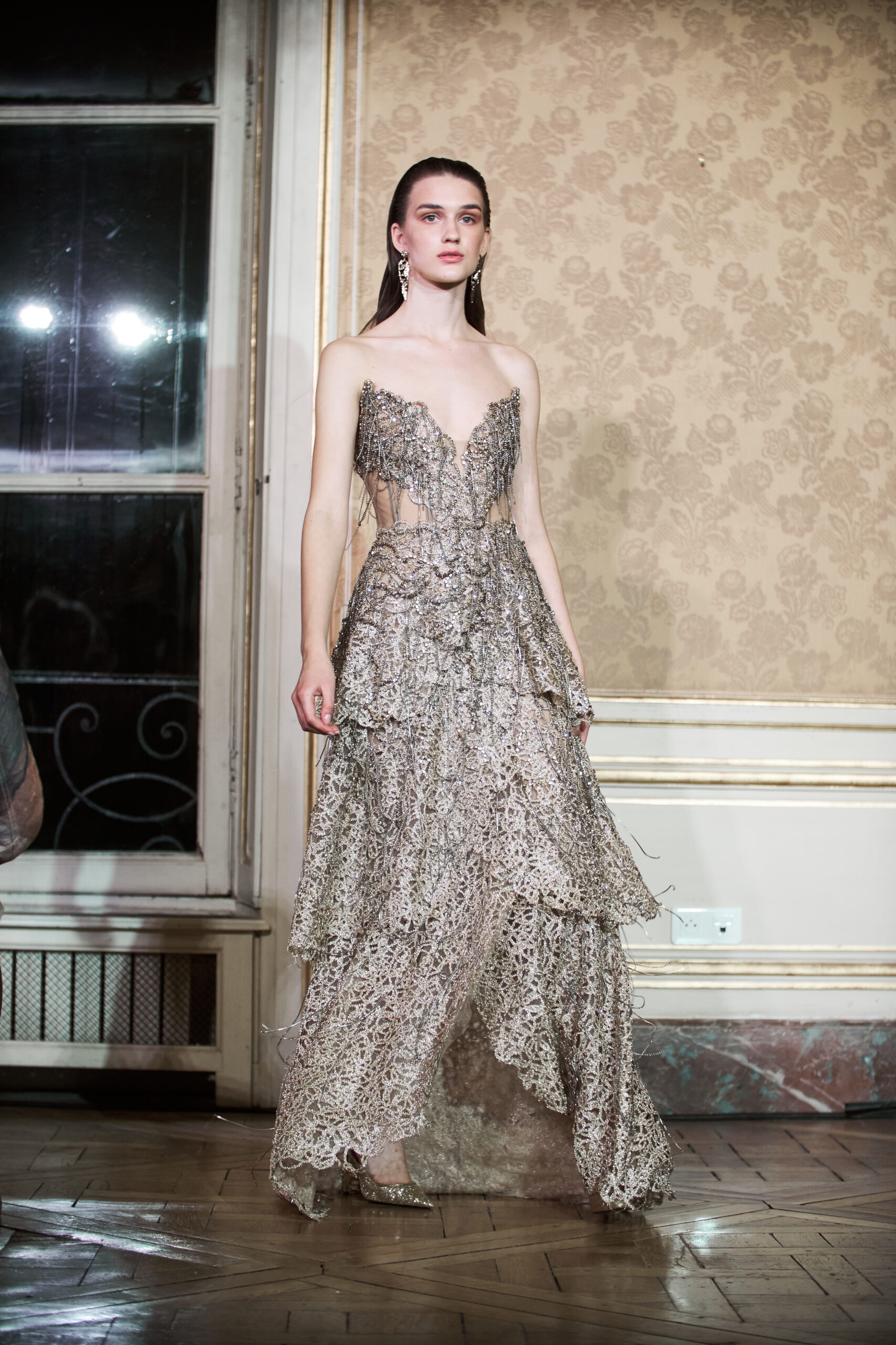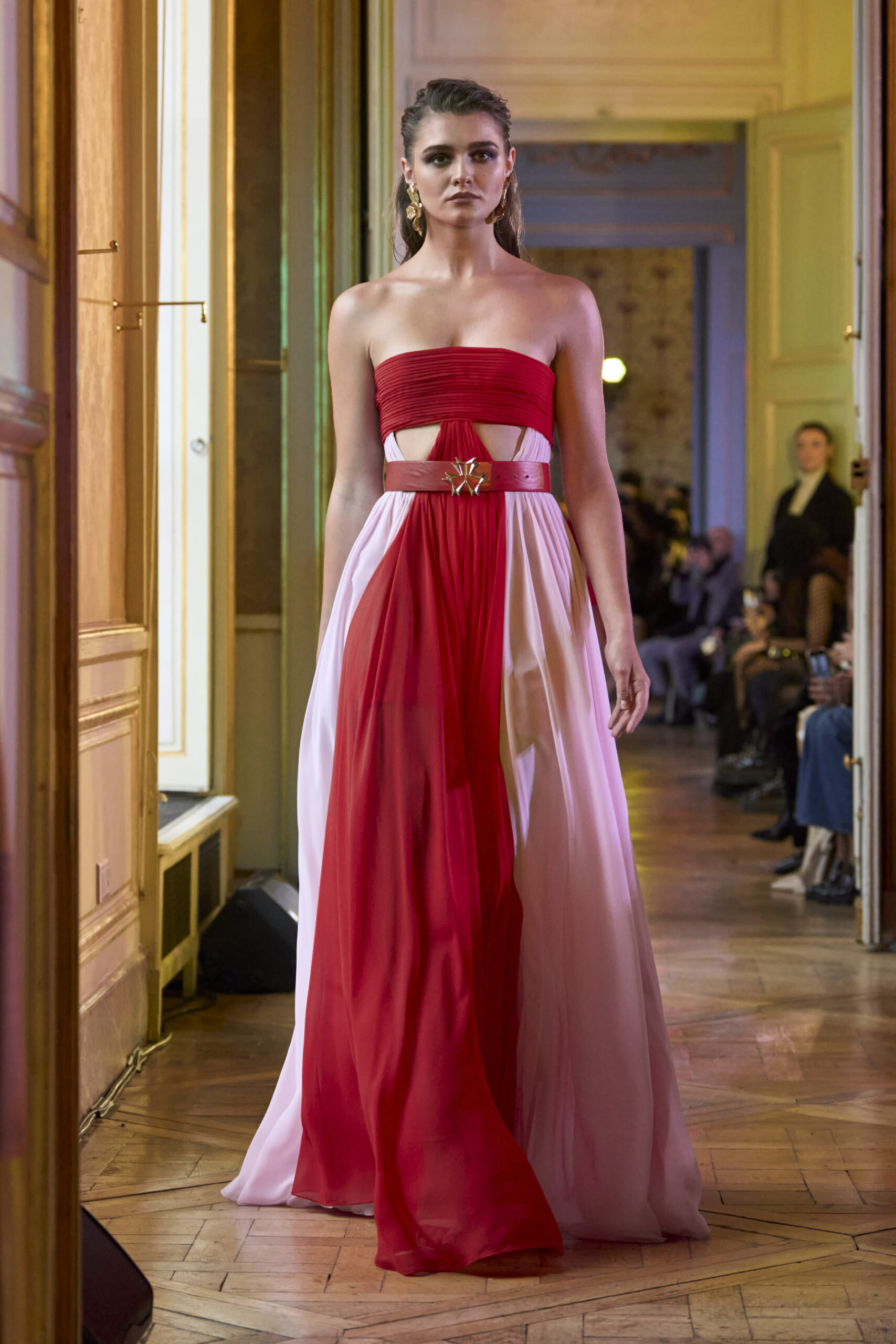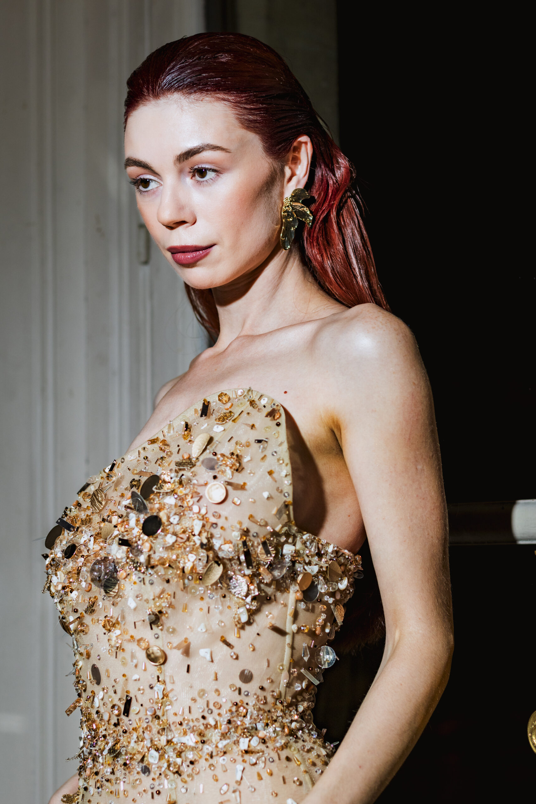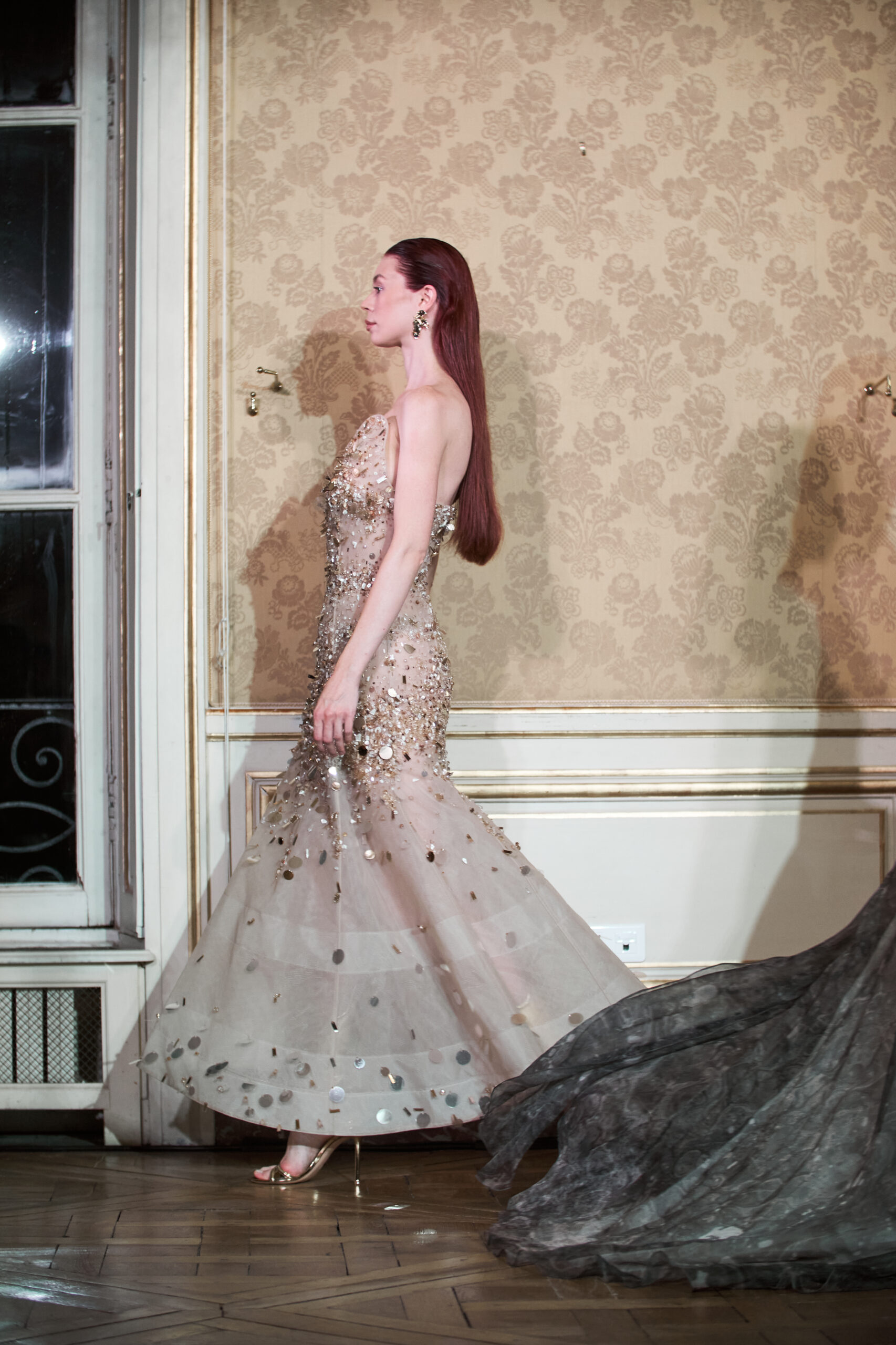 Laith Maalouf a enchanté l’audience avec sa collection inspirée des déesses, Amora: Une Symphonie de Structure et de Fluidité. Fusionnant design structuré et fluidité, chaque création rend hommage aux courbes gracieuses des statues de la Renaissance, incarnant l’essence divine de la déesse Amora à travers draperies aériennes et ornements dorés luxuriants.