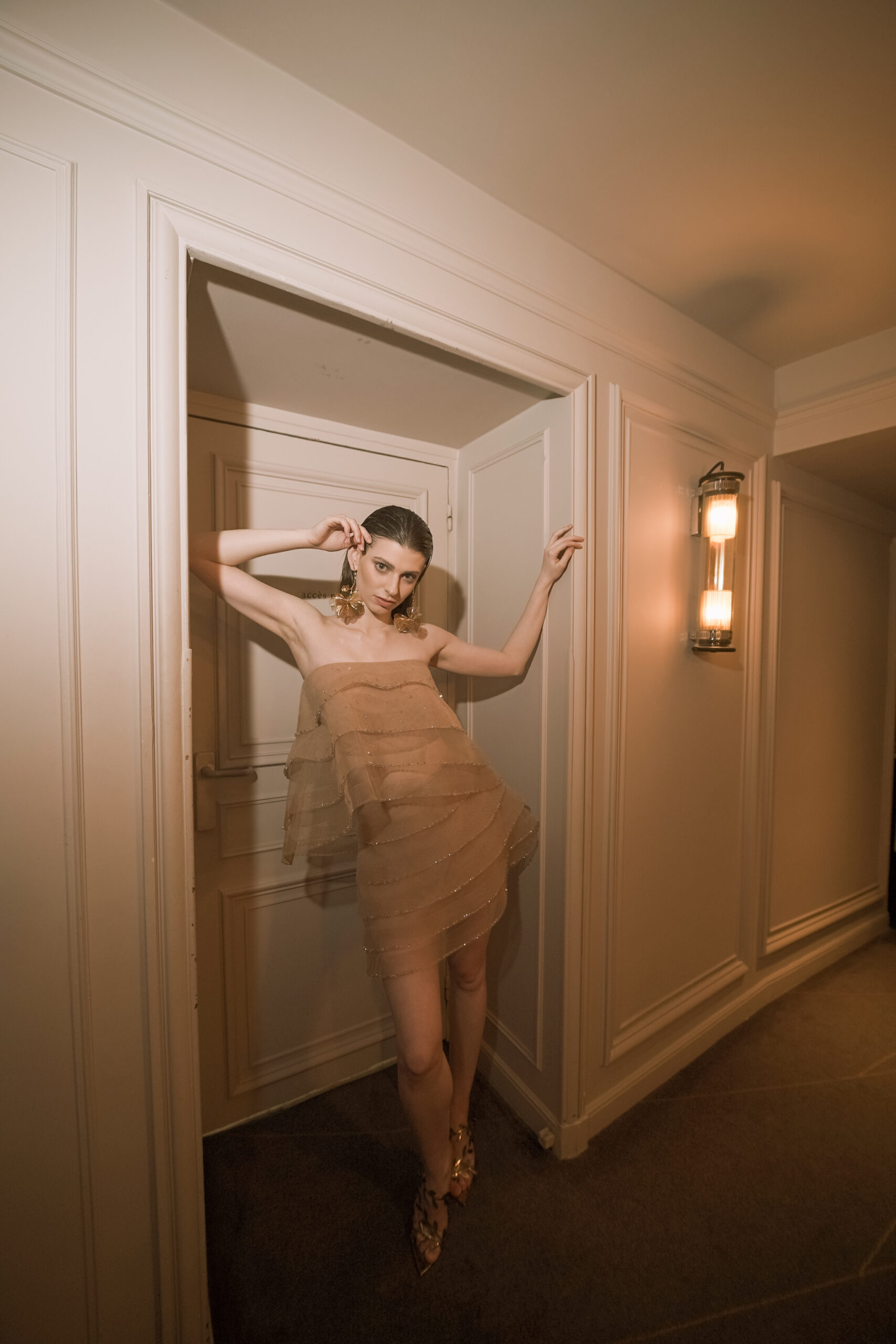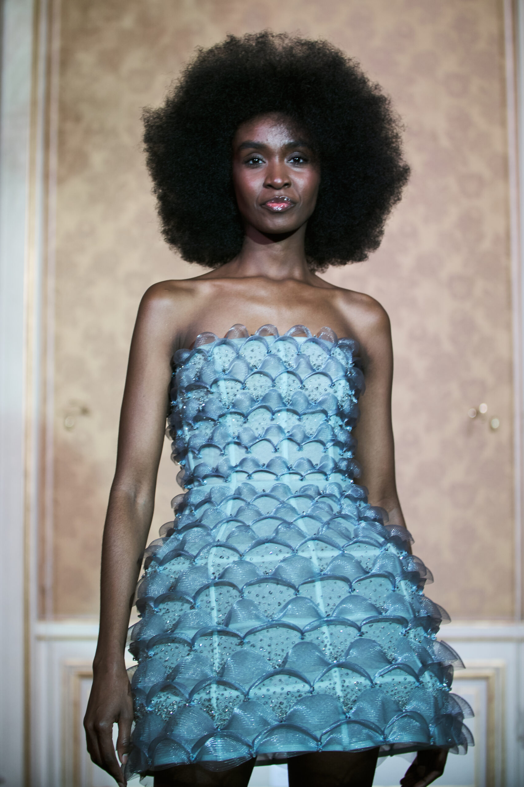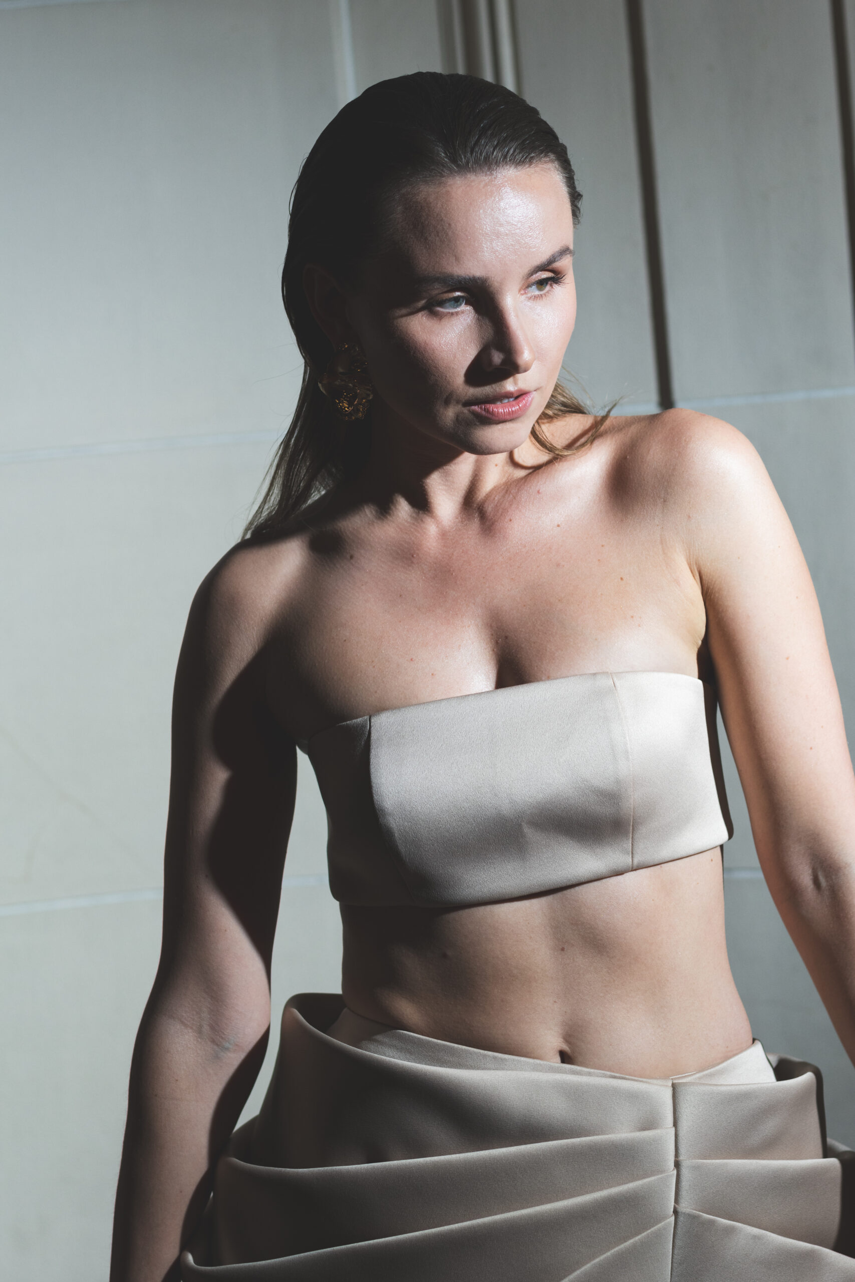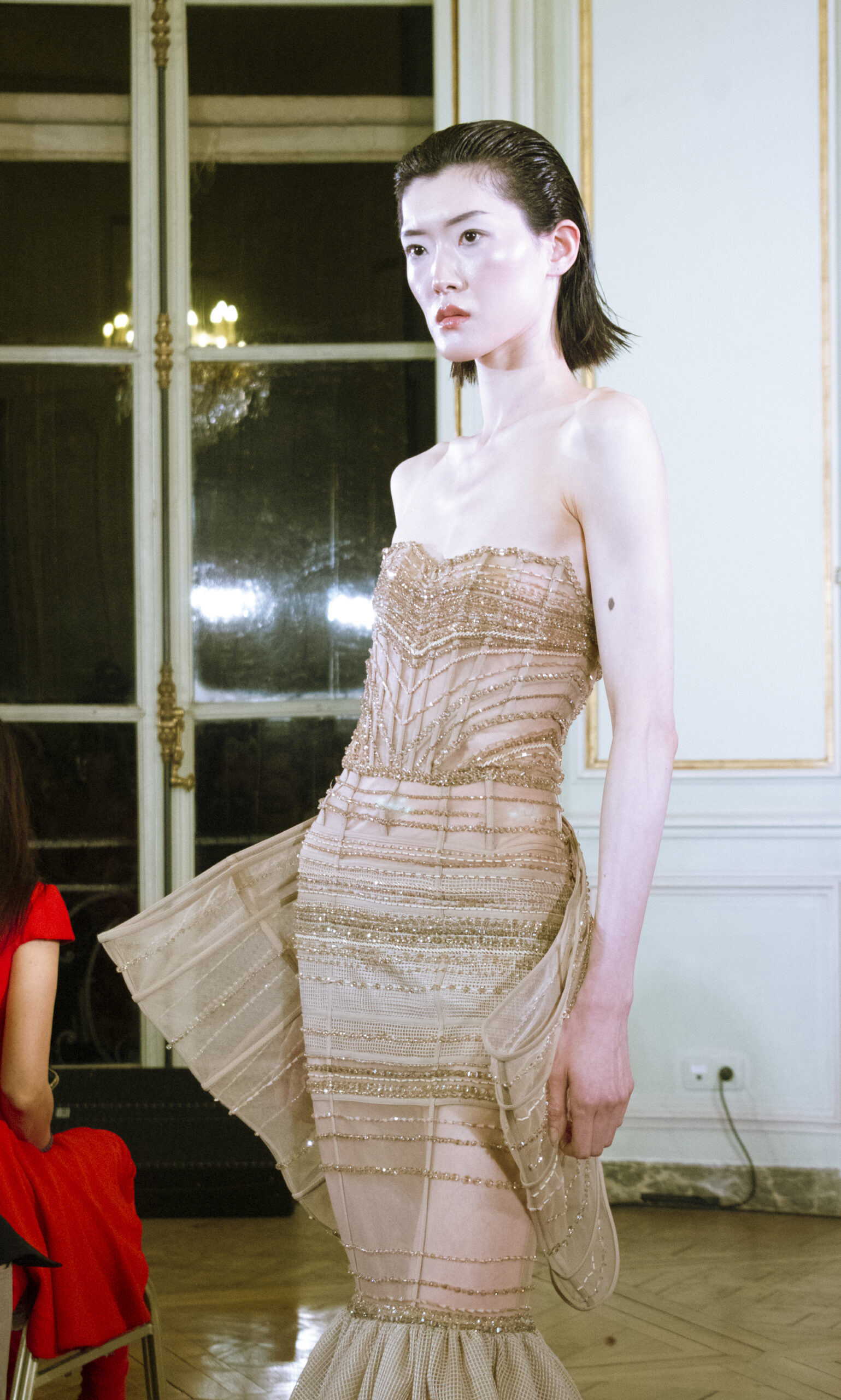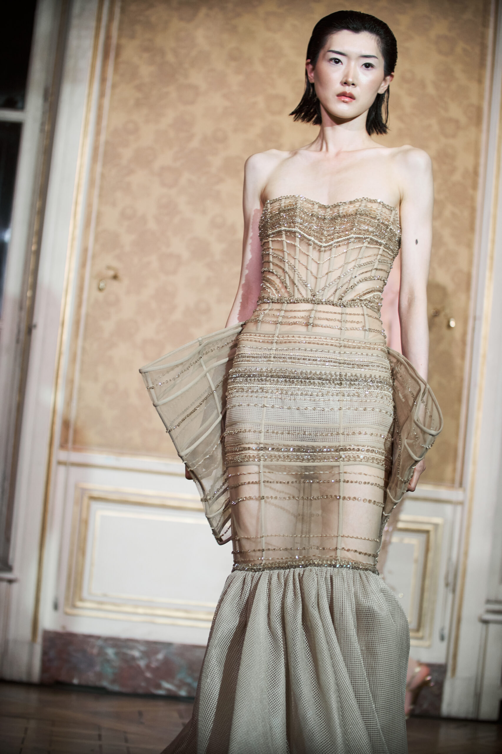 Laith Maalouf a enchanté l’audience avec sa collection inspirée des déesses, Amora: Une Symphonie de Structure et de Fluidité. Fusionnant design structuré et fluidité, chaque création rend hommage aux courbes gracieuses des statues de la Renaissance, incarnant l’essence divine de la déesse Amora à travers draperies aériennes et ornements dorés luxuriants.