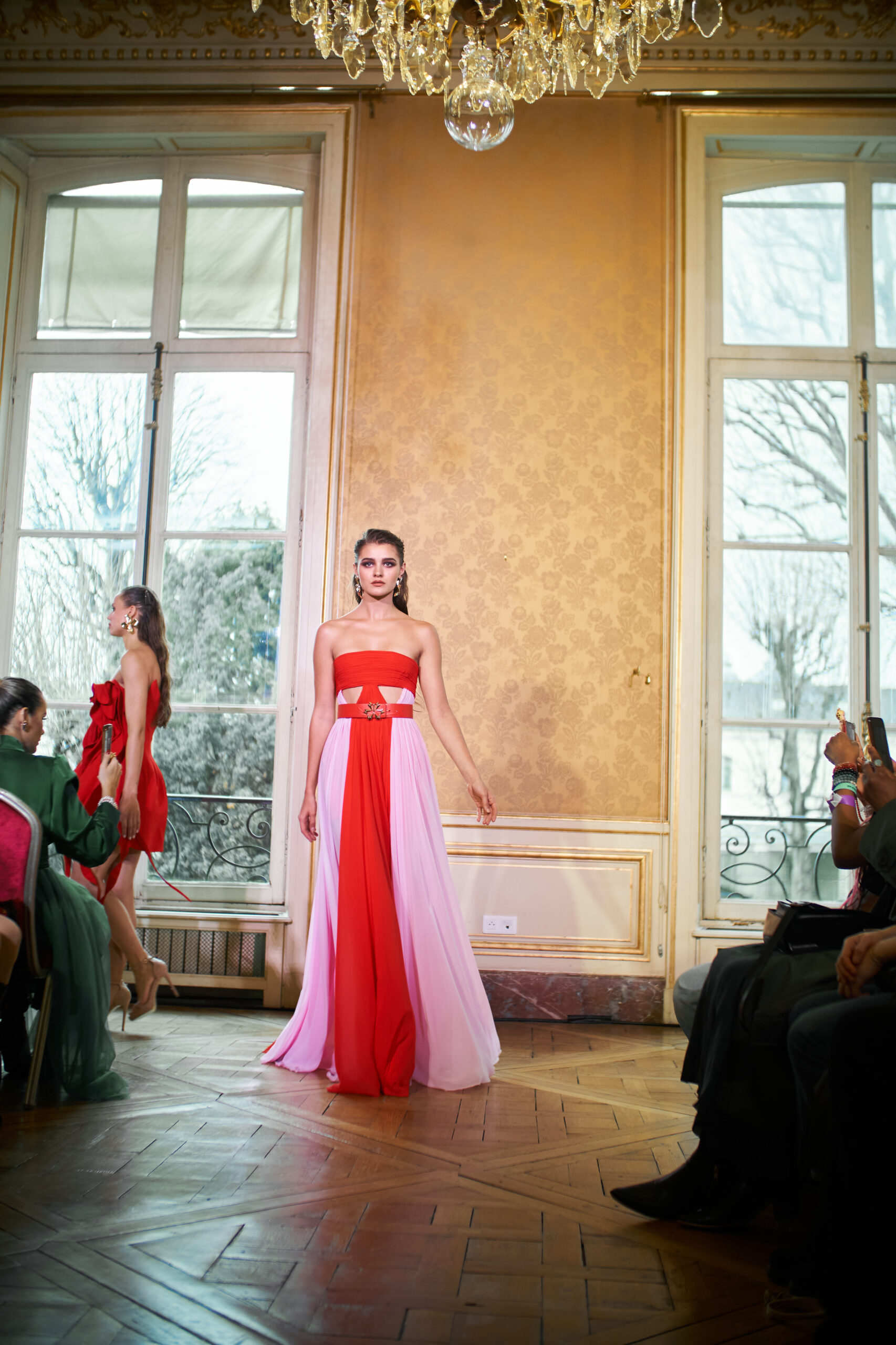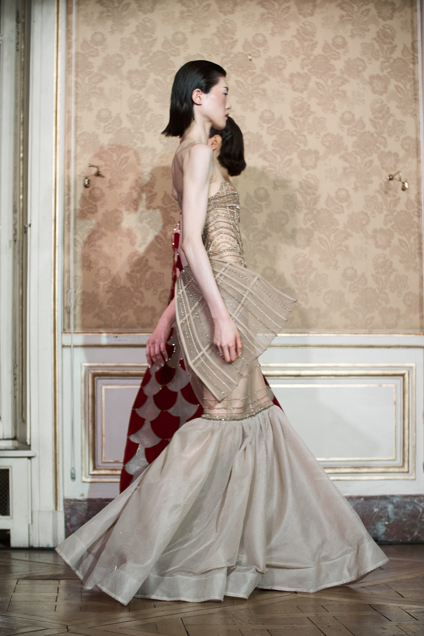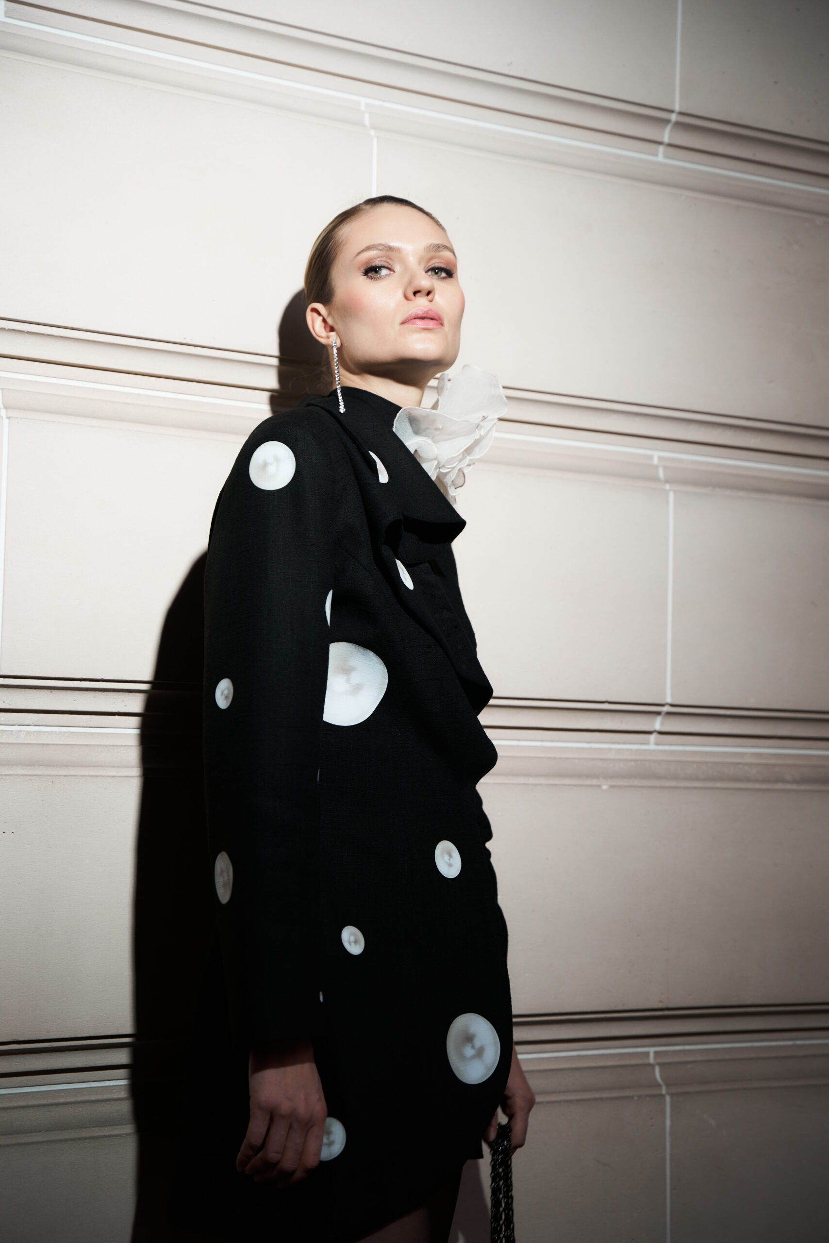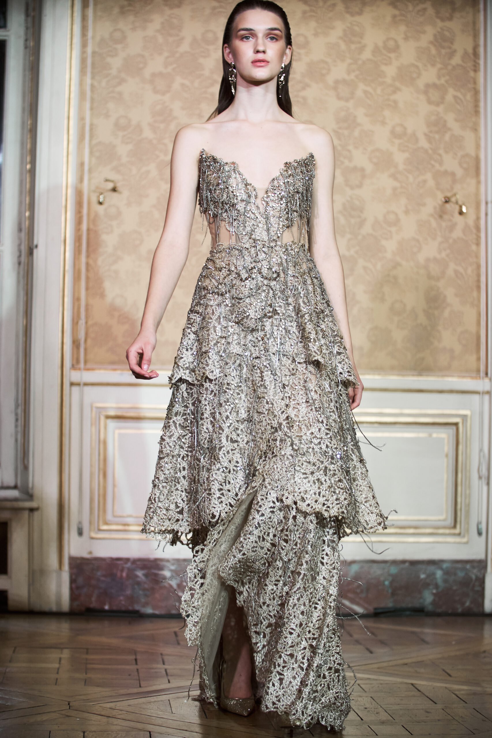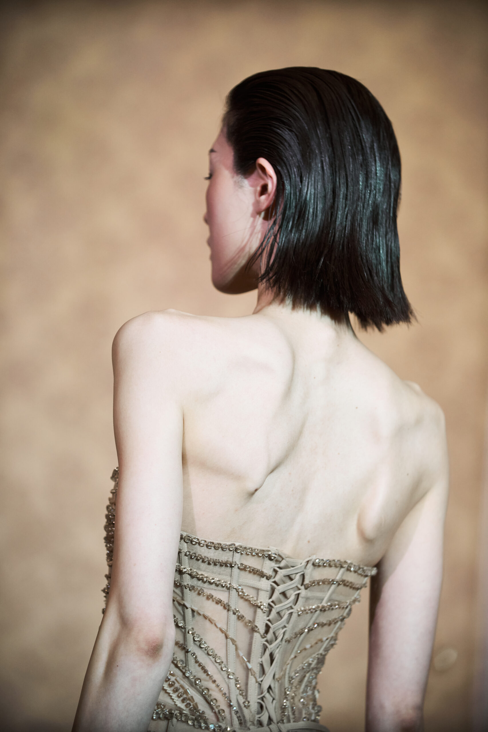 Laith Maalouf a enchanté l’audience avec sa collection inspirée des déesses, Amora: Une Symphonie de Structure et de Fluidité. Fusionnant design structuré et fluidité, chaque création rend hommage aux courbes gracieuses des statues de la Renaissance, incarnant l’essence divine de la déesse Amora à travers draperies aériennes et ornements dorés luxuriants.