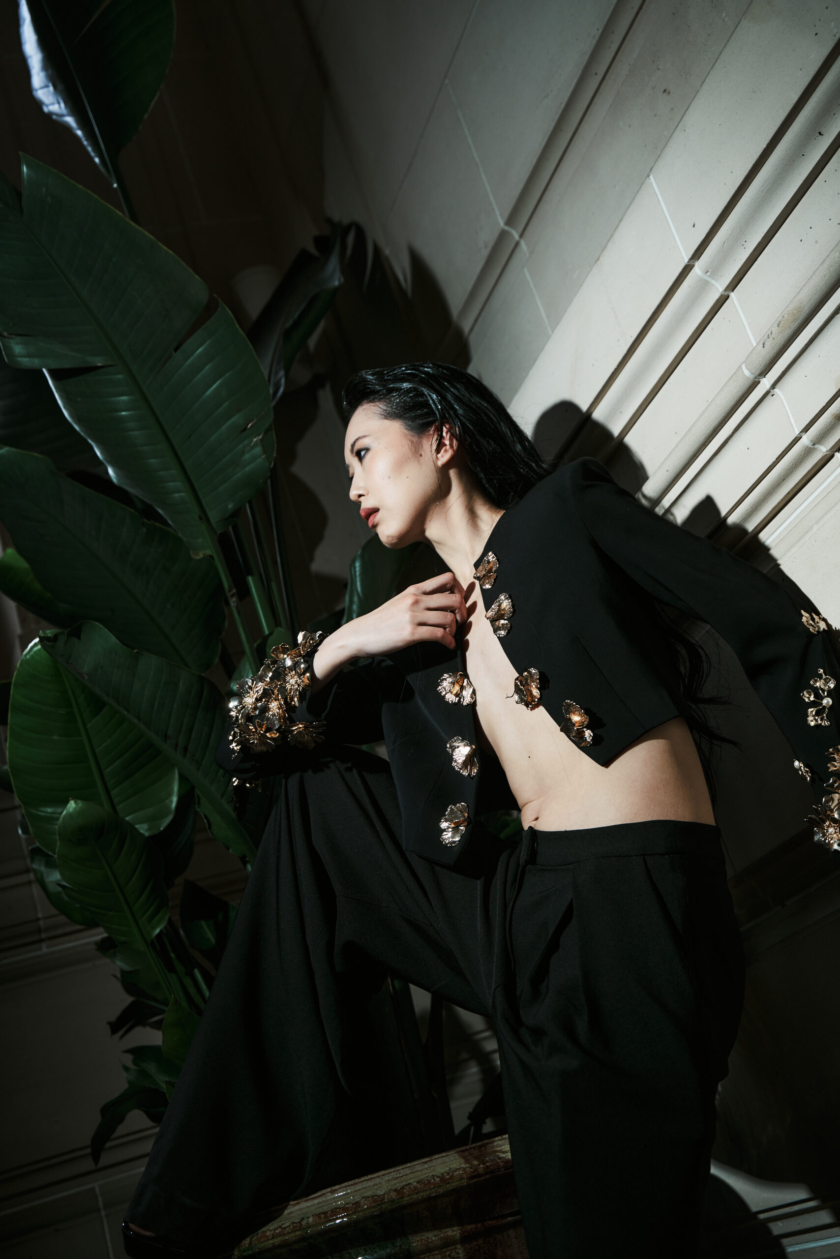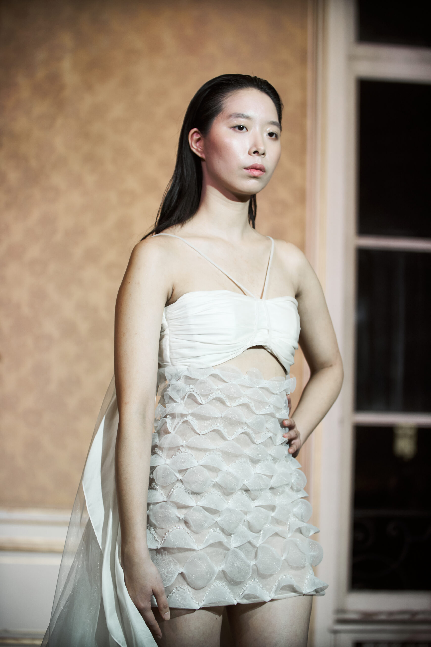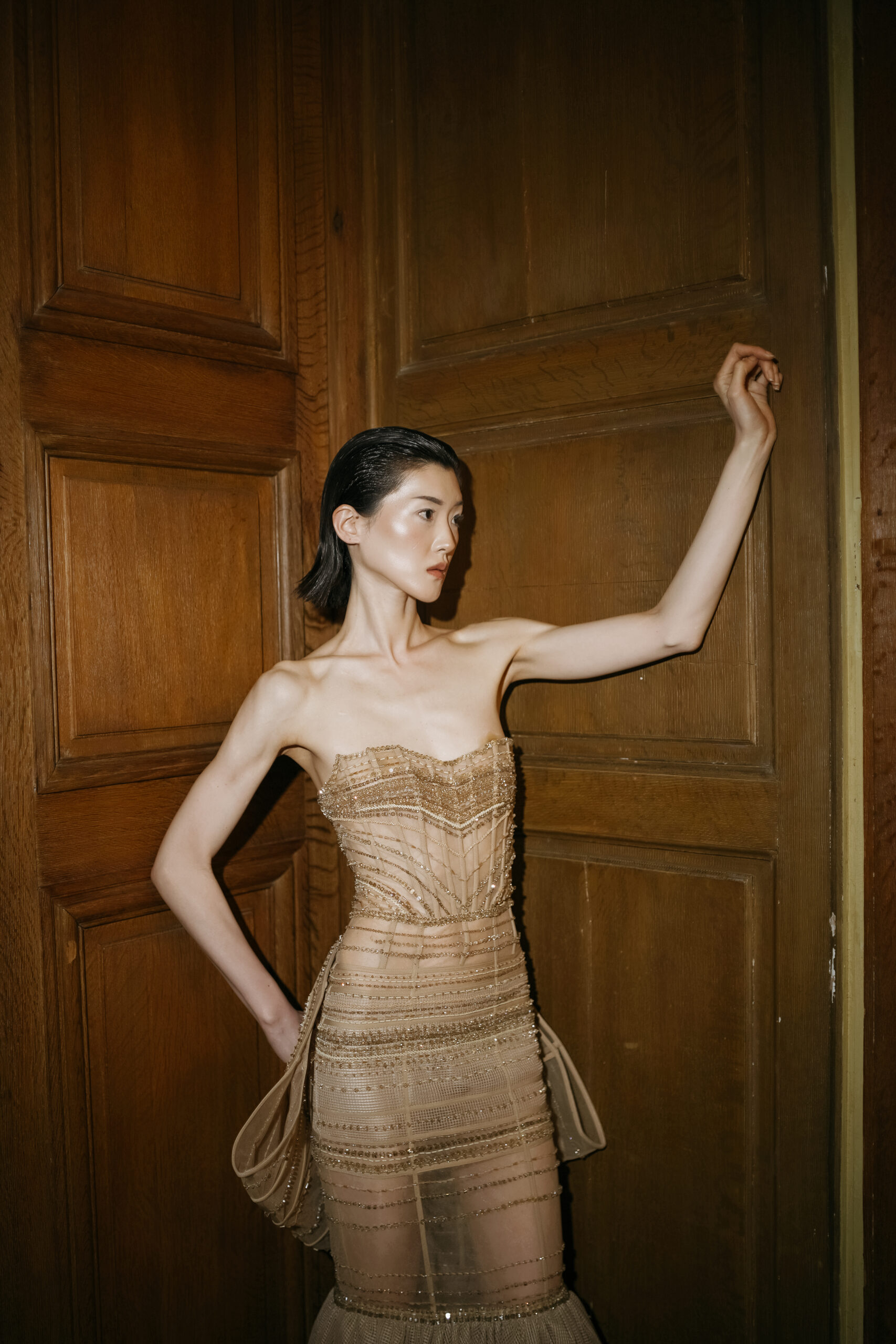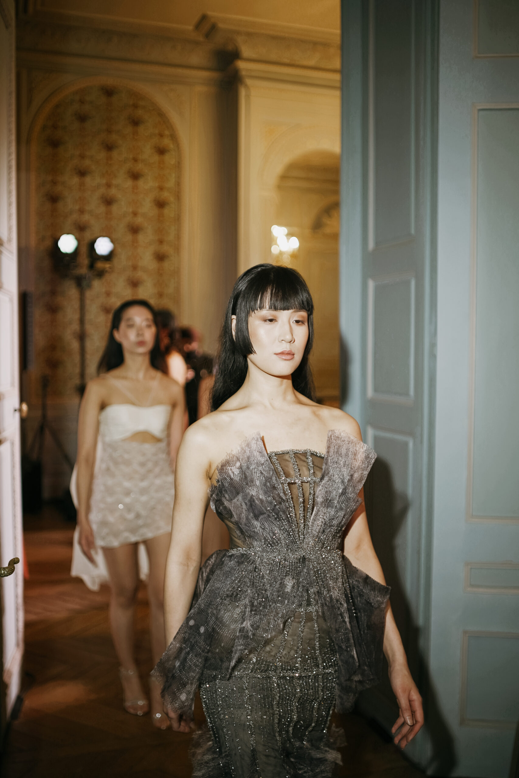 Phan Huy, avec sa collection « Lost in Cavern », inspirée des grottes majestueuses de la province de Quang Binh au Vietnam, a présenté des designs évoquant la splendeur naturelle des cavernes, grâce à des formes drapées, des détails en 3D saisissants et des embellissements de perles de cristal, rendant hommage aux paysages vietnamiens.