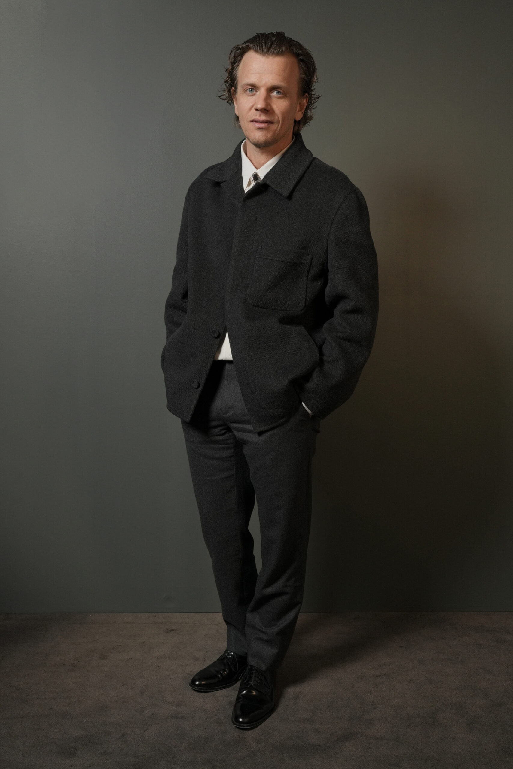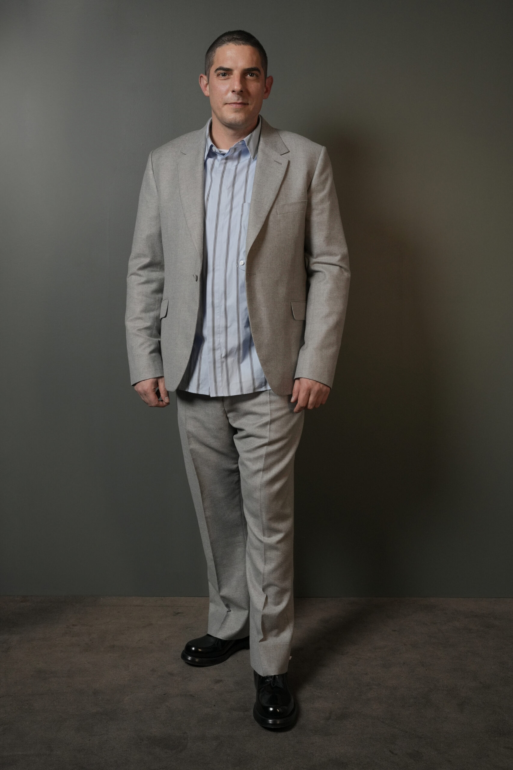 Damien Bonnard, dans un costume en laine gris clair, une chemise en coton bleu à rayures noires et des derbies Carlo en cuir noir de la collection Hiver 2024-2025, a su allier sobriété et sophistication.