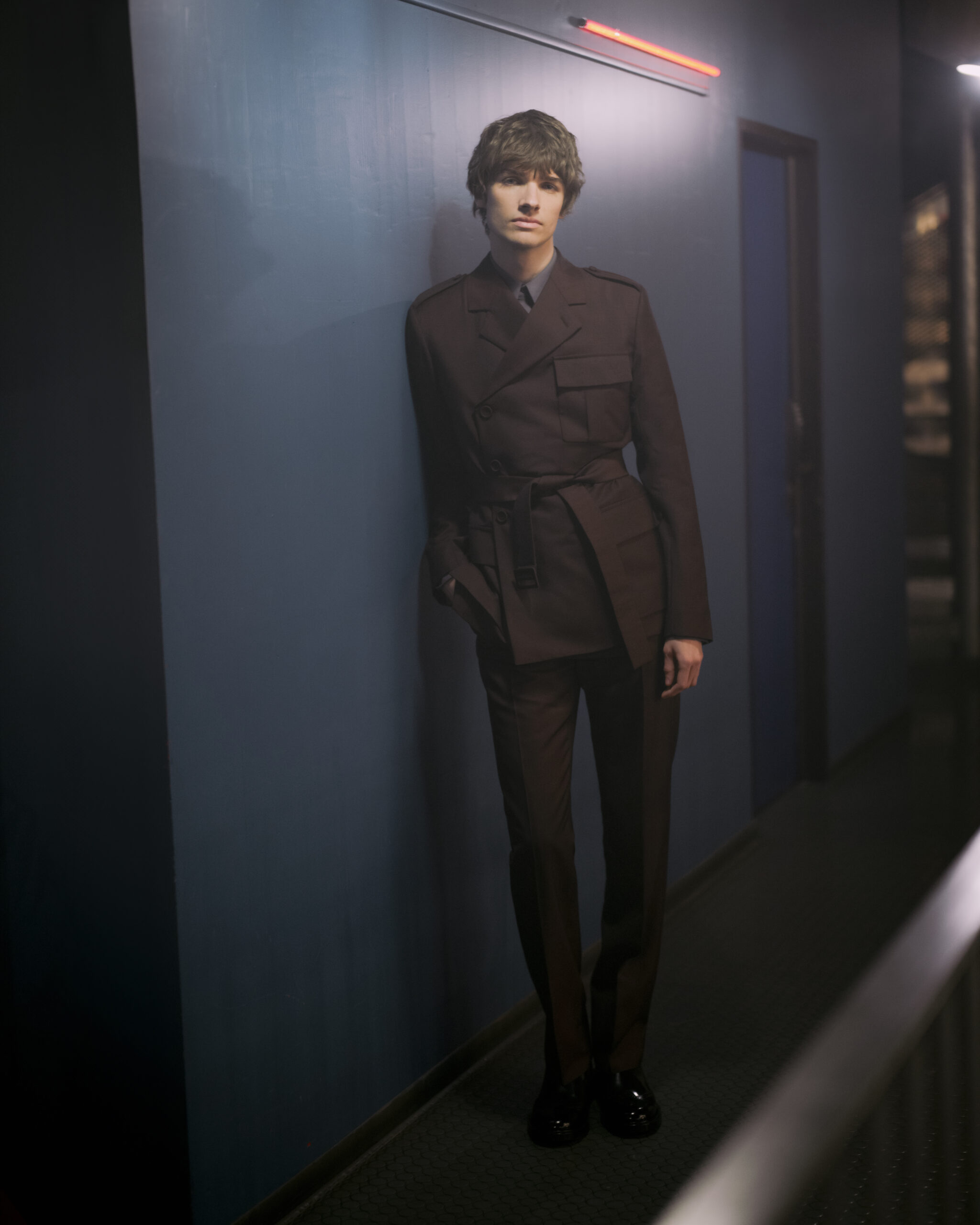 La première, une veste militaire sur mesure de couleur bourgogne avec des pantalons étroits assortis, complétée par une chemise classique en coton gris et une paire de bottes Chelsea en cuir noir, a su allier le caractère à la sophistication. Cette tenue réinterprète l’esthétique militaire avec une touche de modernité, soulignant le côté avant-gardiste de Pierre de Maere.