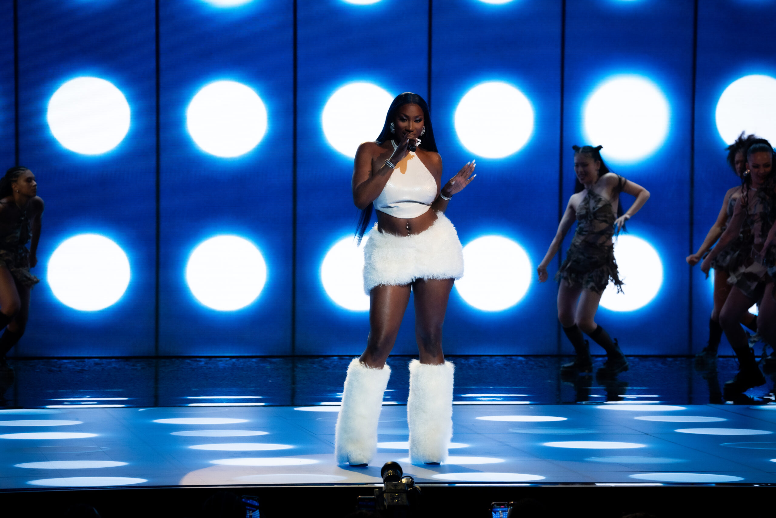 2. La Tenue de Performance en Agneau de Mongolie et Python Blanc : Pour sa performance, Aya Nakamura a opté pour une jupe dynamique en agneau de Mongolie vintage et un top en python blanc, complétés par des guêtres assorties, incarnant un style audacieux et unique.