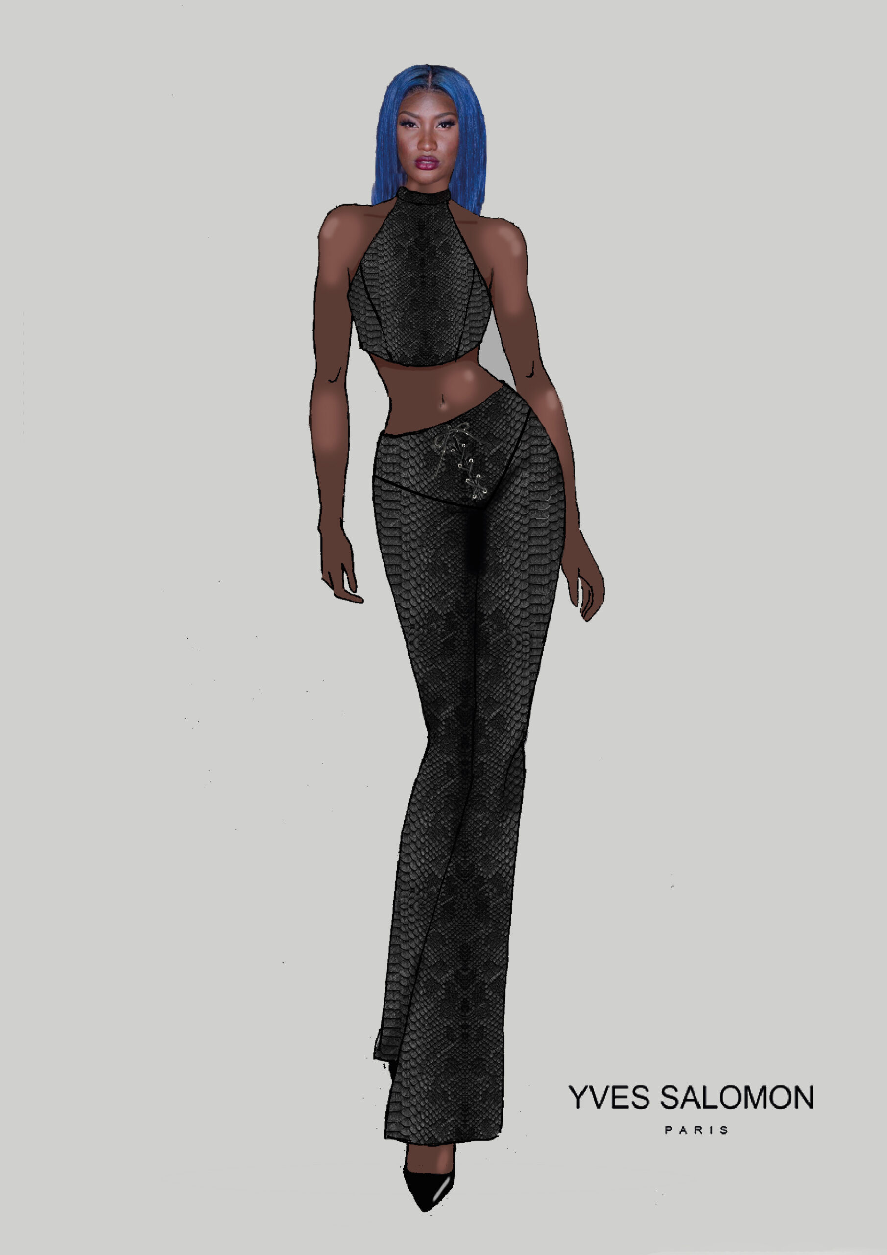 3. Le Ensemble Pantalon et Top en Python Noir : Le dernier ensemble de la soirée, en python noir brillant, affichait des finitions vernies et un placement méticuleux des écailles, soulignant l’attention aux détails et la maîtrise technique des artisans de la Maison.