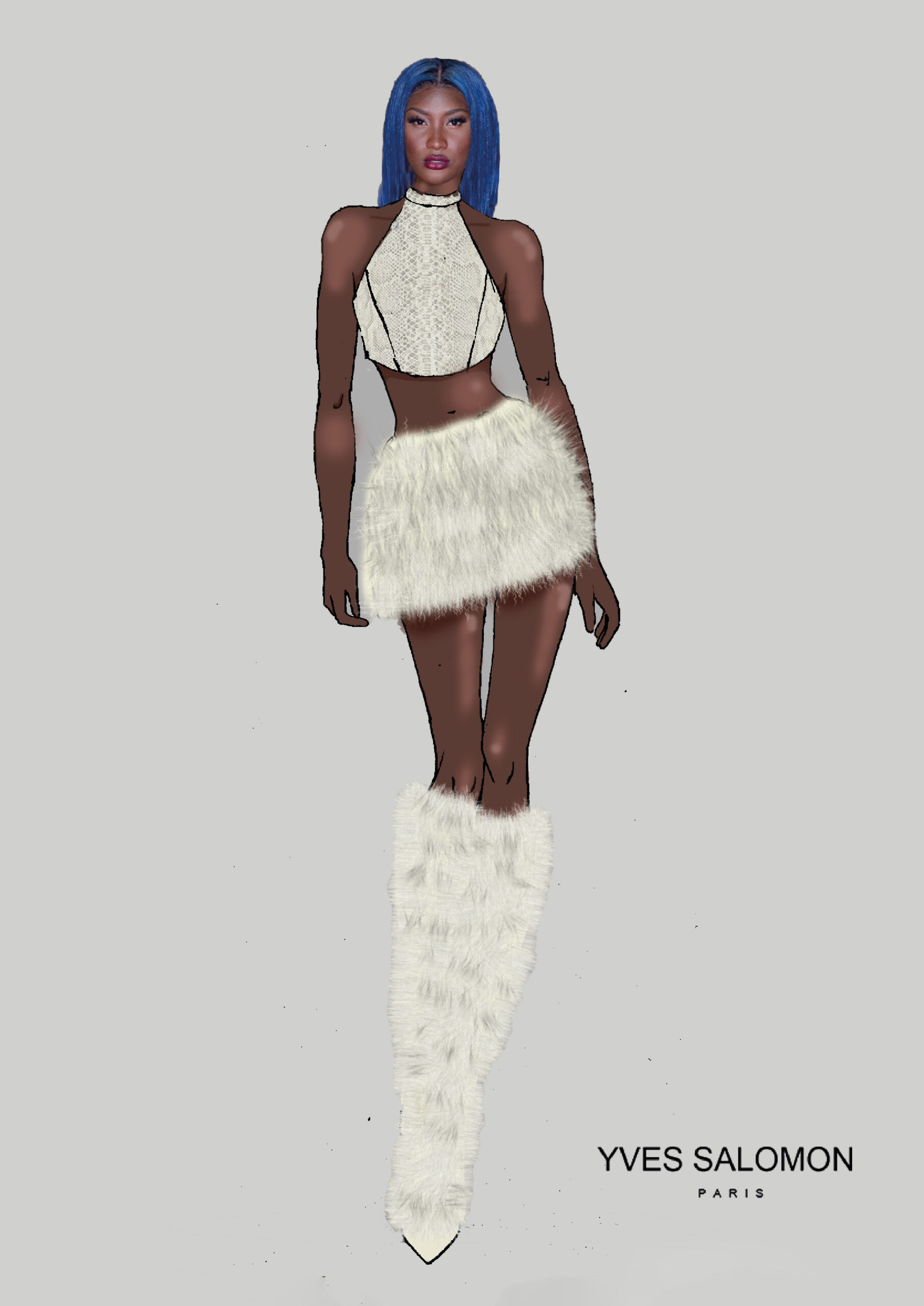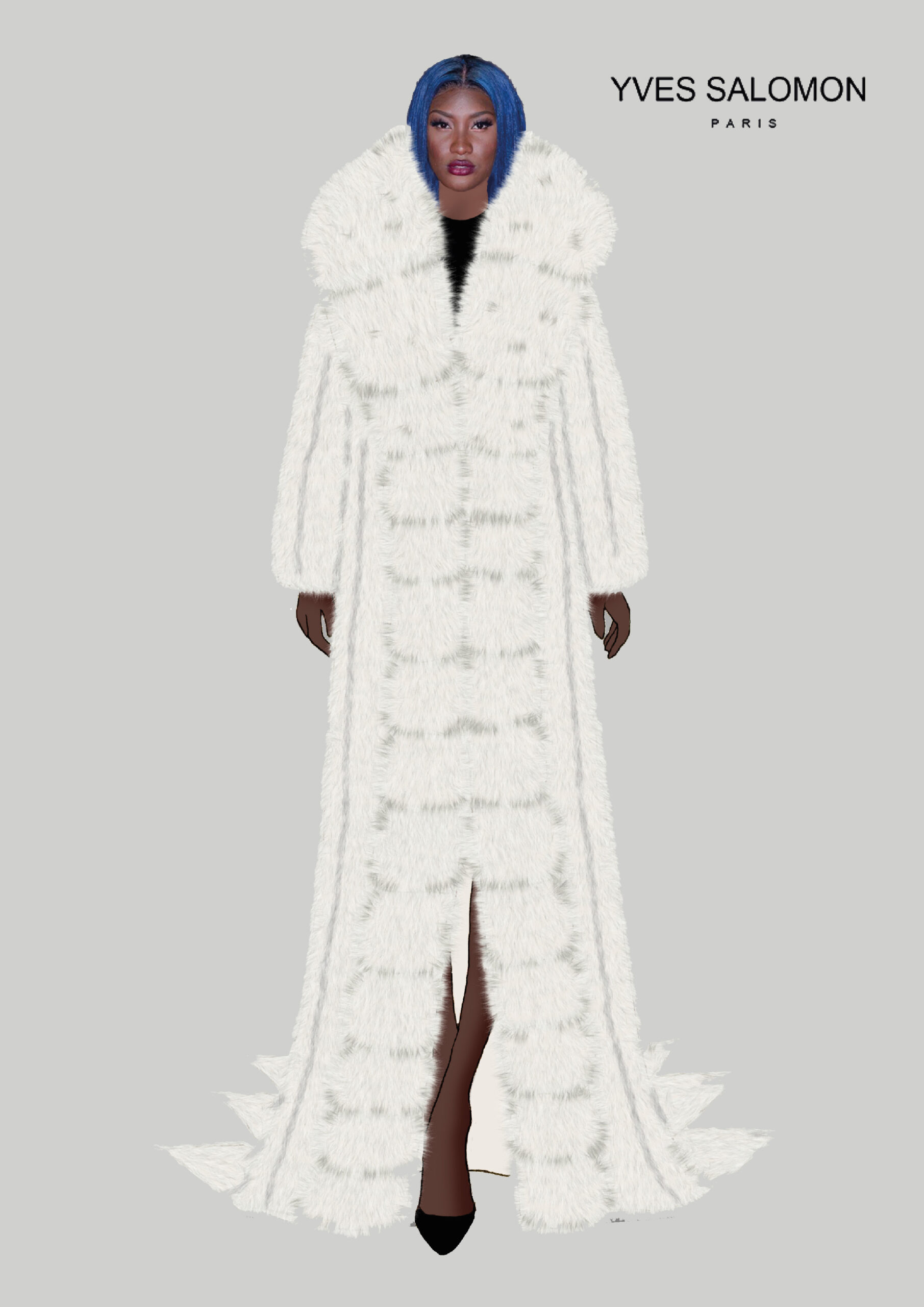 1. Le Long Manteau Blanc de Scène : Inspiré par le style iconique de Cruella des « 101 Dalmatiens », ce manteau long réalisé en chèvre velours met en avant le savoir-faire artisanal des ateliers de Yves Salomon. La pièce, d’une longueur impressionnante sans aucun raccord, démontre l’expertise en couture de la Maison, avec une réalisation entièrement à la main.