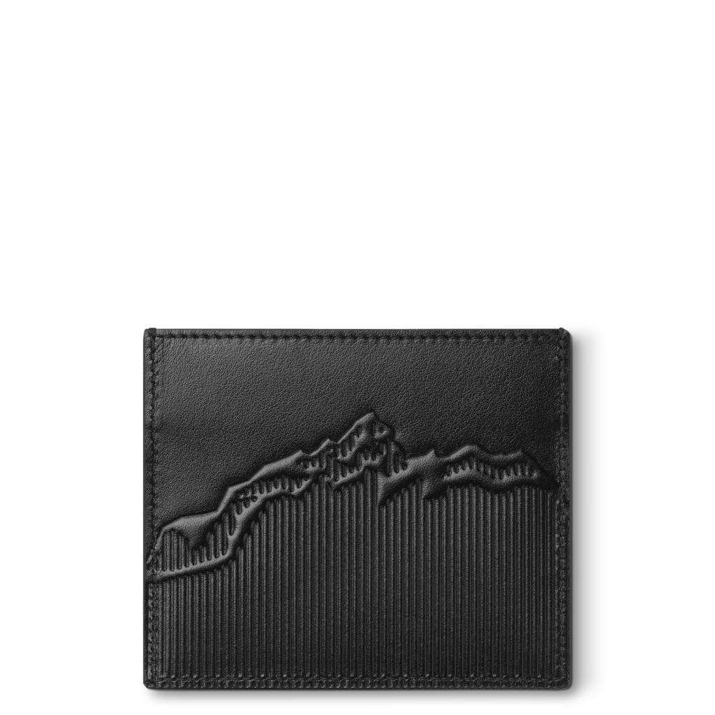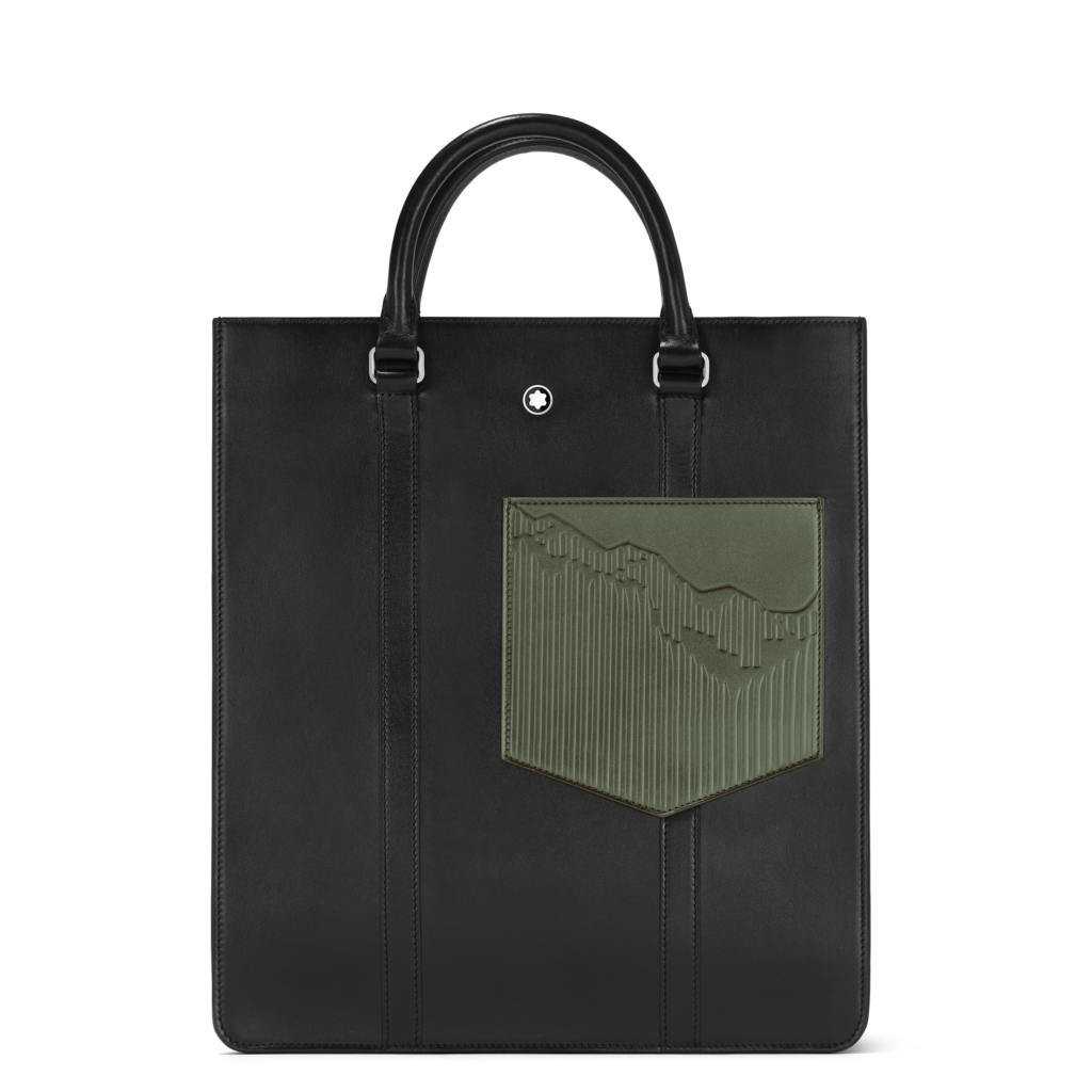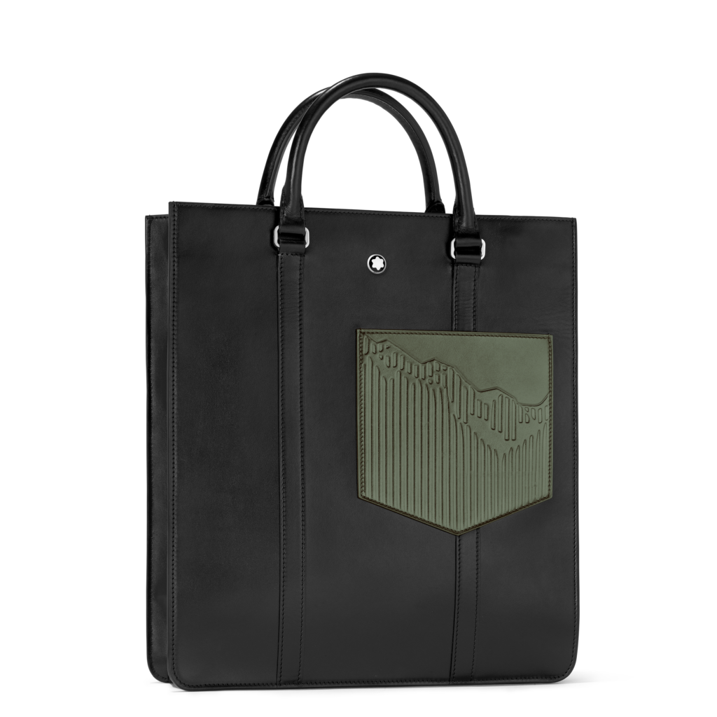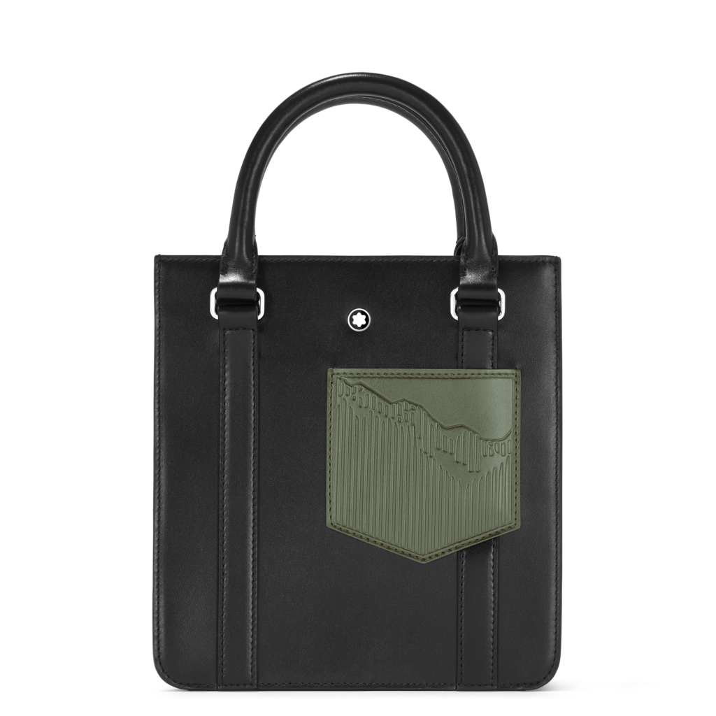La première capsule met en avant une palette sophistiquée de noir, ornée de la silhouette emblématique du Mont Blanc, un motif historique de la marque. Cette collection inclut des sacs de différents formats ainsi que des articles de petite maroquinerie tels qu’un portefeuille et un porte-cartes, tous réalisés en cuir noir brillant qui rappelle la résine précieuse du Meisterstück.