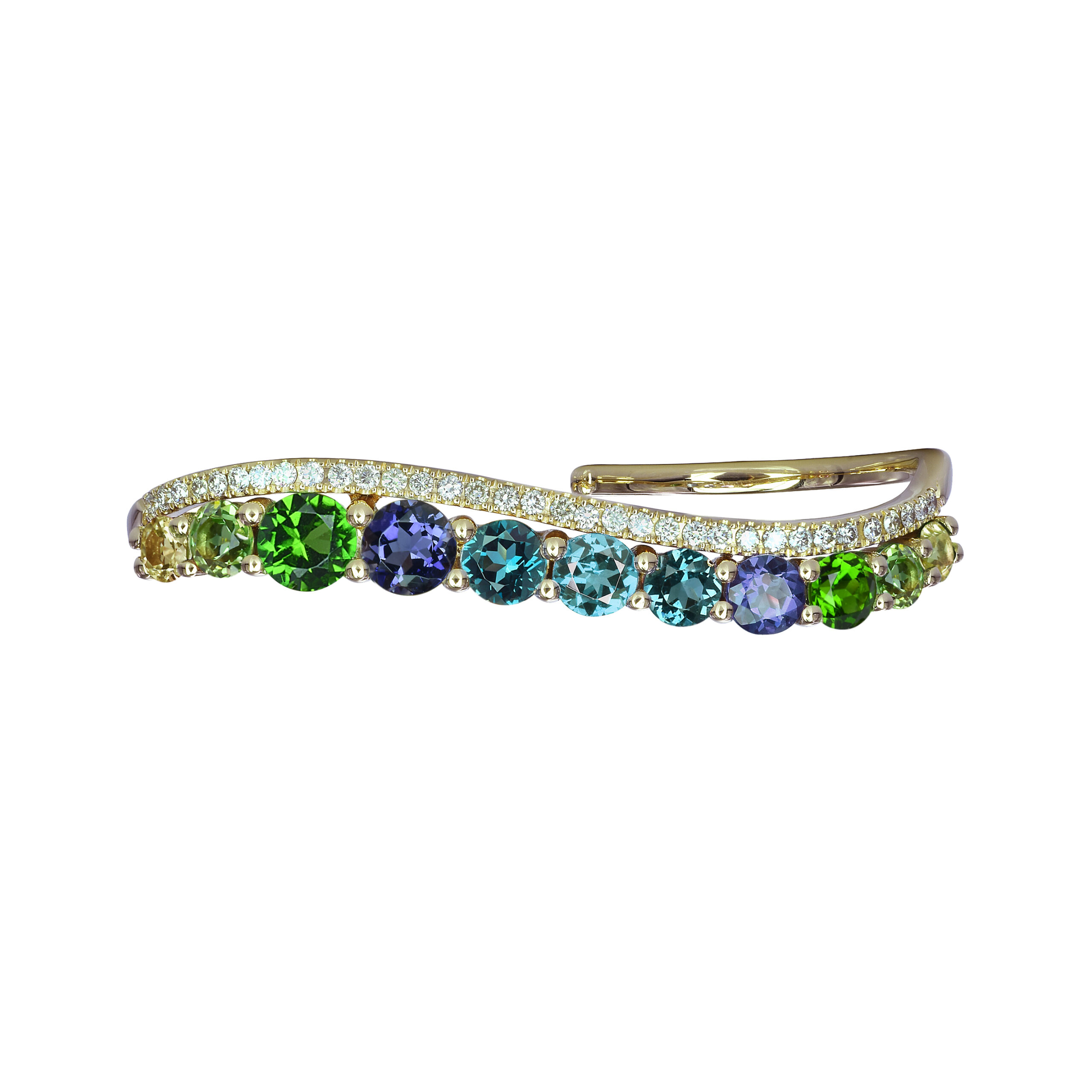 • En or jaune 750/1000e avec topaze bleue, topaze bleue London, iolite, diopside, tsavorite, saphir jaune et diamants, au prix de 4 200 €.