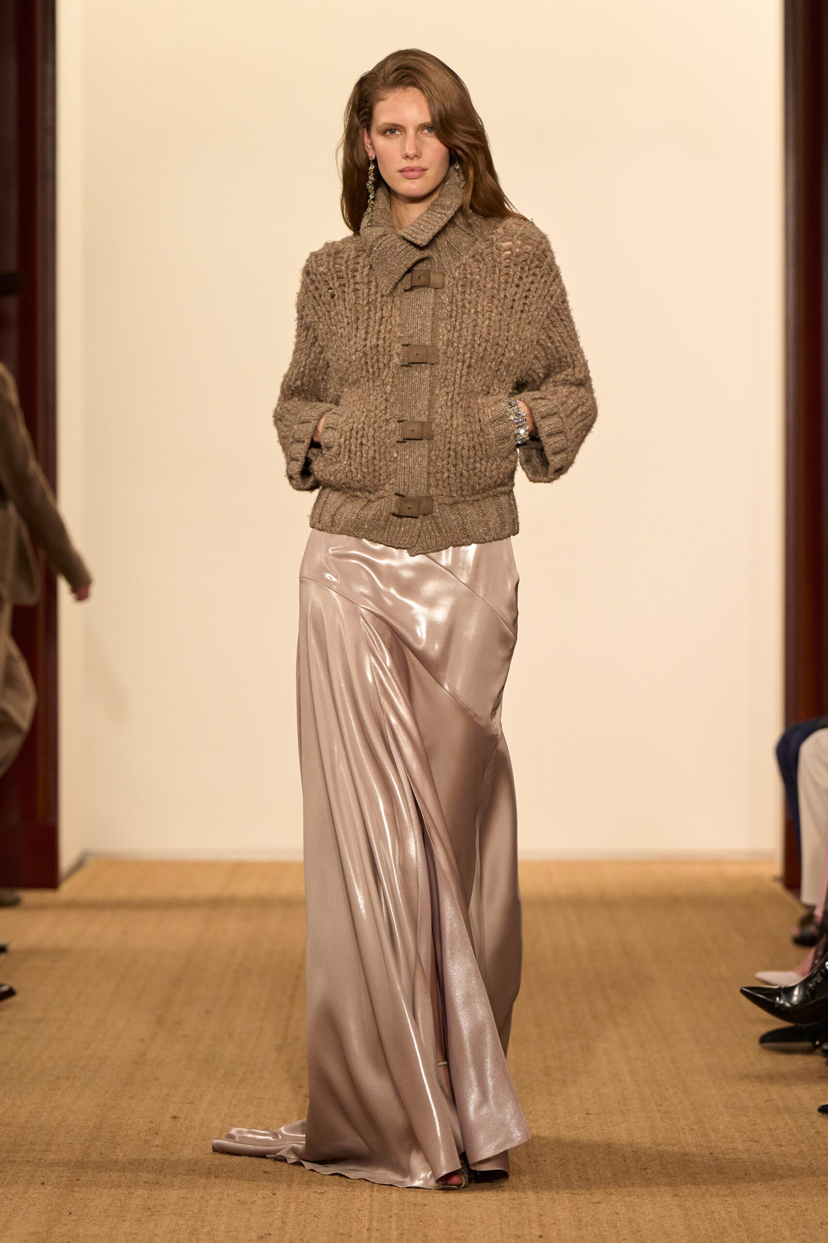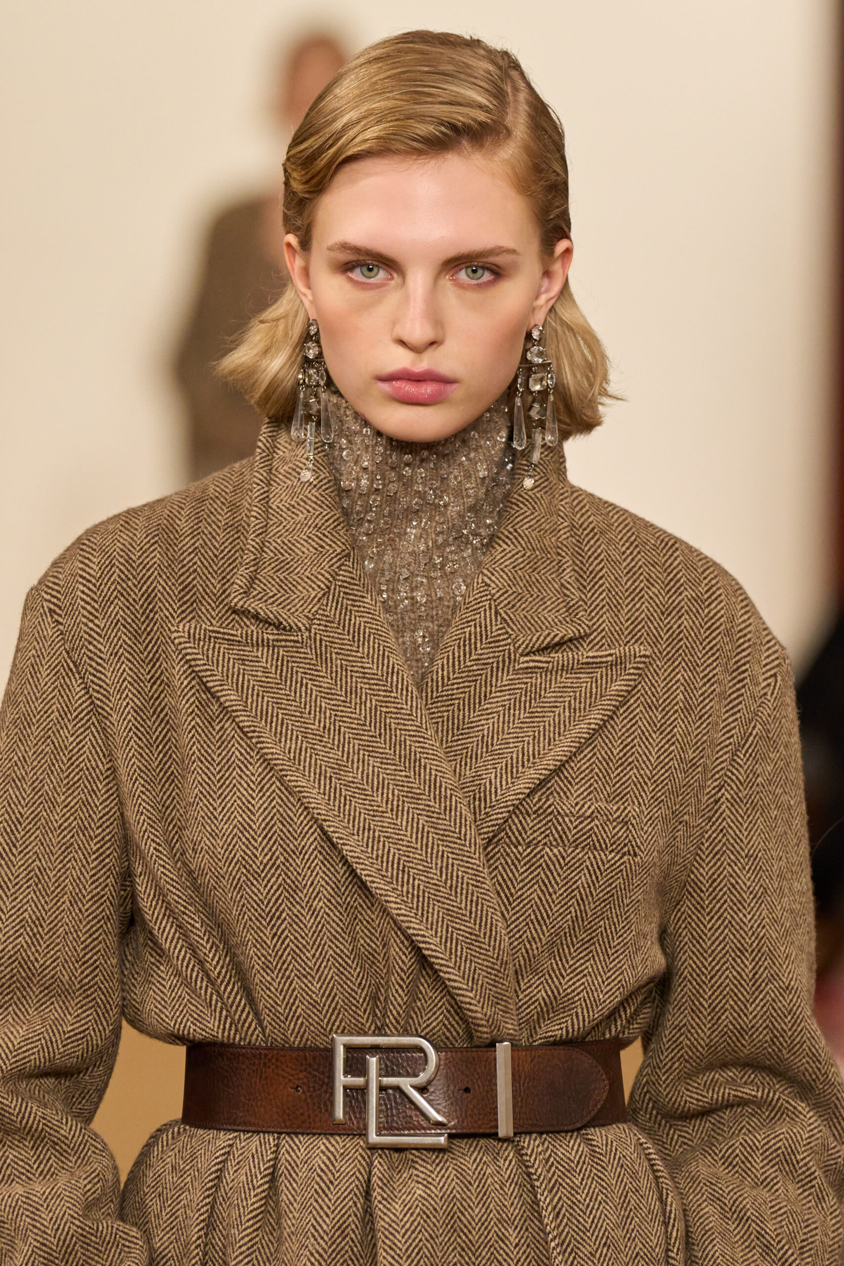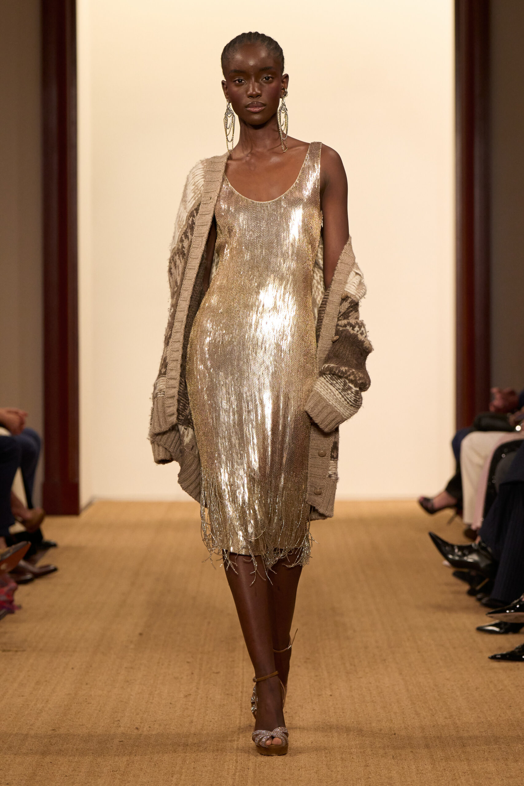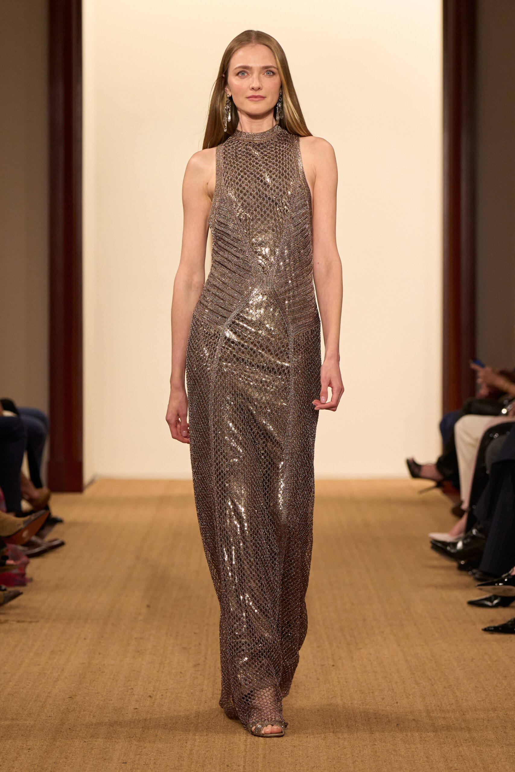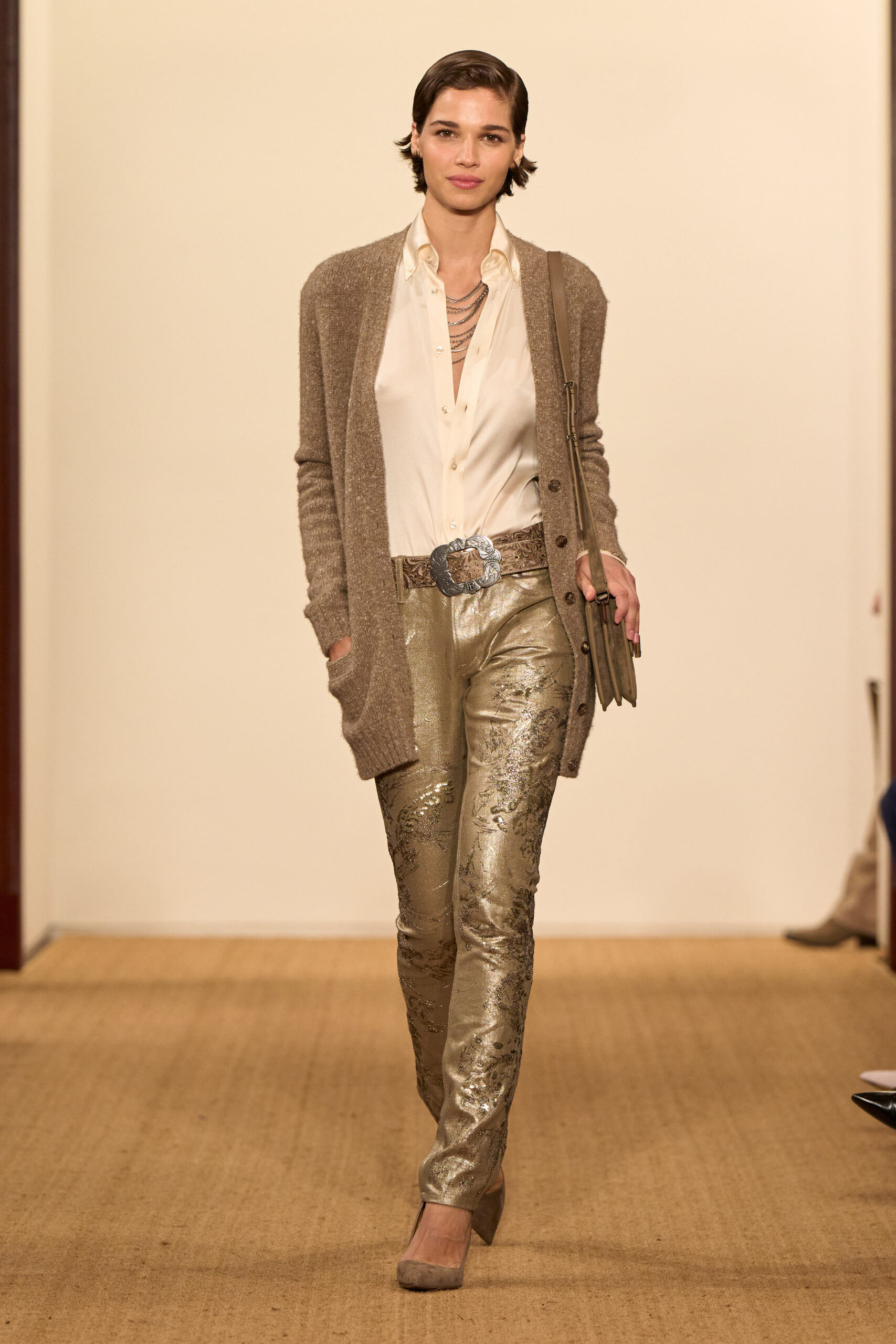 La collection fait la part belle aux nuances neutres et métalliques, qui soulignent le luxe discret et l’élégance intemporelle caractéristiques de la marque. Les pièces maîtresses incluent des vestes de tailleur ajustées, des tricots drapés, ainsi que des éléments en daim et cuir, et des robes coupées en biais. Ralph Lauren marie minimalisme et artistry en agrémentant ses pièces préférées de perles et de tweeds, de patchworks et d’ornements.