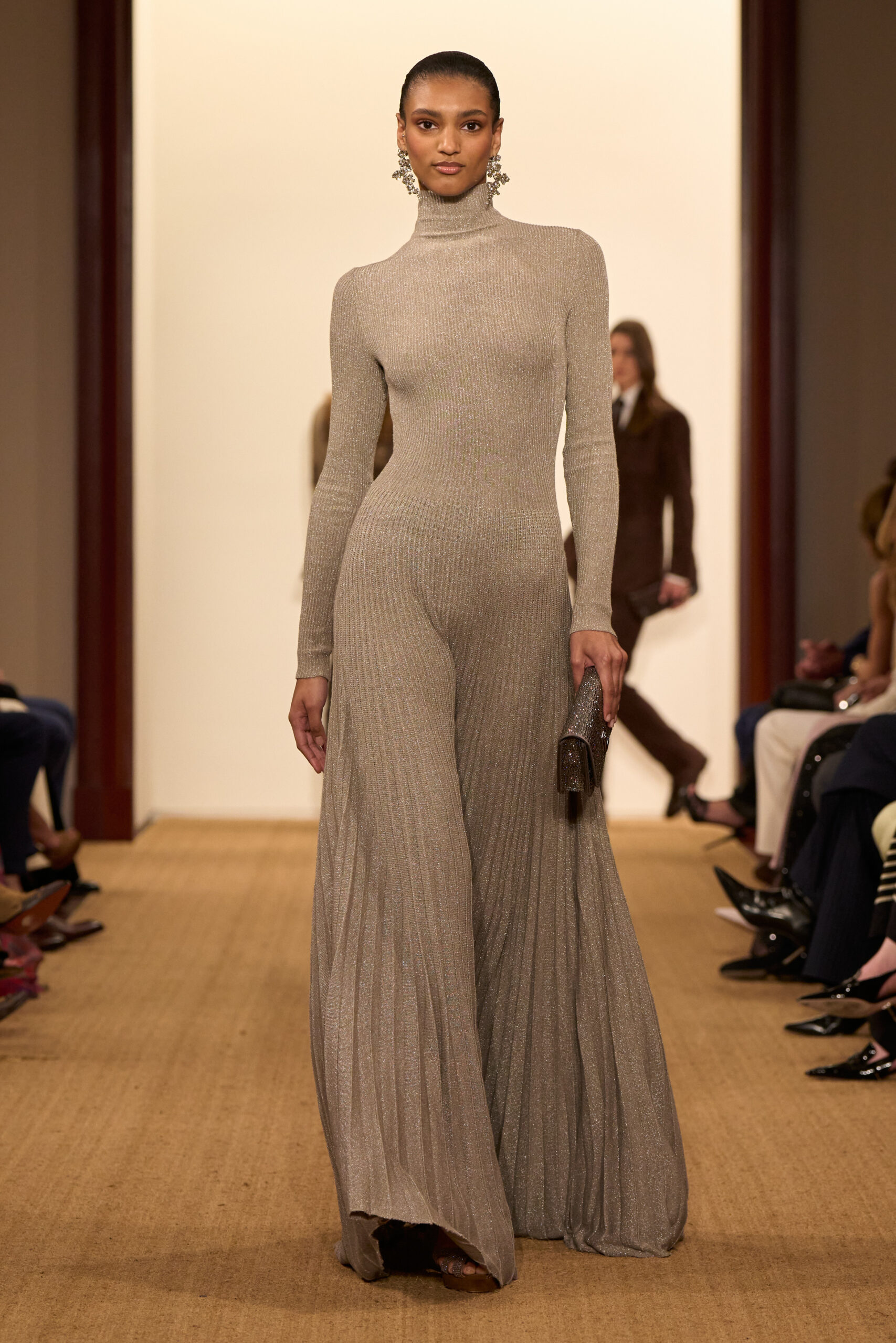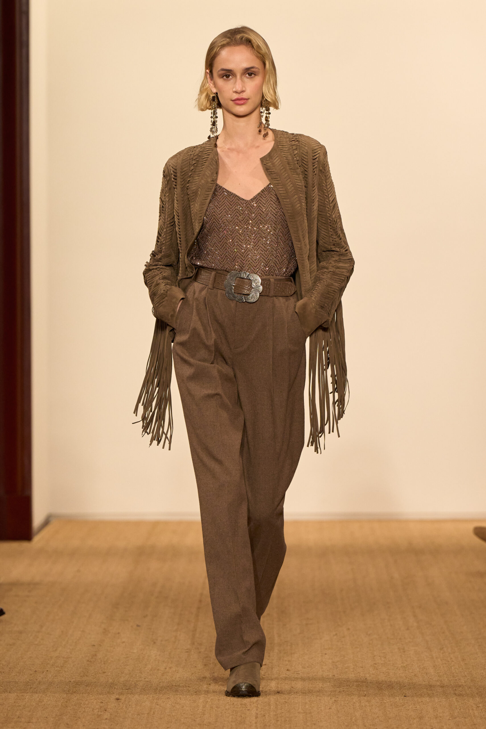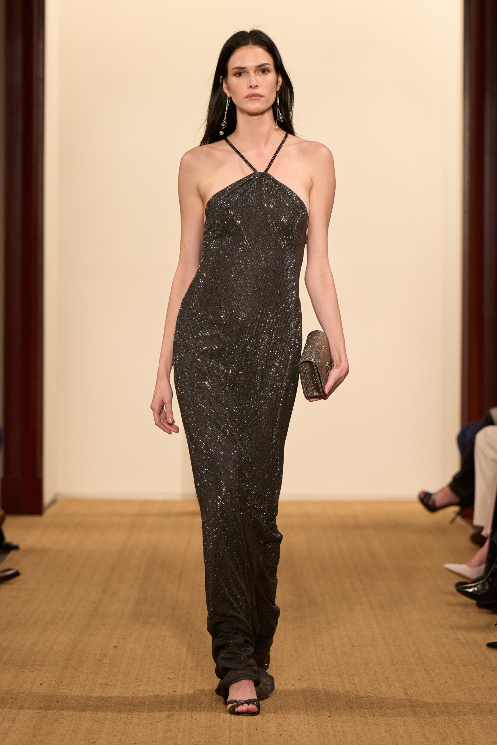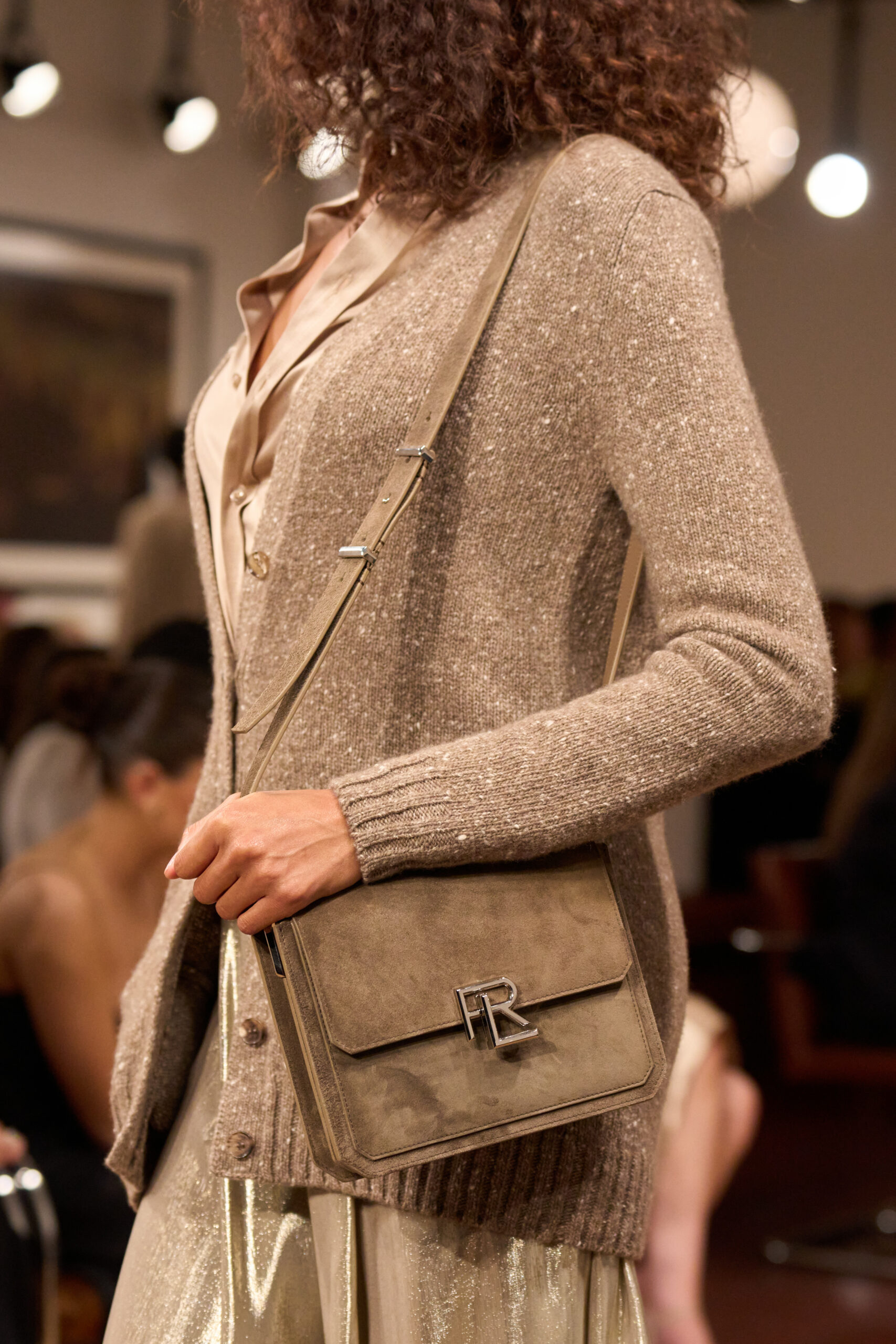 La collection fait la part belle aux nuances neutres et métalliques, qui soulignent le luxe discret et l’élégance intemporelle caractéristiques de la marque. Les pièces maîtresses incluent des vestes de tailleur ajustées, des tricots drapés, ainsi que des éléments en daim et cuir, et des robes coupées en biais. Ralph Lauren marie minimalisme et artistry en agrémentant ses pièces préférées de perles et de tweeds, de patchworks et d’ornements.