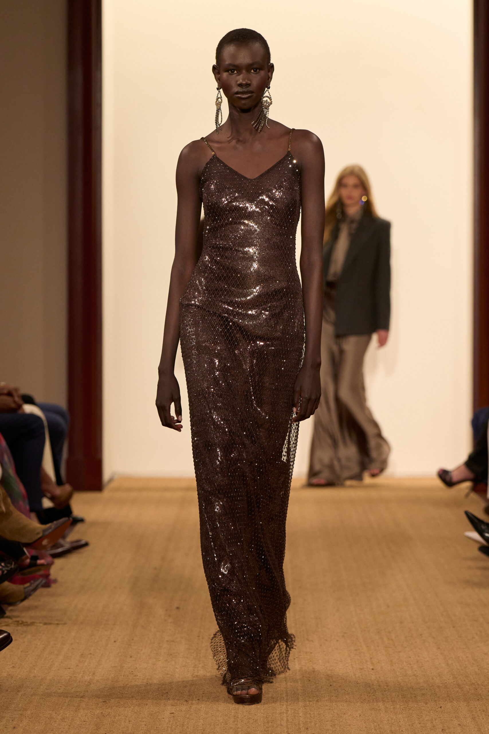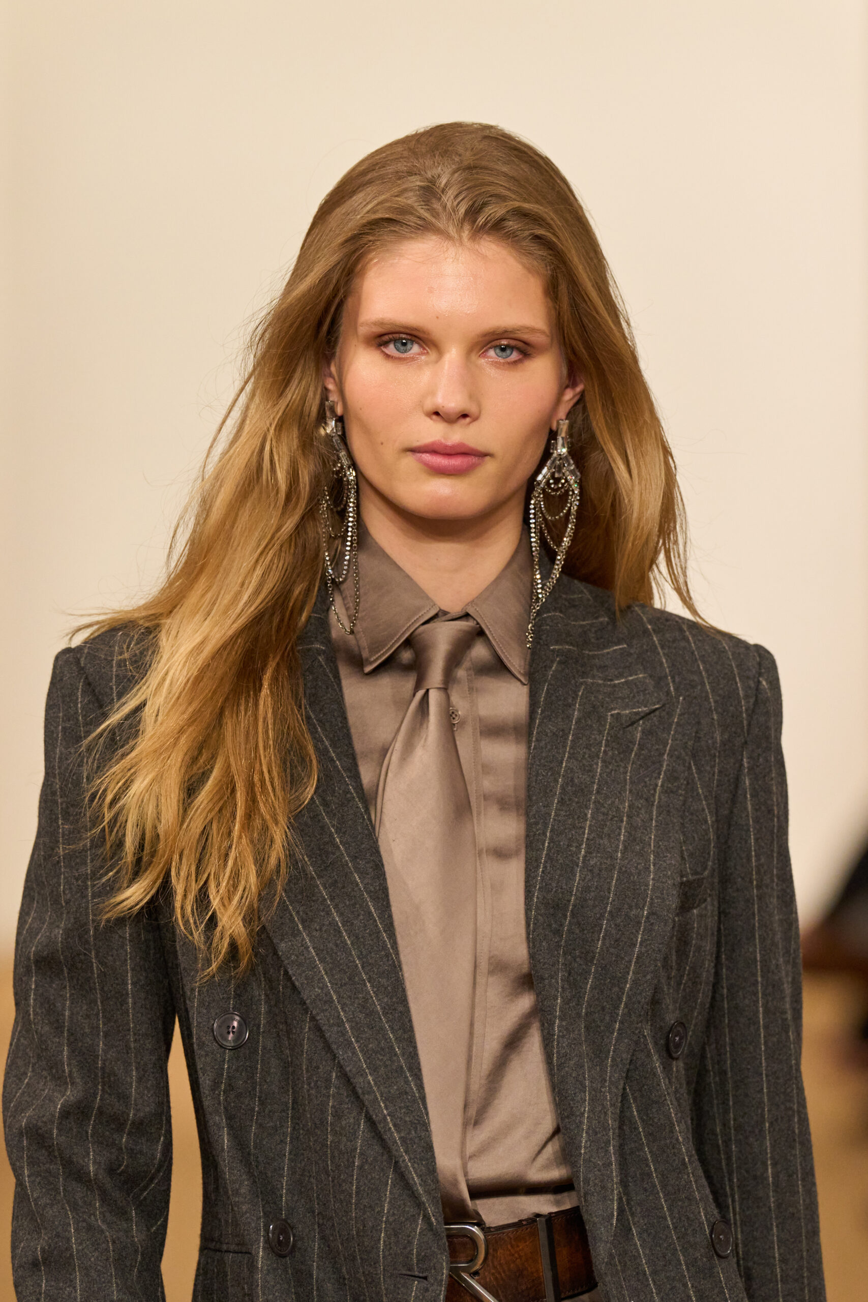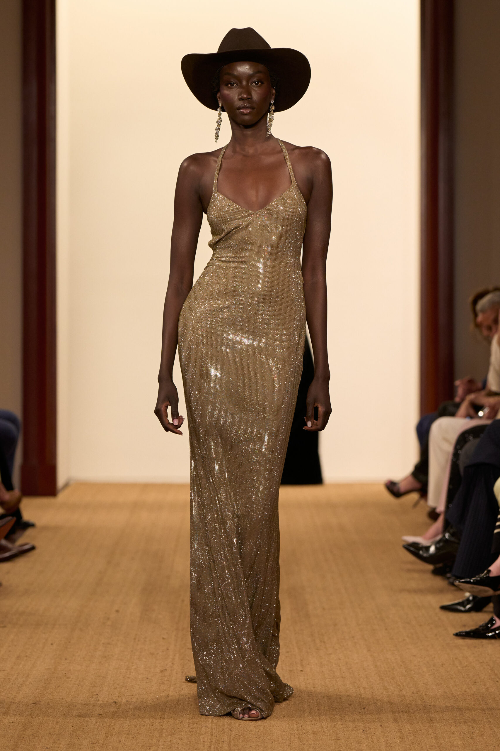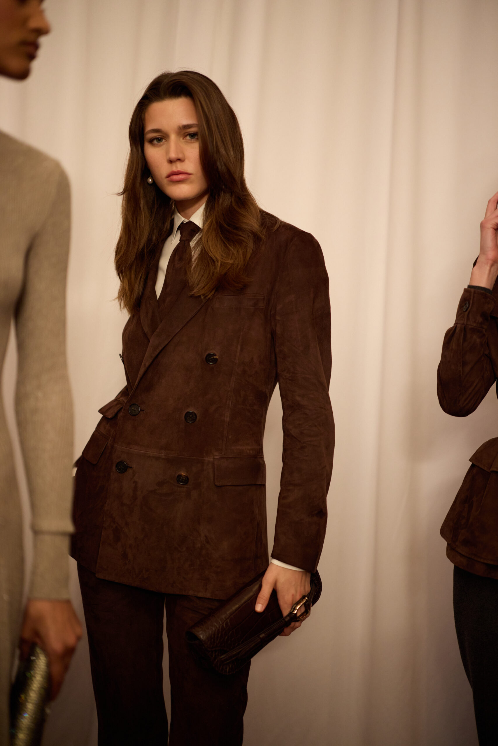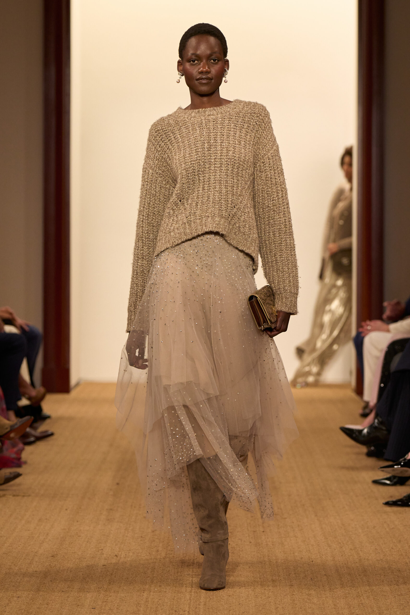 La collection fait la part belle aux nuances neutres et métalliques, qui soulignent le luxe discret et l’élégance intemporelle caractéristiques de la marque. Les pièces maîtresses incluent des vestes de tailleur ajustées, des tricots drapés, ainsi que des éléments en daim et cuir, et des robes coupées en biais. Ralph Lauren marie minimalisme et artistry en agrémentant ses pièces préférées de perles et de tweeds, de patchworks et d’ornements.