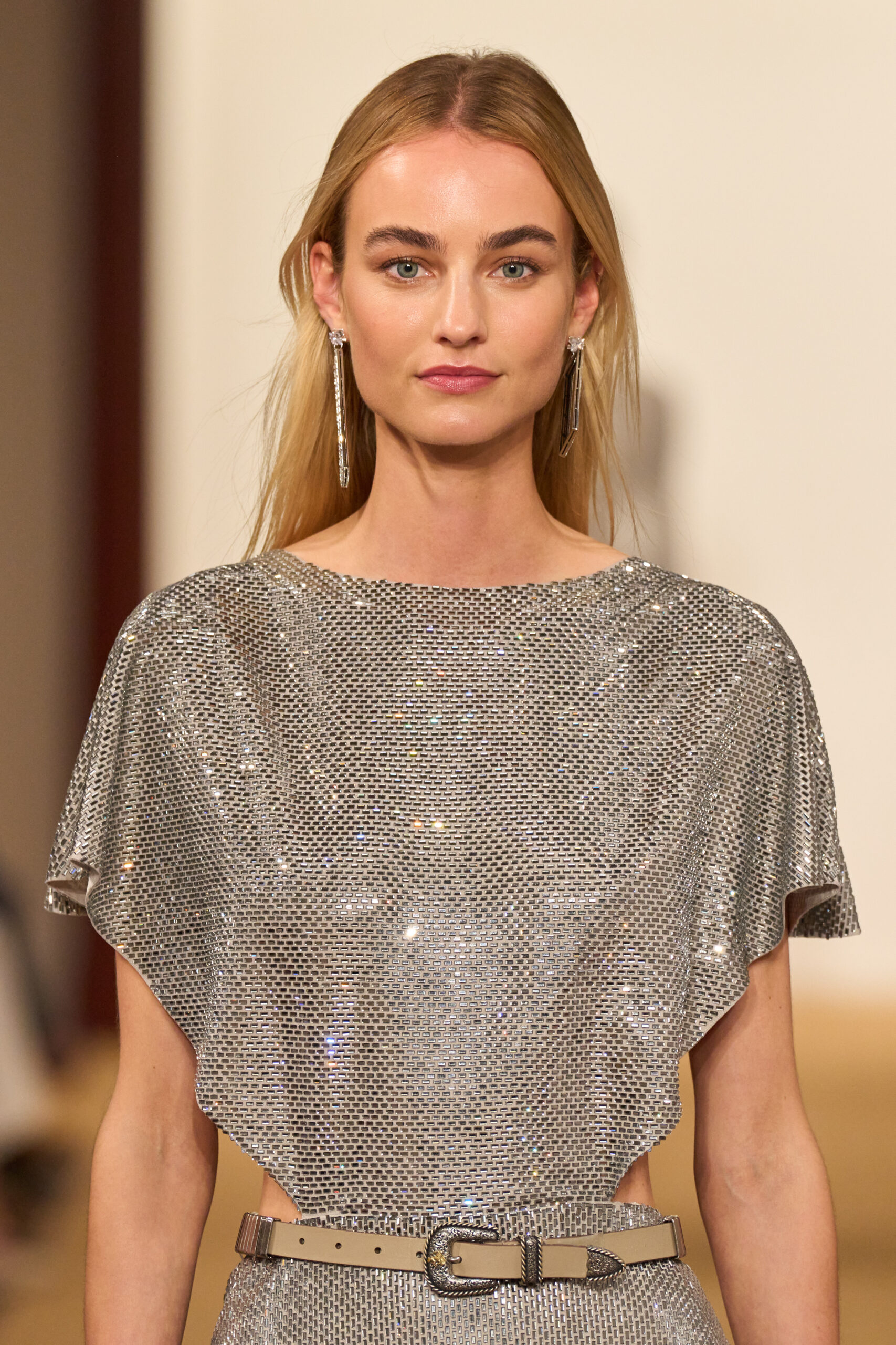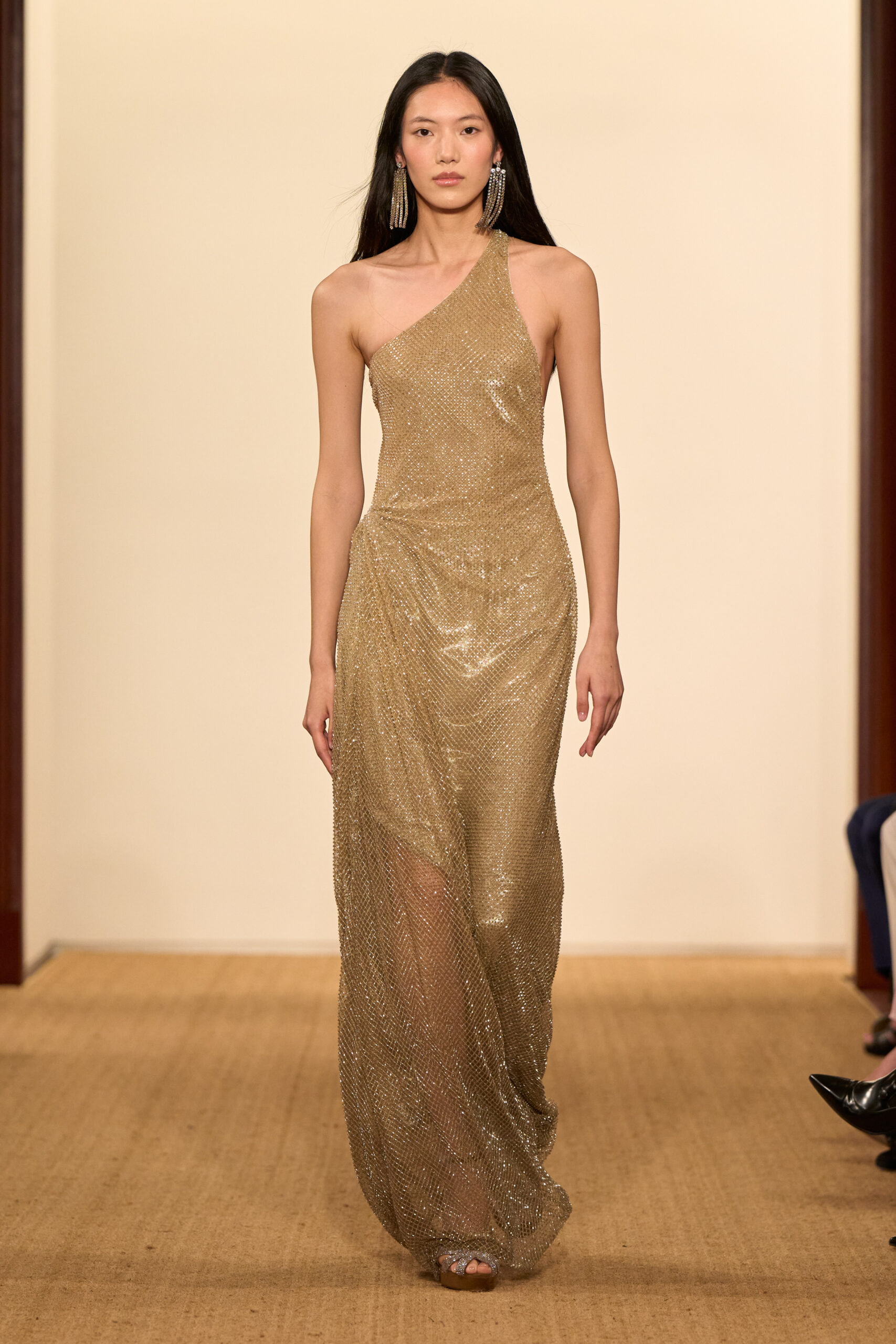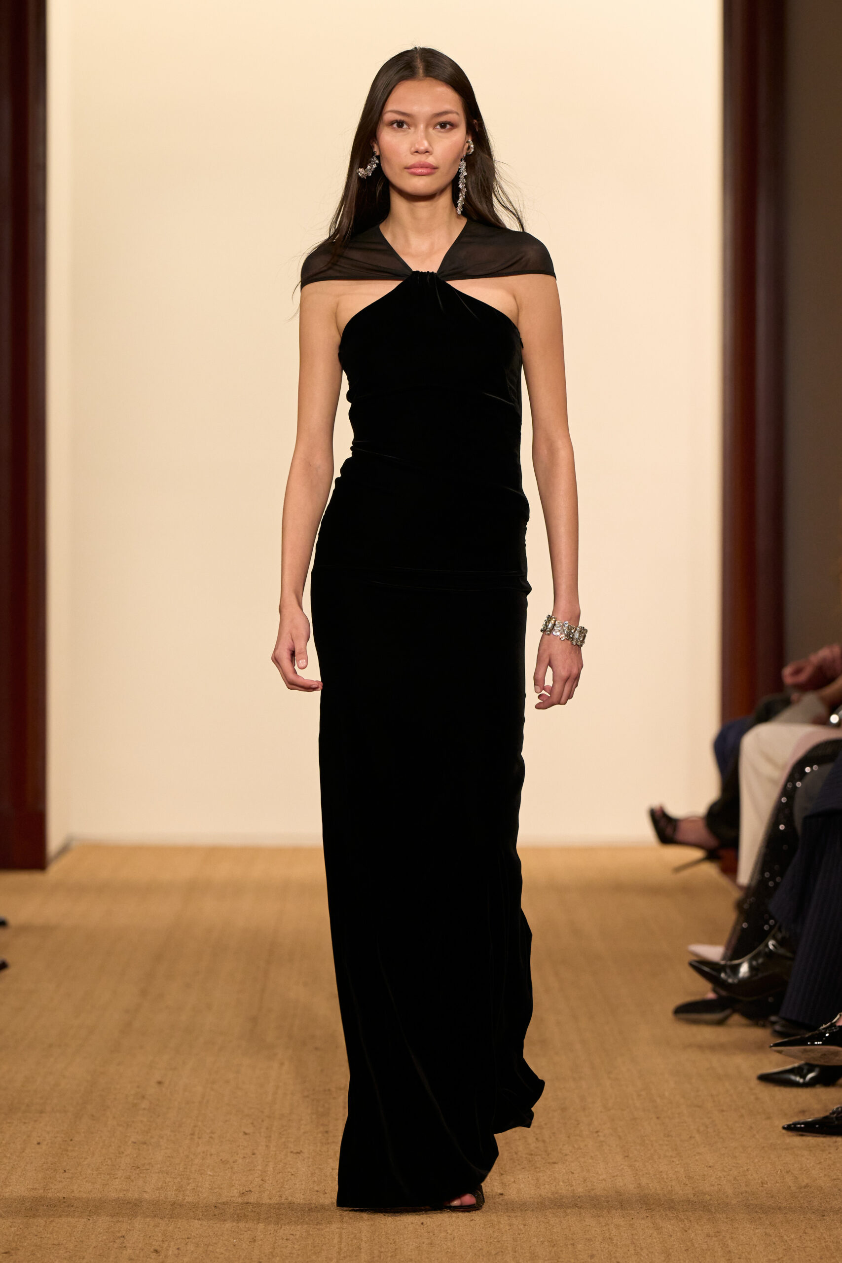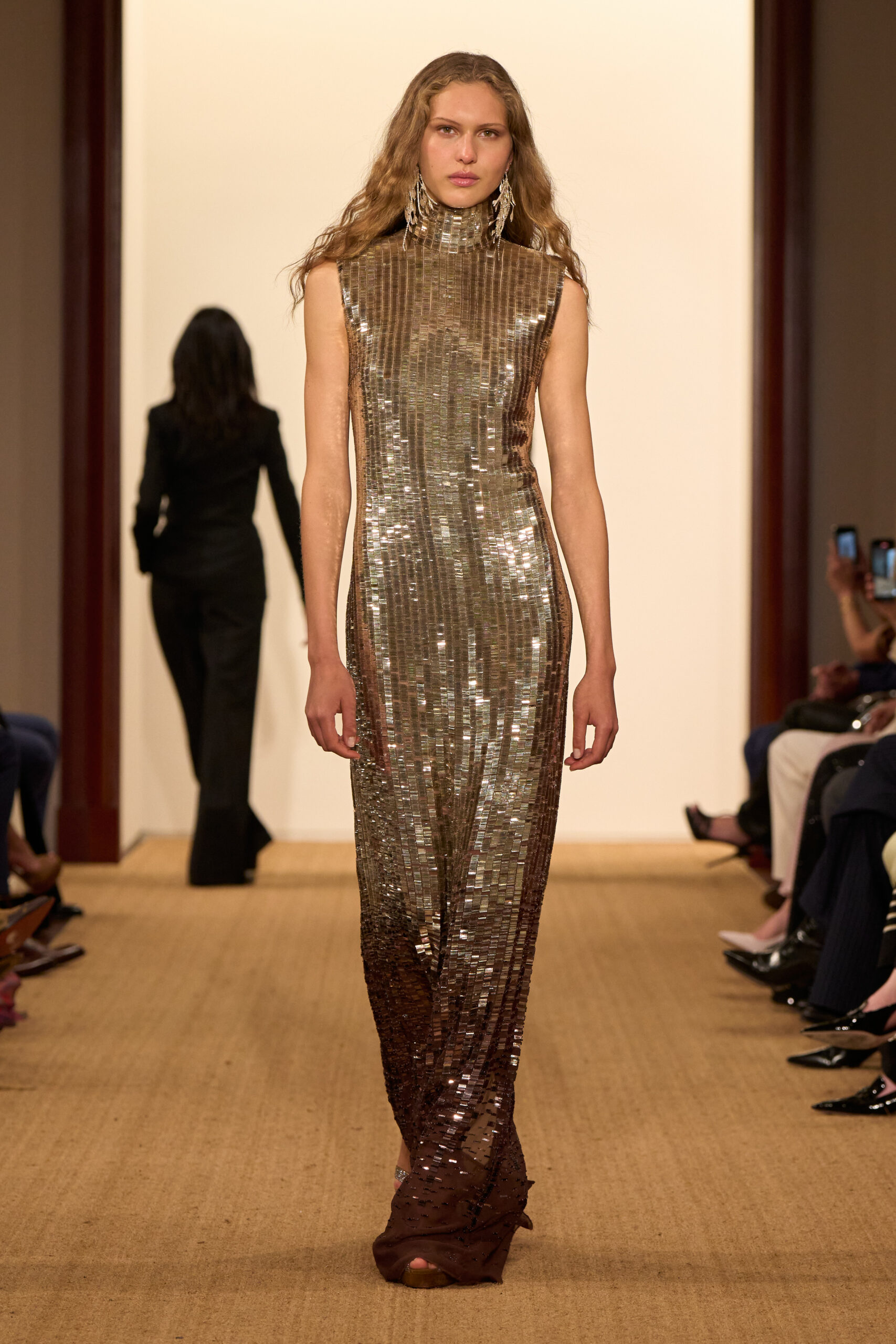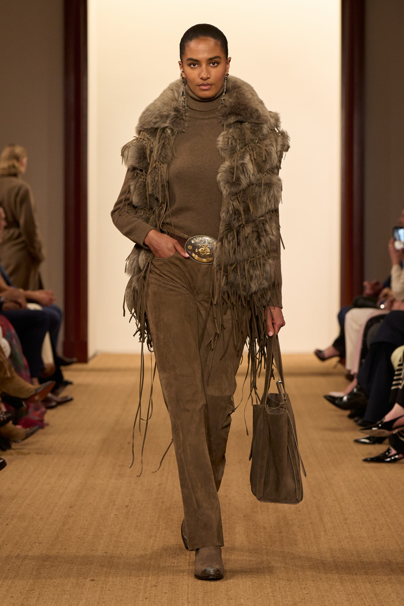 La collection fait la part belle aux nuances neutres et métalliques, qui soulignent le luxe discret et l’élégance intemporelle caractéristiques de la marque. Les pièces maîtresses incluent des vestes de tailleur ajustées, des tricots drapés, ainsi que des éléments en daim et cuir, et des robes coupées en biais. Ralph Lauren marie minimalisme et artistry en agrémentant ses pièces préférées de perles et de tweeds, de patchworks et d’ornements.