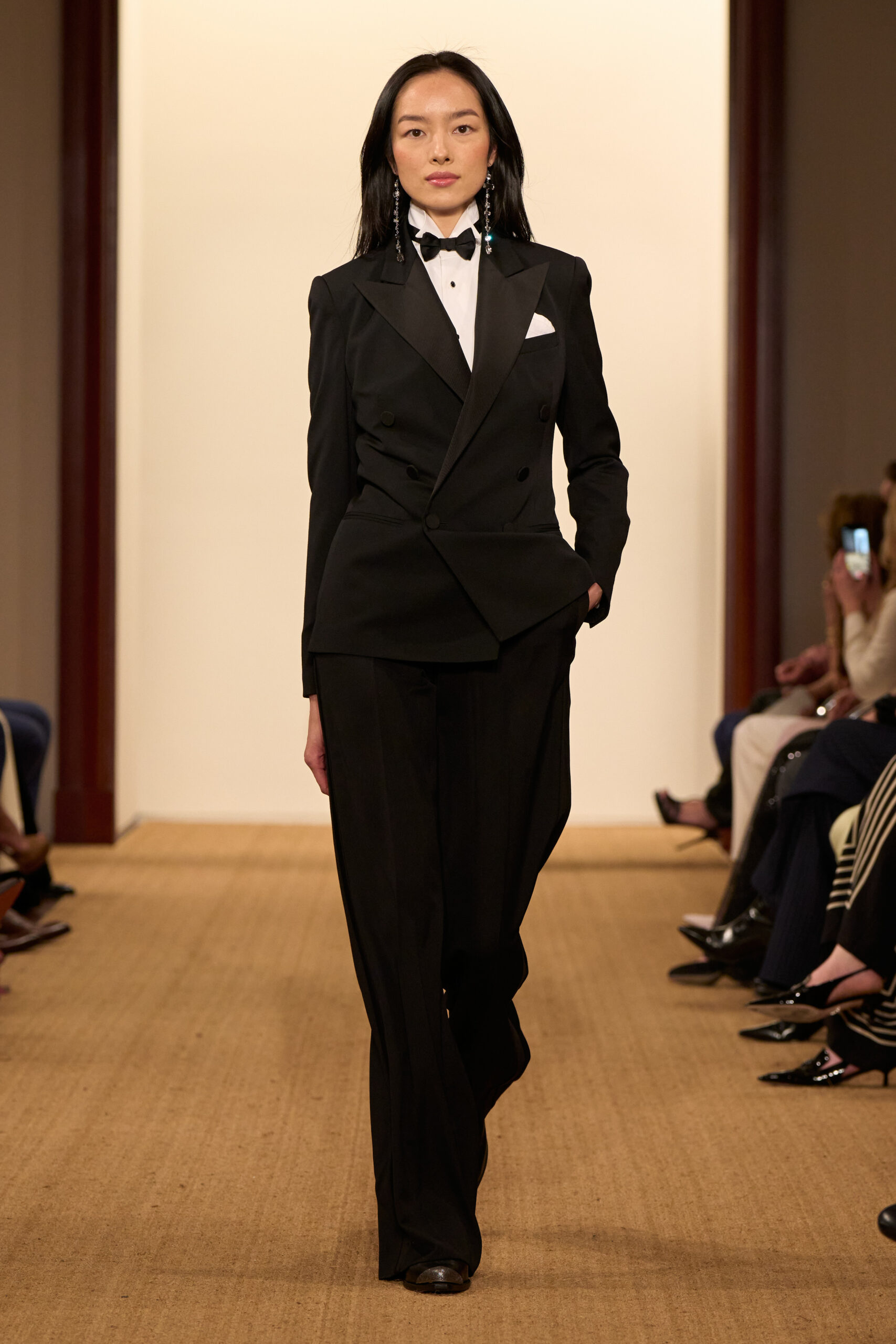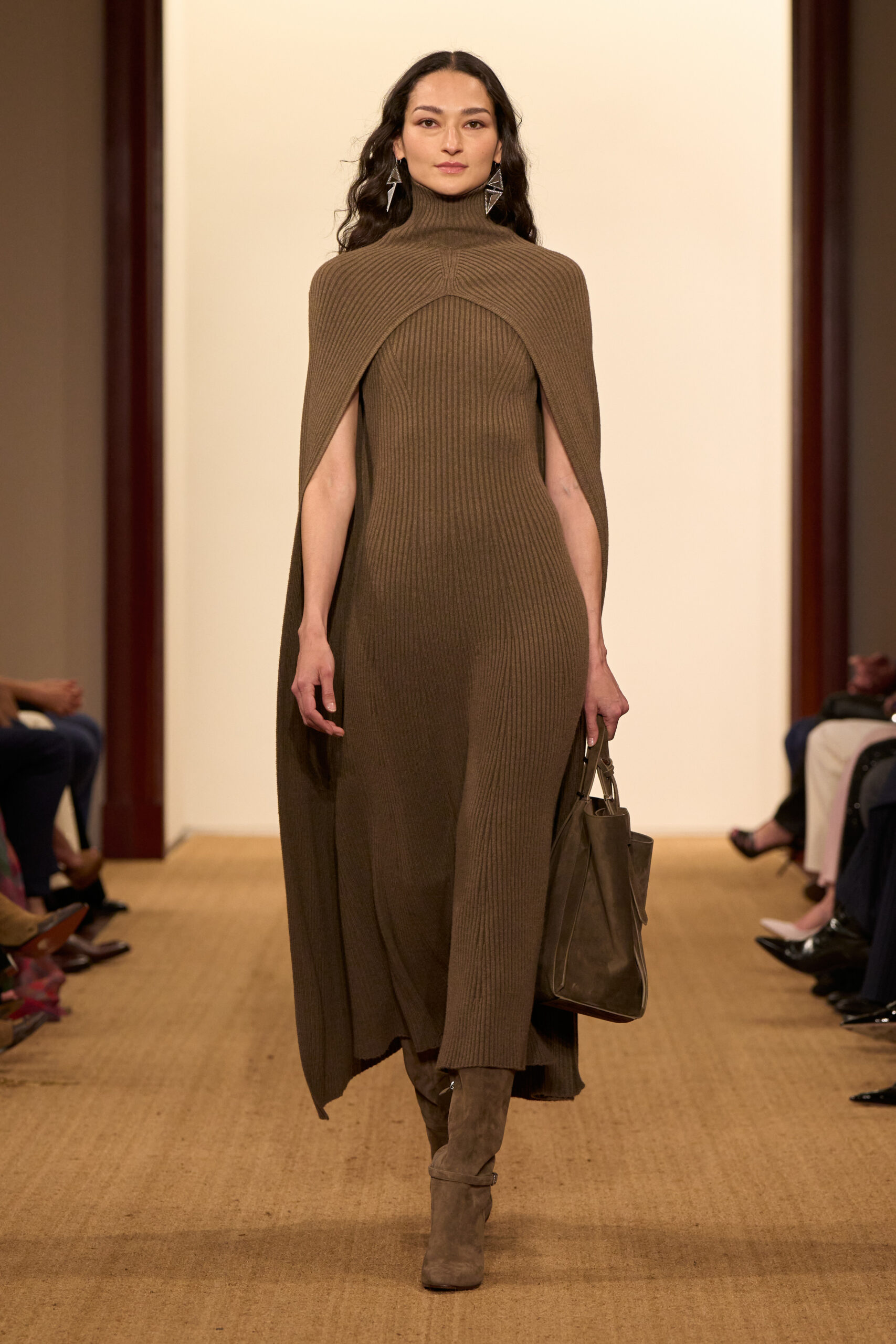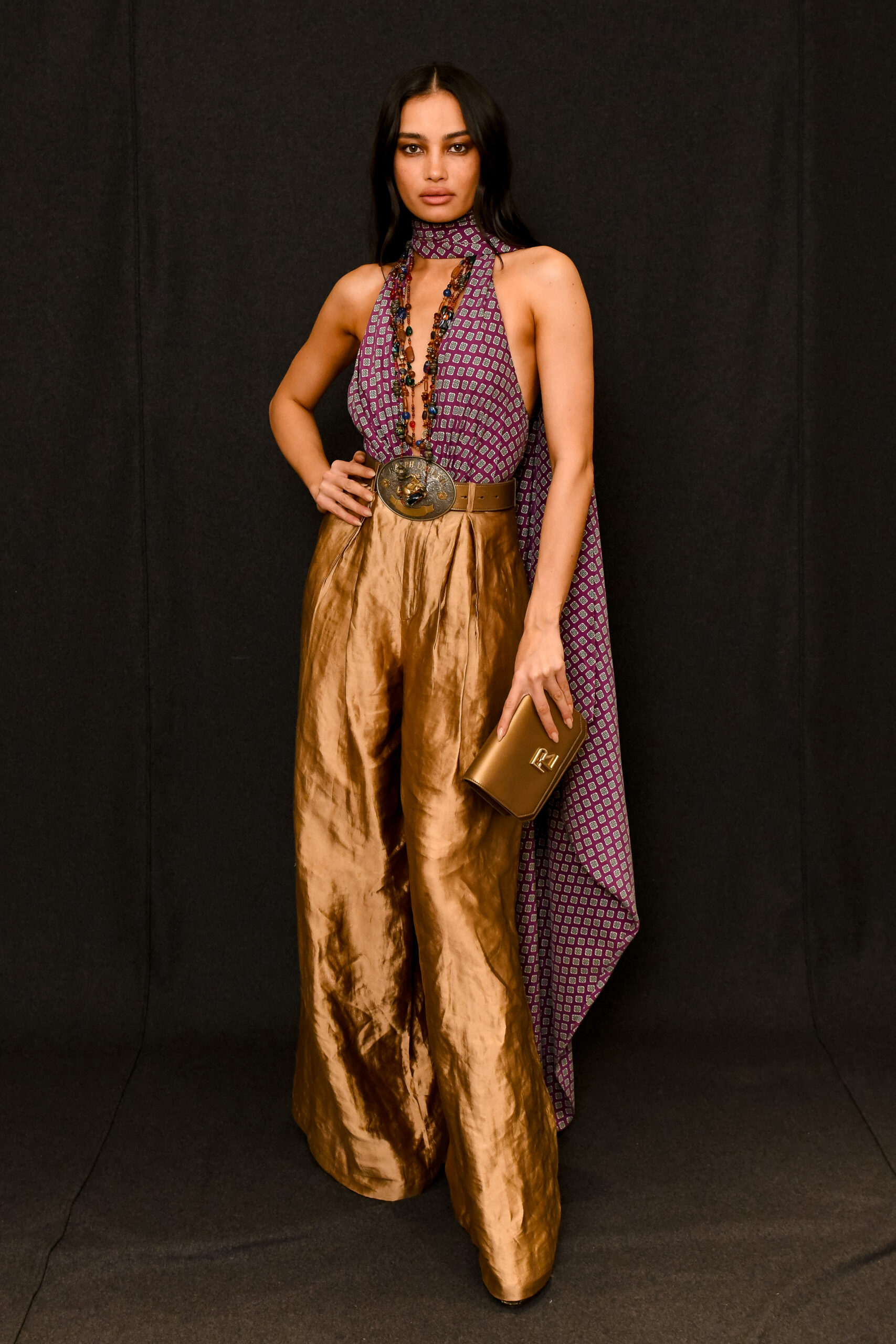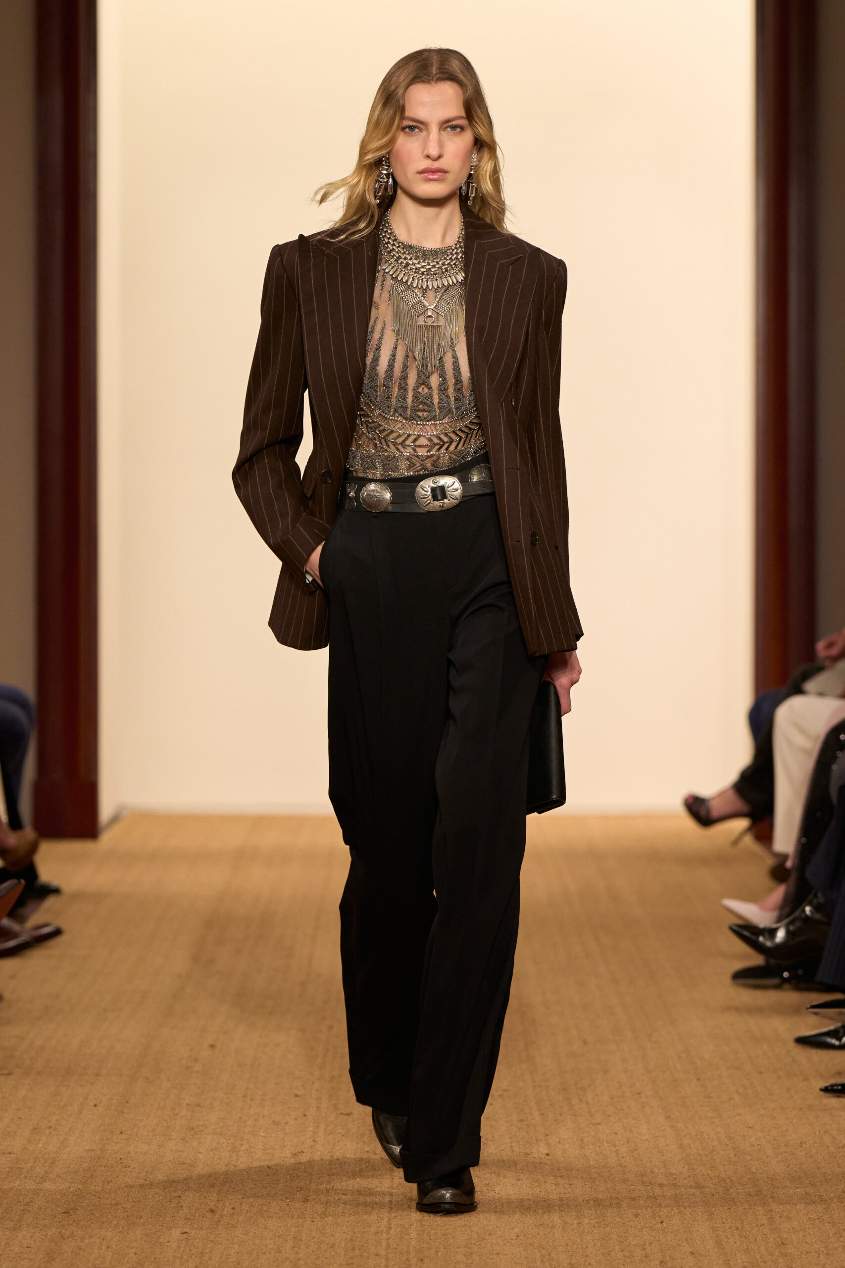 La collection fait la part belle aux nuances neutres et métalliques, qui soulignent le luxe discret et l’élégance intemporelle caractéristiques de la marque. Les pièces maîtresses incluent des vestes de tailleur ajustées, des tricots drapés, ainsi que des éléments en daim et cuir, et des robes coupées en biais. Ralph Lauren marie minimalisme et artistry en agrémentant ses pièces préférées de perles et de tweeds, de patchworks et d’ornements.