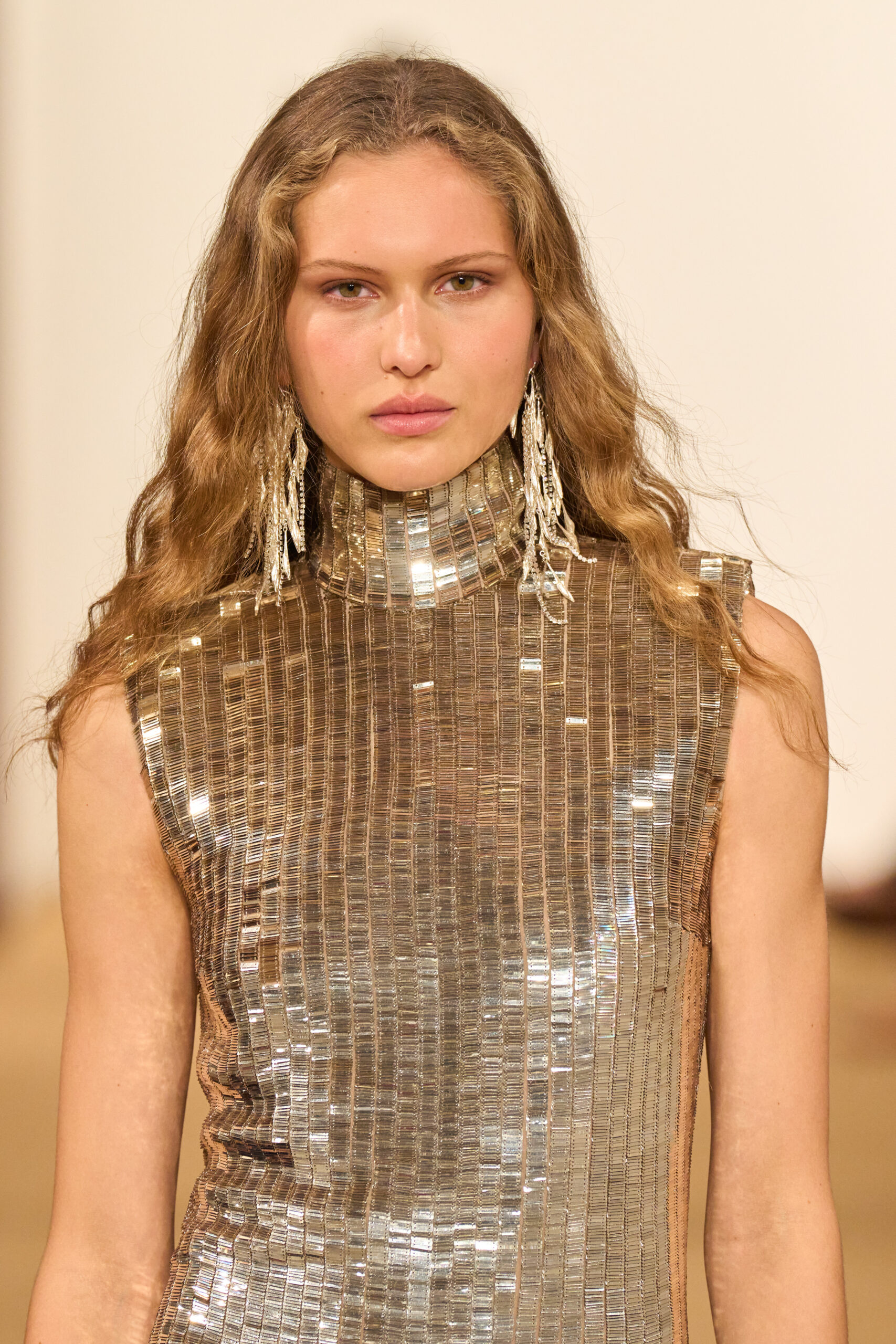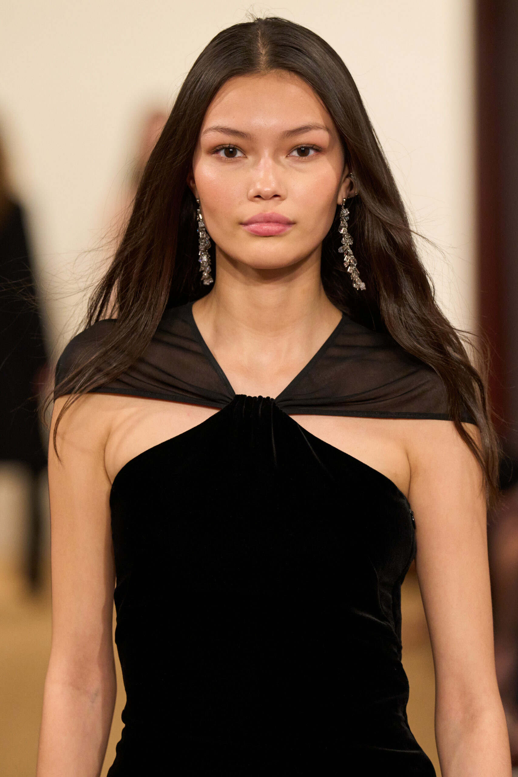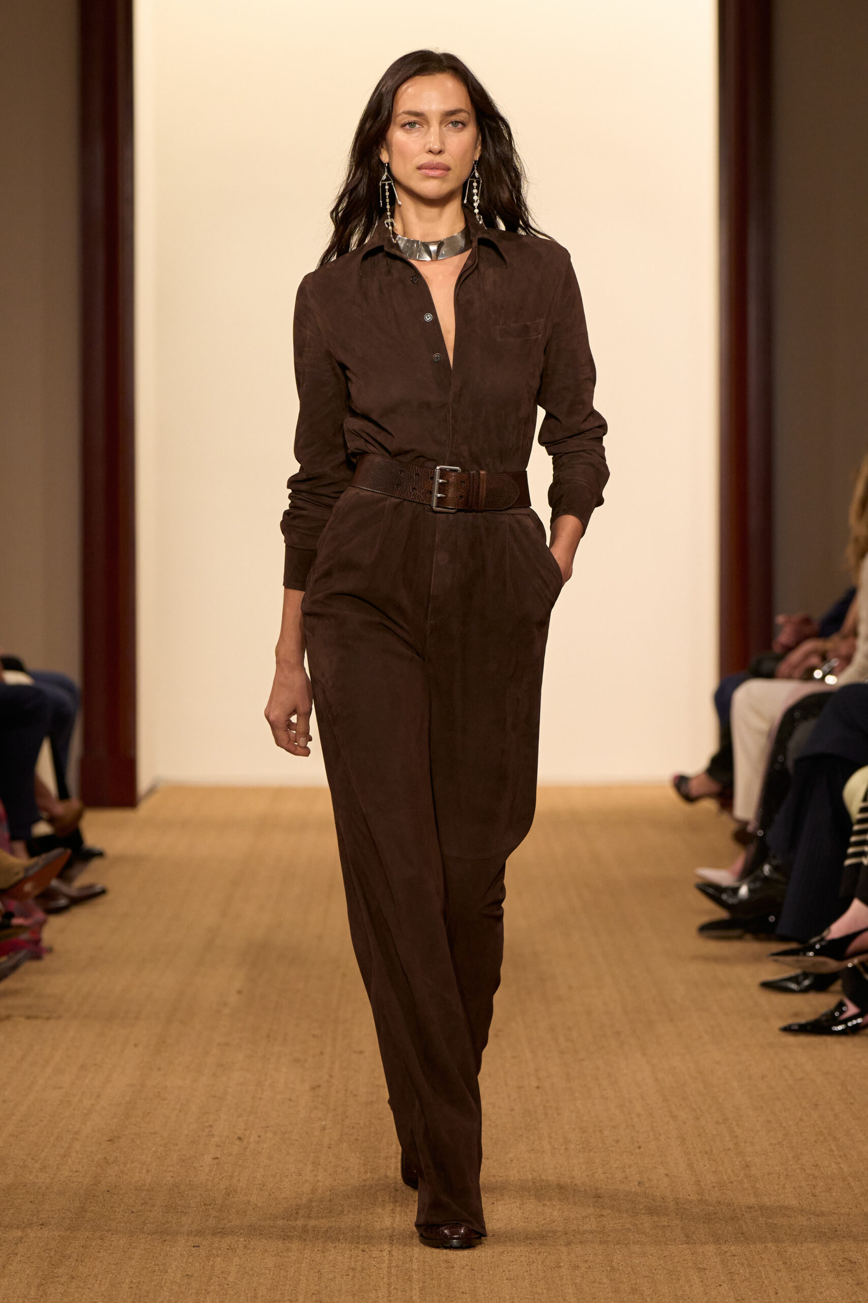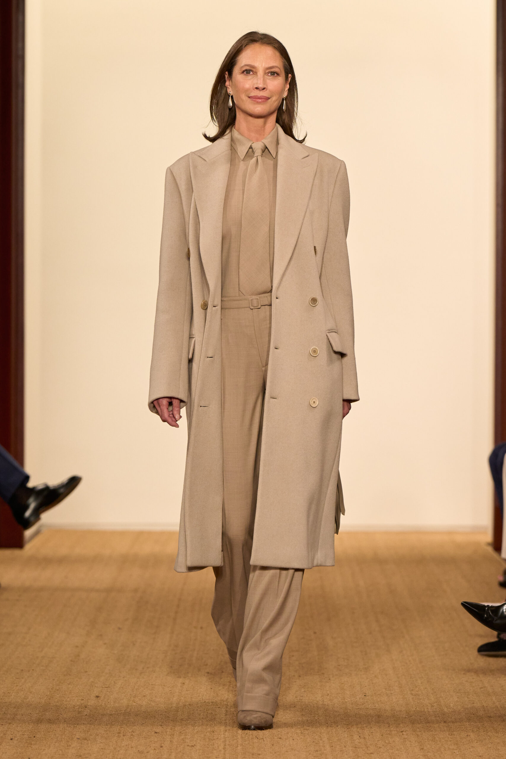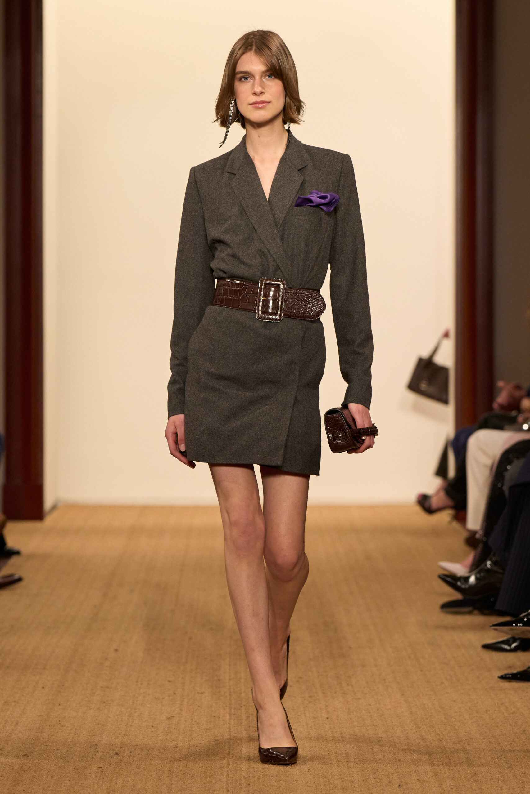 La collection fait la part belle aux nuances neutres et métalliques, qui soulignent le luxe discret et l’élégance intemporelle caractéristiques de la marque. Les pièces maîtresses incluent des vestes de tailleur ajustées, des tricots drapés, ainsi que des éléments en daim et cuir, et des robes coupées en biais. Ralph Lauren marie minimalisme et artistry en agrémentant ses pièces préférées de perles et de tweeds, de patchworks et d’ornements.