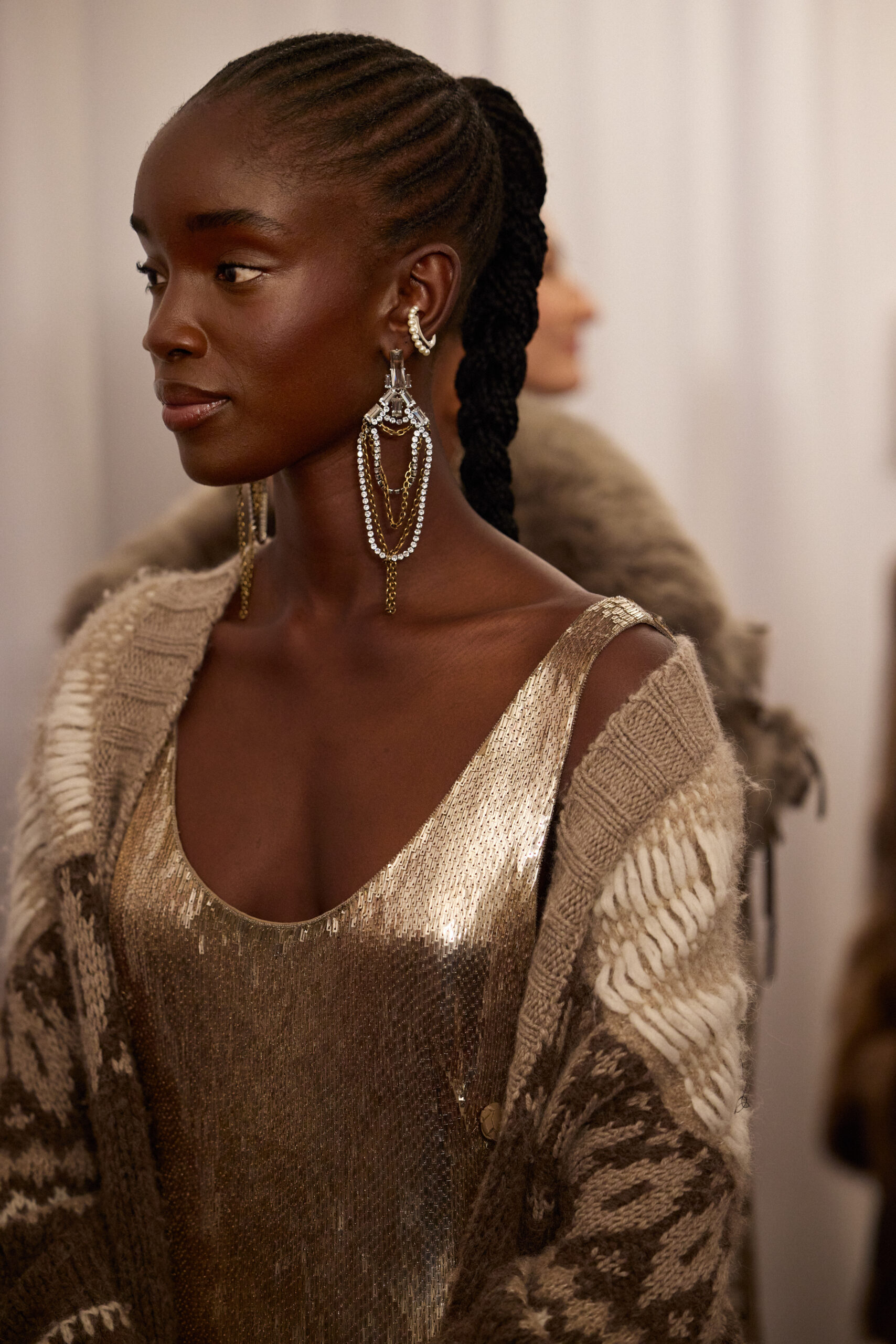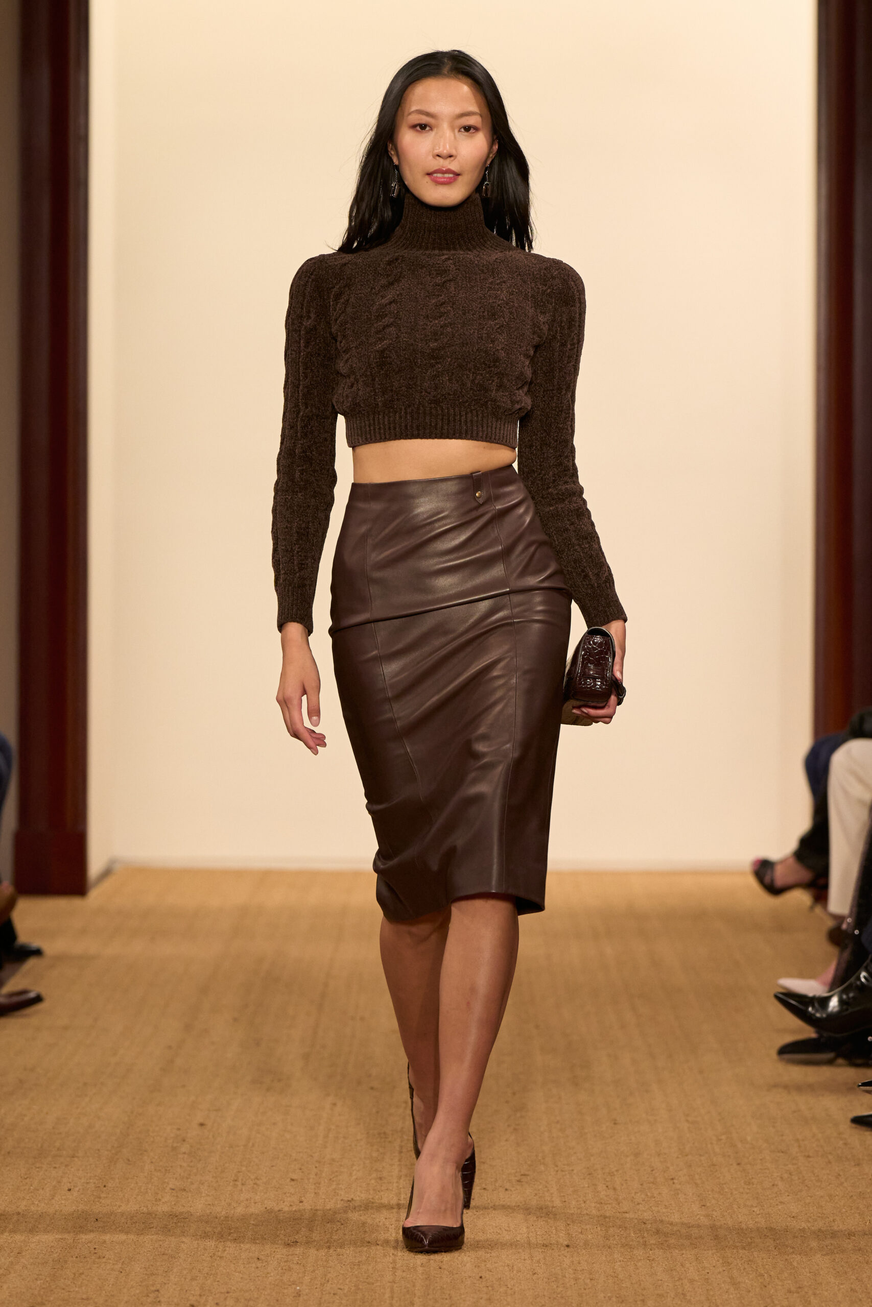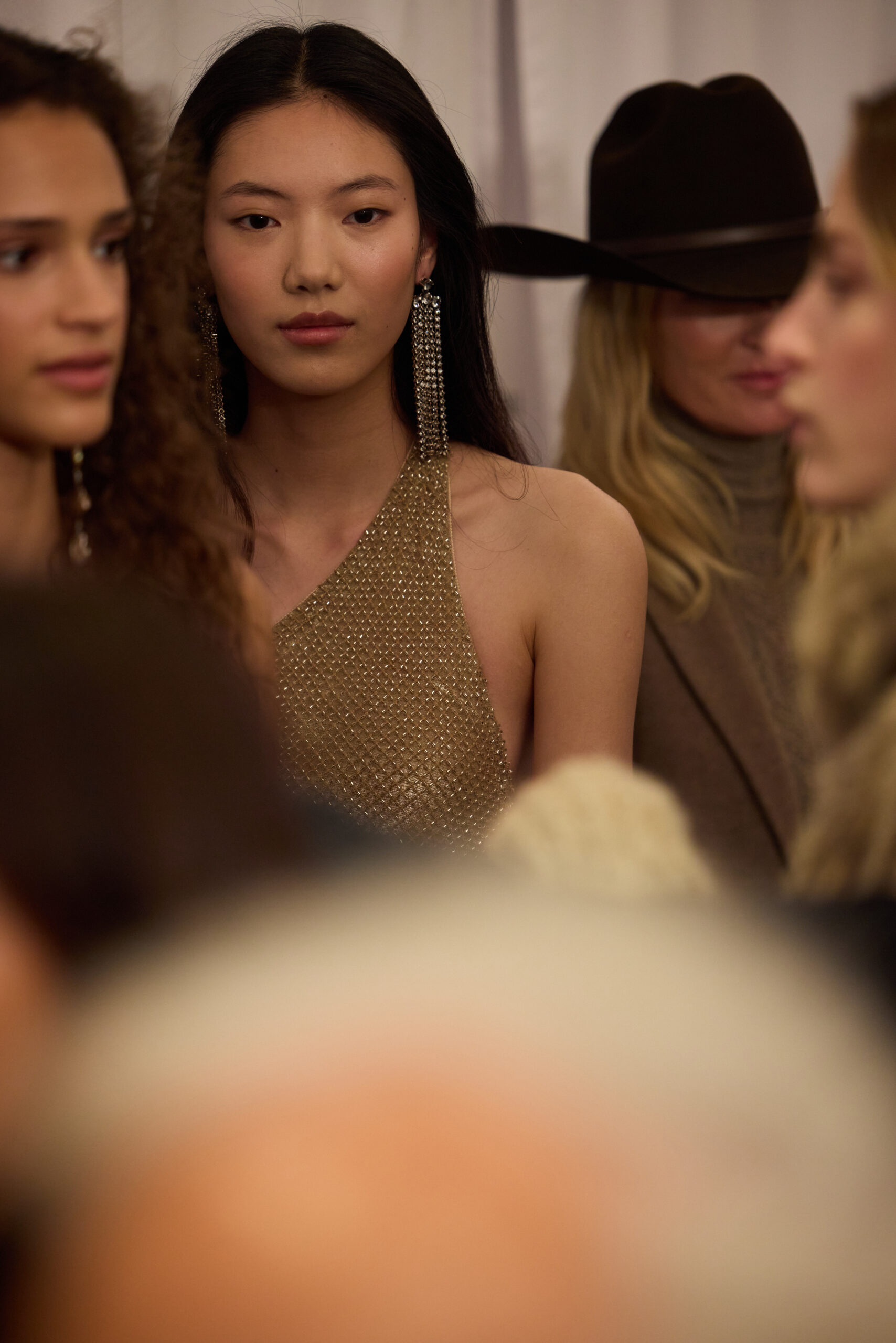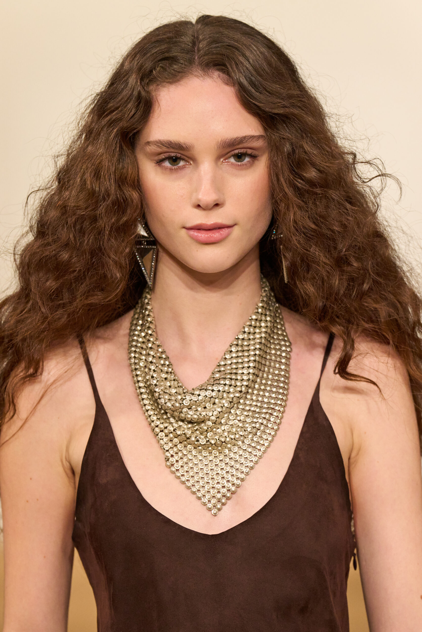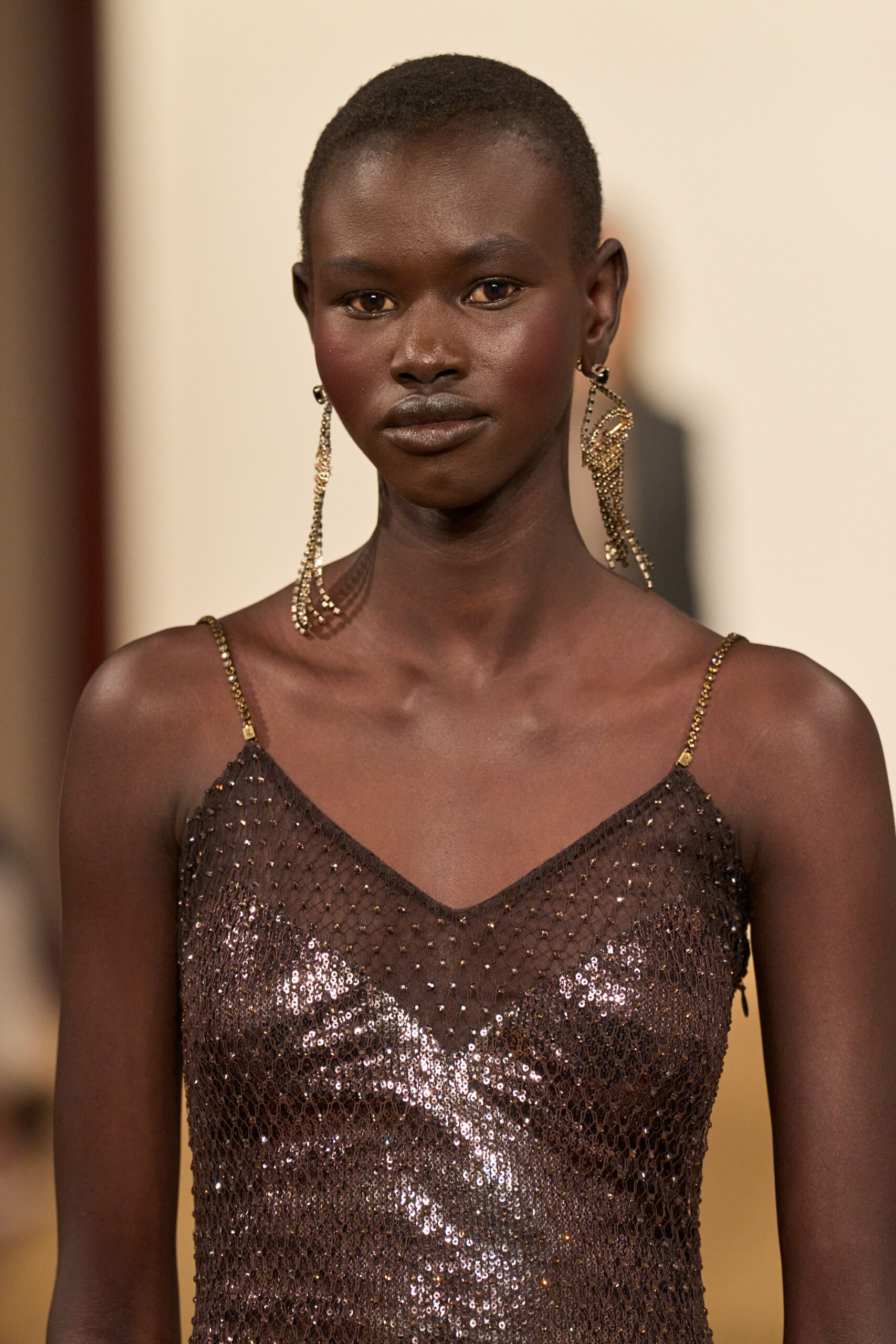 La collection fait la part belle aux nuances neutres et métalliques, qui soulignent le luxe discret et l’élégance intemporelle caractéristiques de la marque. Les pièces maîtresses incluent des vestes de tailleur ajustées, des tricots drapés, ainsi que des éléments en daim et cuir, et des robes coupées en biais. Ralph Lauren marie minimalisme et artistry en agrémentant ses pièces préférées de perles et de tweeds, de patchworks et d’ornements.