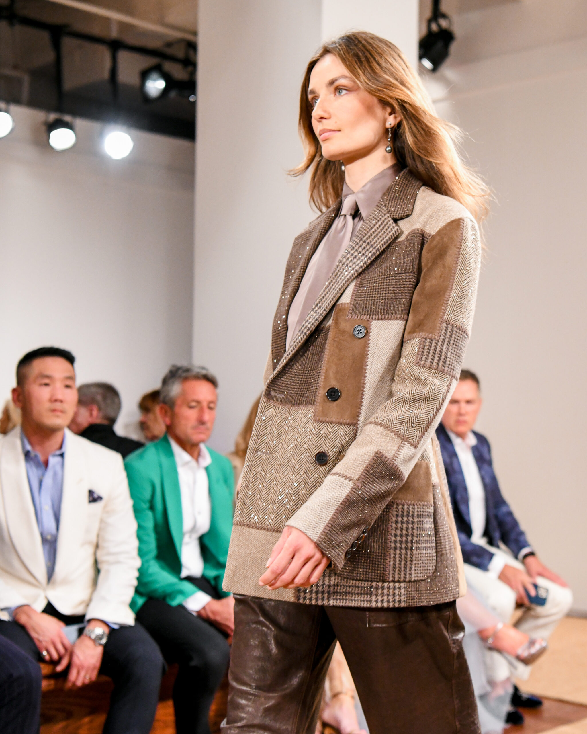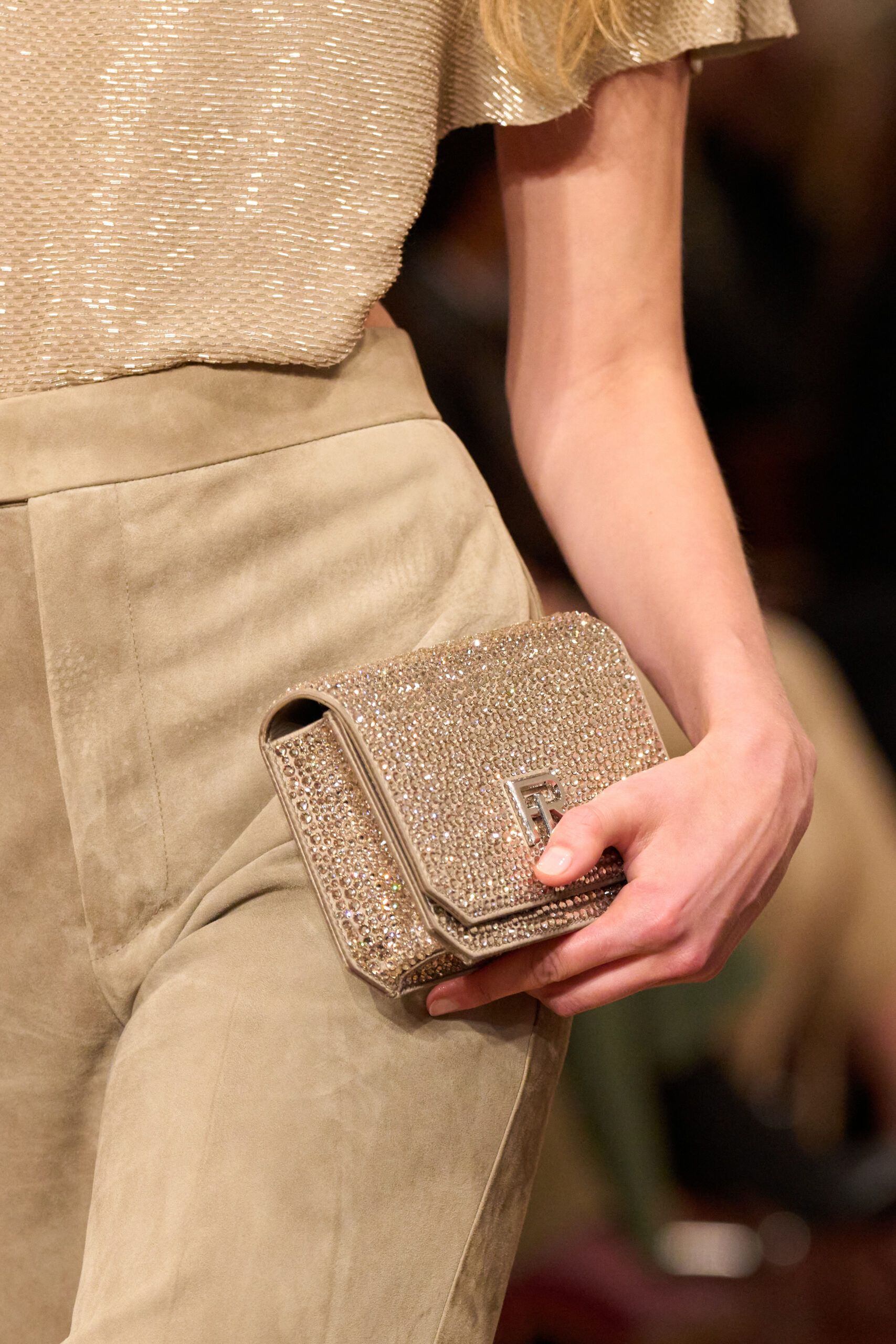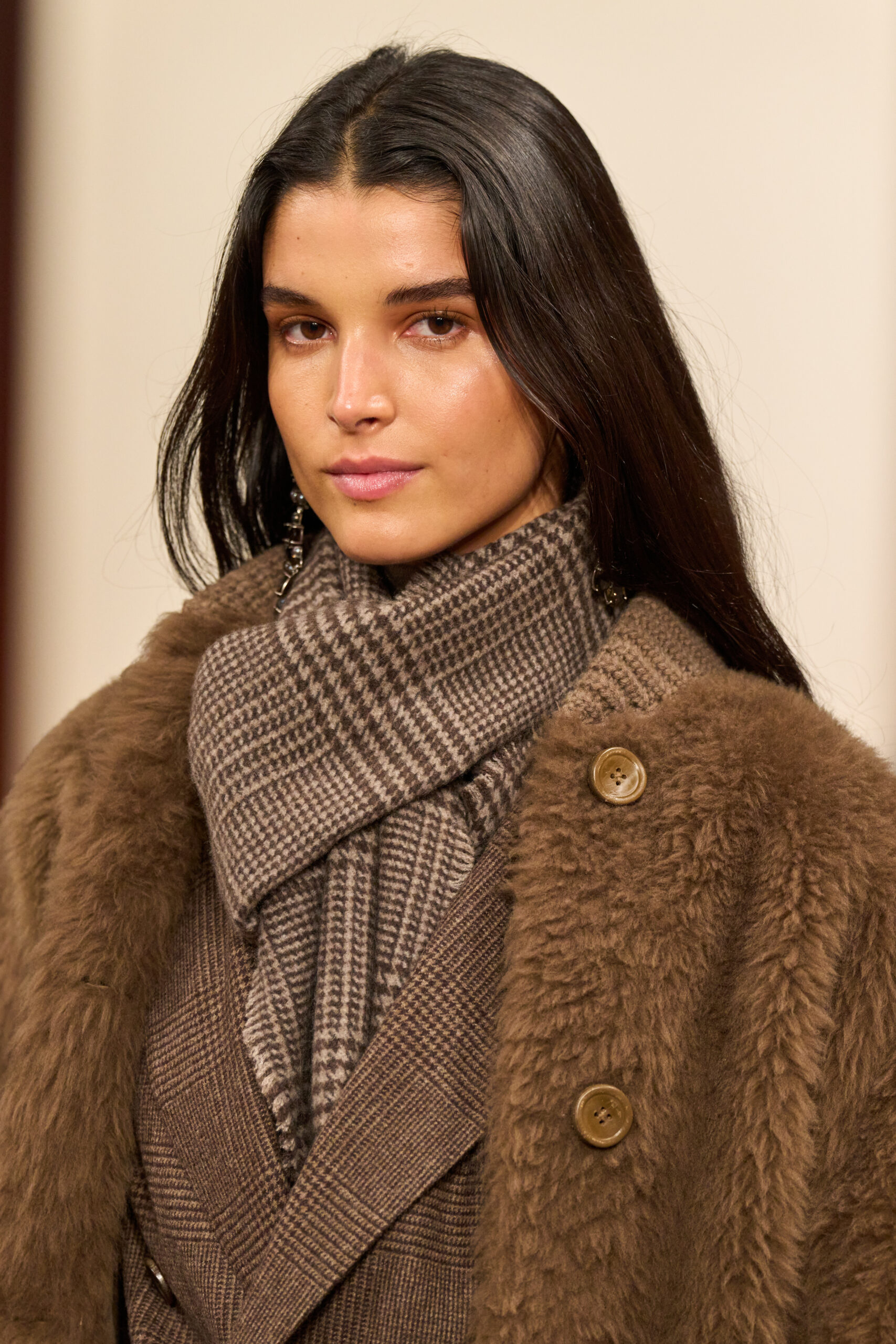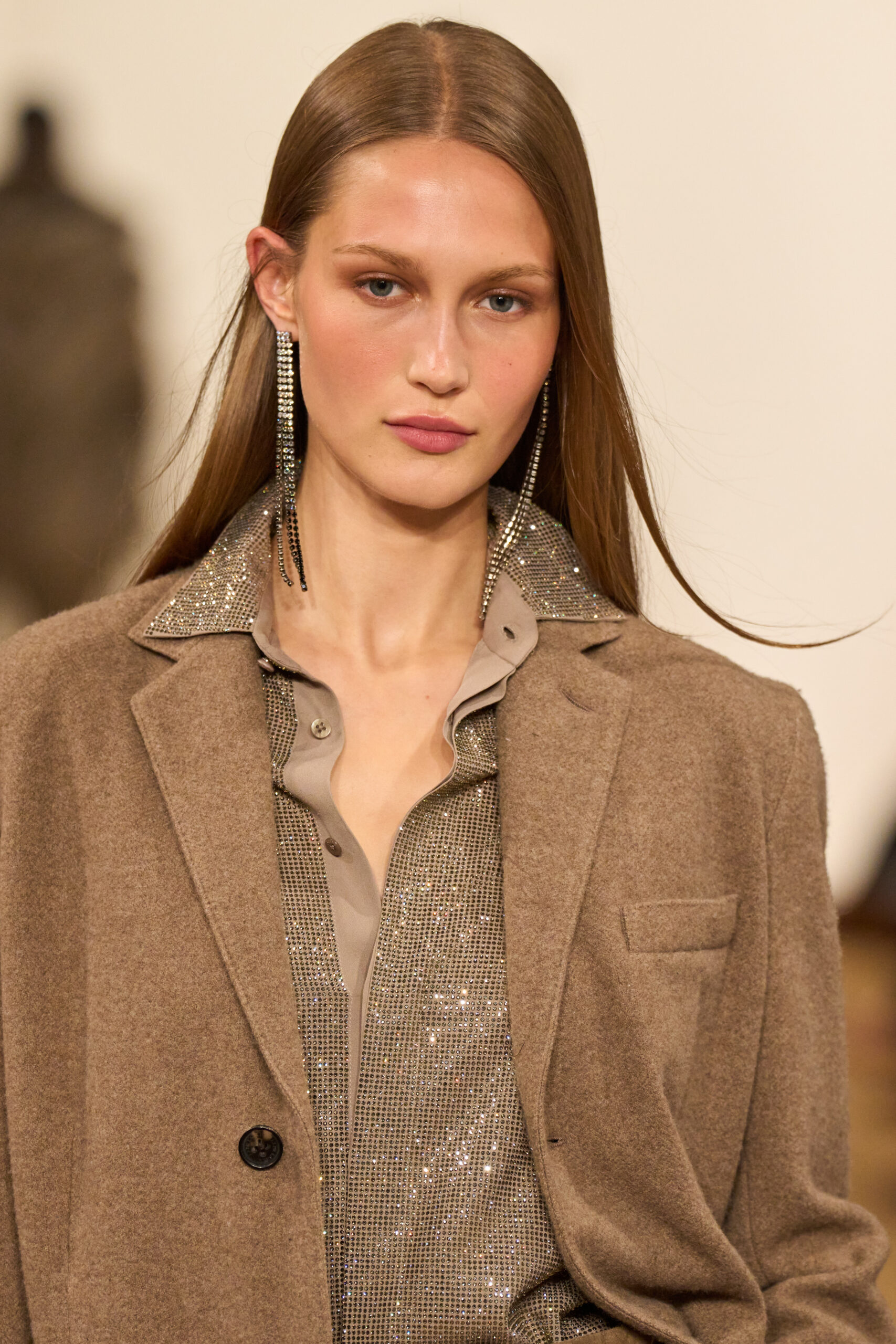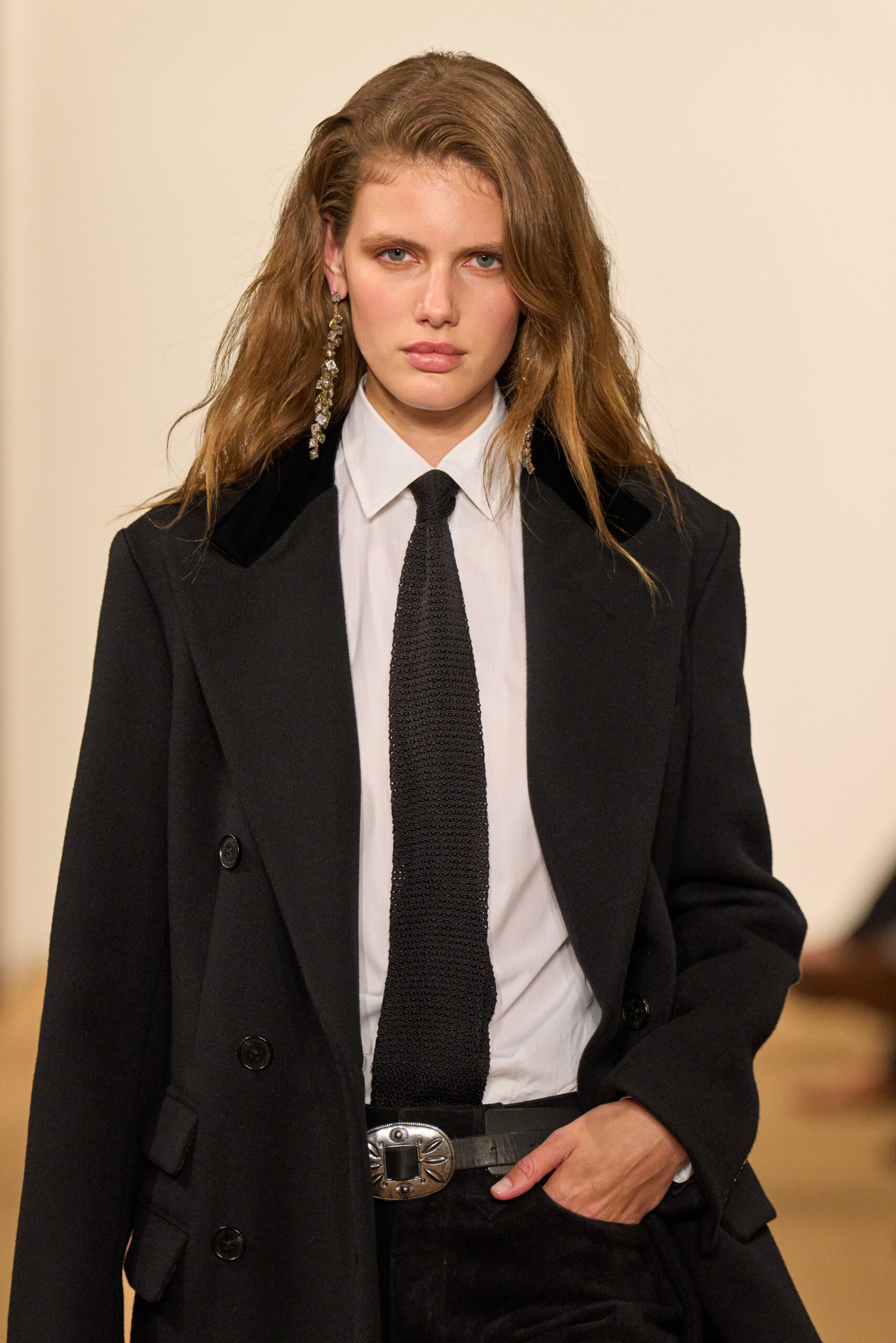 La collection fait la part belle aux nuances neutres et métalliques, qui soulignent le luxe discret et l’élégance intemporelle caractéristiques de la marque. Les pièces maîtresses incluent des vestes de tailleur ajustées, des tricots drapés, ainsi que des éléments en daim et cuir, et des robes coupées en biais. Ralph Lauren marie minimalisme et artistry en agrémentant ses pièces préférées de perles et de tweeds, de patchworks et d’ornements.