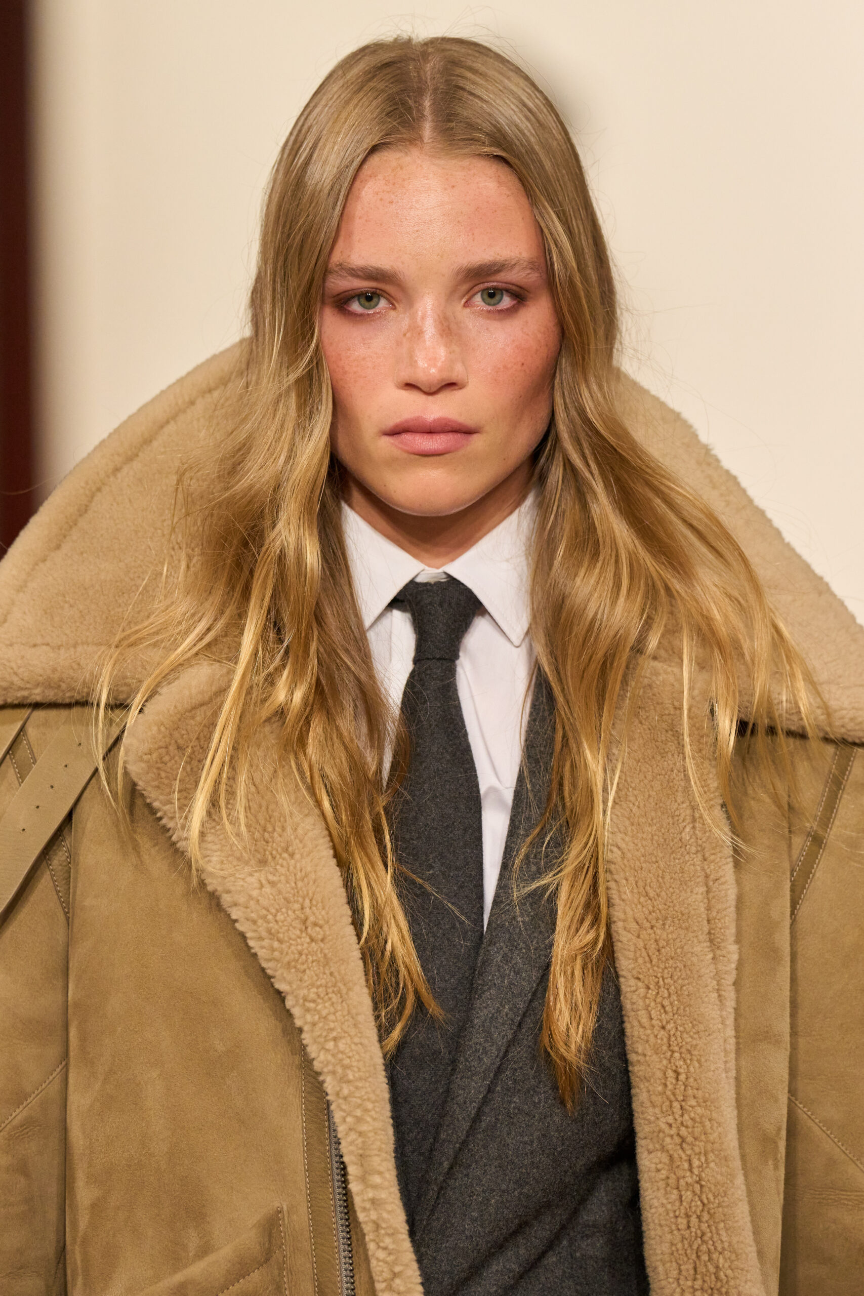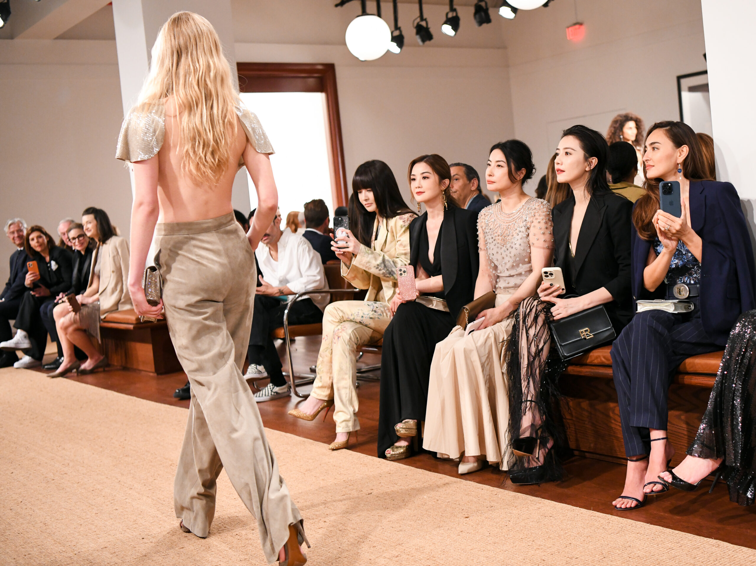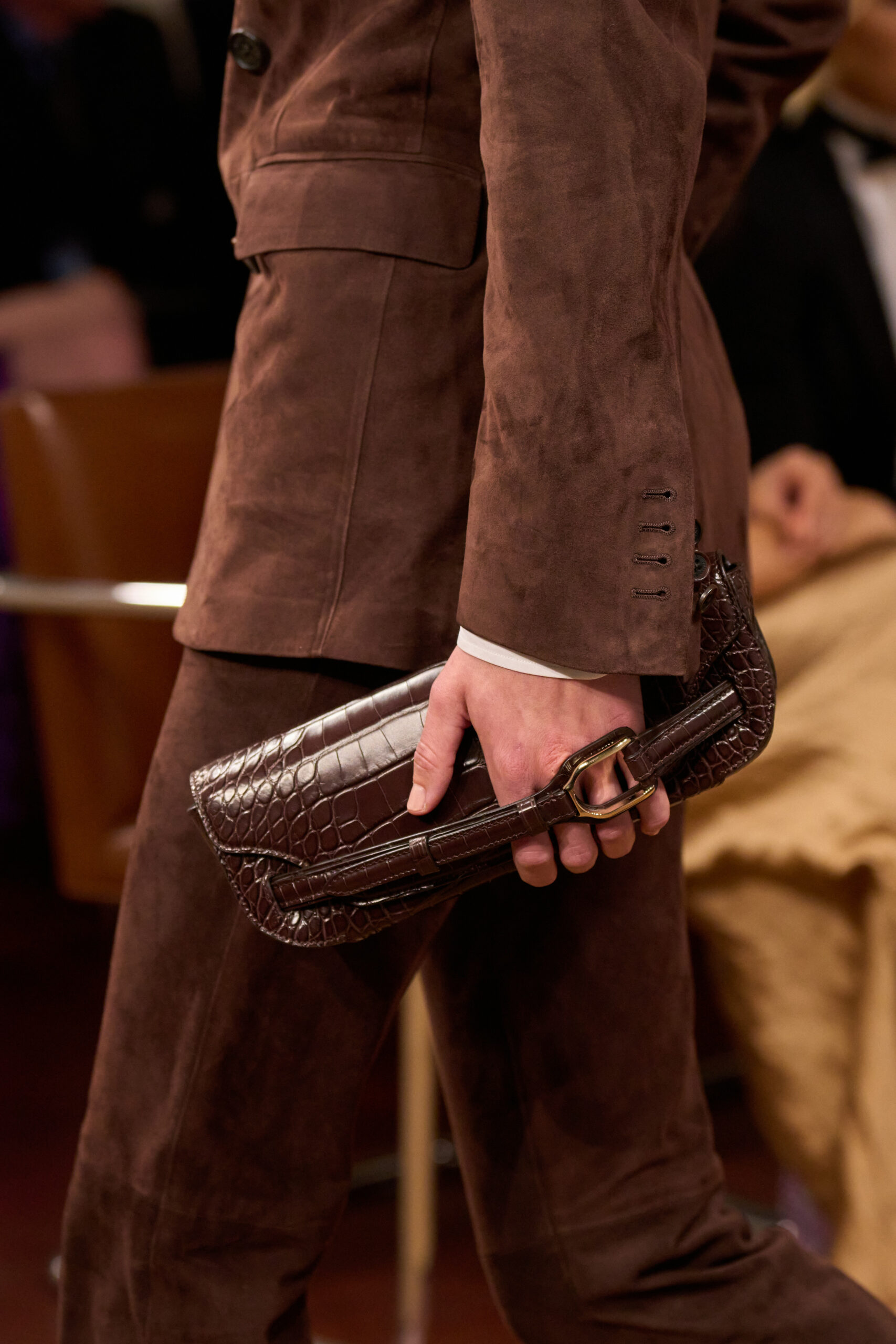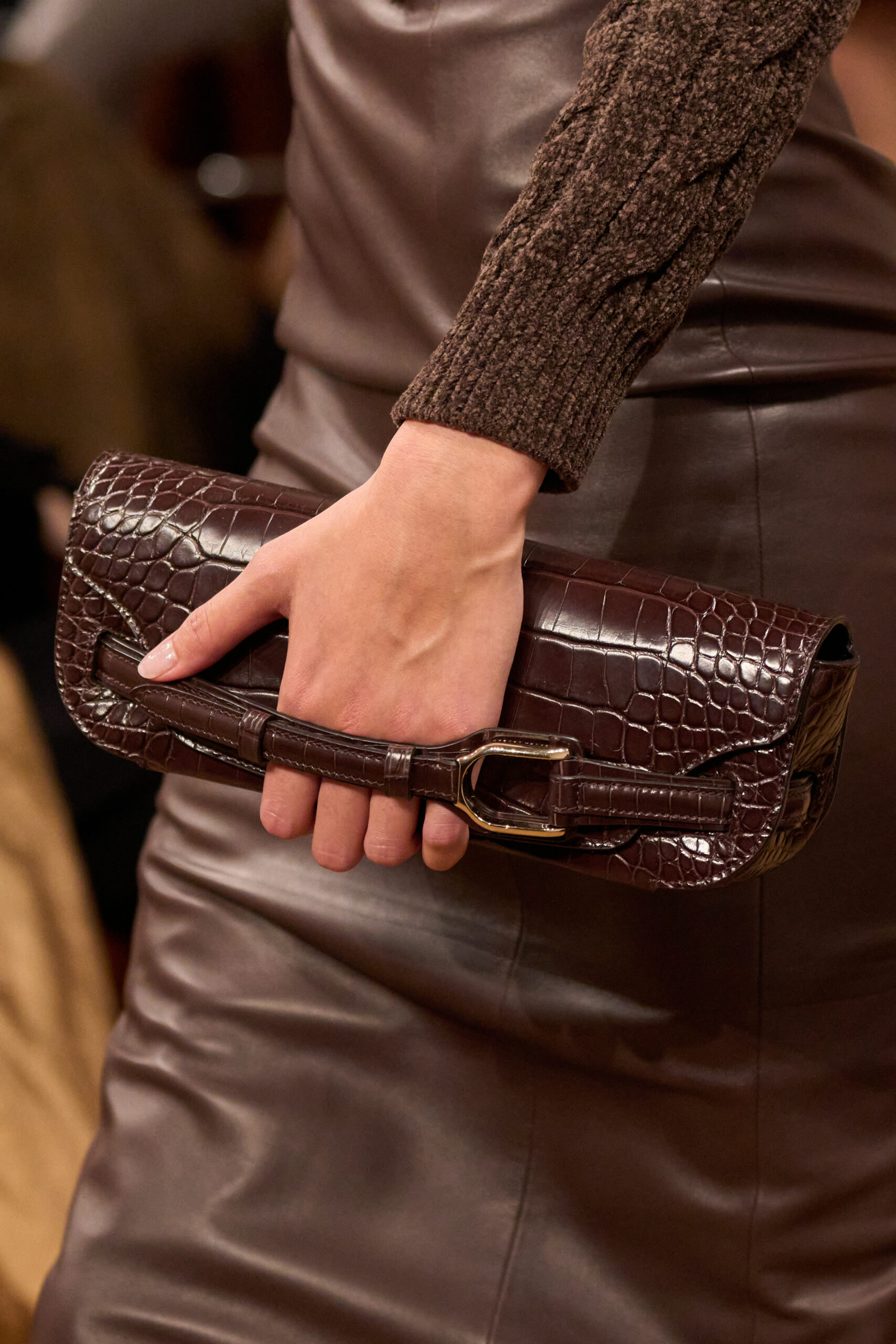 La collection fait la part belle aux nuances neutres et métalliques, qui soulignent le luxe discret et l’élégance intemporelle caractéristiques de la marque. Les pièces maîtresses incluent des vestes de tailleur ajustées, des tricots drapés, ainsi que des éléments en daim et cuir, et des robes coupées en biais. Ralph Lauren marie minimalisme et artistry en agrémentant ses pièces préférées de perles et de tweeds, de patchworks et d’ornements.
