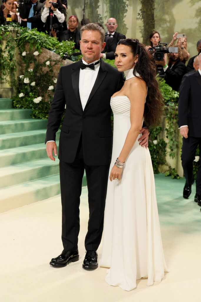 Matt Damon a opté pour un smoking classique en laine et soie noire, mettant en vedette un col cranté et une chemise à col cassé en coton blanc, complété par un nœud papillon en soie noir et des chaussures de type Derby en cuir noir « Carlo ». Ce choix souligne une approche classique du glamour du tapis rouge, tout en restant fidèle à l’élégance intemporelle de Dior.
