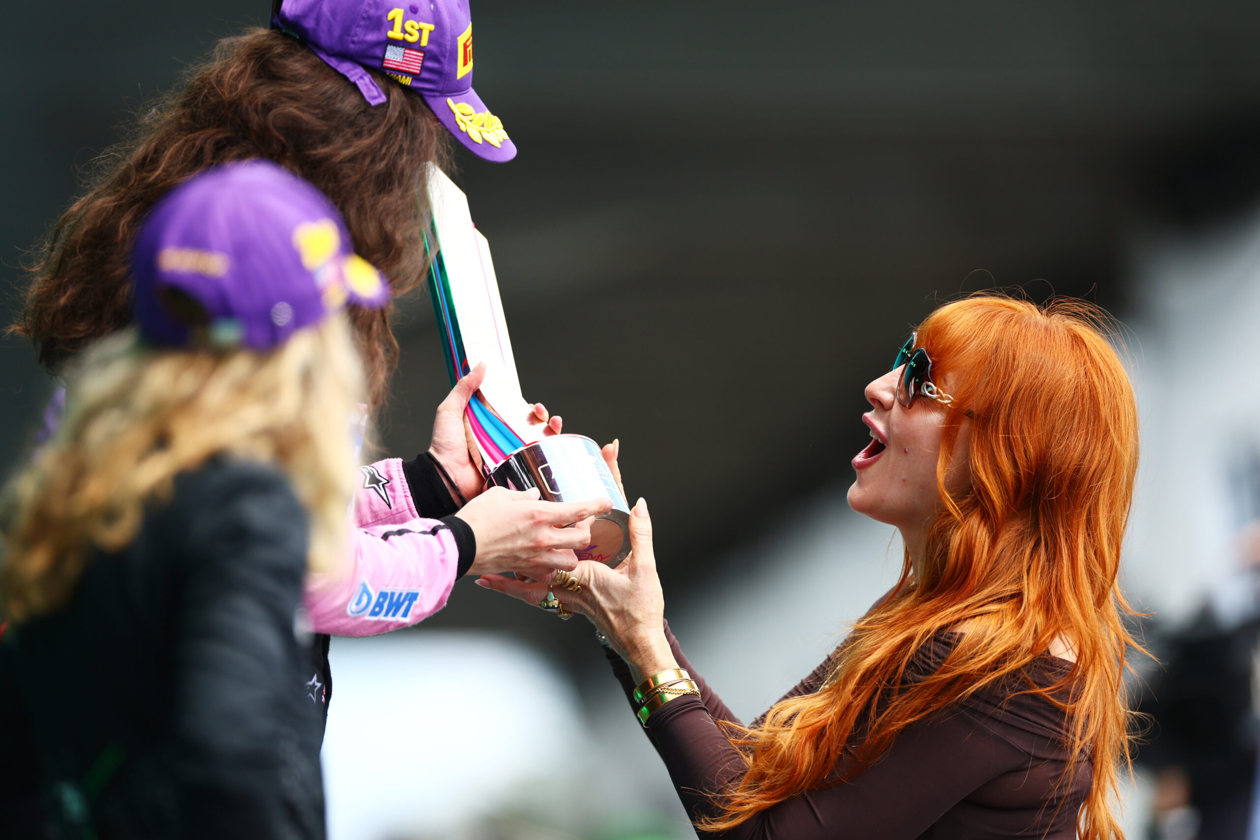 MIAMI, FLORIDA – MAY 04: Charlotte Tilbury presents the Race winner trophy to Race winner Abbi Pulling of Great Britain and Rodin Motorsport (9) on the podium during race 1 during Round 2 Miami of the F1 Academy at Miami International Autodrome on May 04, 2024 in Miami, Florida. (Photo by Clive Rose – Formula 1/Formula 1 via Getty Images)