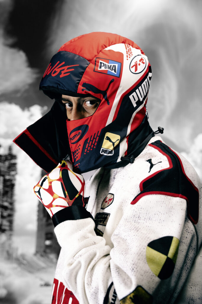 La collection se distingue par des vêtements et accessoires qui semblent tout droit sortis d’un paddock de course. Le sweatsuit A$AP Rocky x PUMA, avec son imprimé dégradé et son design épuré, imite la coupe des combinaisons de pilote, offrant à la fois confort et une silhouette affûtée pour le quotidien. Le T-shirt, avec son graphisme subtil de ceinture de sécurité, et les cagoules, rappelant les équipements de protection des pilotes, fusionnent sécurité et style avec une aisance remarquable.