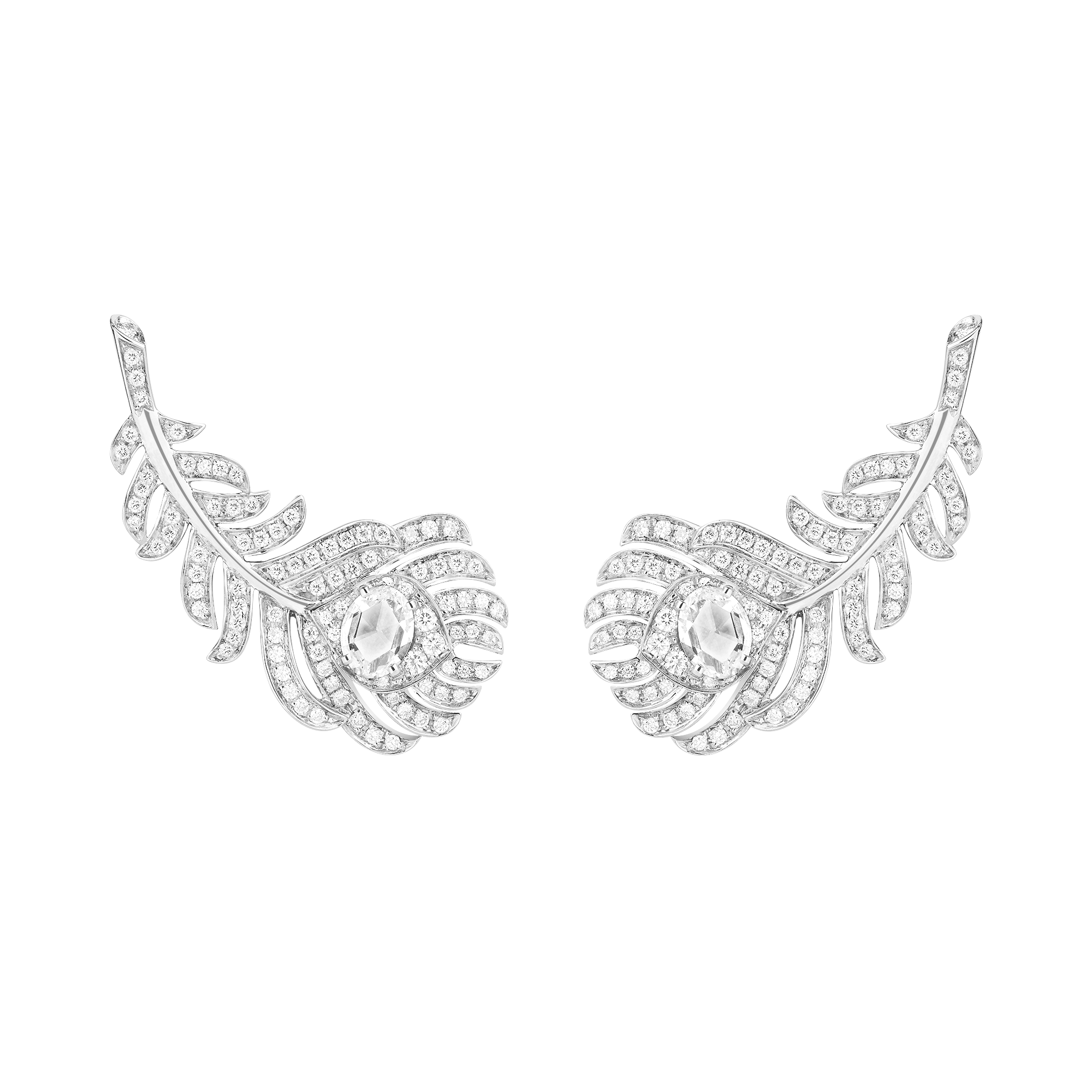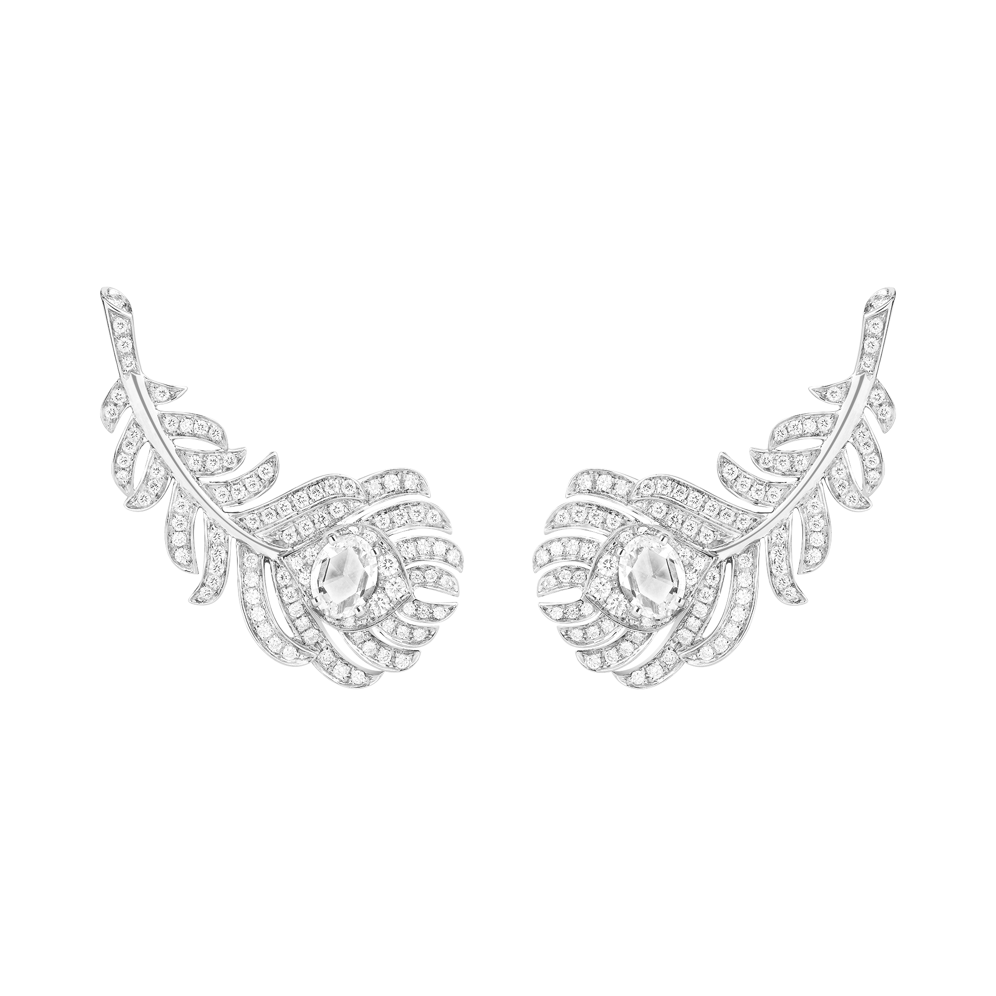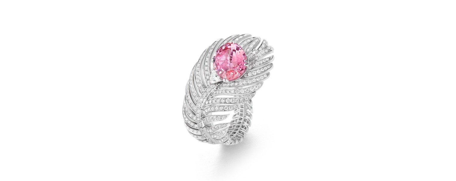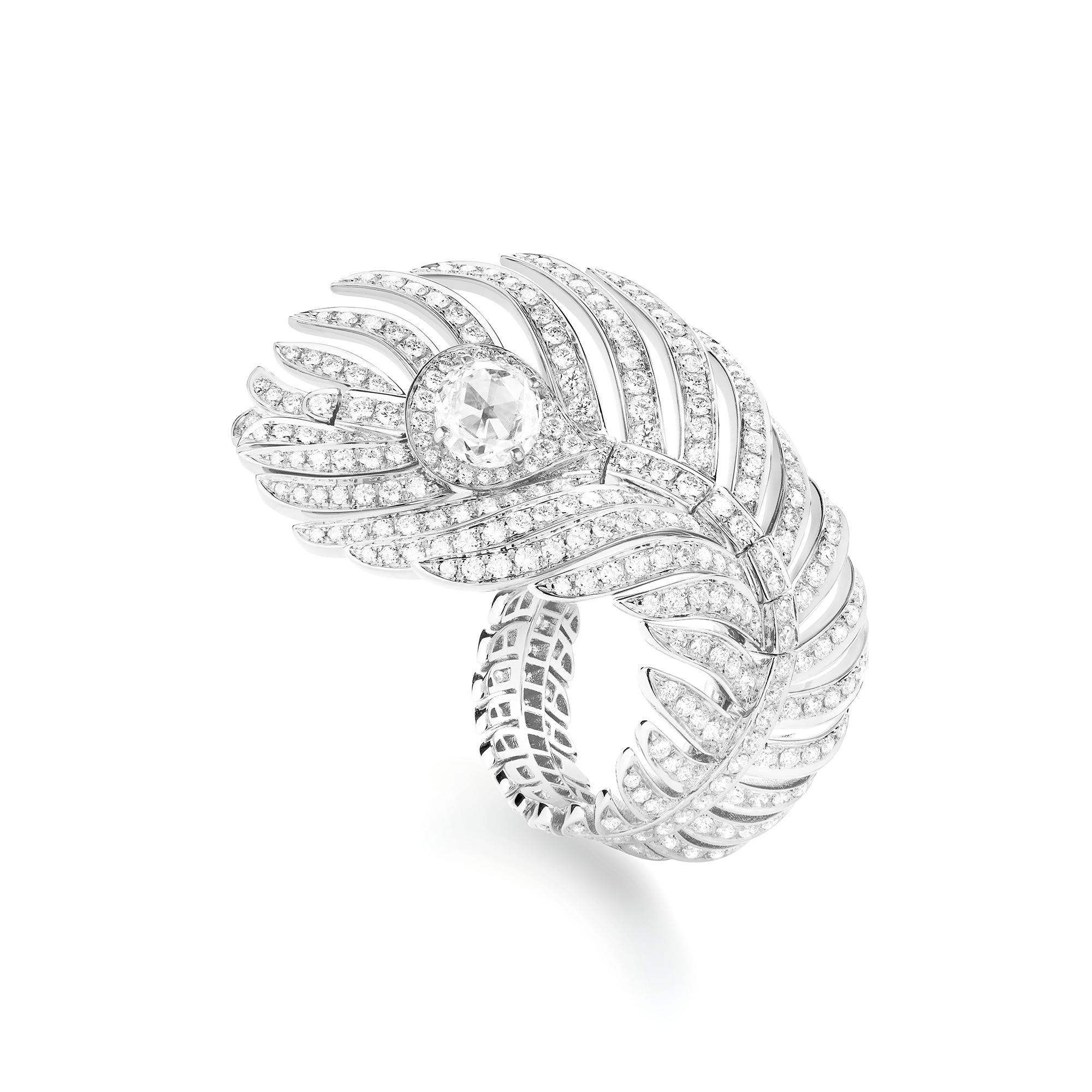 Lily James a opté pour une approche tout aussi raffinée, parée de boucles d’oreilles « Plume de Paon » en or blanc, éclatantes de diamants. La bague assortie, avec son spinelle rose ovale et pavée de diamants, ainsi qu’une autre « Plume de Paon » grand modèle avec un diamant taille rose, ont toutes deux accentué son allure avec une grâce presque ethérée, chaque bijou jouant avec la lumière pour capturer l’éclat du temps.