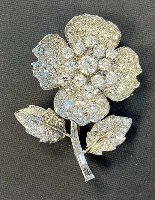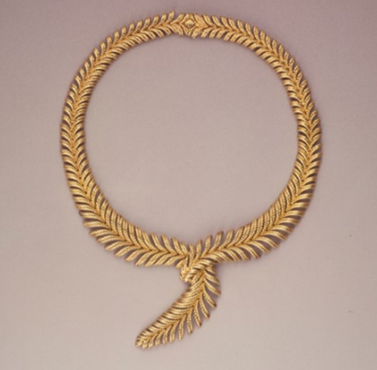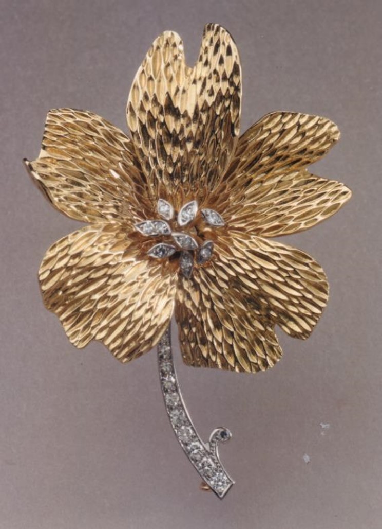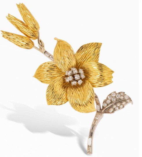 Wes Gordon a arboré des broches symboliques : « Azalée », « Eglantine », et « Seringat », toutes serties de diamants et combinant or jaune et platine. Chaque pièce, datant des années 1950, démontre l’engagement continu de Boucheron à célébrer la beauté naturelle et la complexité à travers le temps.