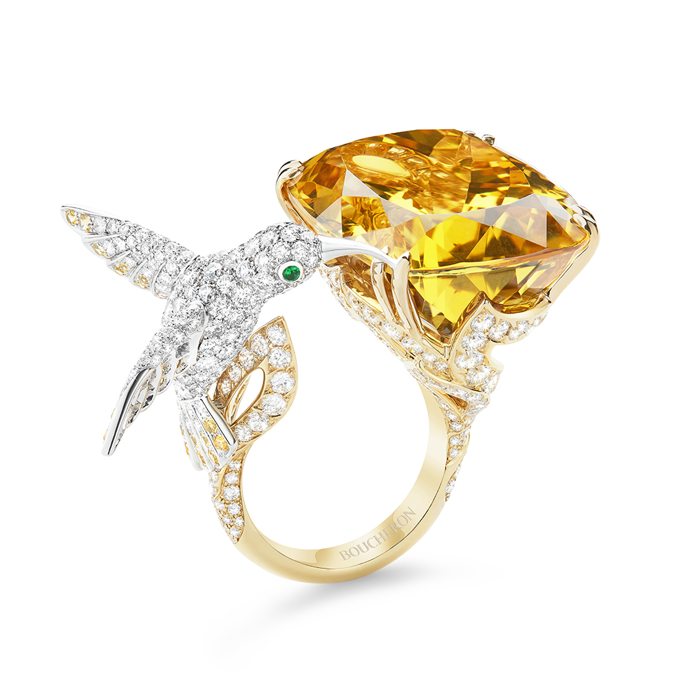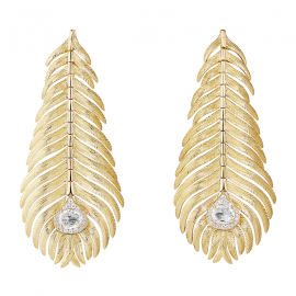 Zoe Saldaña a brillé avec les pendants d’oreilles et la bague « Plume de Paon » grand modèle, tous deux sertis de diamants taille rose sur or jaune. Cette parure, symbole de renouveau et de noblesse, reflète la majesté et la splendeur naturelle du paon. Zoe a complété son ensemble avec la bague « Hopi, le Colibri », cette fois sertie d’un béryl jaune vibrant, ajoutant une touche de couleur lumineuse à son look déjà resplendissant.