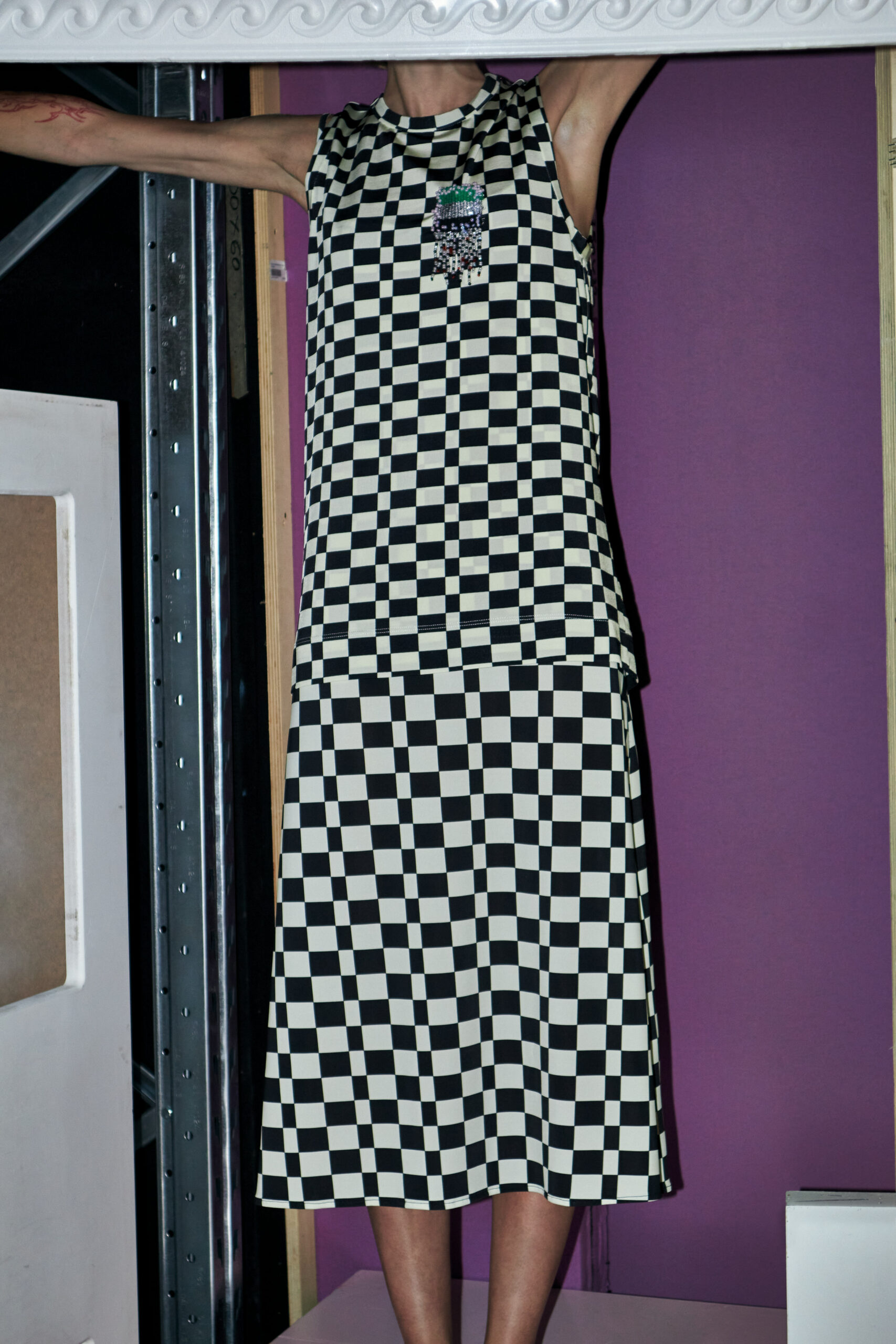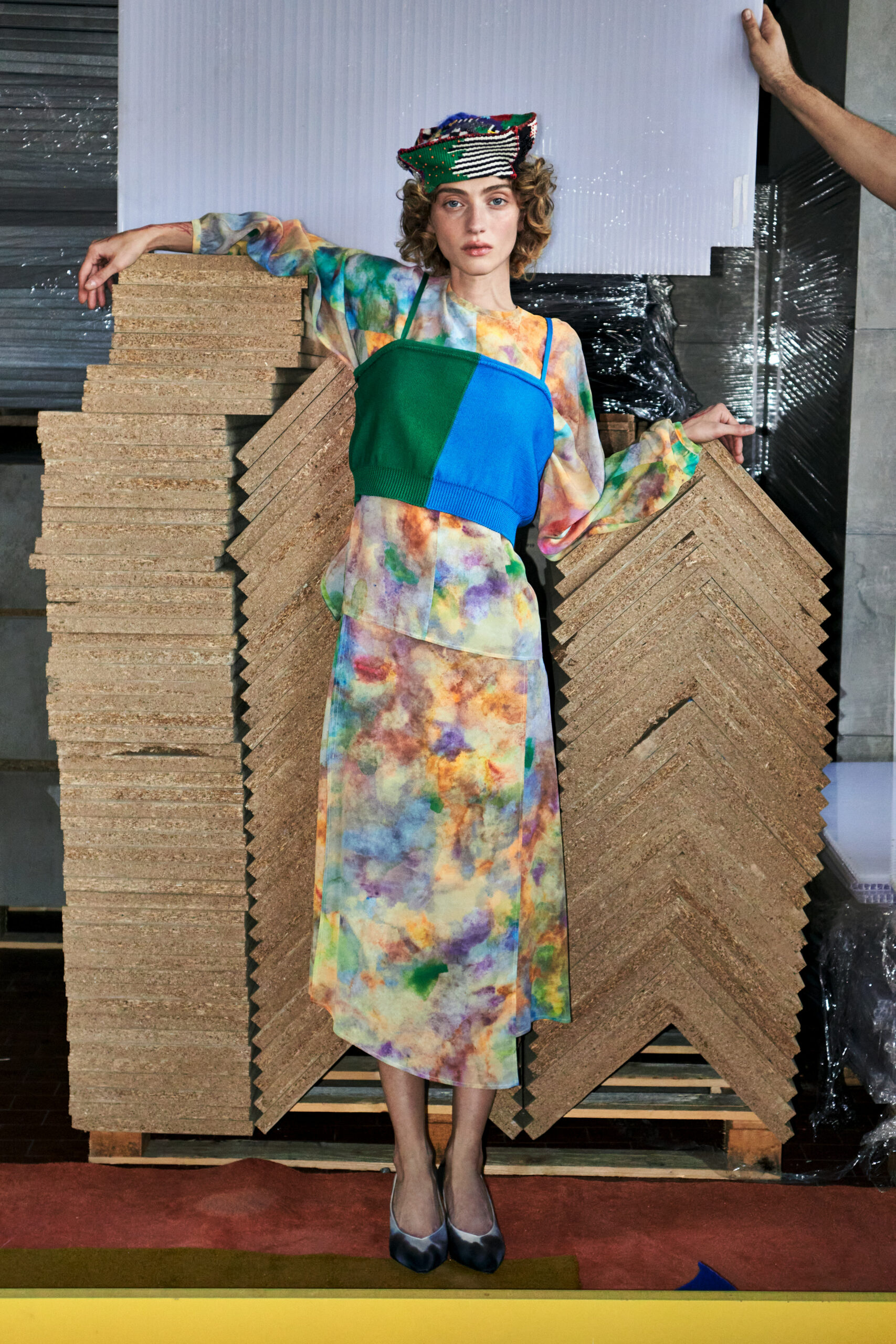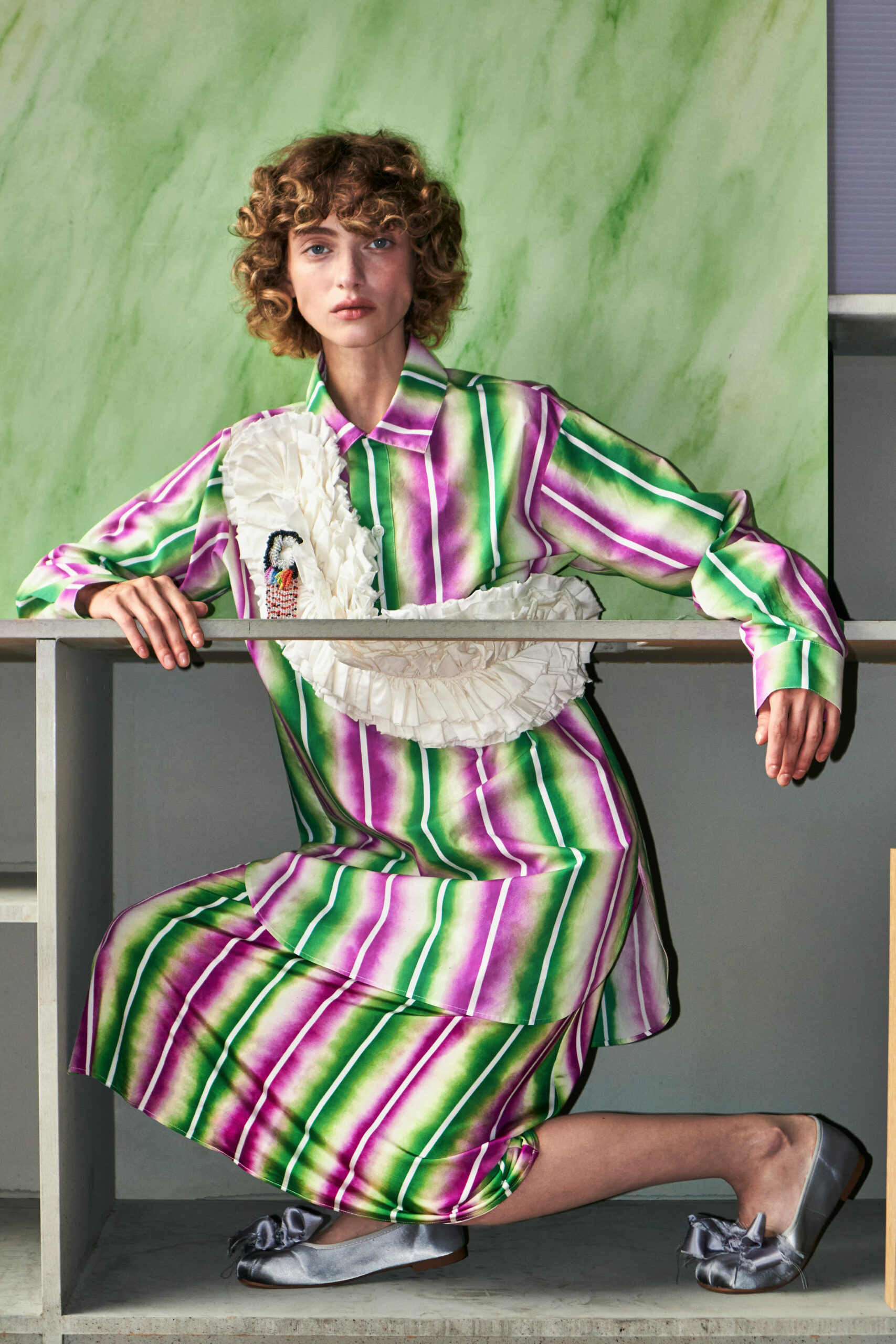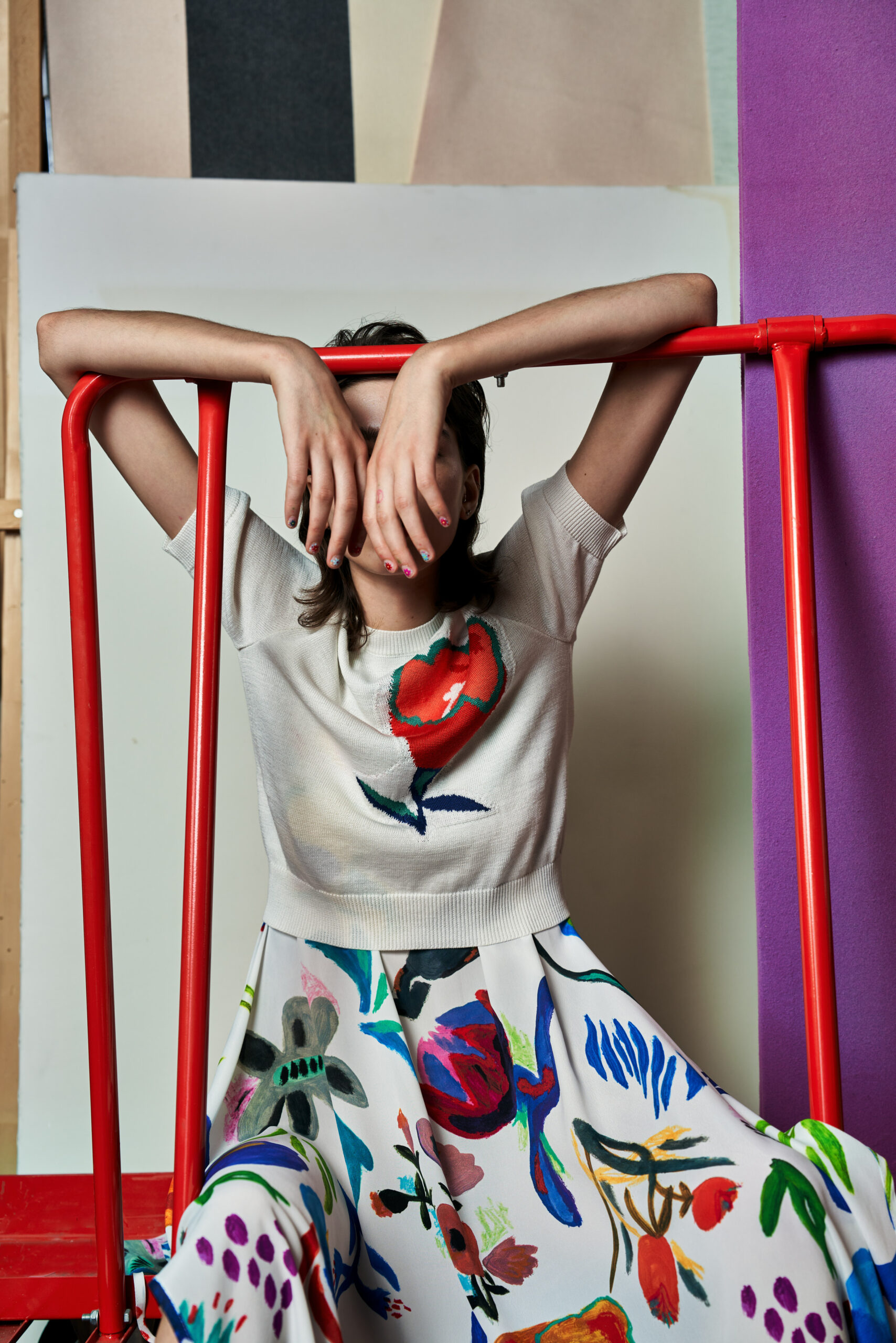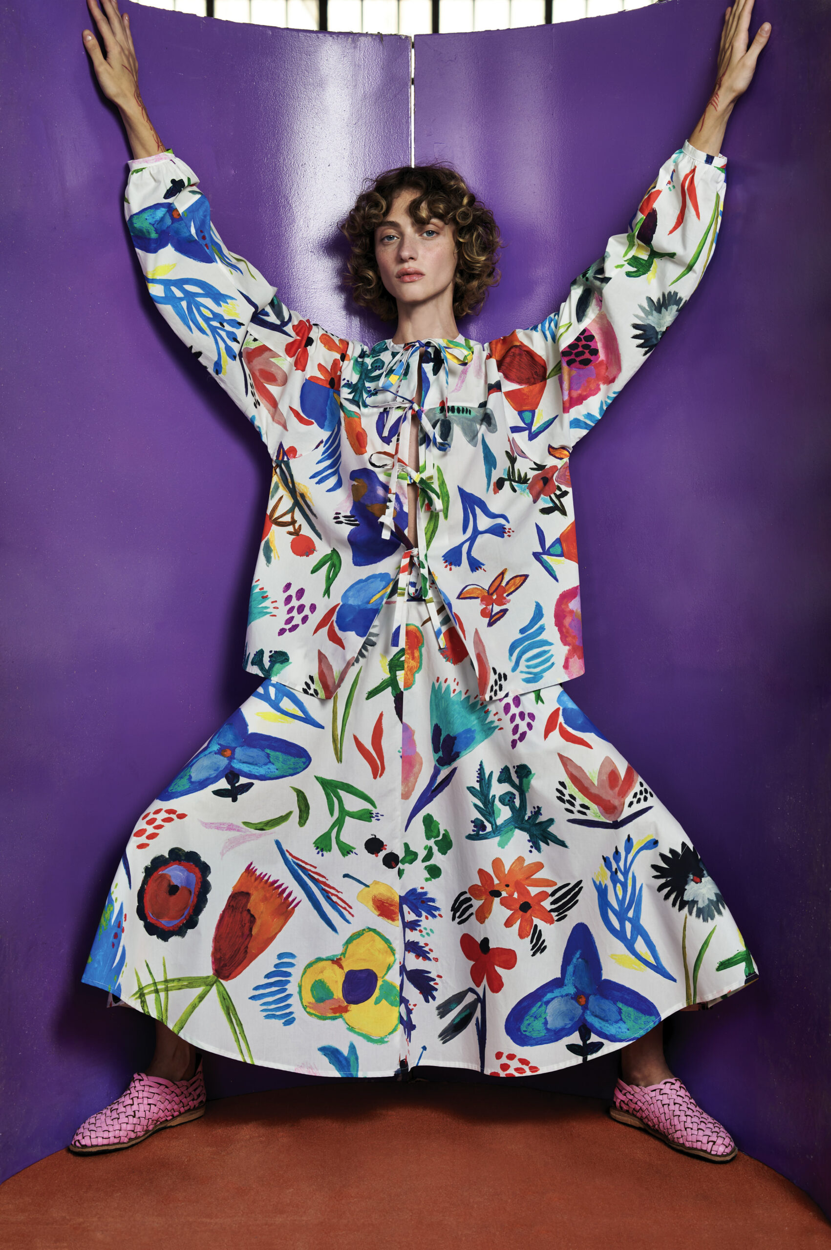 Ces expériences artisanales ont été magistralement transposées sur du coton popeline élégant et de la viscose crêpe fluide, donnant naissance à des motifs sophistiqués et chics. La collection, bien que modeste en taille, déborde d’énergie colorée et de pureté enfantine, alliant des imprimés naïfs et des expérimentations textiles à des éclats romantiques, des paillettes brillantes et des pièces utilitaires minimalistes.