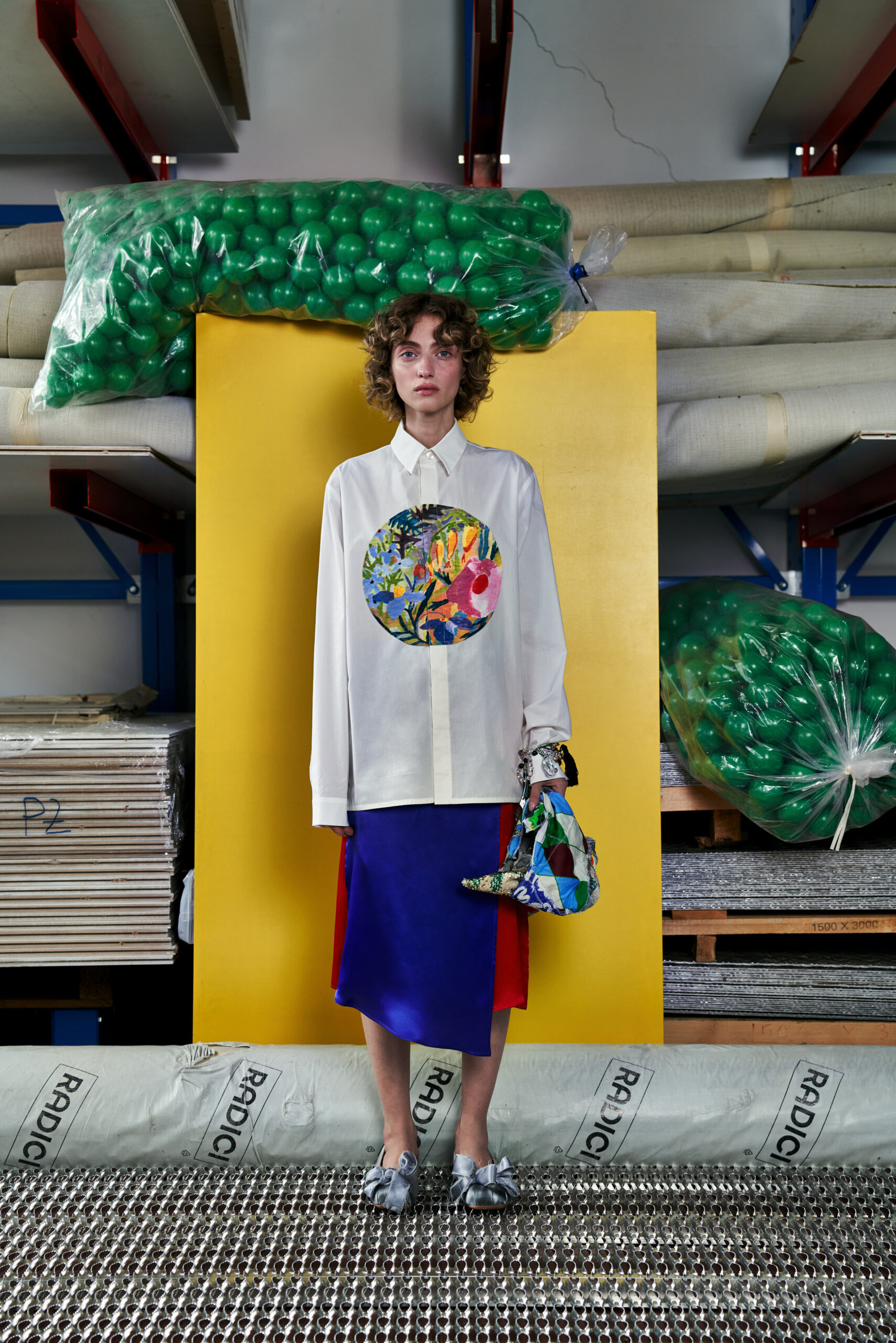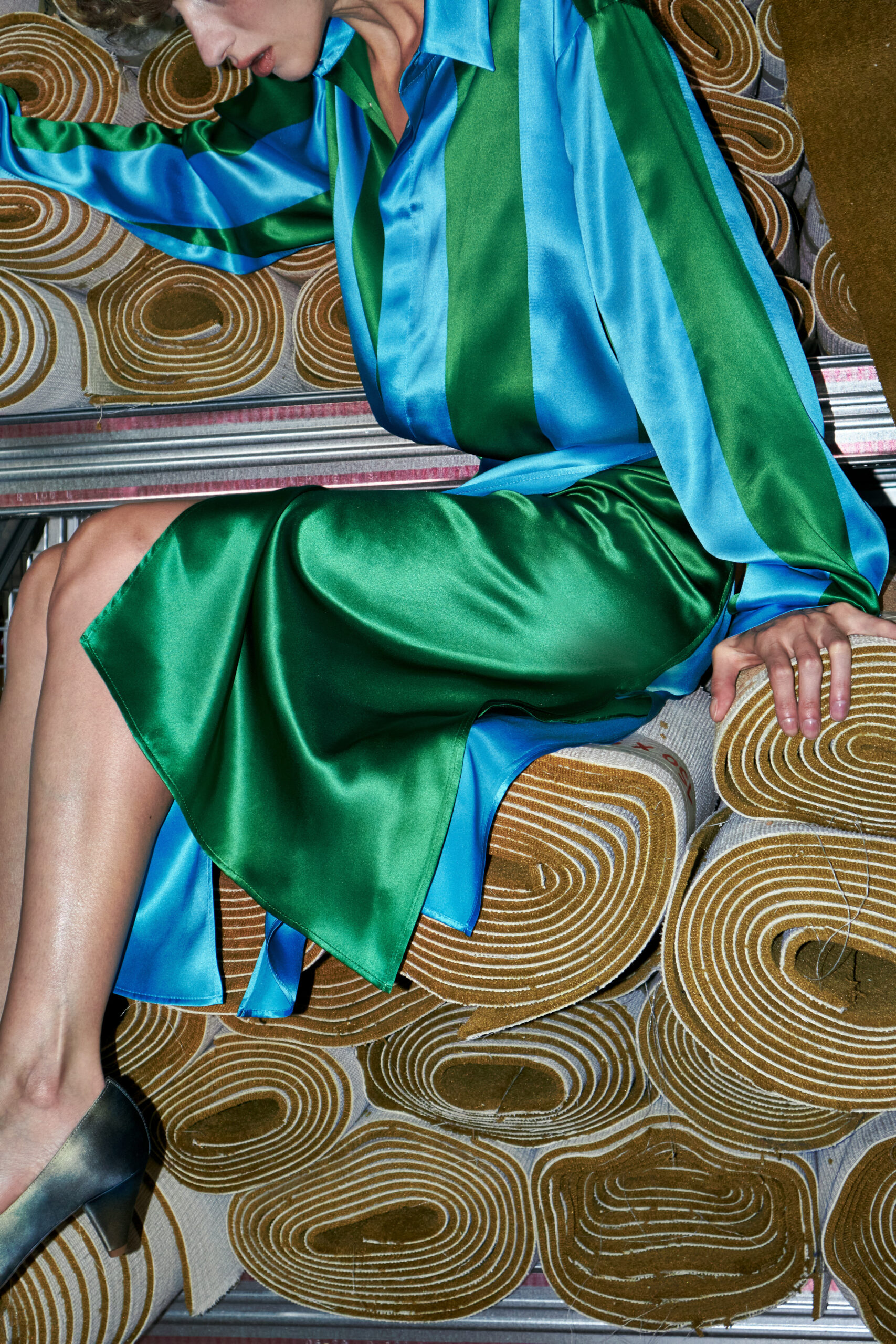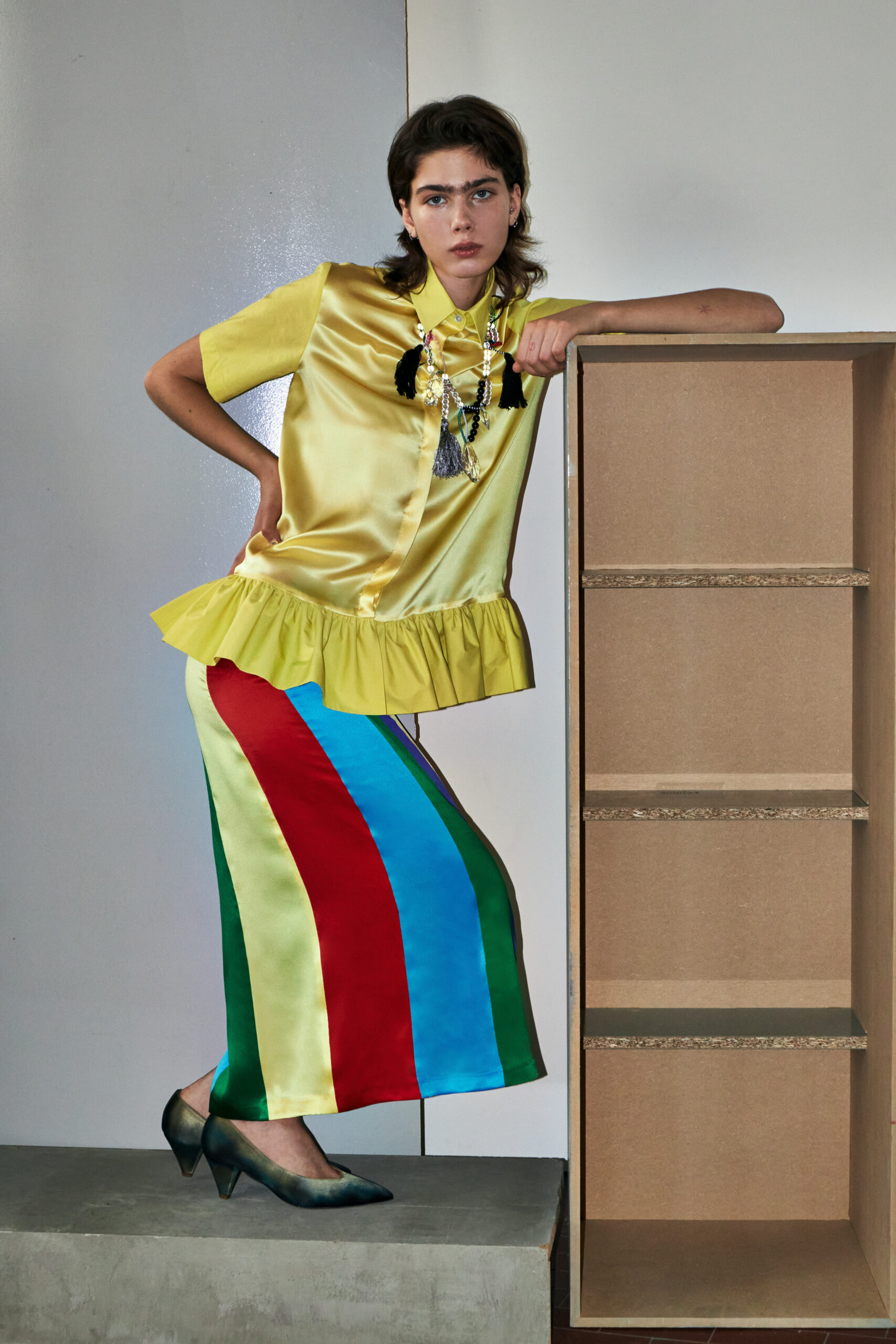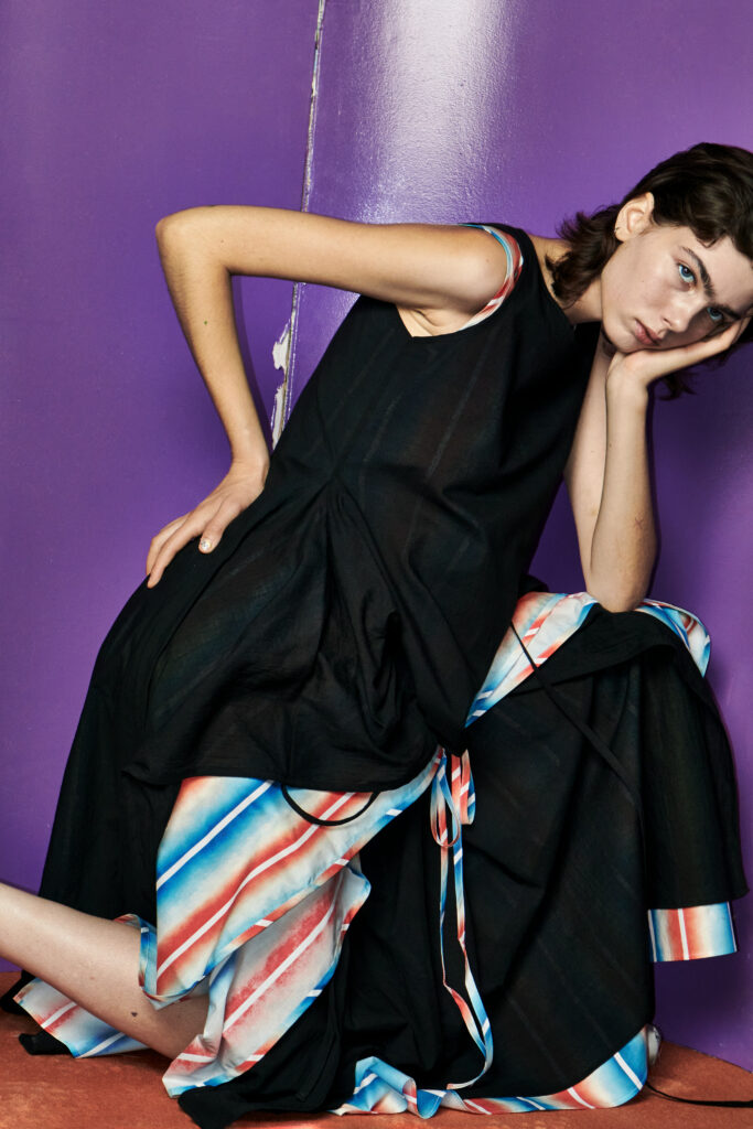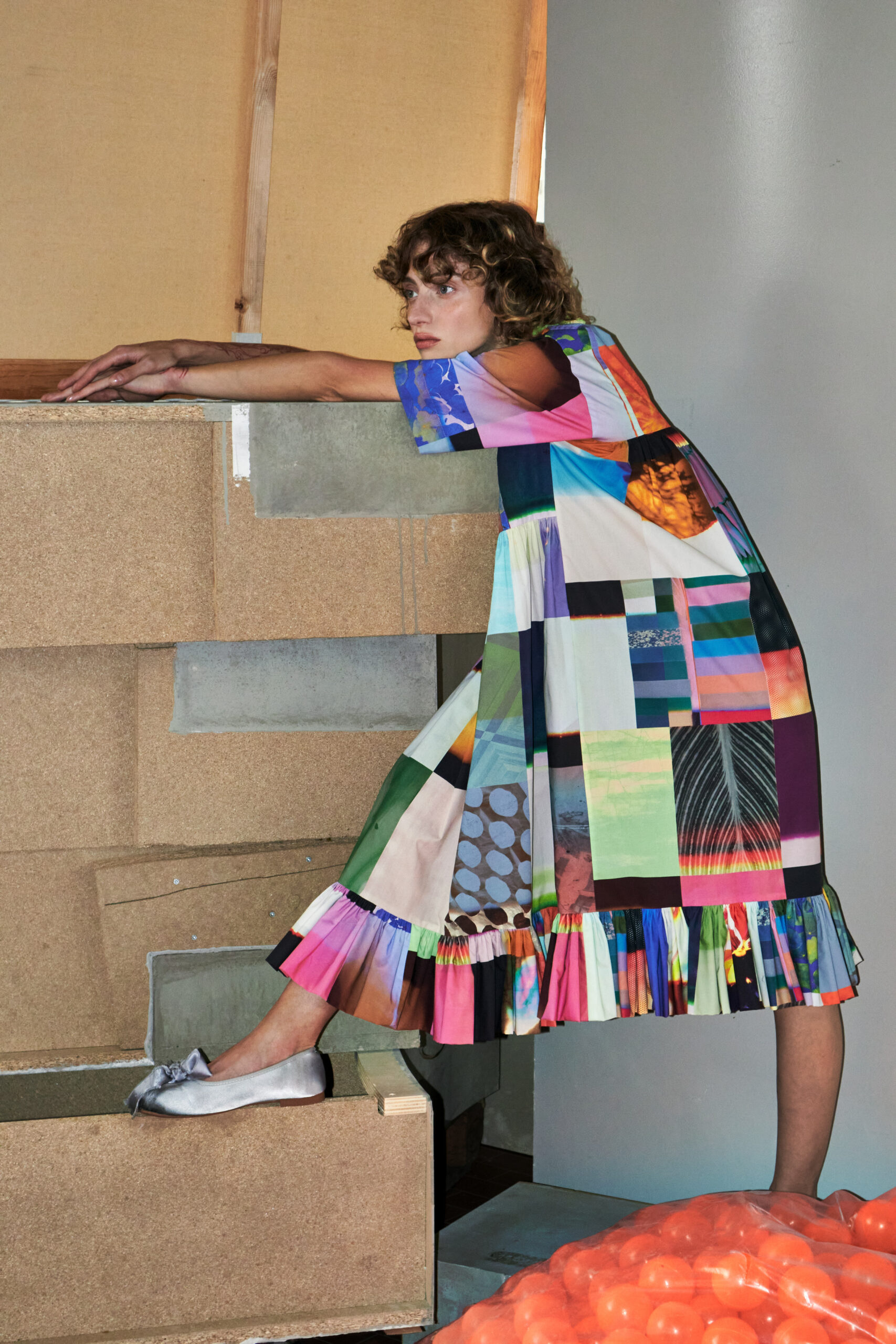 La collection est composée de robes d’été simples et de chemises, ainsi que de jupes aux coupes et volumes variés, certaines amples et aériennes, d’autres plus coquettes. Les matériaux incluent de la soie éclatante, du coton popeline imprimé, de la dentelle en broderie anglaise de coton et du jersey de viscose brillant. Fidèle à sa démarche écoresponsable, certains tissus sont des stocks restants de la marque, reteints et manipulés pour une nouvelle vie.