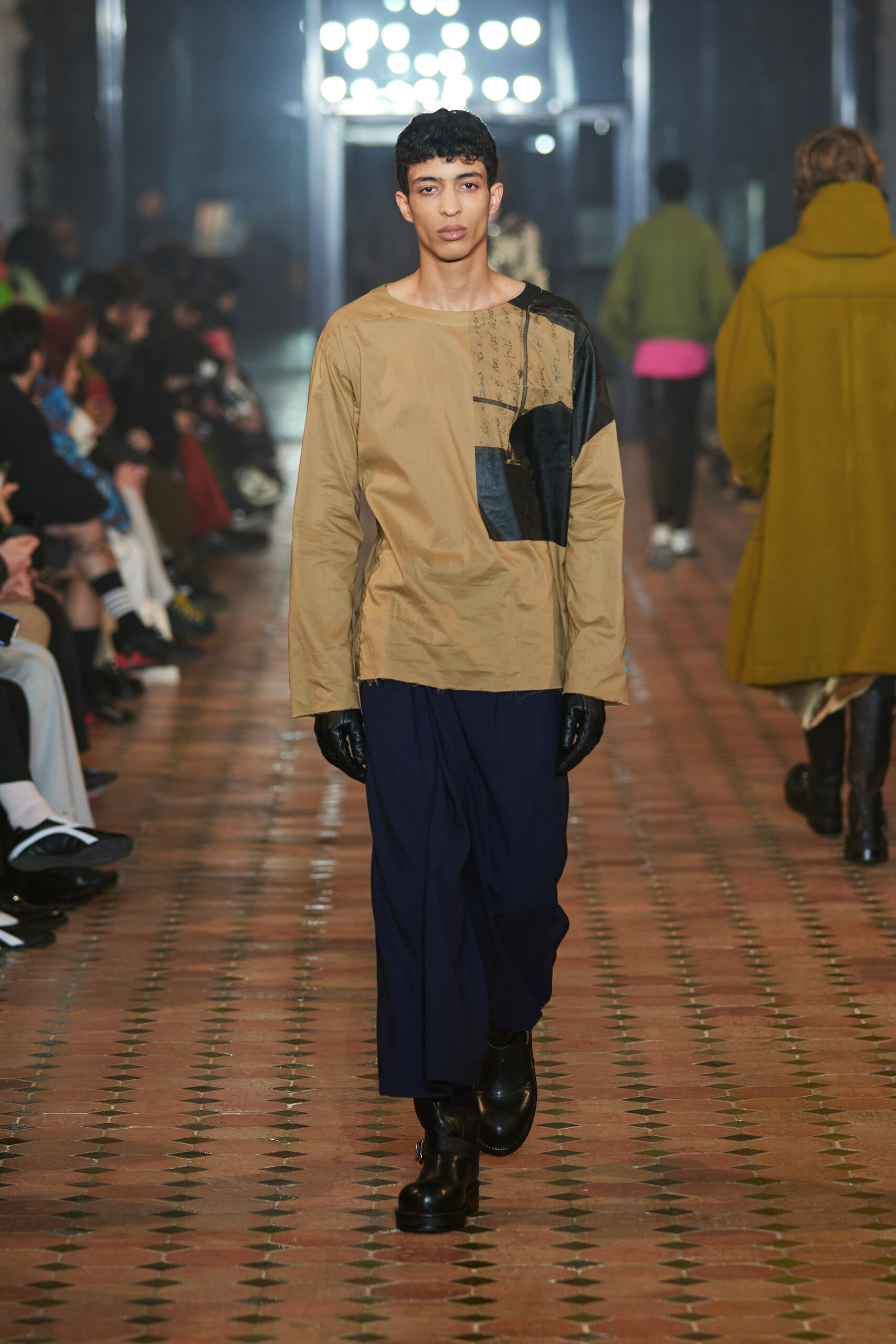 La collection s’ancre dans une introspection profonde où le designer confronte les archives, non pas comme un exercice de nostalgie, mais comme un processus de redécouverte et de réinterprétation des influences qui ont marqué son parcours. Ce voyage à travers le temps se traduit par une esthétique unique, où le passé rencontre le présent dans un dialogue parallèle, permettant à Yamagishi d’attacher métaphoriquement des « notes adhésives sur des étagères apparemment non reliées ».
