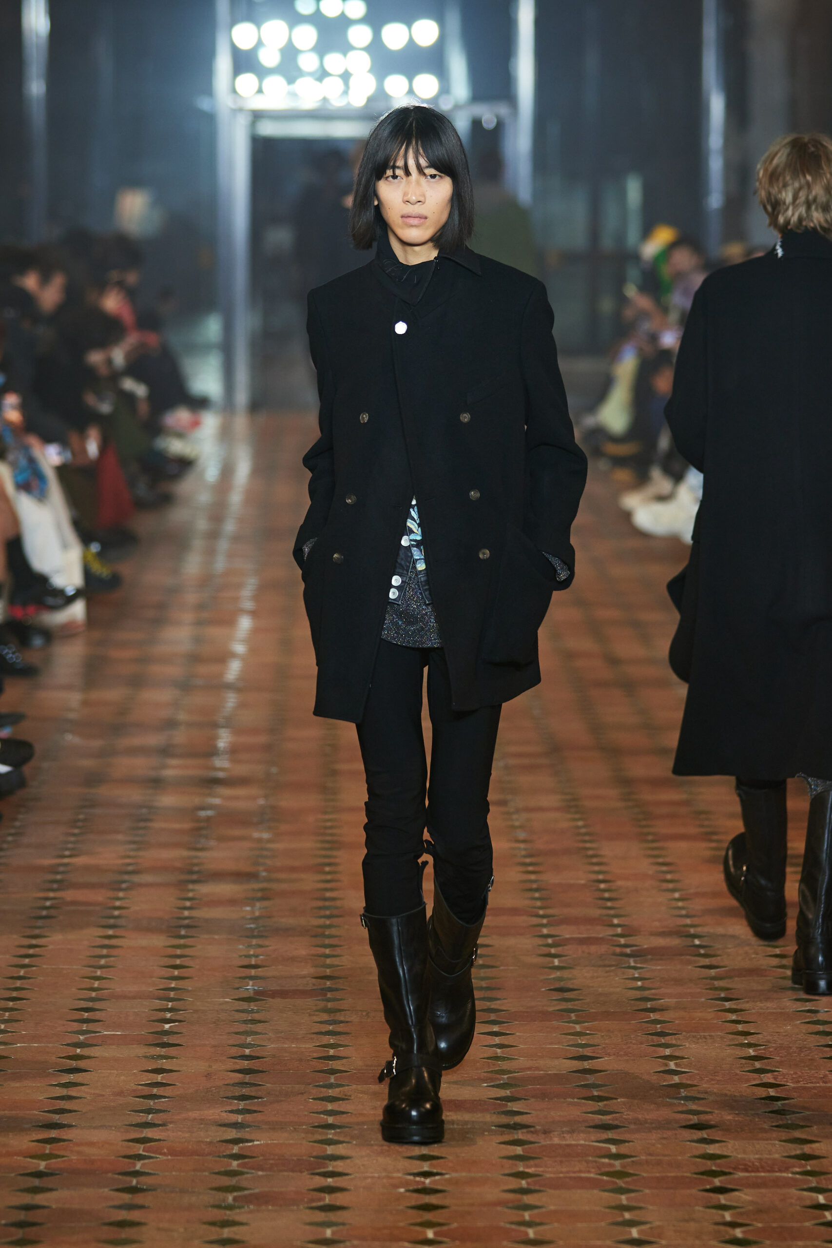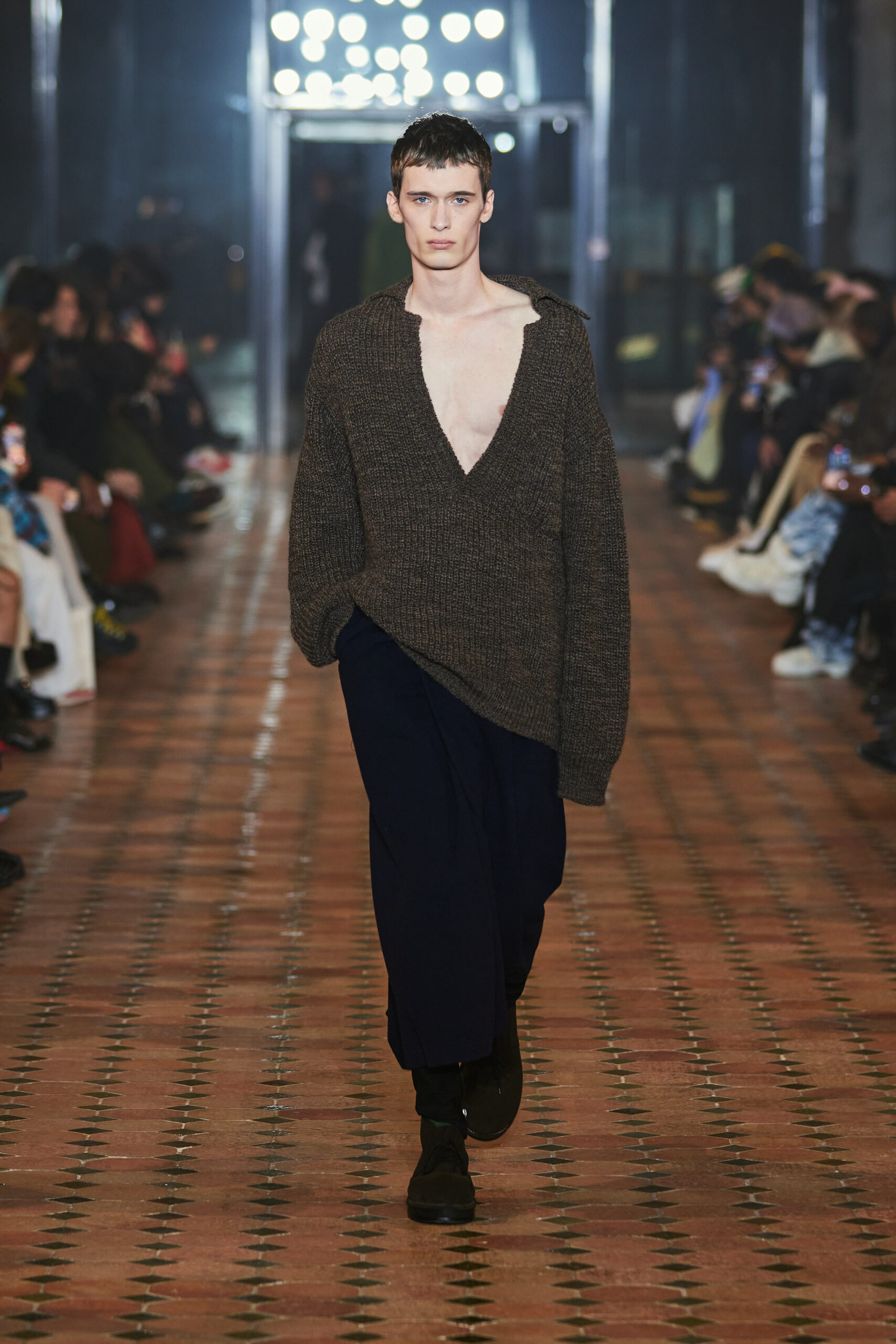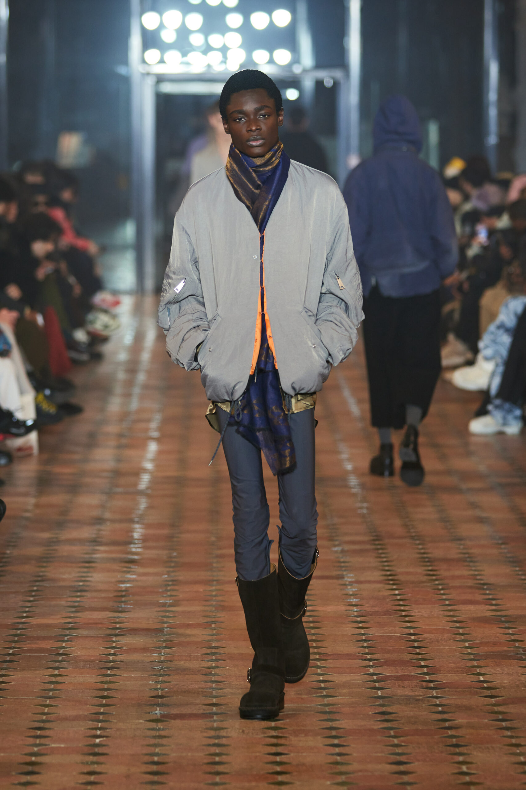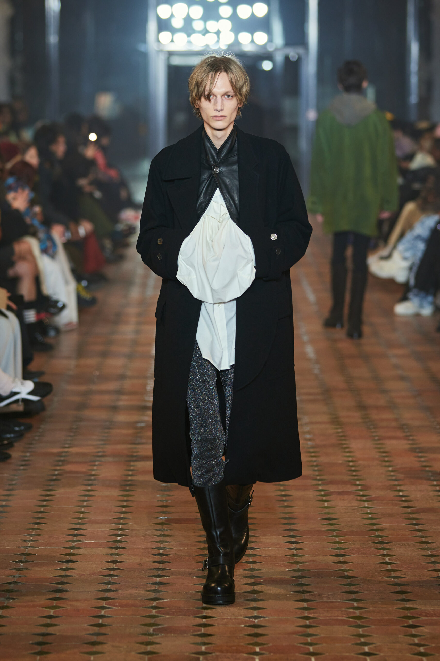 La collection s’ancre dans une introspection profonde où le designer confronte les archives, non pas comme un exercice de nostalgie, mais comme un processus de redécouverte et de réinterprétation des influences qui ont marqué son parcours. Ce voyage à travers le temps se traduit par une esthétique unique, où le passé rencontre le présent dans un dialogue parallèle, permettant à Yamagishi d’attacher métaphoriquement des « notes adhésives sur des étagères apparemment non reliées ».