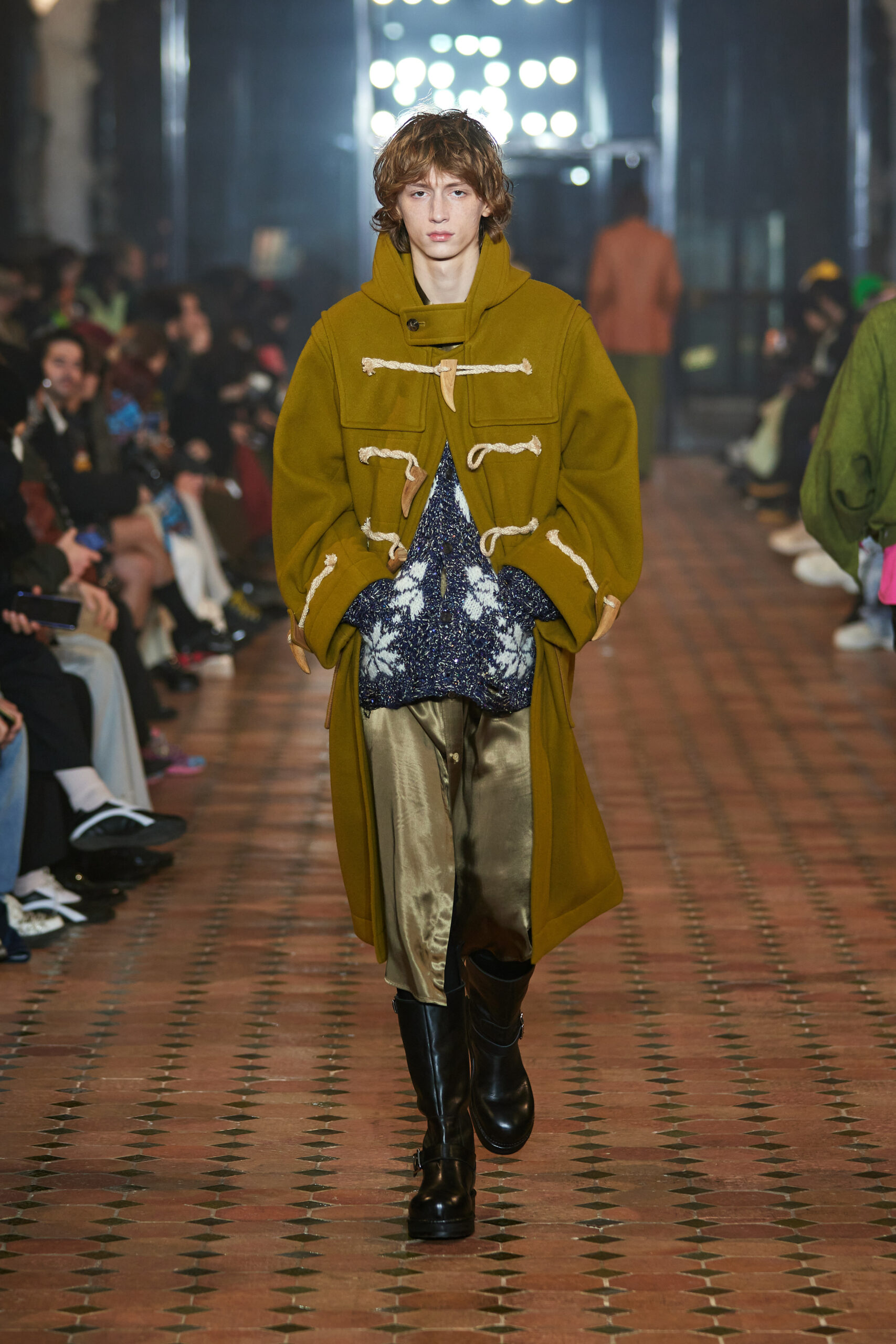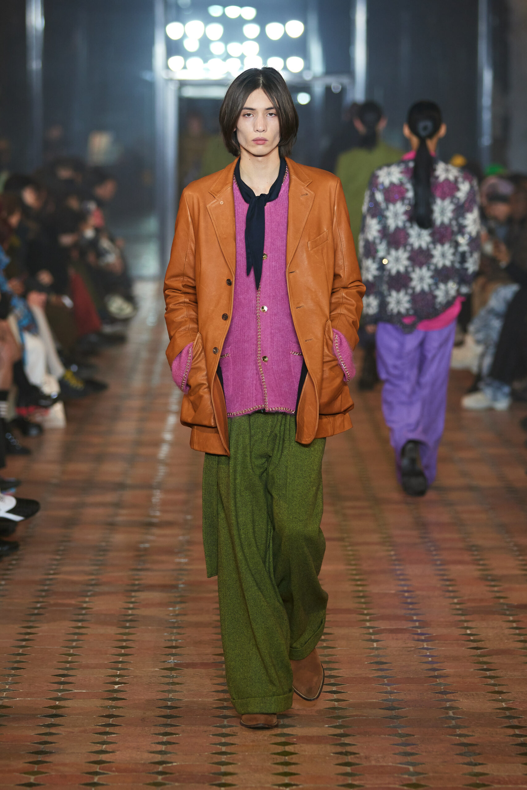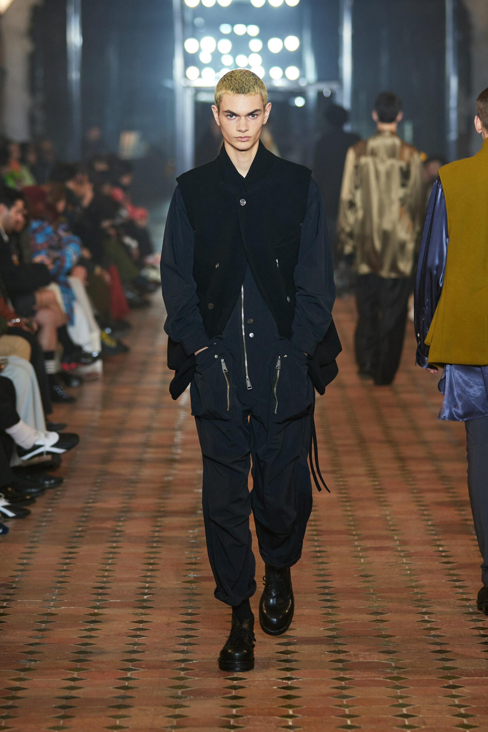 La collection s’ancre dans une introspection profonde où le designer confronte les archives, non pas comme un exercice de nostalgie, mais comme un processus de redécouverte et de réinterprétation des influences qui ont marqué son parcours. Ce voyage à travers le temps se traduit par une esthétique unique, où le passé rencontre le présent dans un dialogue parallèle, permettant à Yamagishi d’attacher métaphoriquement des « notes adhésives sur des étagères apparemment non reliées ».