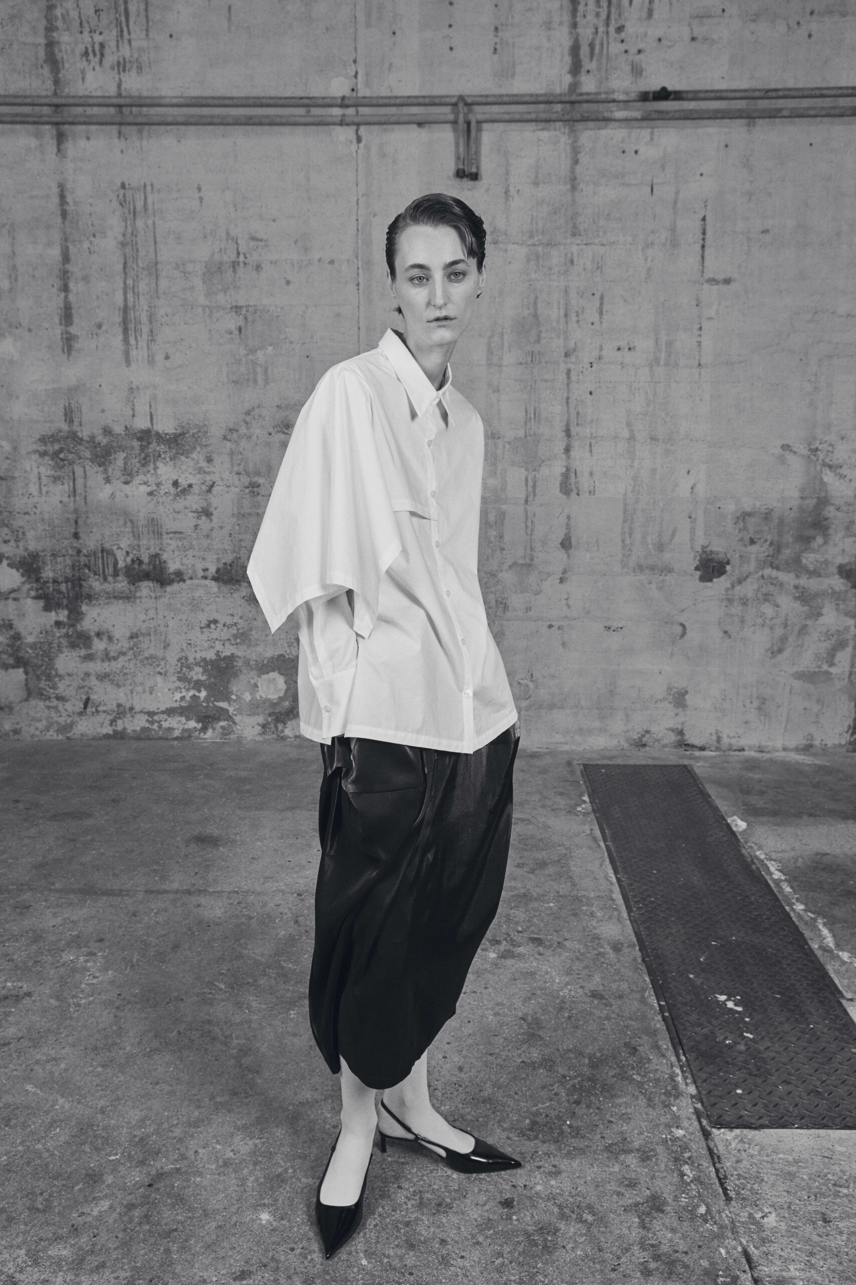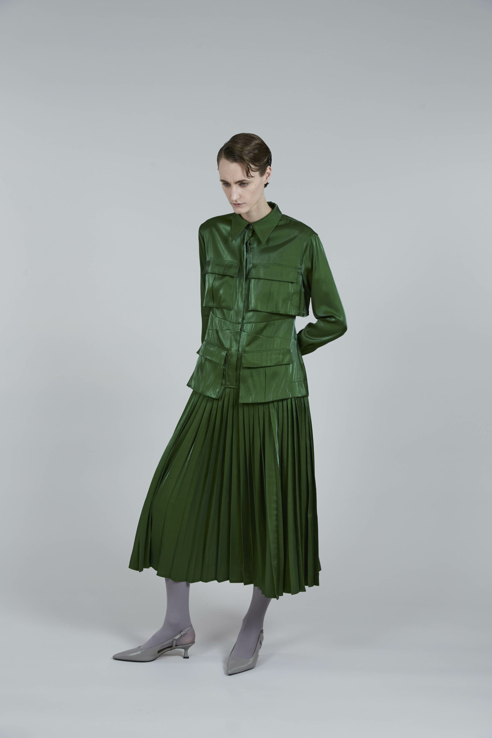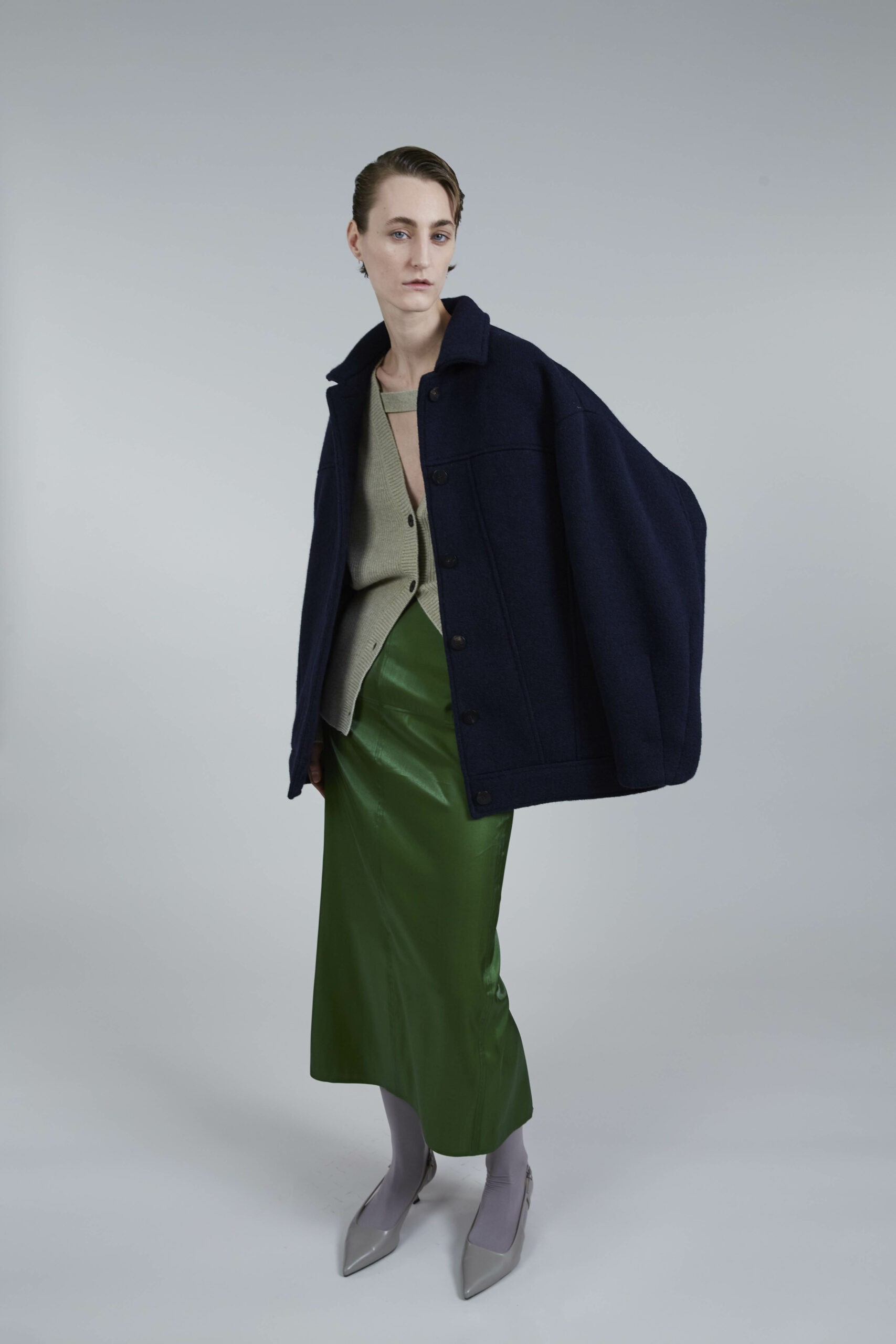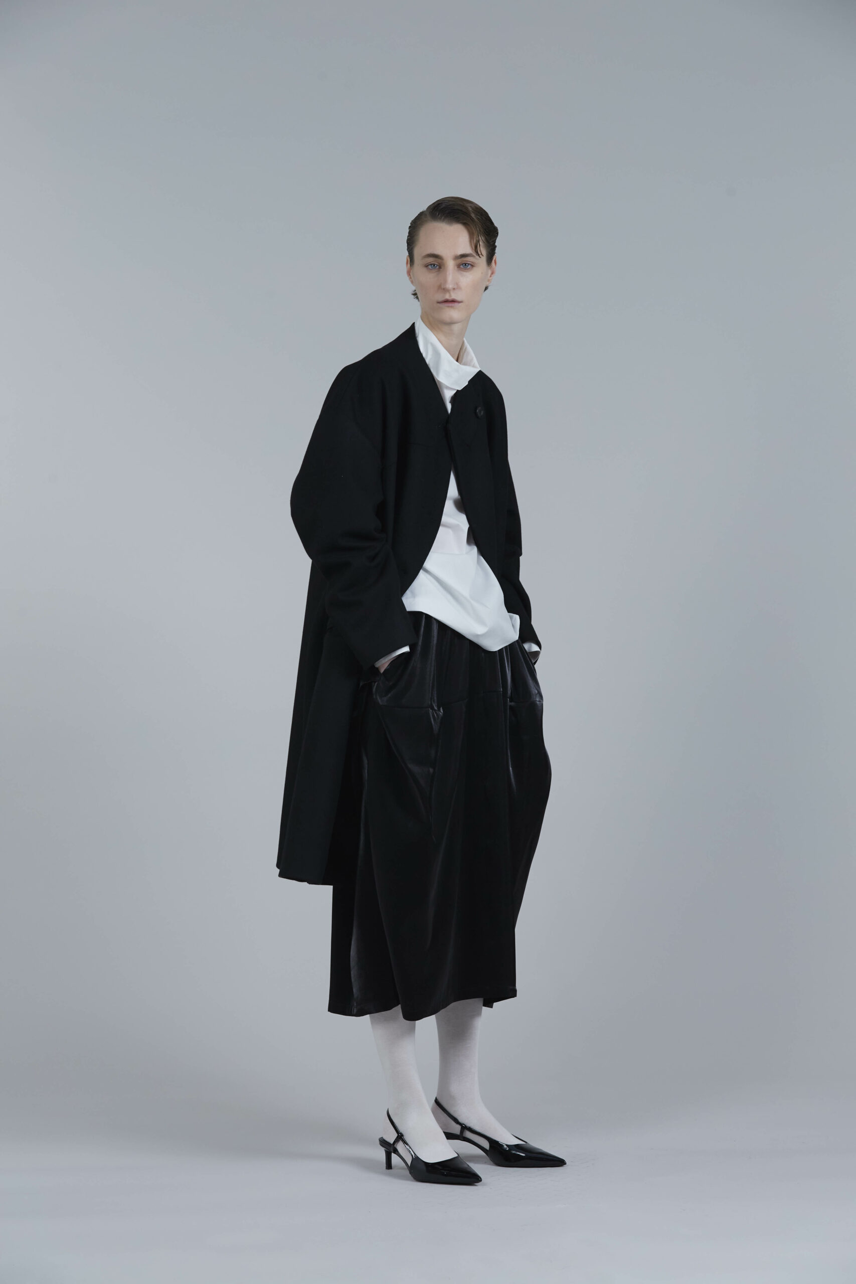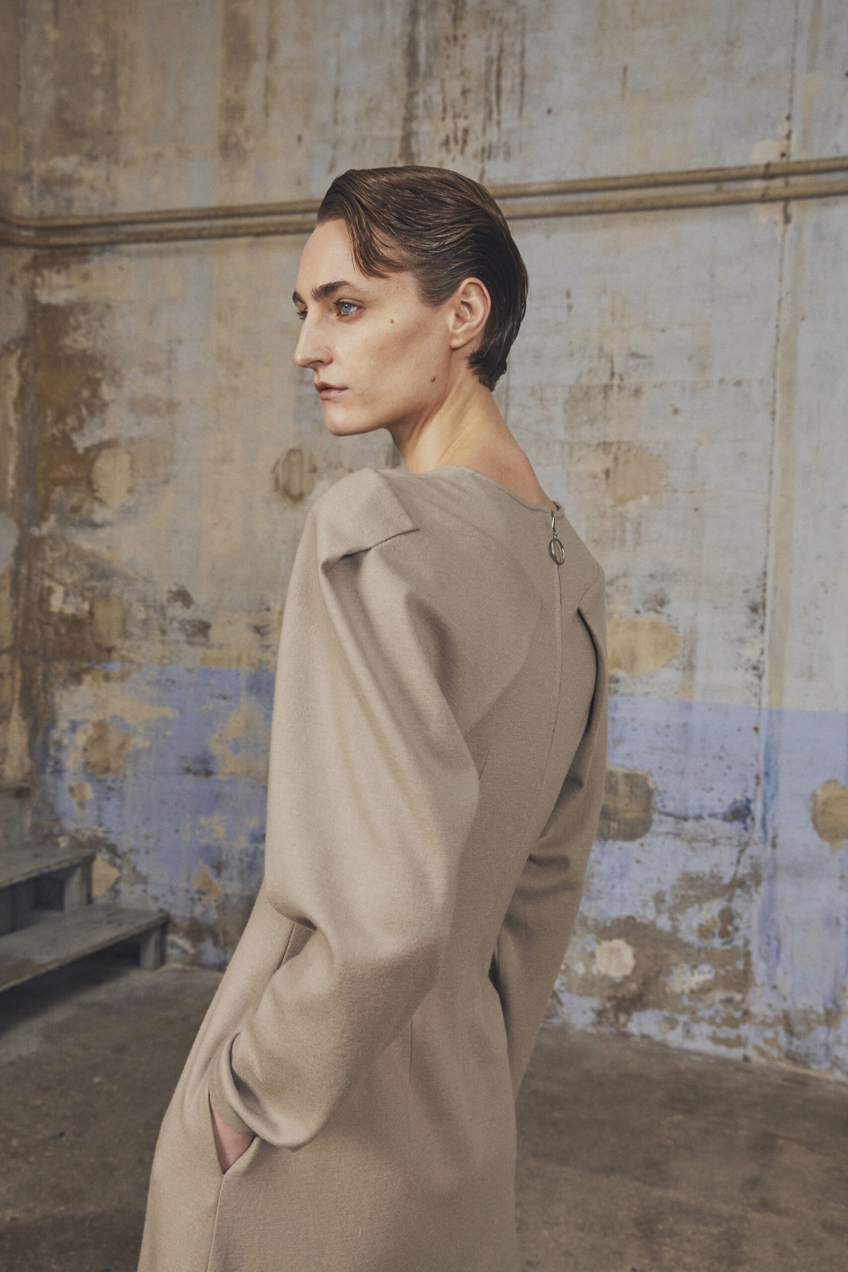 Les pièces maîtresses de la collection, telles que les robes près du corps avec des manches origami et les jupes portefeuille, fuselées ou plissées, rappellent l’élégance des années 50. Ces créations mettent en valeur la silhouette féminine tout en offrant un regard neuf sur la mode d’antan. Les manteaux et vestes, inspirés de la couture française du siècle dernier, se démarquent par leur élégance intemporelle et leur finesse de conception.