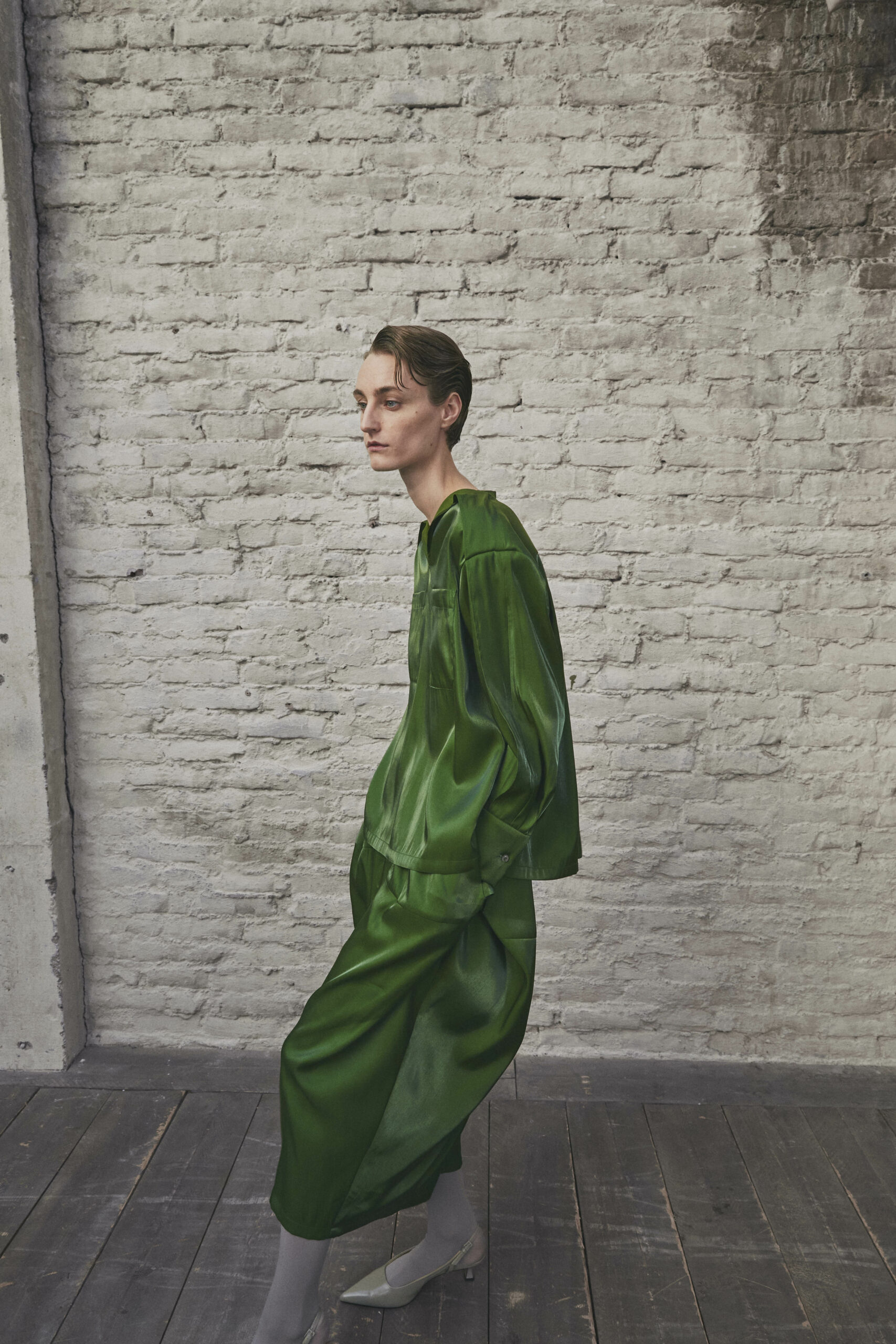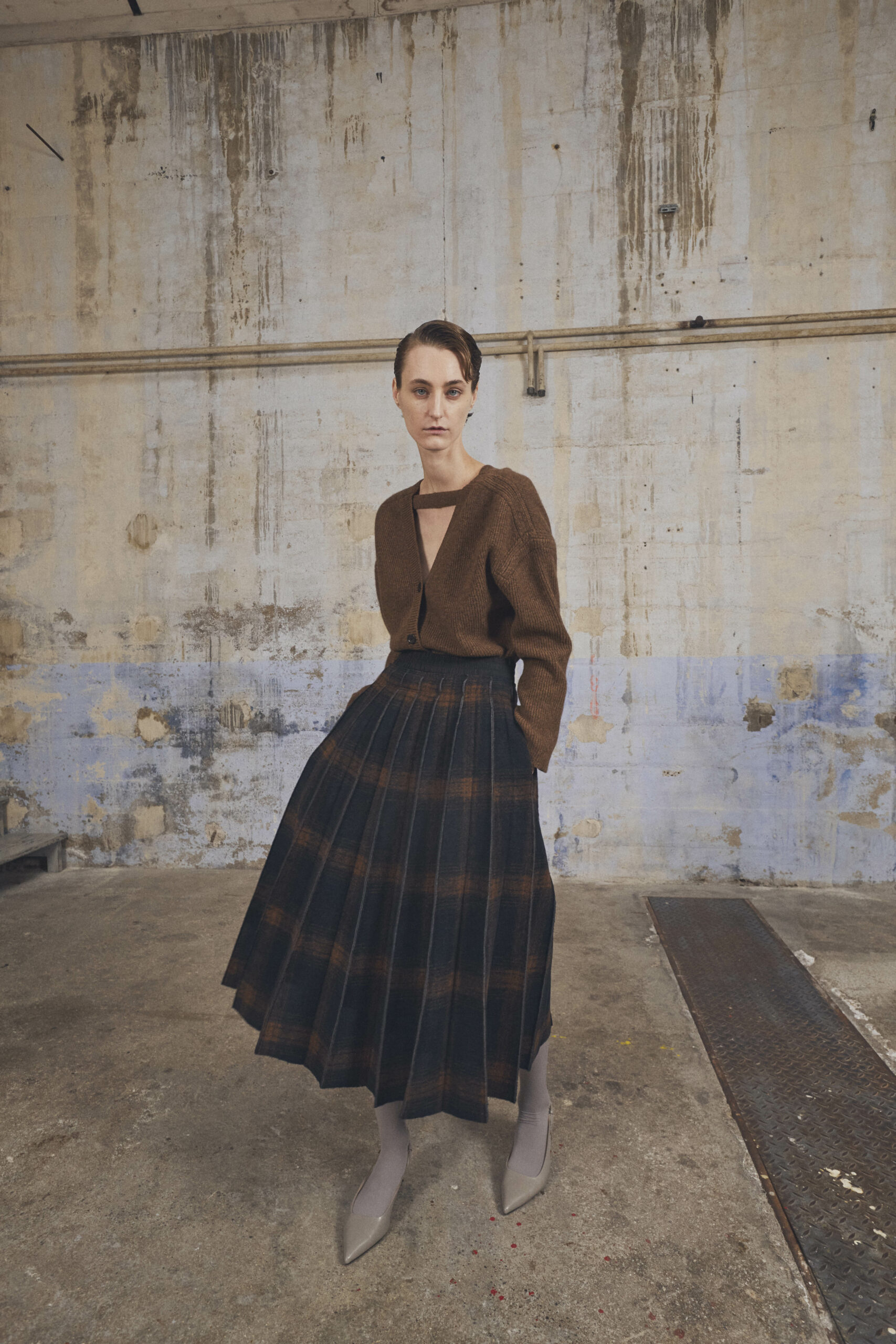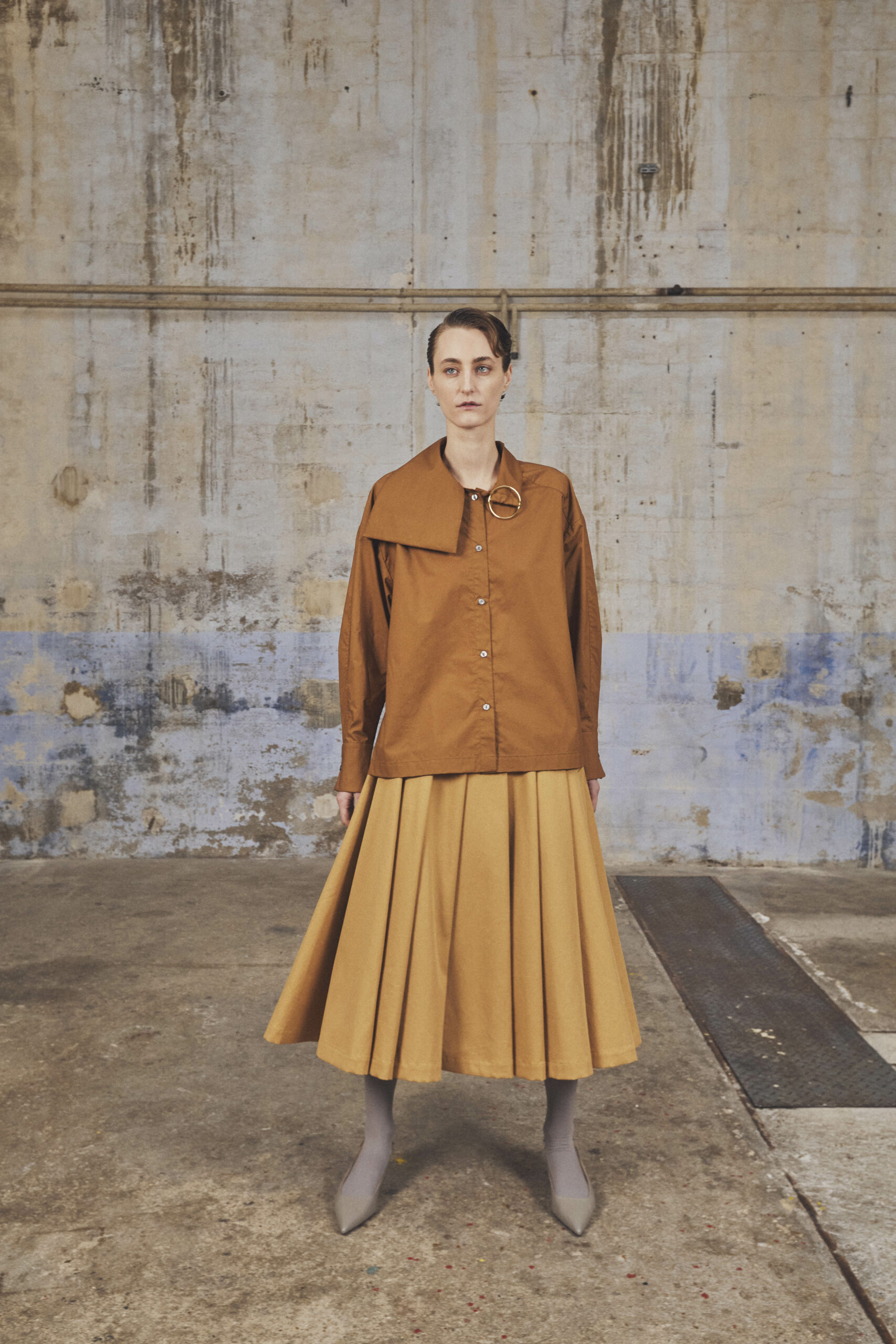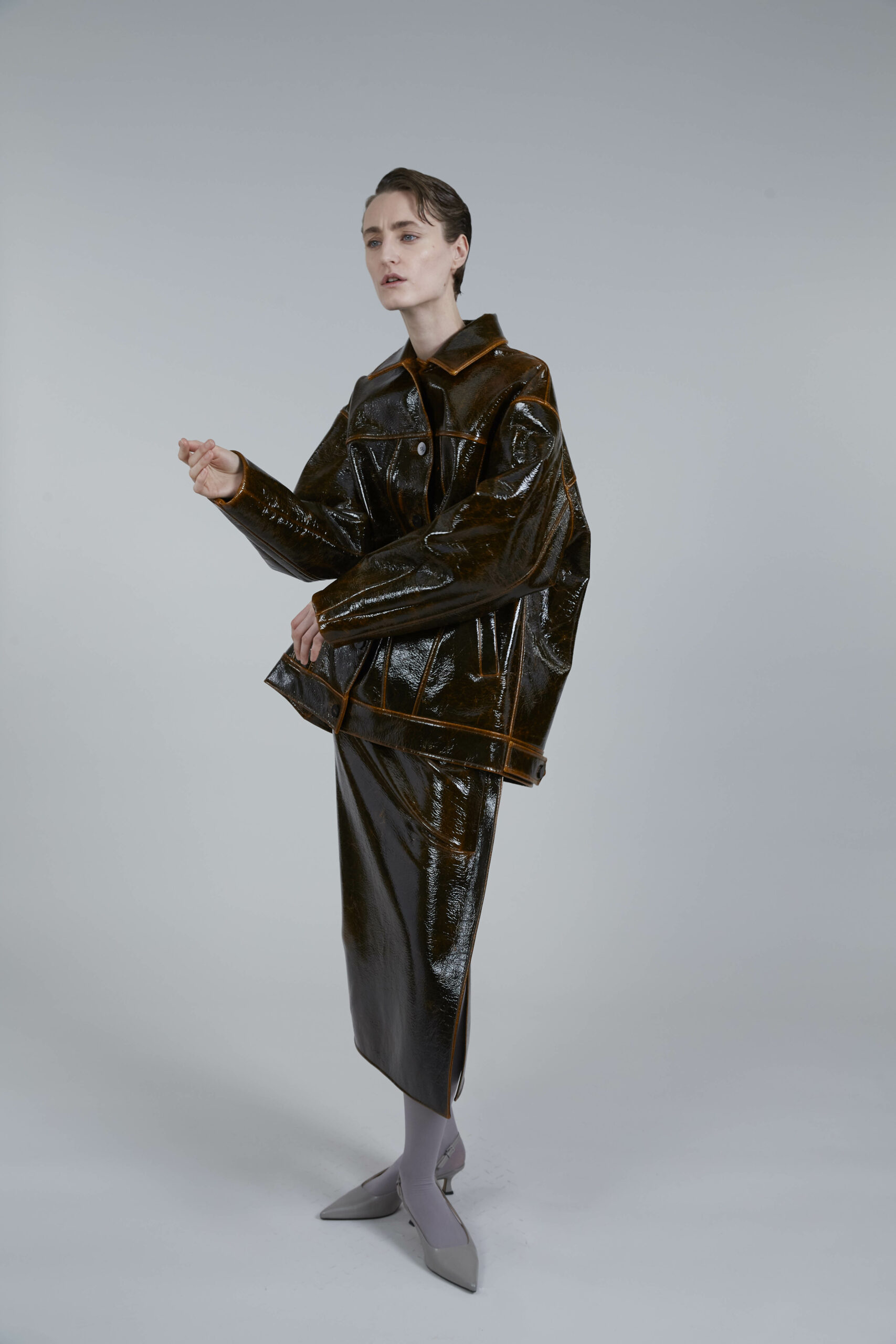 Les pièces maîtresses de la collection, telles que les robes près du corps avec des manches origami et les jupes portefeuille, fuselées ou plissées, rappellent l’élégance des années 50. Ces créations mettent en valeur la silhouette féminine tout en offrant un regard neuf sur la mode d’antan. Les manteaux et vestes, inspirés de la couture française du siècle dernier, se démarquent par leur élégance intemporelle et leur finesse de conception.