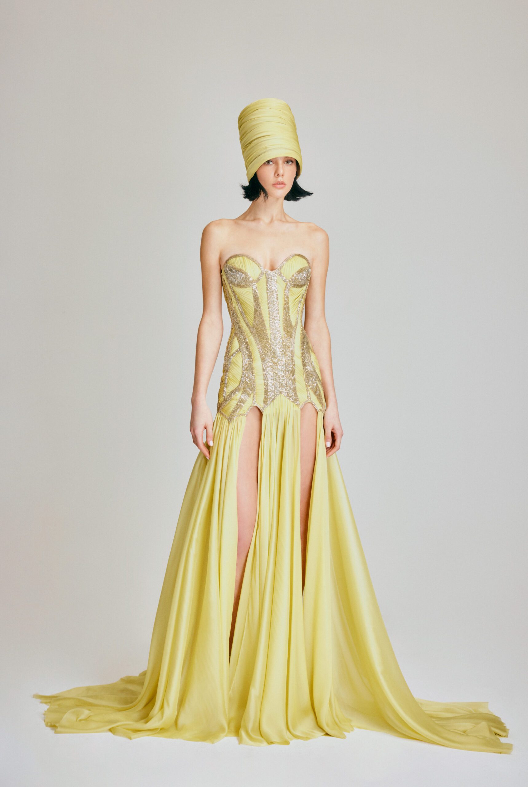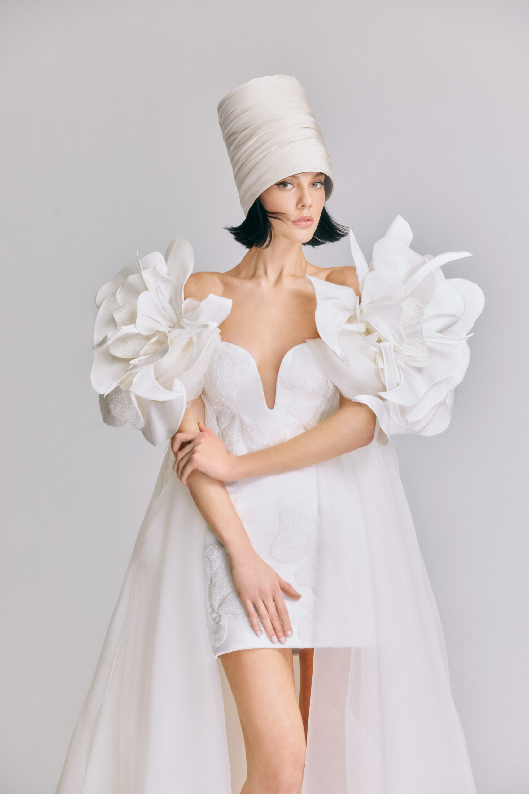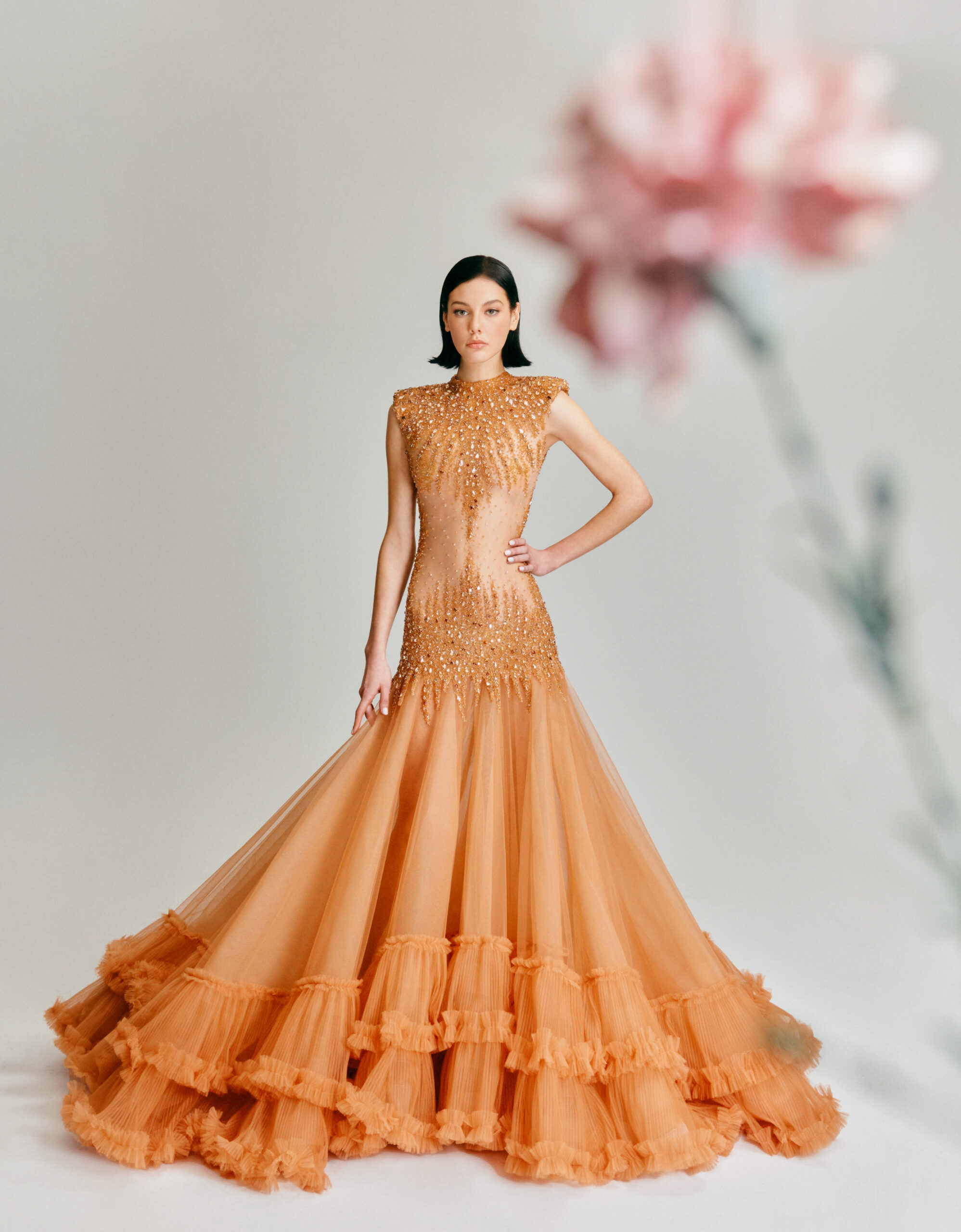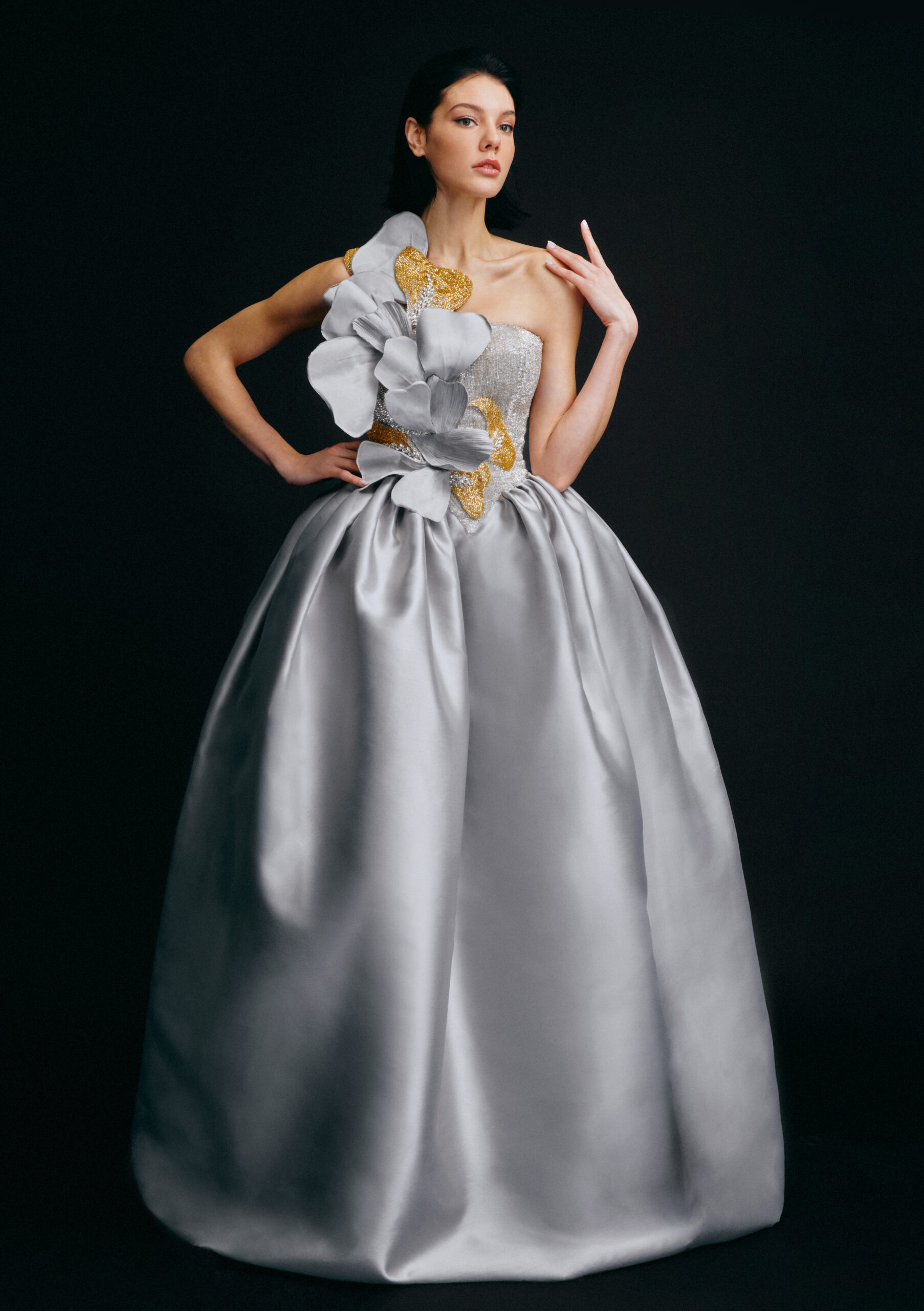 Imaginez-vous enveloppé dans le doux parfum des fleurs d’œillet, se faufilant à travers l’air, vous guidant vers l’essence même de l’artisanat ottoman. C’est dans cet univers que Dilek Hanif déploie son talent, invitant les spectateurs à découvrir un trésor de beauté. Sa collection, un havre magique où des robes de grand volume et des techniques de perlage stupéfiantes attendent d’être découvertes, brille d’une opulence comparable aux étoiles dans un ciel nocturne.