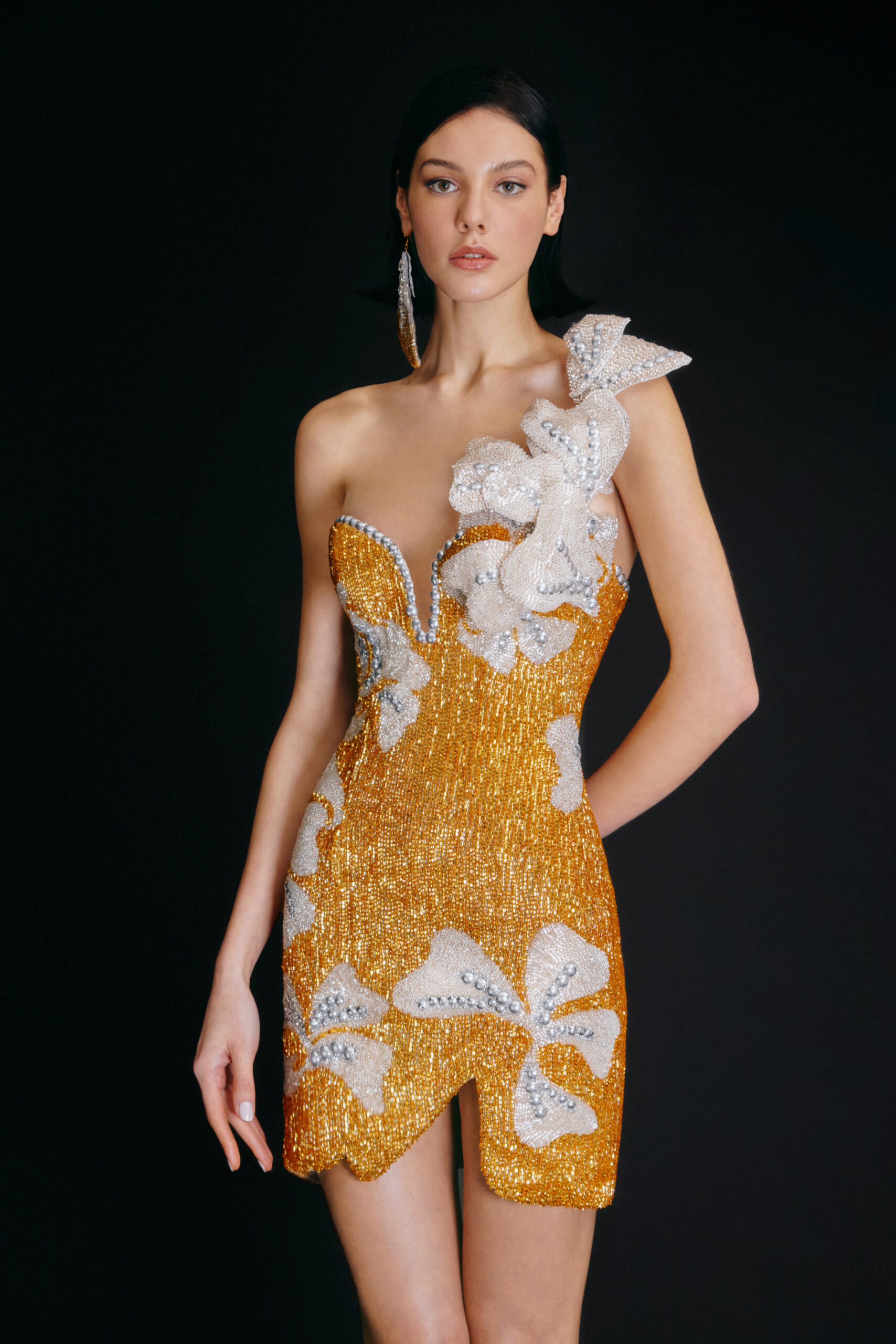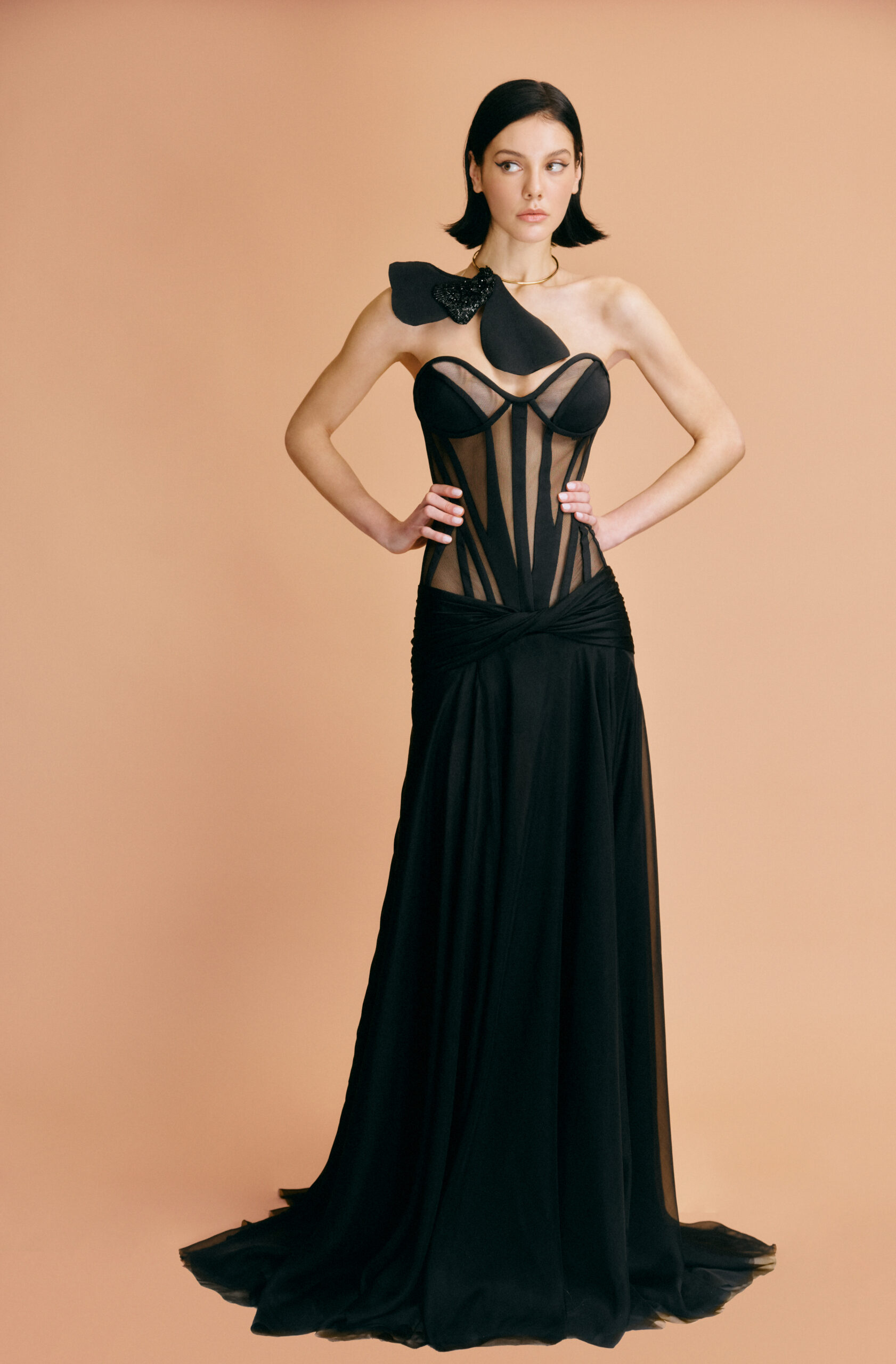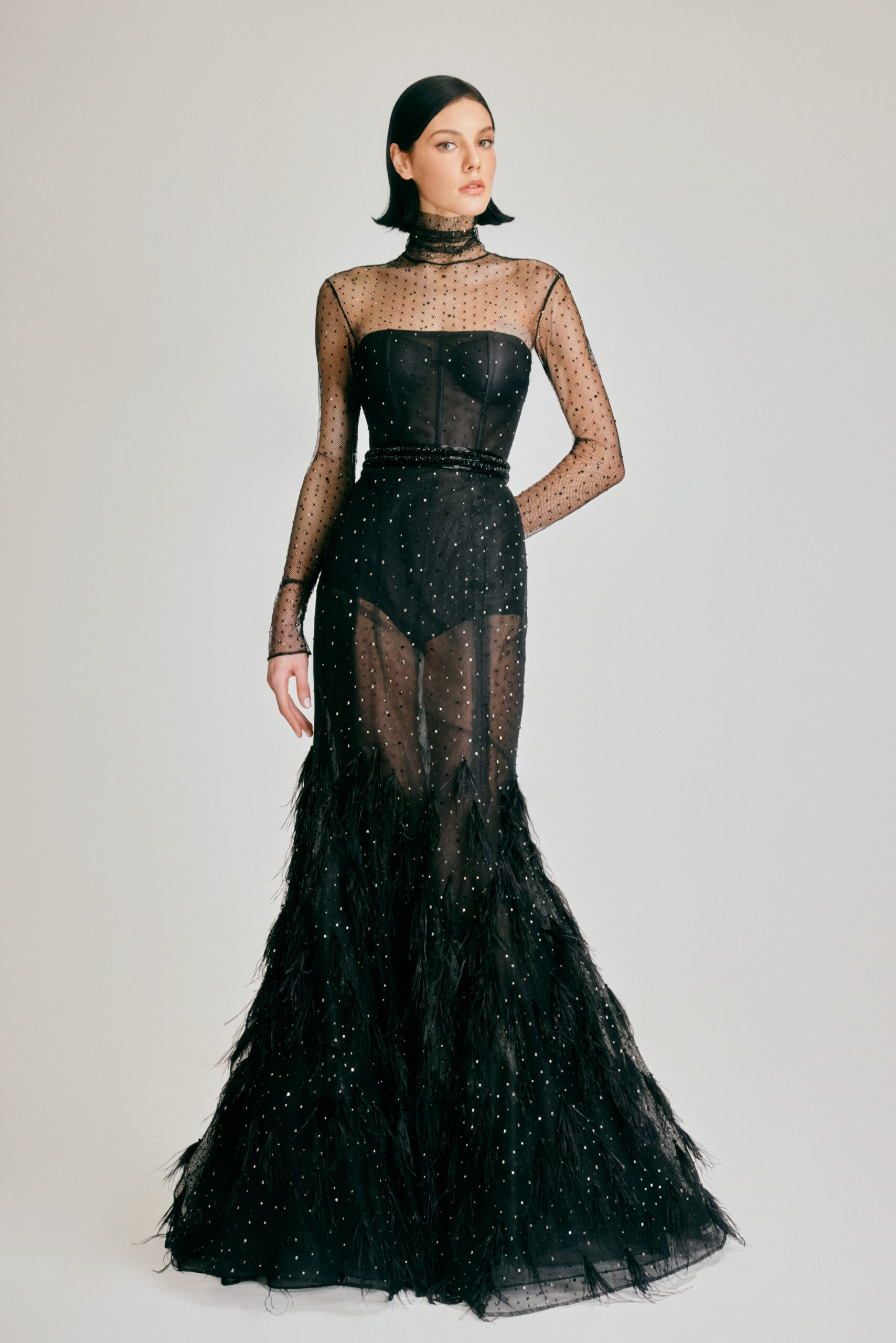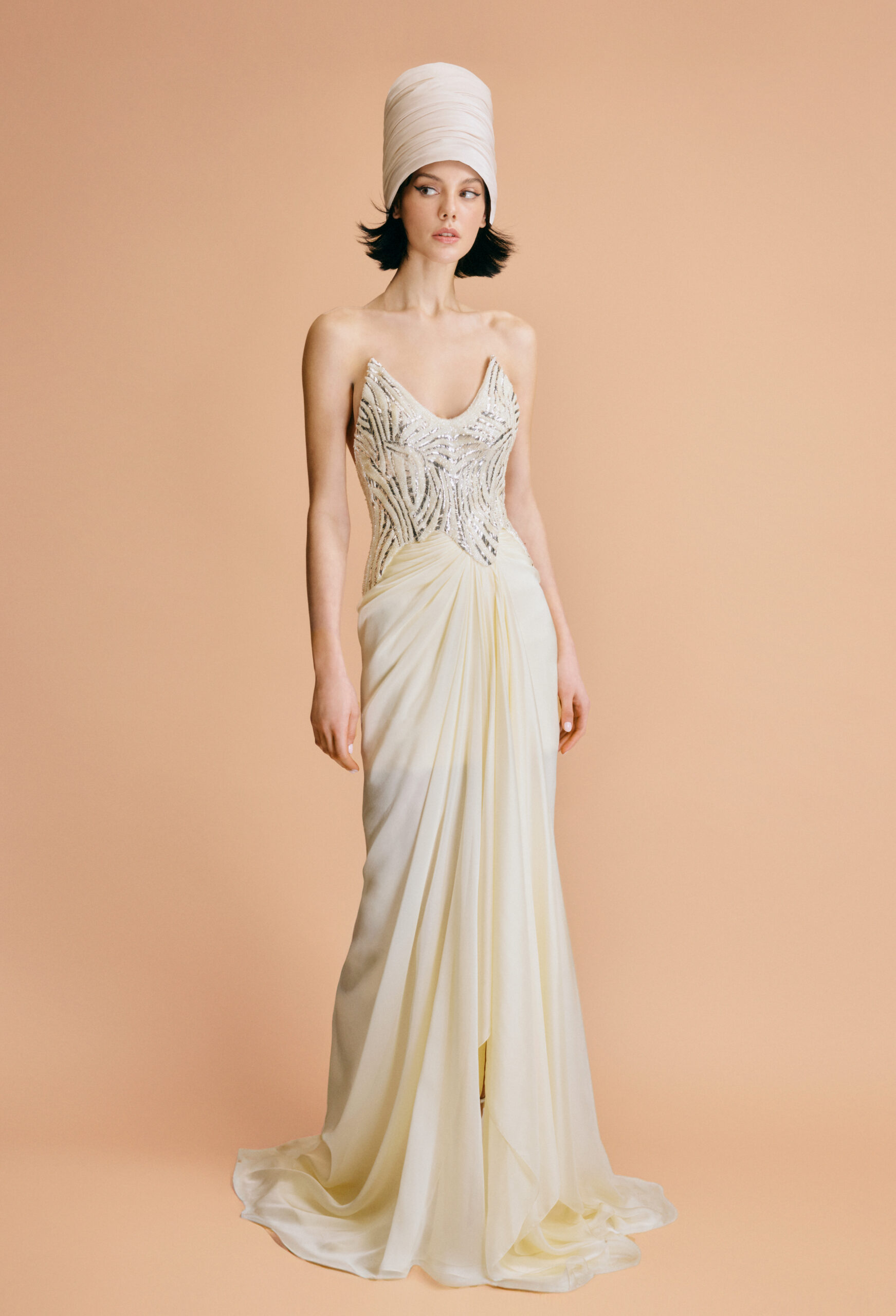 Imaginez-vous enveloppé dans le doux parfum des fleurs d’œillet, se faufilant à travers l’air, vous guidant vers l’essence même de l’artisanat ottoman. C’est dans cet univers que Dilek Hanif déploie son talent, invitant les spectateurs à découvrir un trésor de beauté. Sa collection, un havre magique où des robes de grand volume et des techniques de perlage stupéfiantes attendent d’être découvertes, brille d’une opulence comparable aux étoiles dans un ciel nocturne.