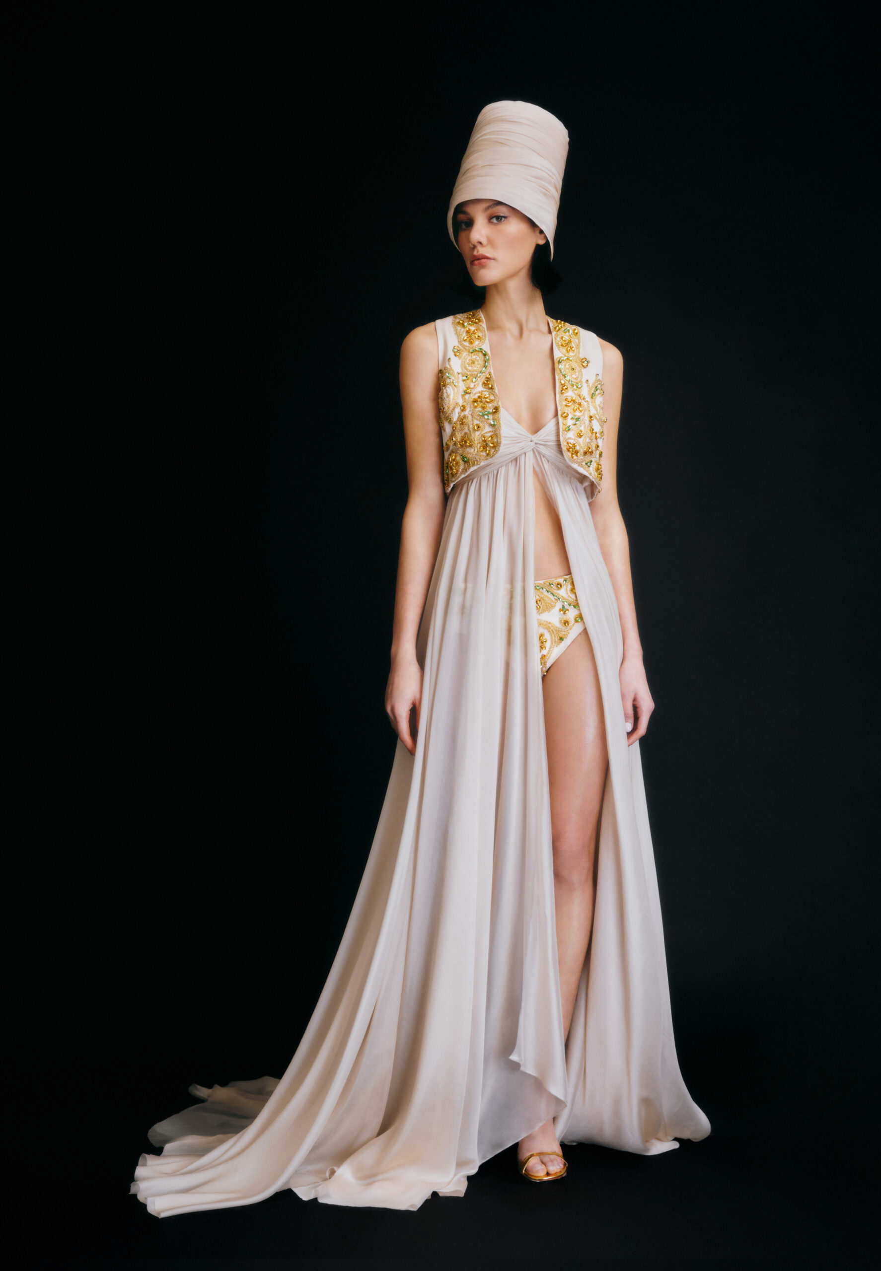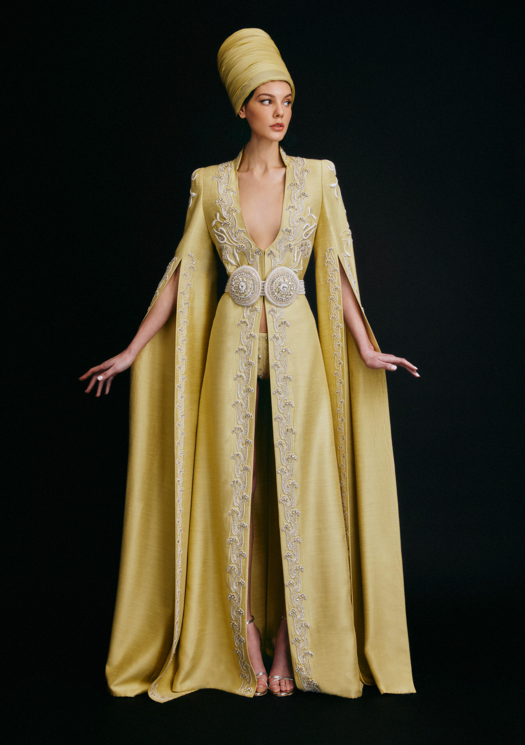 La collection se démarque par son élégance et son allure, reflétant la nostalgie ottomane comme une histoire d’amour intemporelle. Avec le déploiement des motifs de ses caftans signature, Dilek Hanif présente deux designs distincts qui dansent avec grâce, incarnant une nouvelle séduction. En traversant ce jardin enchanté, les visiteurs sont immergés dans l’arôme enivrant de différentes broderies traditionnelles turques et ottomanes, chaque parfum ajoutant une note à cette symphonie de romance.