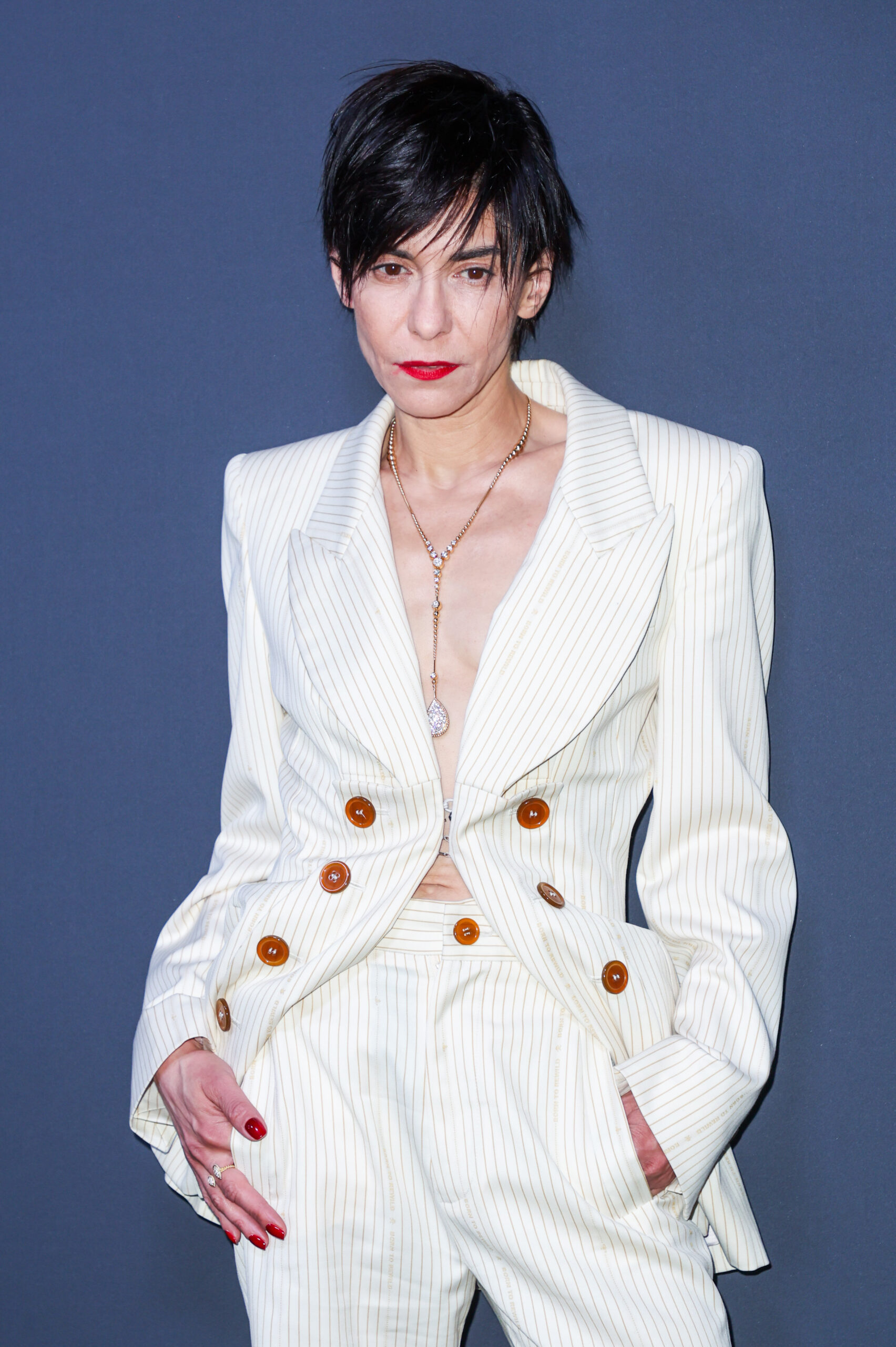 Lubna Azabal a choisi le collier long Serpent Bohème et la bague Serpent Bohème double motifs, toutes deux en or jaune, reflétant la fusion du luxe classique et du design contemporain.