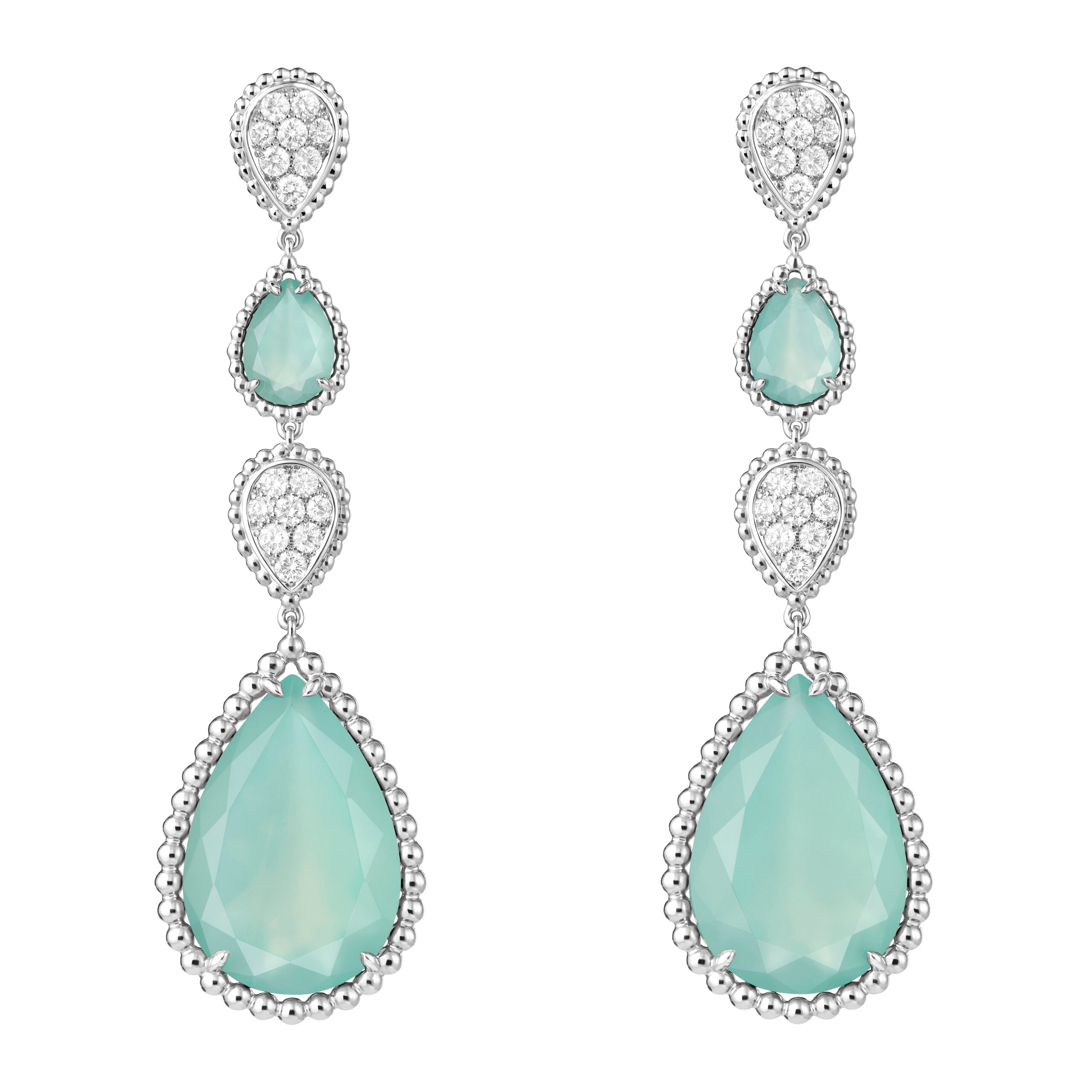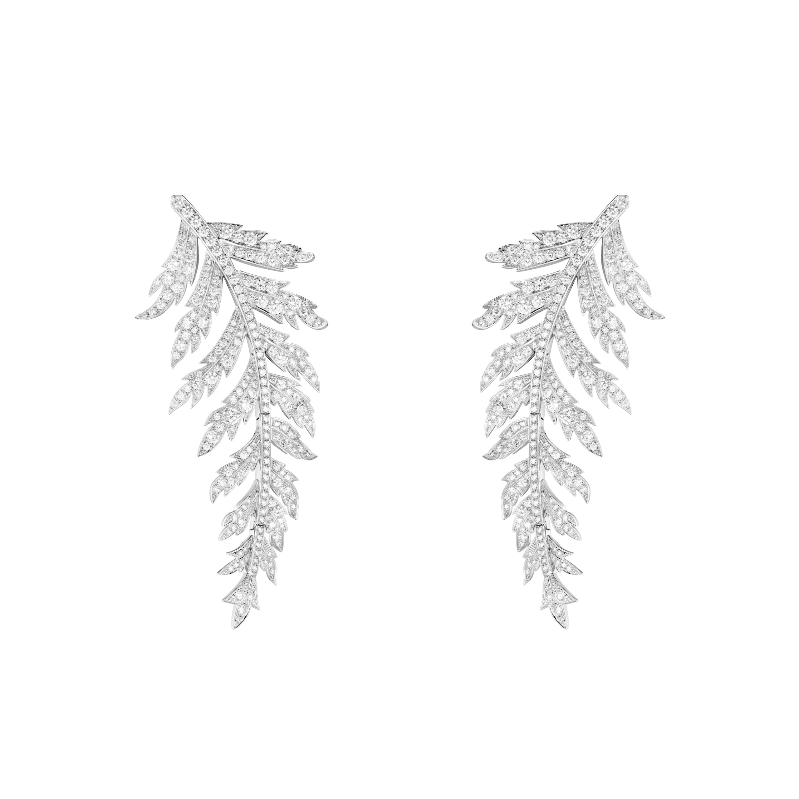 Rebecca Dayan a choisi les puces d’oreilles Plume de Paon et la bague Plume de Paon, démontrant la sophistication et la beauté intemporelle des créations Boucheron.