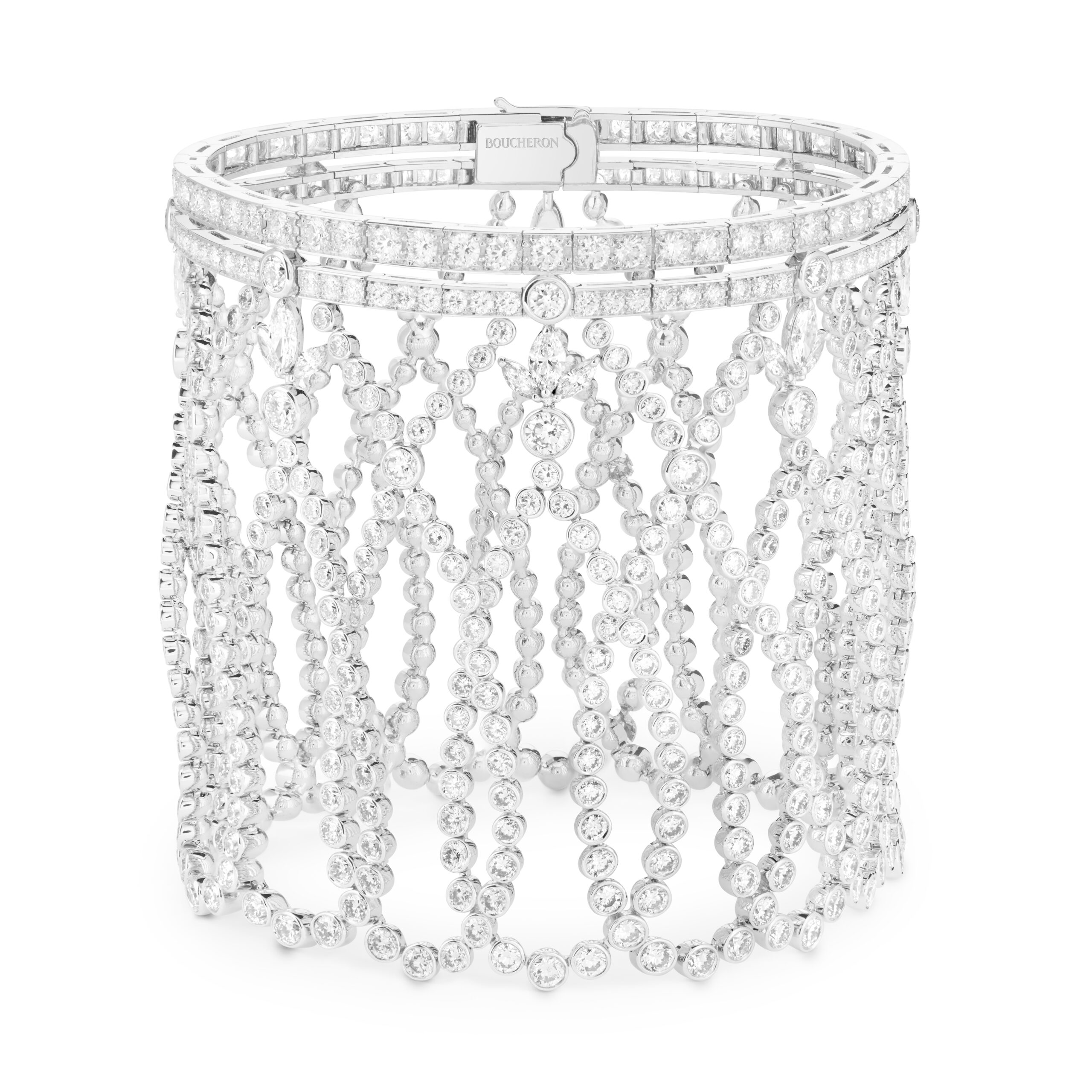 Alexa Chung, ambassadrice de la maison, a dévoilé en avant-première un bracelet de la prochaine collection de Haute Joaillerie Carte Blanche, qui sera révélée le 24 juin prochain. De même, Anja Rubik, égérie de Boucheron, portait les pendants d’oreilles issus d’un collier multi-porté de cette même collection à venir, témoignant de l’innovation et de la polyvalence des créations de la maison.