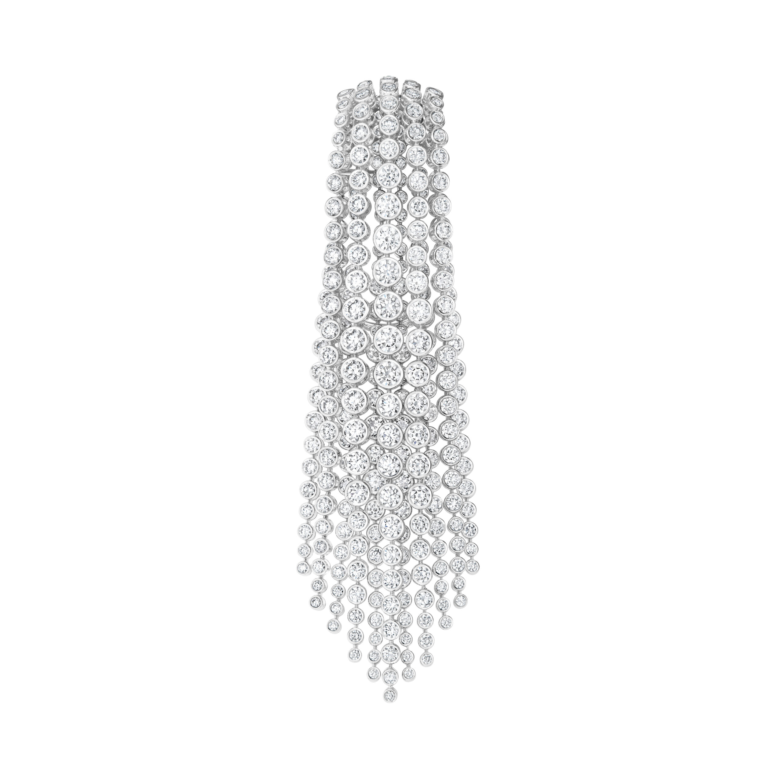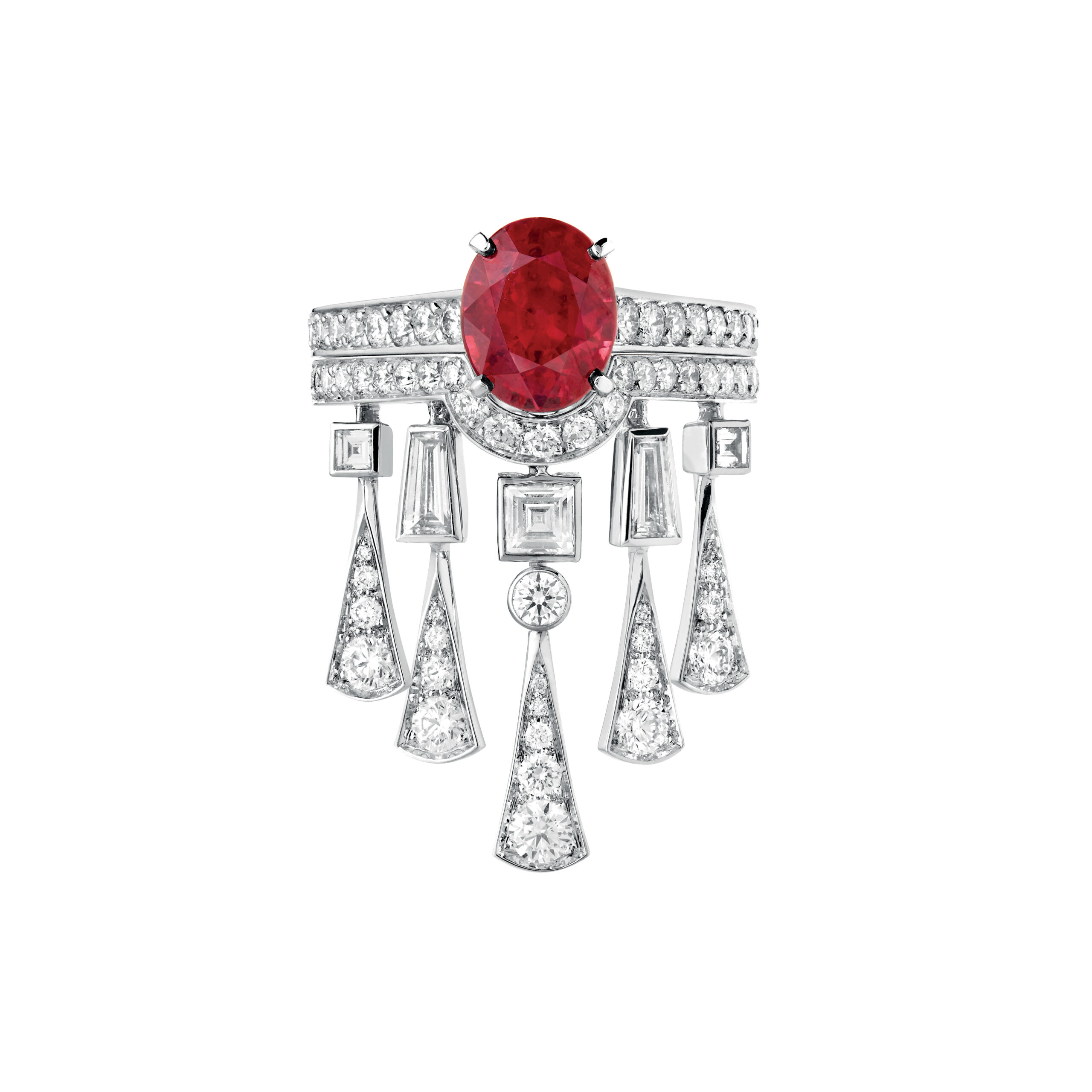 Isabelle Huppert, actrice de renom, a choisi les pendants d’oreilles Broderies de la collection Haute Joaillerie Histoire de Style, The Power of Couture, pavés de diamants sur or blanc, ainsi que la bague En Passant de la collection Haute Joaillerie Contemplation, renforçant son statut d’icône de l’élégance.