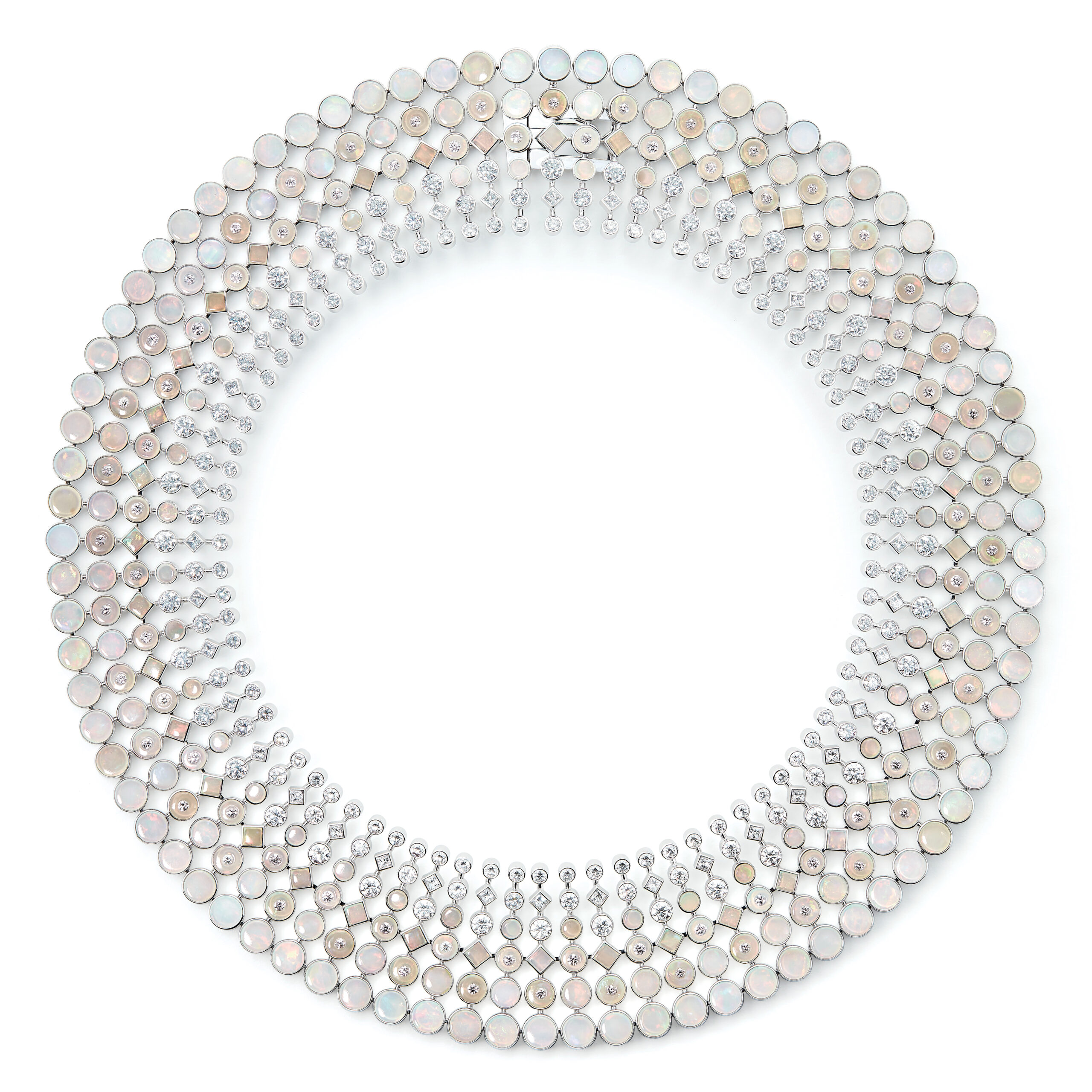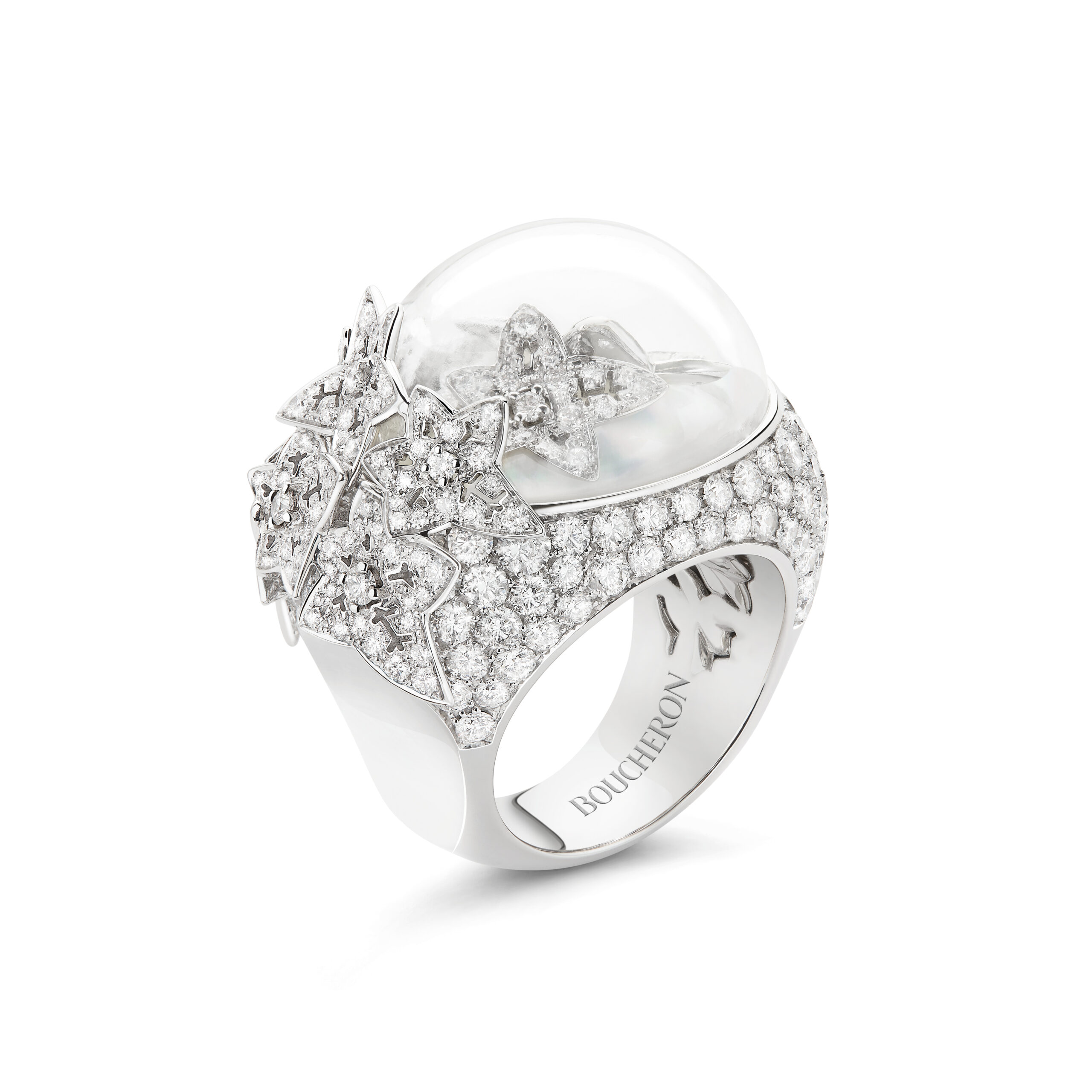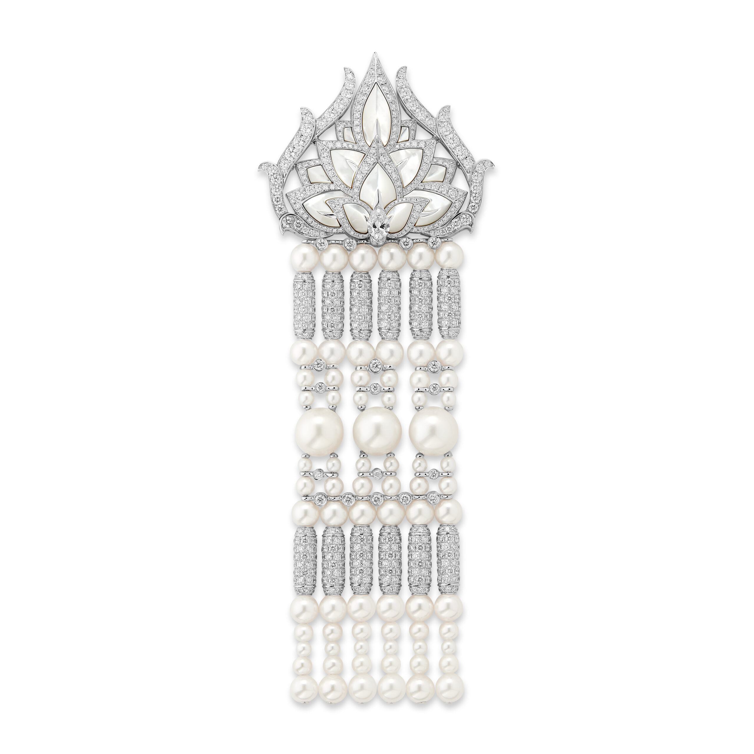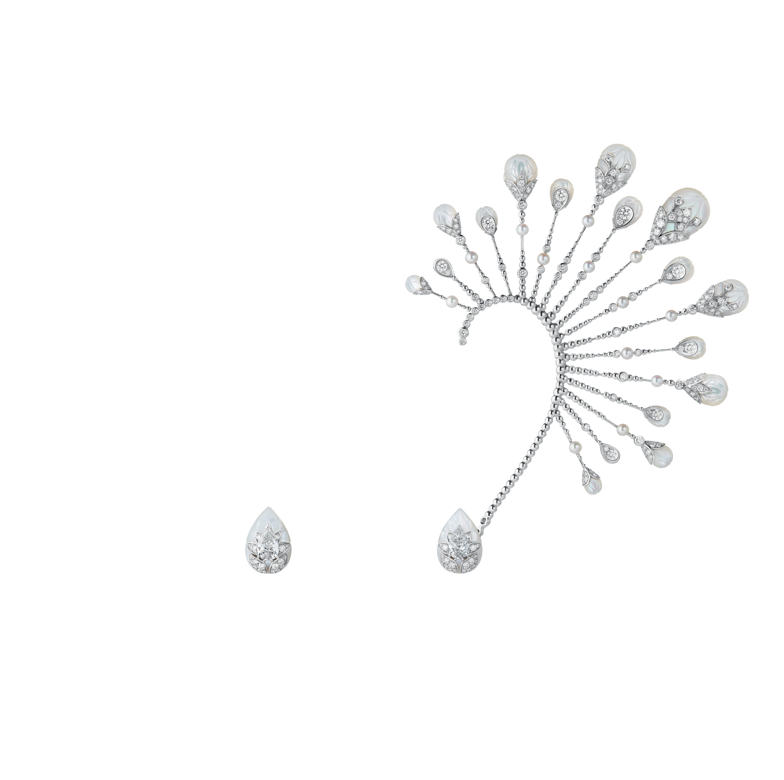Philippine Leroy-Beaulieu portait la broche issue du collier New Maharani, en nacre et diamants, accompagnée de créoles Maille de Diamants, de bracelets Epaulettes et de la bague Moon White, toutes de la collection Haute Joaillerie Histoire de Style, démontrant la diversité et la richesse des inspirations de Boucheron.