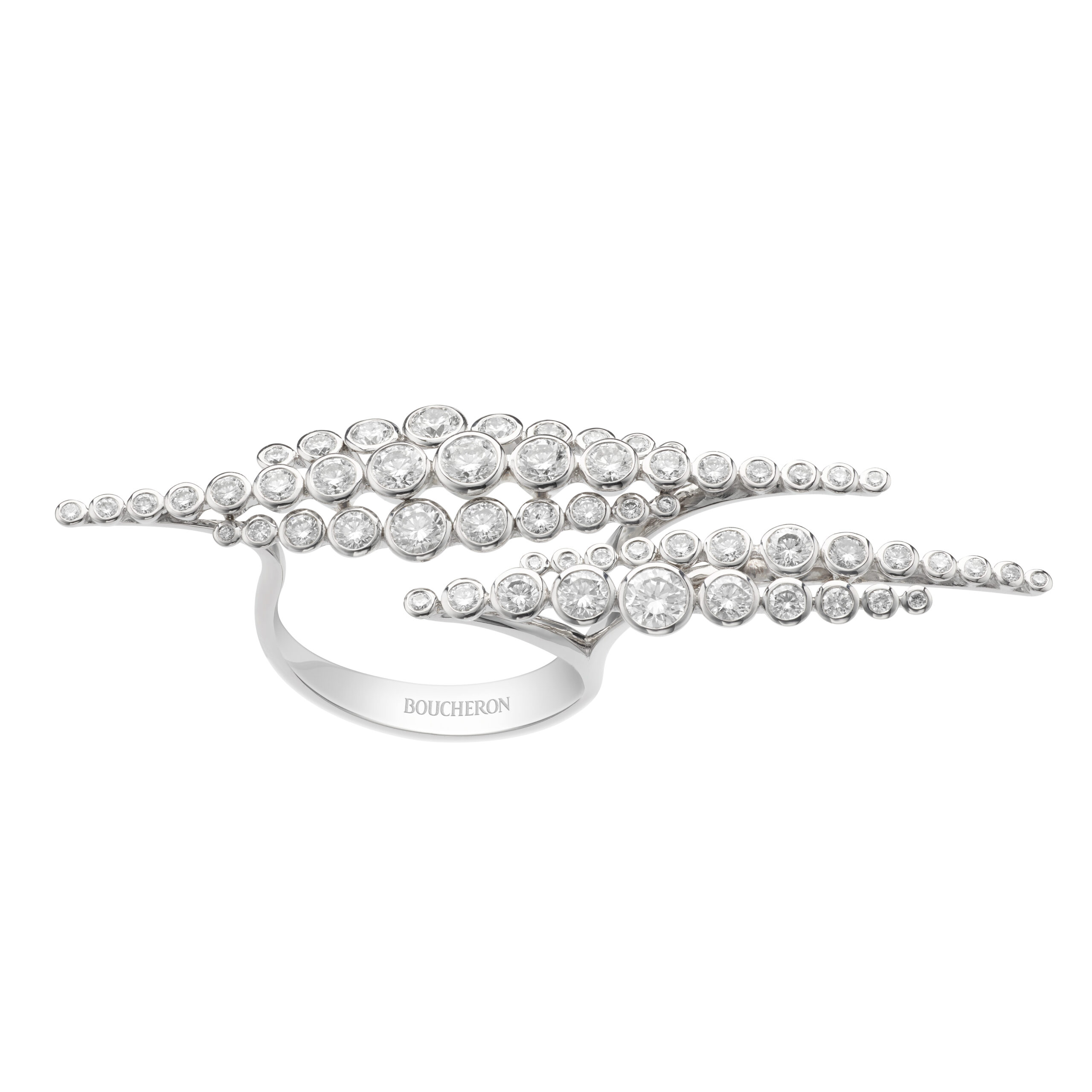 Anaïs Demoustier a choisi le collier Grand Nord, la bague Soleil Radiant, la bague Vendôme Liseré, et les puces d’oreilles Vendôme Liseré, toutes pavées de diamants, démontrant la splendeur des créations intemporelles de Boucheron.